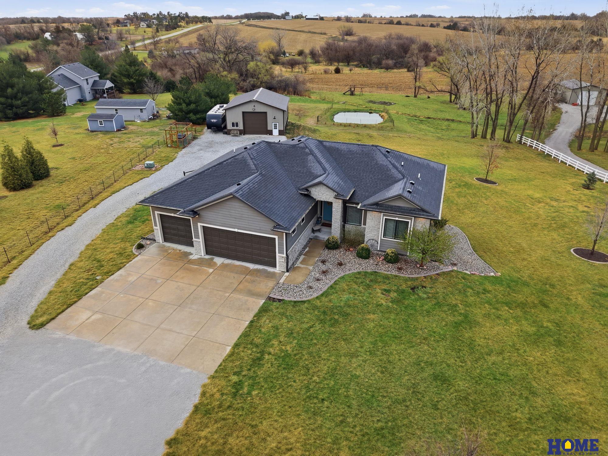 This is THE acreage you've been searching for! Enjoy the perfect blend of space, style, & functionality on this impressive 3-acre property, featuring a modern & meticulously maintained 2015-built home. Professional landscaping w/concrete curbing adds great outdoor appeal, plus a 30' x 36' outbuilding offers endless possibilities. The open-concept main level features engineered hardwood floors & a stunning kitchen with a large granite island, stainless appliances, & walk-in pantry. The living room showcases a stunning stone fireplace & large windows. The primary suite offers a spacious bedroom, large walk-in closet, double vanity, tiled shower, & relaxing soaker tub. Tall ceilings extend throughout, & the walkout basement offers a large rec room w/wet bar, two bedrooms, & an office w/ legal egress—easily a 6th bedroom. A heated & finished 3-stall garage completes the home. The tree-lined property offers ideal space to roam & entertain, while enjoying incredible nature & sunset views!