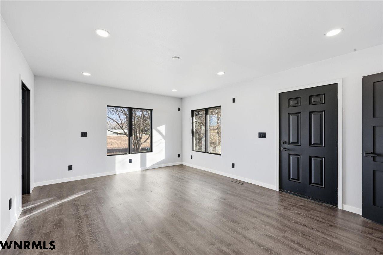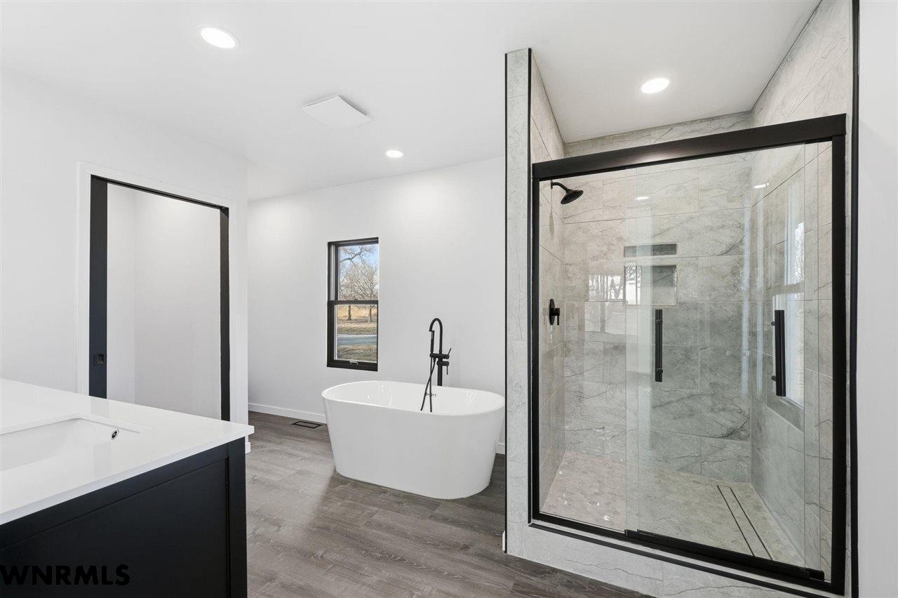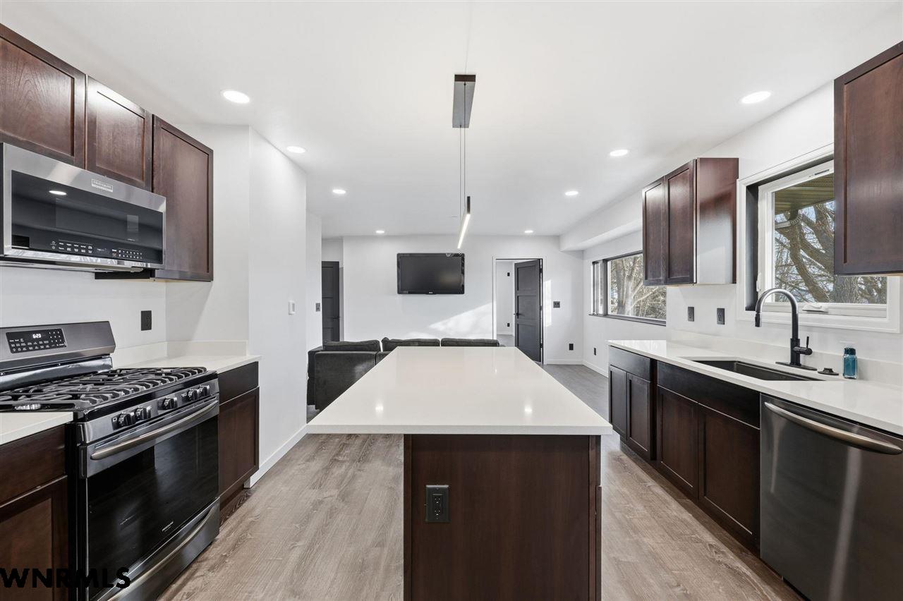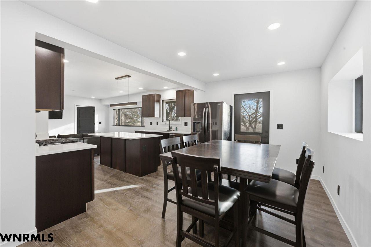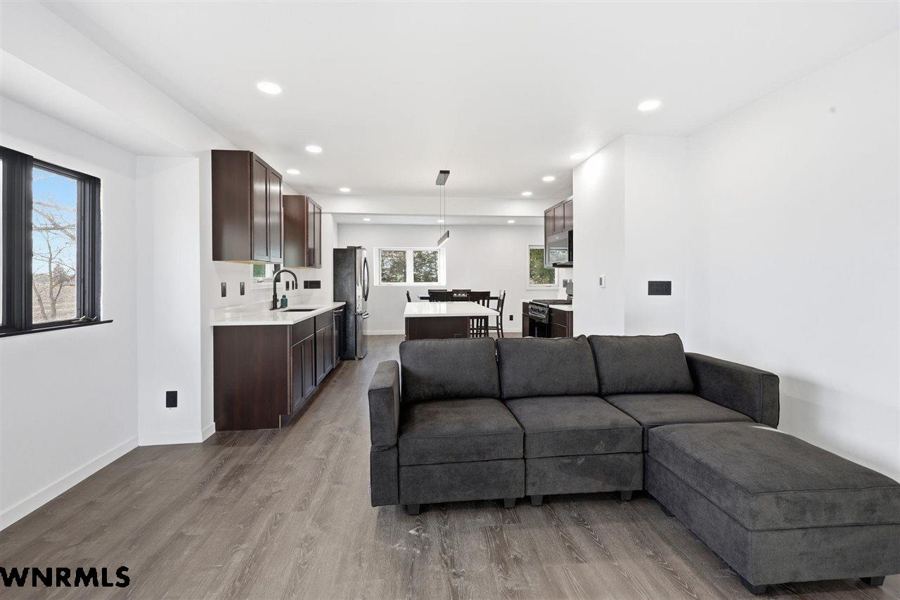 This beautiful, recently remodeled home sits on two acres roughly a quarter of a mile North of Highland Road and half a mile East of Lacy Park in Scottsbluff, NE. This stunning property offers a private escape from the city while also offering the convenience of being less than 10 minutes away from the heart of downtown Scottsbluff. The property features two finished detached garages and a small storage shed as well as room for an additional building. The home comes with a large 469 square foot wood deck overlooking a beautiful yard with over 30 mature trees and a new underground sprinkler system. All of the structures on the property have new stucco and new asphalt roofs. The North garage is 768 square feet with two new insulated overhead doors and features a small lighted storage area above. The garage closer to the home is new and slightly larger at 900 square feet and also features two new insulated overhead doors. Between the two garages is new colored concrete. The property is also on a well system and has two septic tanks. This home comes complete with four bedrooms, two living rooms, one full bathroom, two 3/4 bathrooms, a laundry/utility room, and a pantry. The water heater, plumbing, wiring, flooring, carpet, doors, cabinets, toilets, mirrors, vanities, switches, fixtures, and trim are all new. All the windows in the kitchen are new Pella windows. It features a modern kitchen with new quartz counters and brand-new Frigidaire Gallery appliances. The home also incorporates a new water softening system as well as central air. Taxes and parcel may change due to new survey. Basement bedroom windows my not be conforming.