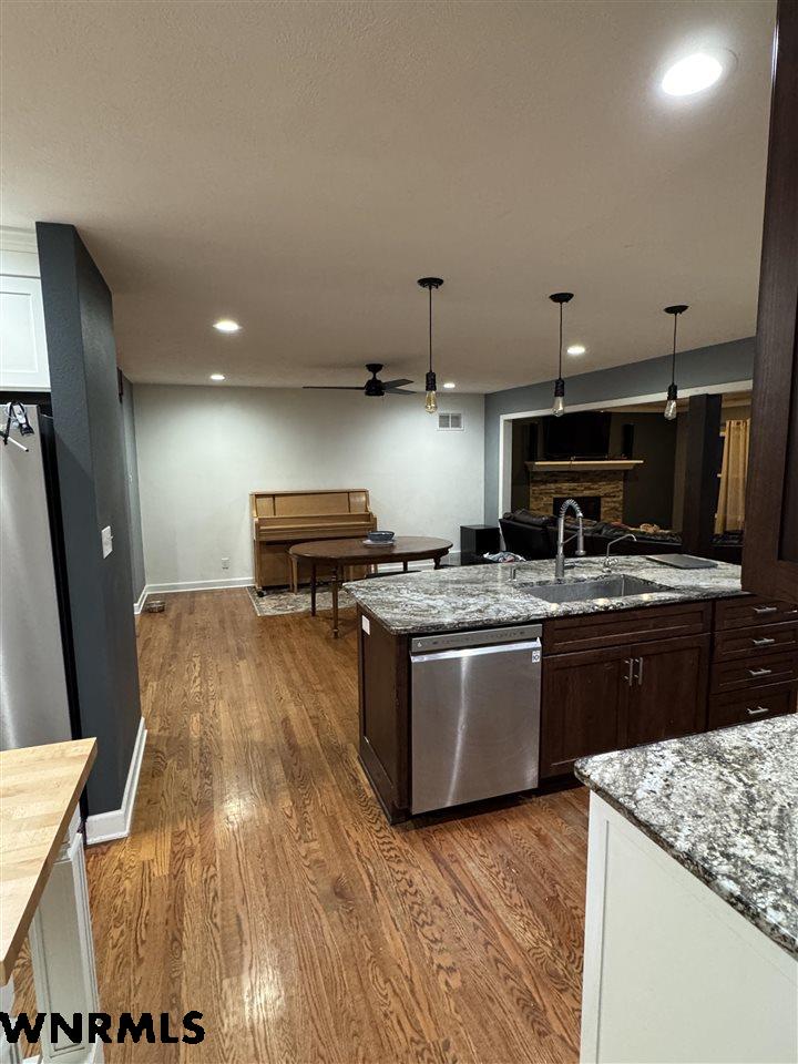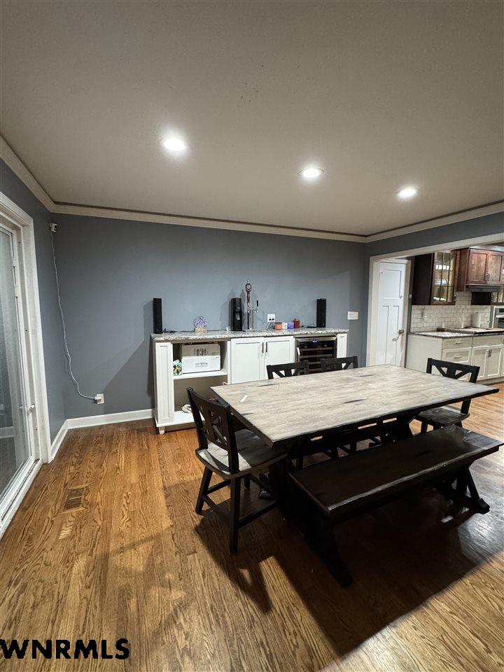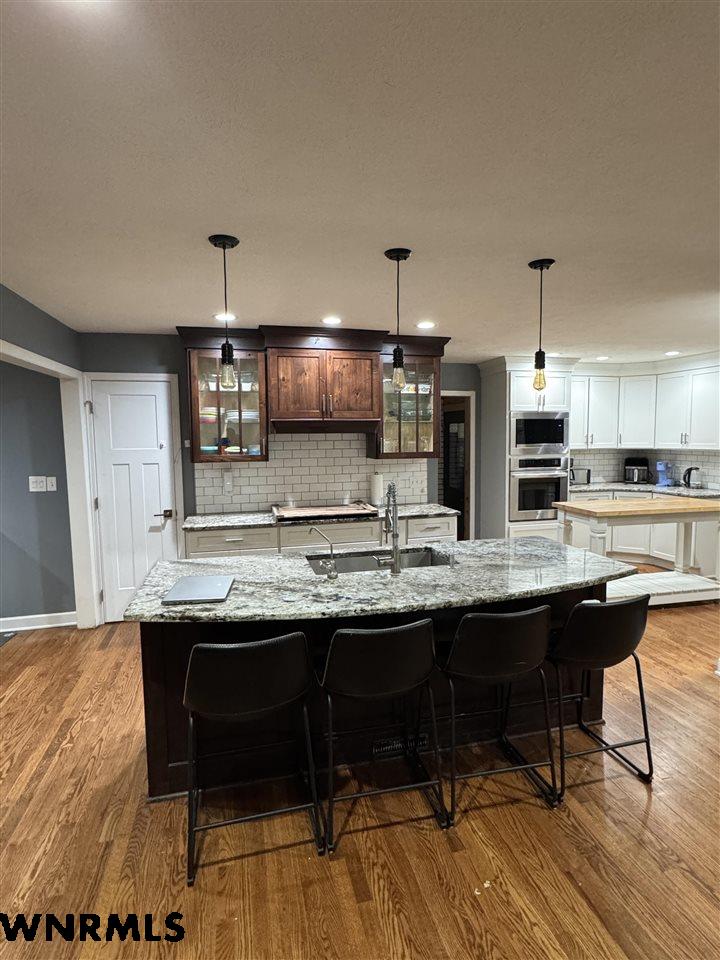 This stunning, completely remodeled home showcases custom cabinetry, granite countertops, and high-end appliances throughout. Designed for both everyday living and entertaining, the home features two stylish bar areas complete with built-in taps and beverage coolers. The upper level offers an open-concept living space with a cozy fireplace, along with the primary suite and an additional bedroom and bathroom. The finished basement expands your living options with a large family room, laundry area, two more bedrooms, and a full bathroom. Situated just off the golf course, the home boasts excellent curb appeal with durable hardboard and stone exterior. Enjoy outdoor living in the large fenced backyard, plus the convenience of a single-car garage and additional storage shed. This home blends modern luxury, thoughtful design, and a fantastic location.