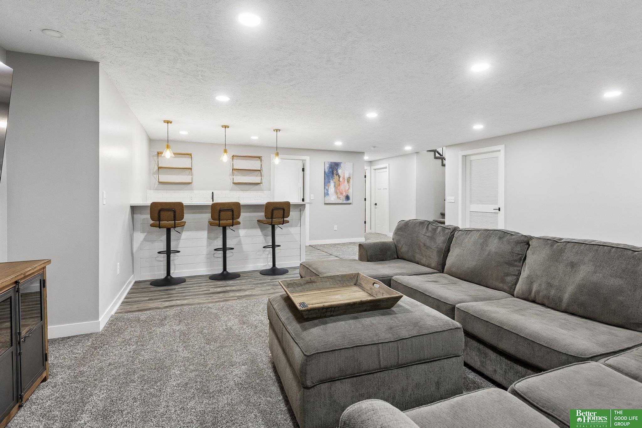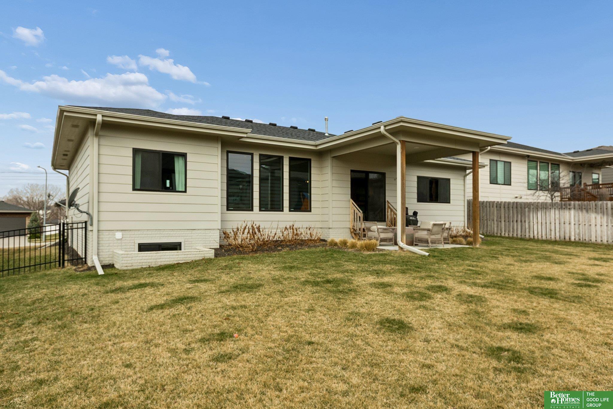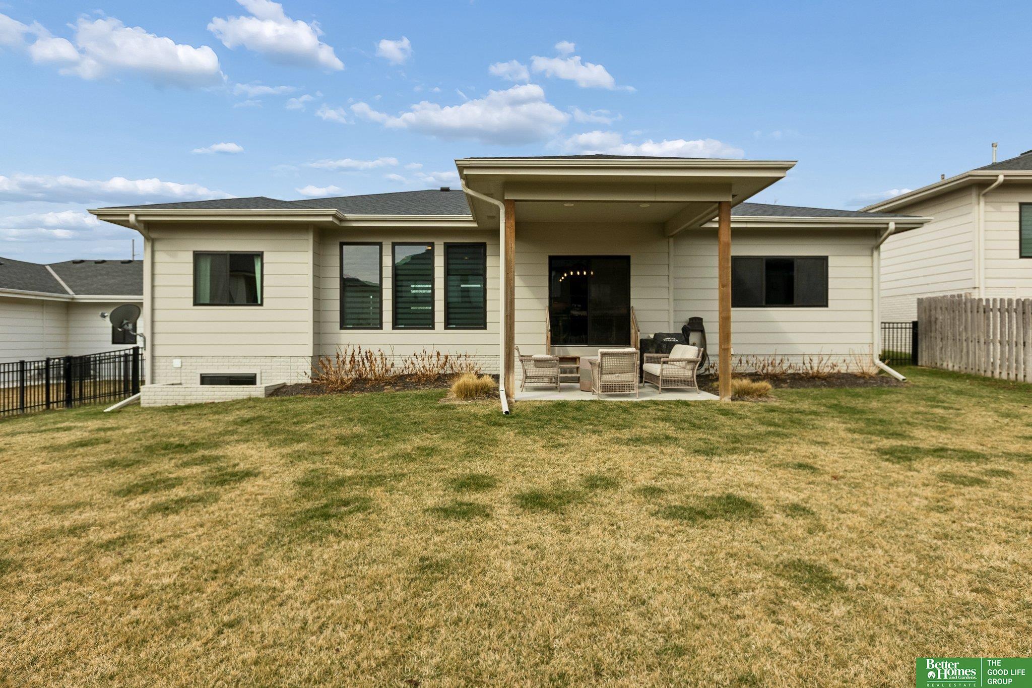 Better than new- this upgraded 2019 ranch offers modern design and everyday comfort in a prime Elkhorn neighborhood. The main level features an open floor plan with tall ceilings, creating a bright and spacious feel throughout. The living, dining, and kitchen areas flow seamlessly-ideal for both entertaining and daily living. Step outside to a covered patio overlooking the fully fenced yard. A charming covered front porch adds to the home's inviting curb appeal. The newly finished basement expands your living space with a stylish wet bar, perfect for hosting, relaxing, or game day gatherings. With newer construction, quality upgrades, and exceptional care, this move-in ready home is perfectly situated in one of Elkhorn's most desirable areas.