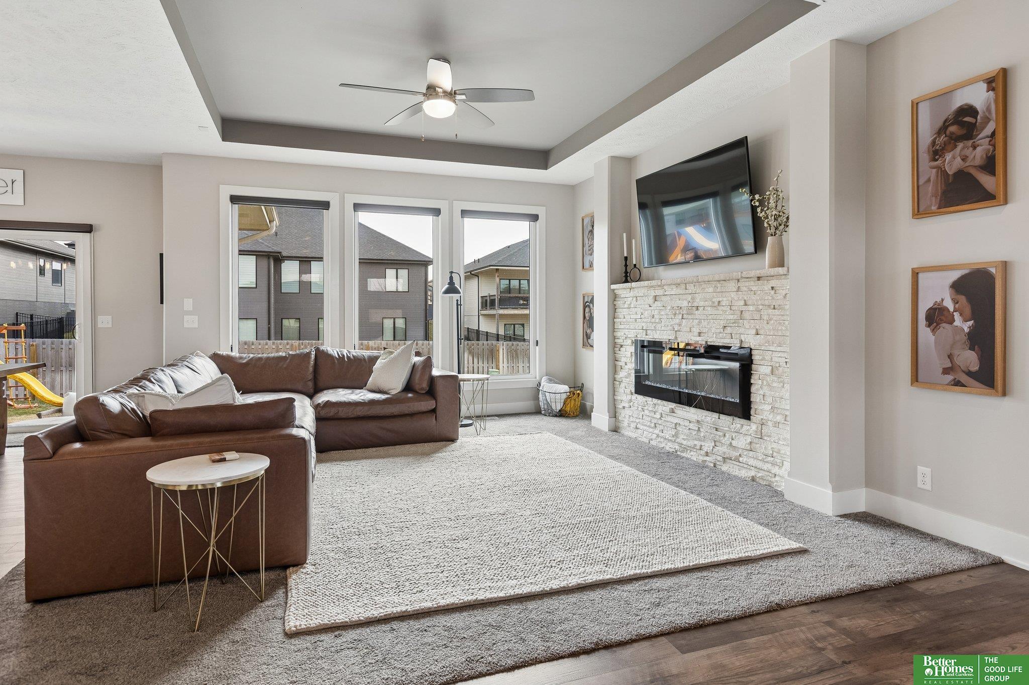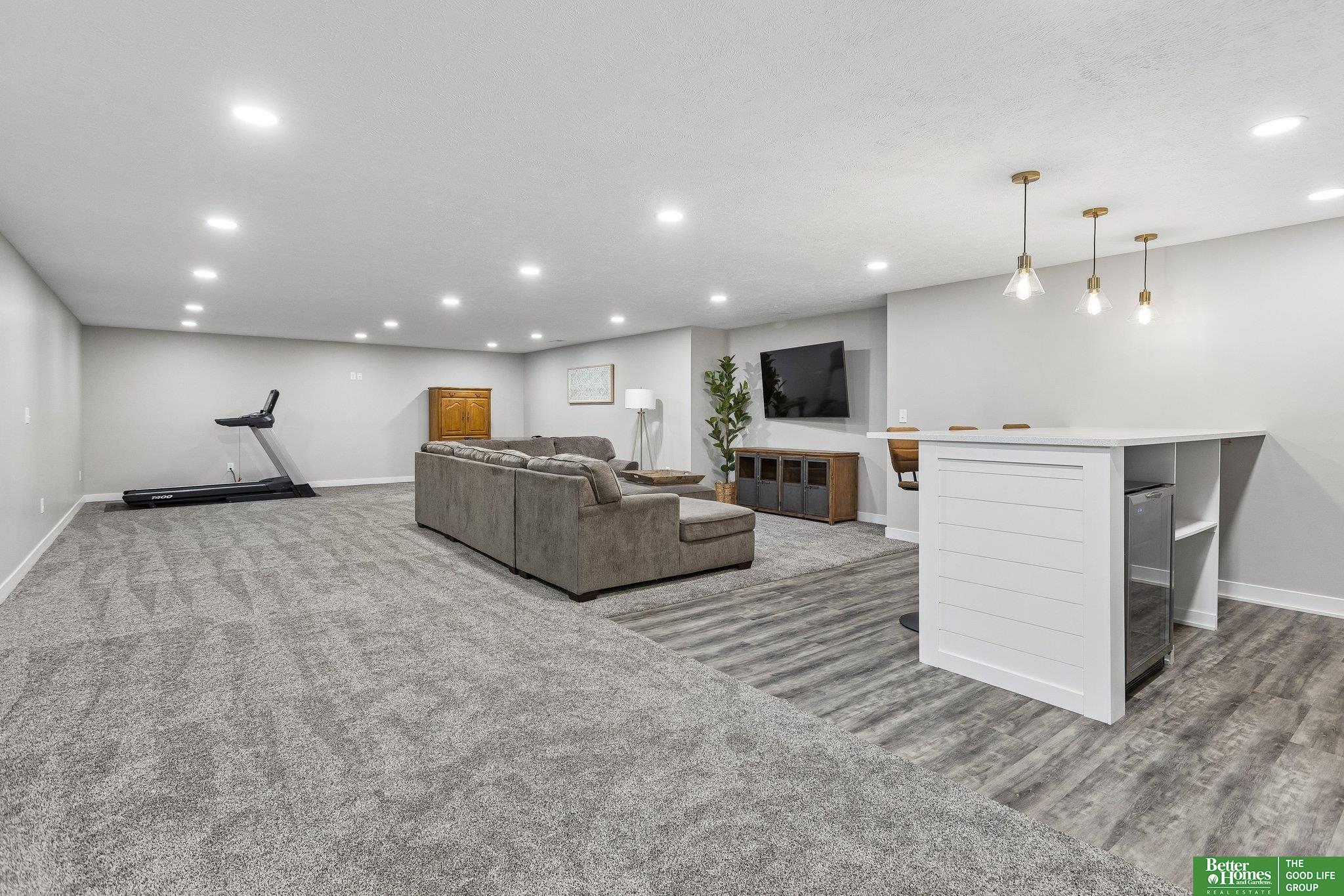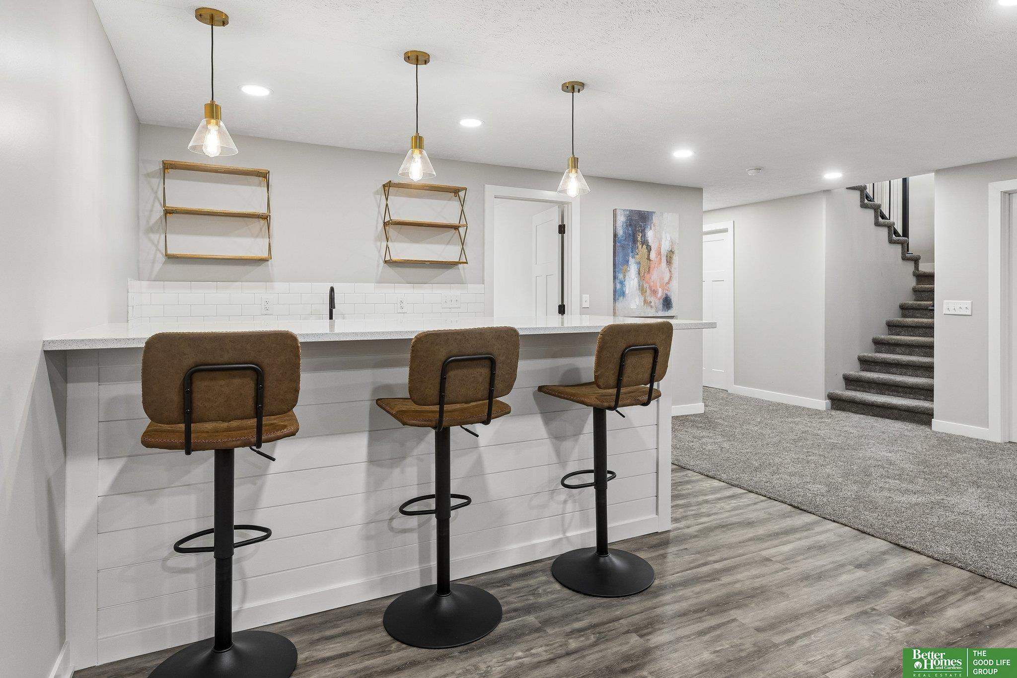 Better than new- this upgraded 2019 ranch offers modern design and everyday comfort in a prime Elkhorn neighborhood. The main level features an open floor plan with tall ceilings, creating a bright and spacious feel throughout. The living, dining, and kitchen areas flow seamlessly-ideal for both entertaining and daily living. Step outside to a covered patio overlooking the fully fenced yard. A charming covered front porch adds to the home's inviting curb appeal. The newly finished basement expands your living space with a stylish wet bar, perfect for hosting, relaxing, or game day gatherings. With newer construction, quality upgrades, and exceptional care, this move-in ready home is perfectly situated in one of Elkhorn's most desirable areas.