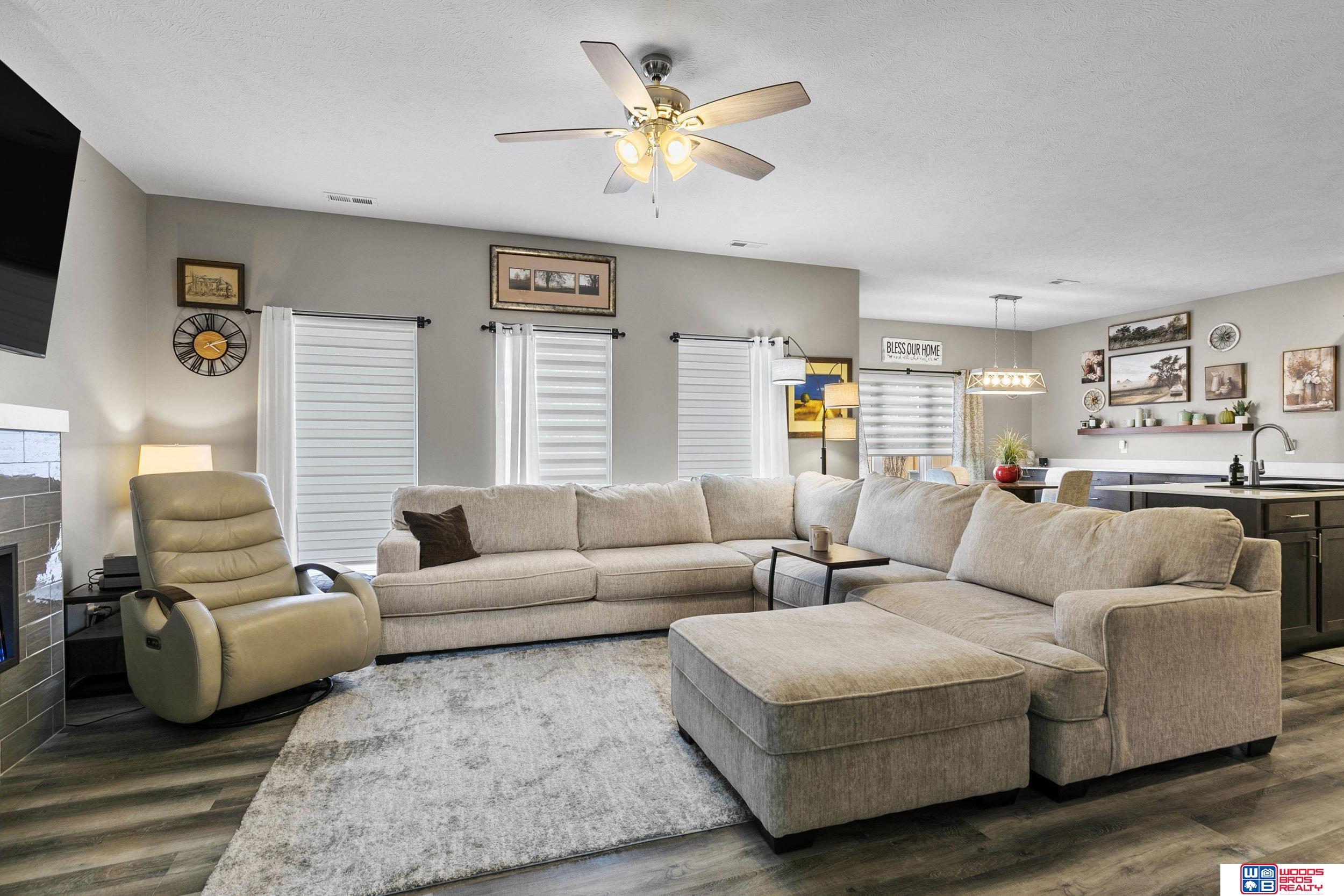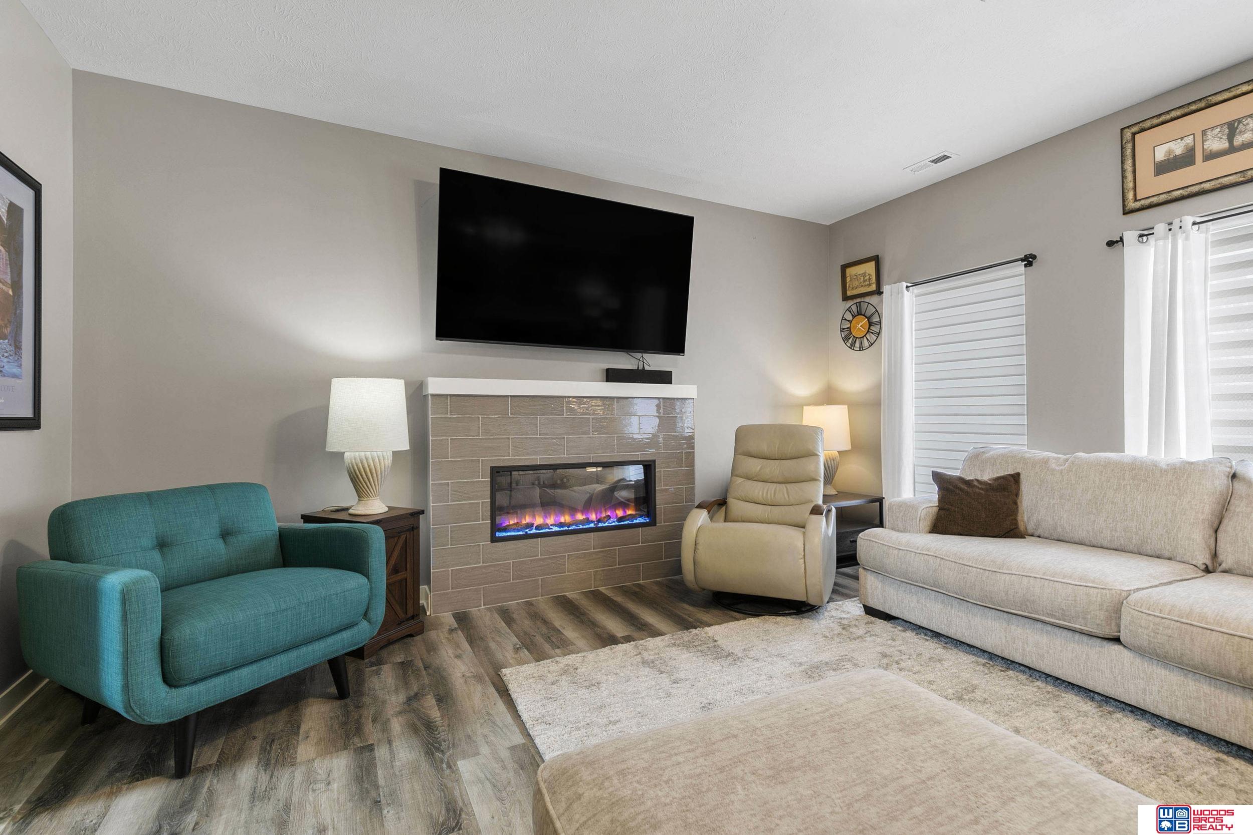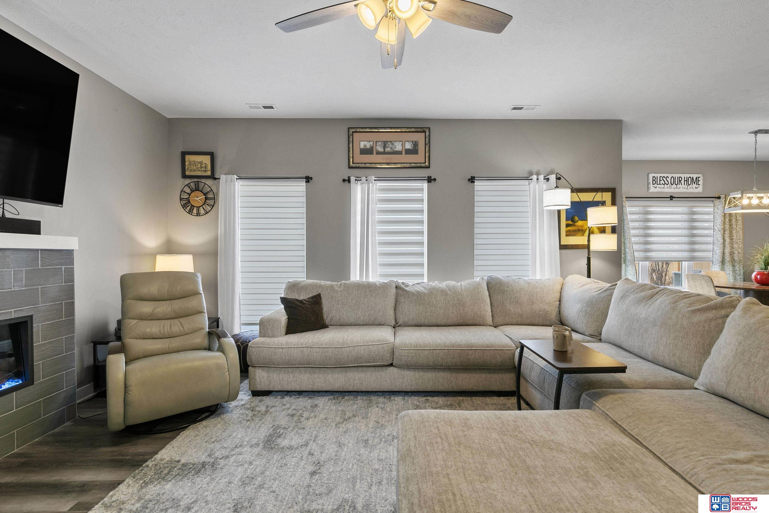 Enjoy effortless living inside and out in this beautifully upgraded townhome! An extended patio with privacy fence and electric awning creates the perfect outdoor retreat, while professional landscaping adds inviting curb appeal. Inside, the open-concept layout features luxury vinyl flooring, quality carpeting, quartz countertops, upgraded dining cabinetry, and a cozy fireplace. Custom window seats and upgraded window coverings add warmth throughout. Upstairs offers a spacious primary suite with dual sinks and a walk-in closet, plus two additional bedrooms and second-floor laundry. Complete with a finished two-stall garage with added shelving, washer/dryer, and water softener, this almost 2,000 sq ft home with over $45,000 in upgrades is truly better than new and move-in ready!