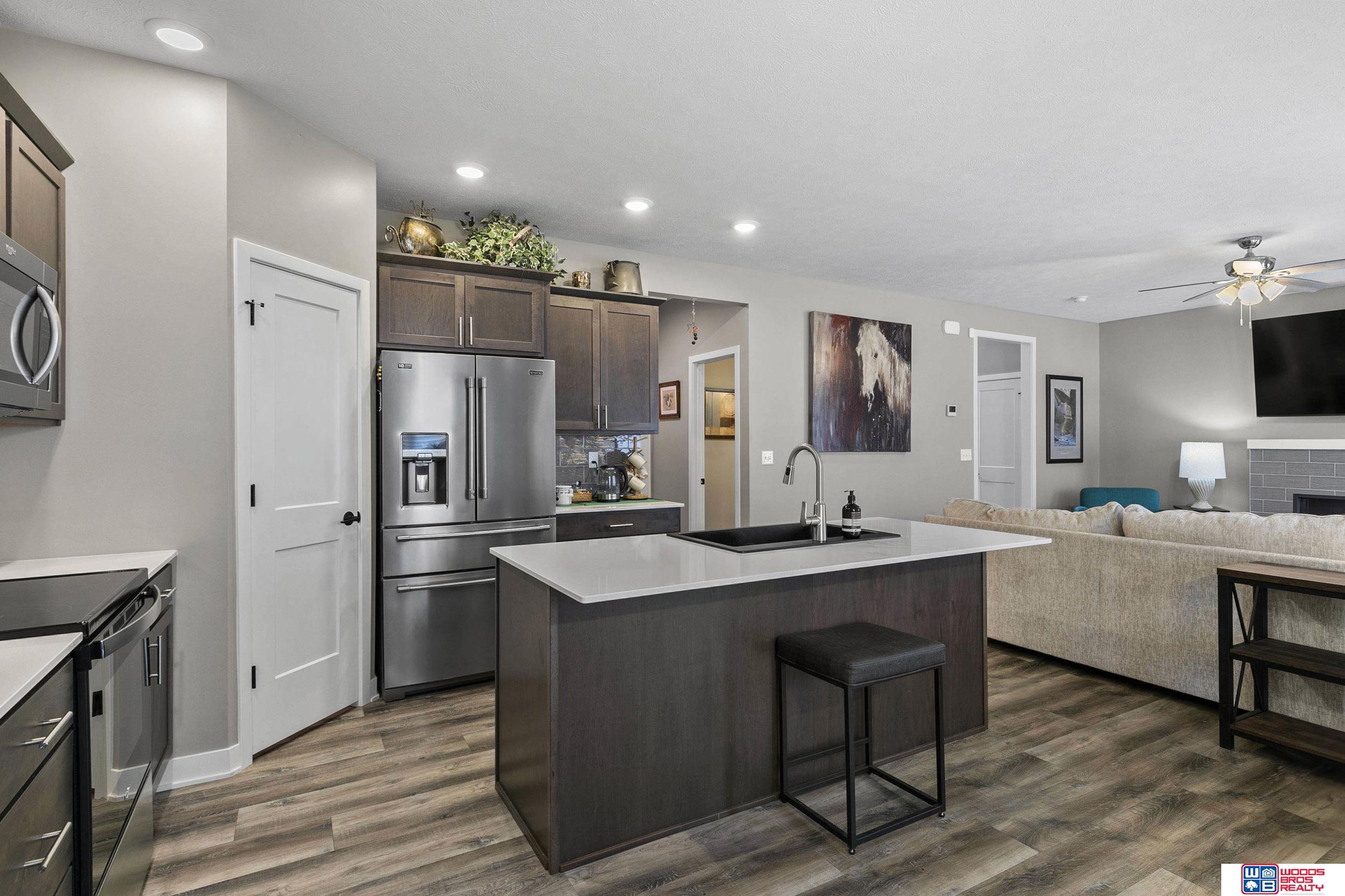 Enjoy effortless living inside and out in this beautifully upgraded townhome! An extended patio with privacy fence and electric awning creates the perfect outdoor retreat, while professional landscaping adds inviting curb appeal. Inside, the open-concept layout features luxury vinyl flooring, quality carpeting, quartz countertops, upgraded dining cabinetry, and a cozy fireplace. Custom window seats and upgraded window coverings add warmth throughout. Upstairs offers a spacious primary suite with dual sinks and a walk-in closet, plus two additional bedrooms and second-floor laundry. Complete with a finished two-stall garage with added shelving, washer/dryer, and water softener, this almost 2,000 sq ft home with over $45,000 in upgrades is truly better than new and move-in ready!