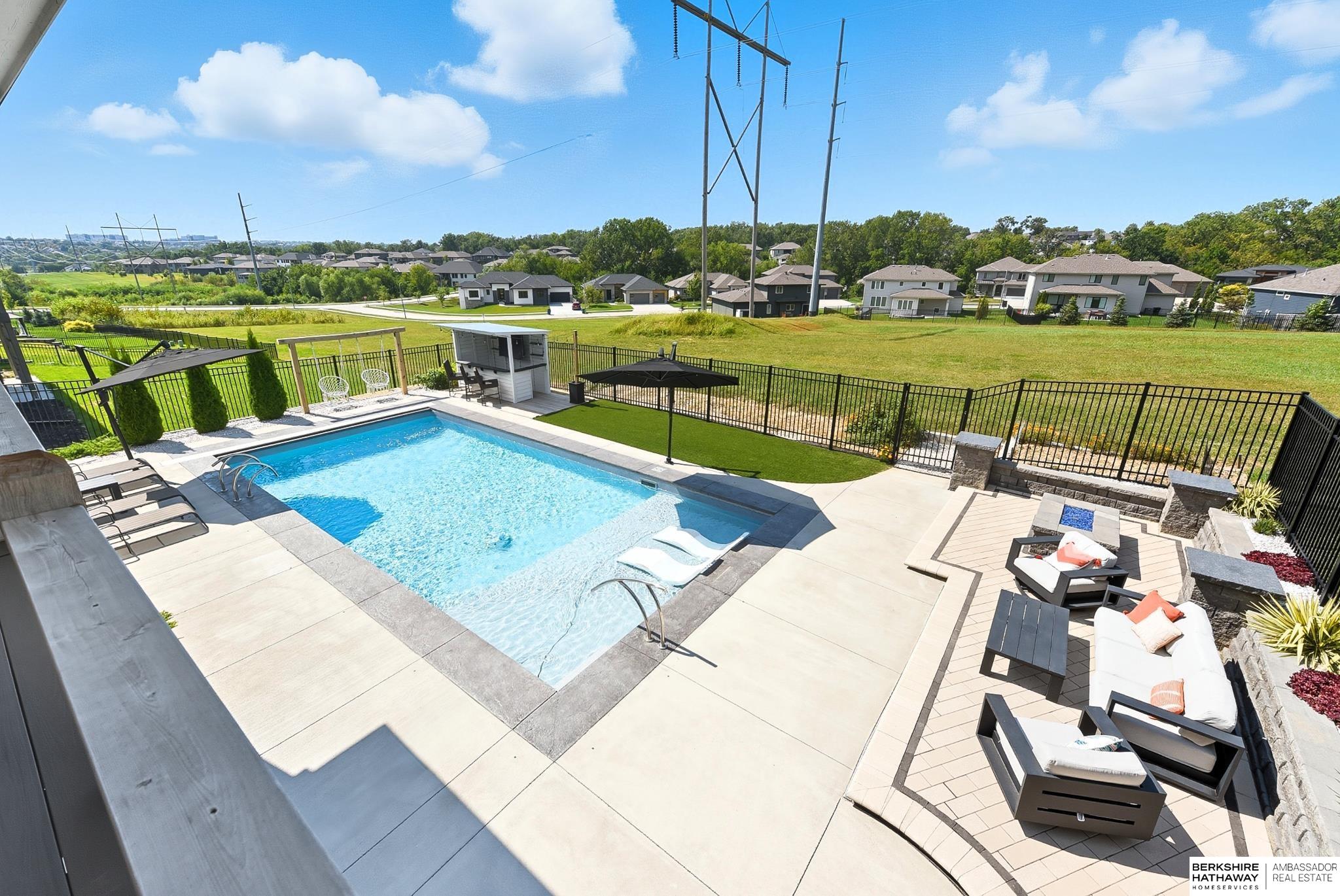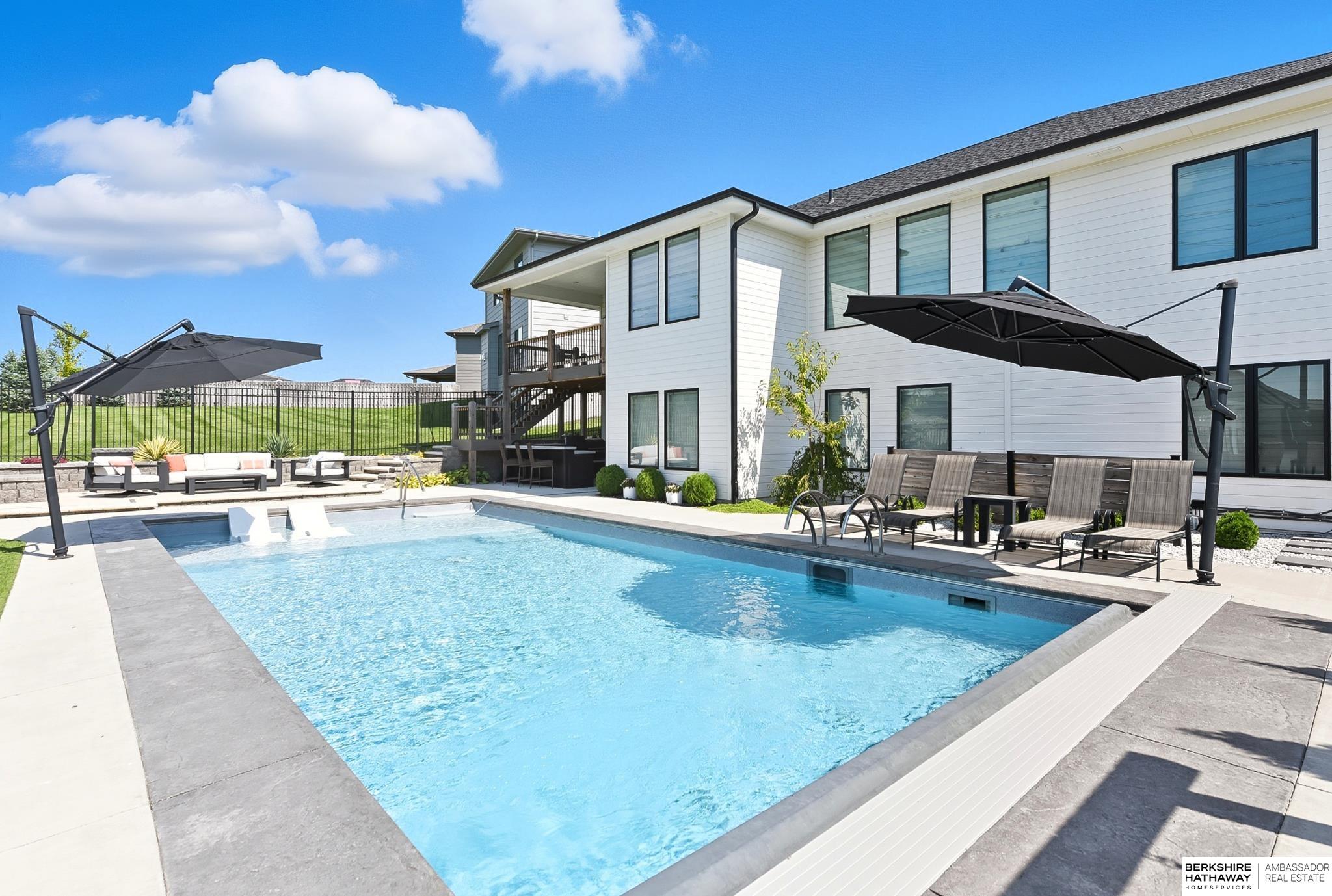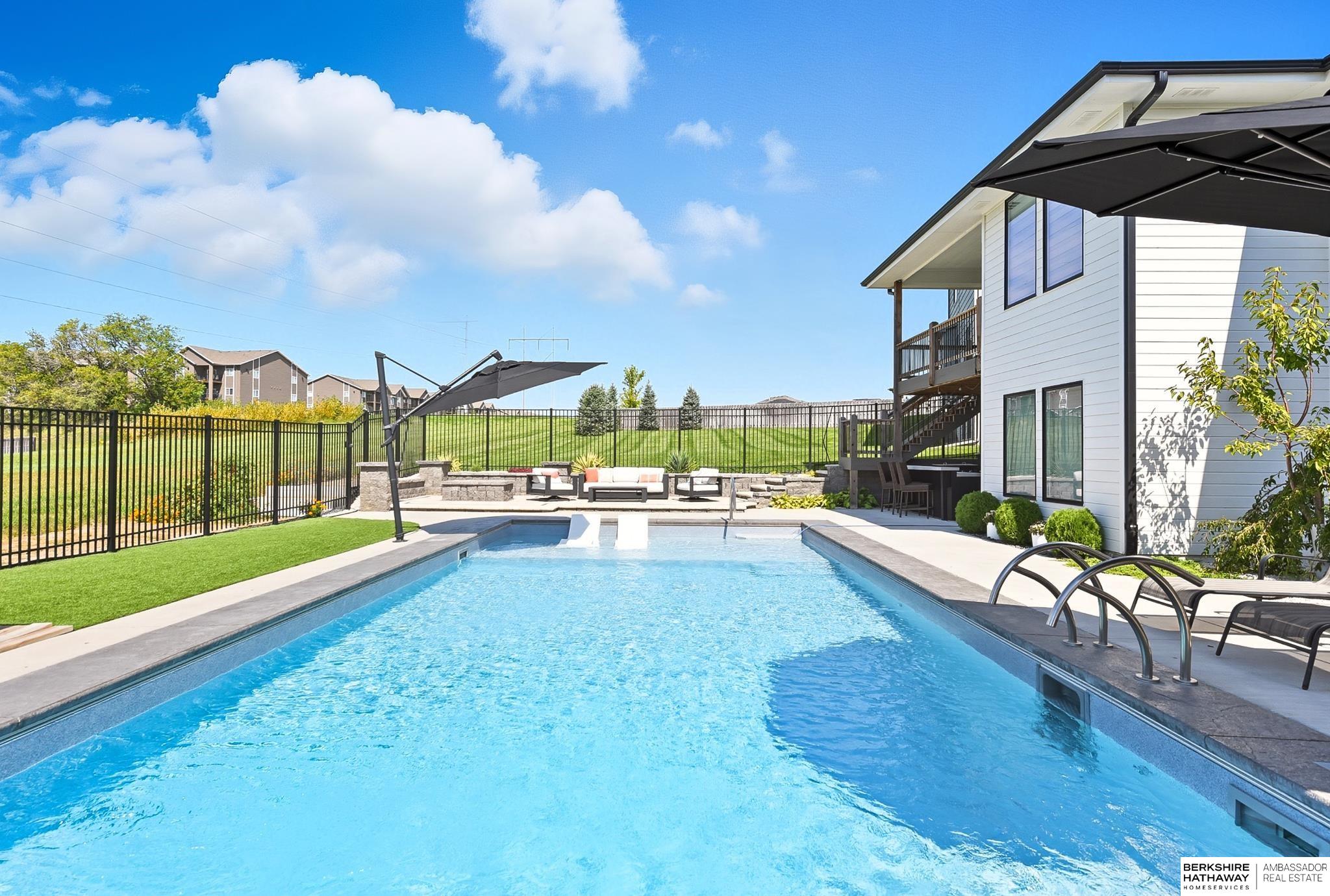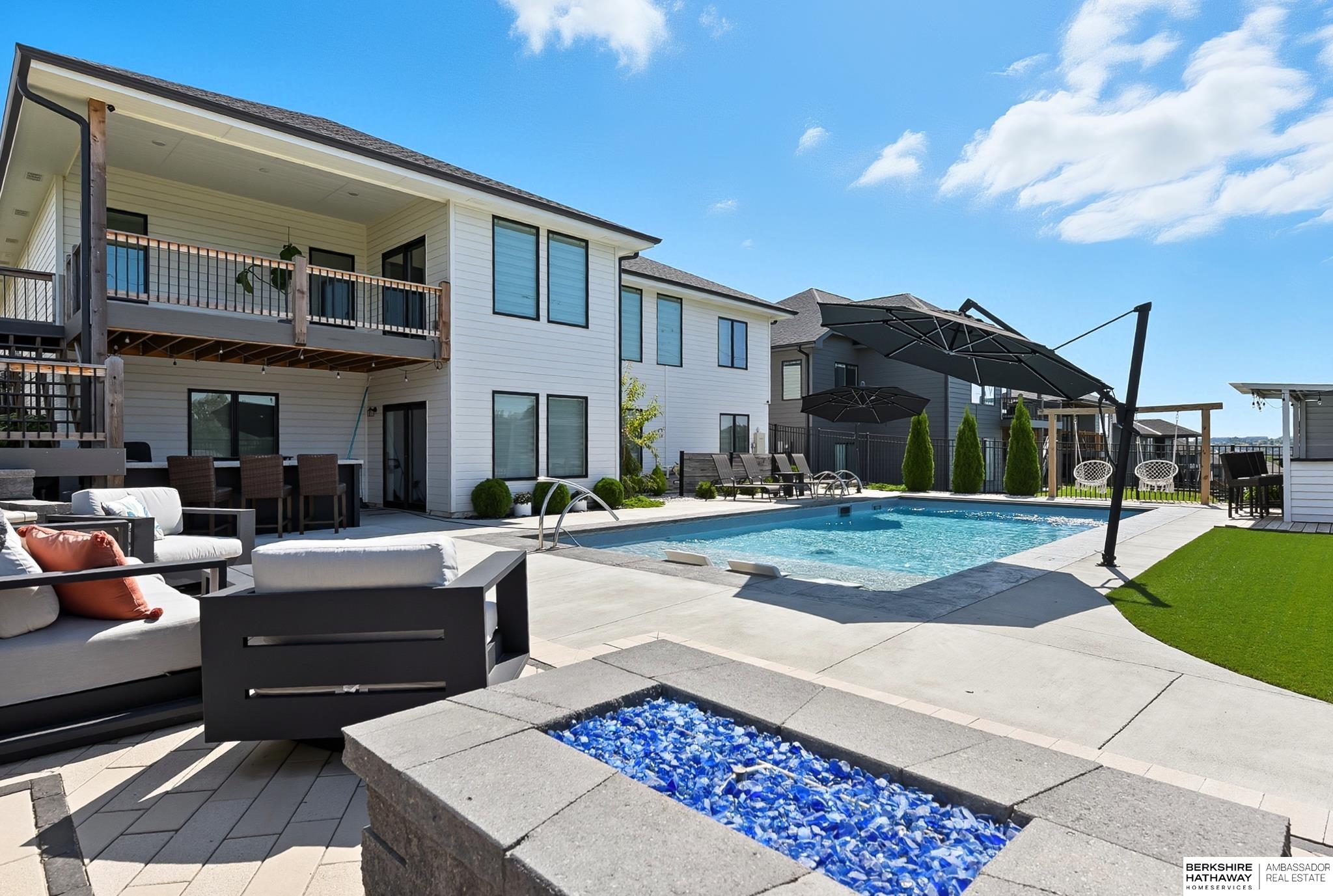 Located in the Elkhorn North School District this professionally designed walkout home has an inviting open-concept, blending modern elegance comfort & entertainment-ready amenities. Main level creates a warm & welcoming atmosphere w/ spacious great room & floor-to-ceiling stone fireplace. The kitchen boasts custom maple cabinetry, quartz, ceramic tile & walk-in pantry + 3 beds & 2 beautifully designed baths. Primary suite has spa-like bath w/ walk-in tile shower & dual vanity. The LL is purposefully designed for stylish hosting & everyday enjoyment with 2 beds + 3/4 bath, rec room w/ modern fireplace, stylish bar + a dedicated theater room. Walkout design provides effortless access to the beautiful outdoor retreat featuring a pool, built-in bar, & an expansive paver patio with fire pit, an ideal setting for gatherings that flow effortlessly from day to night. A spacious 3-car garage, including a polyaspartic coded floor, adds convenience & functionality. Truly an exceptional property.