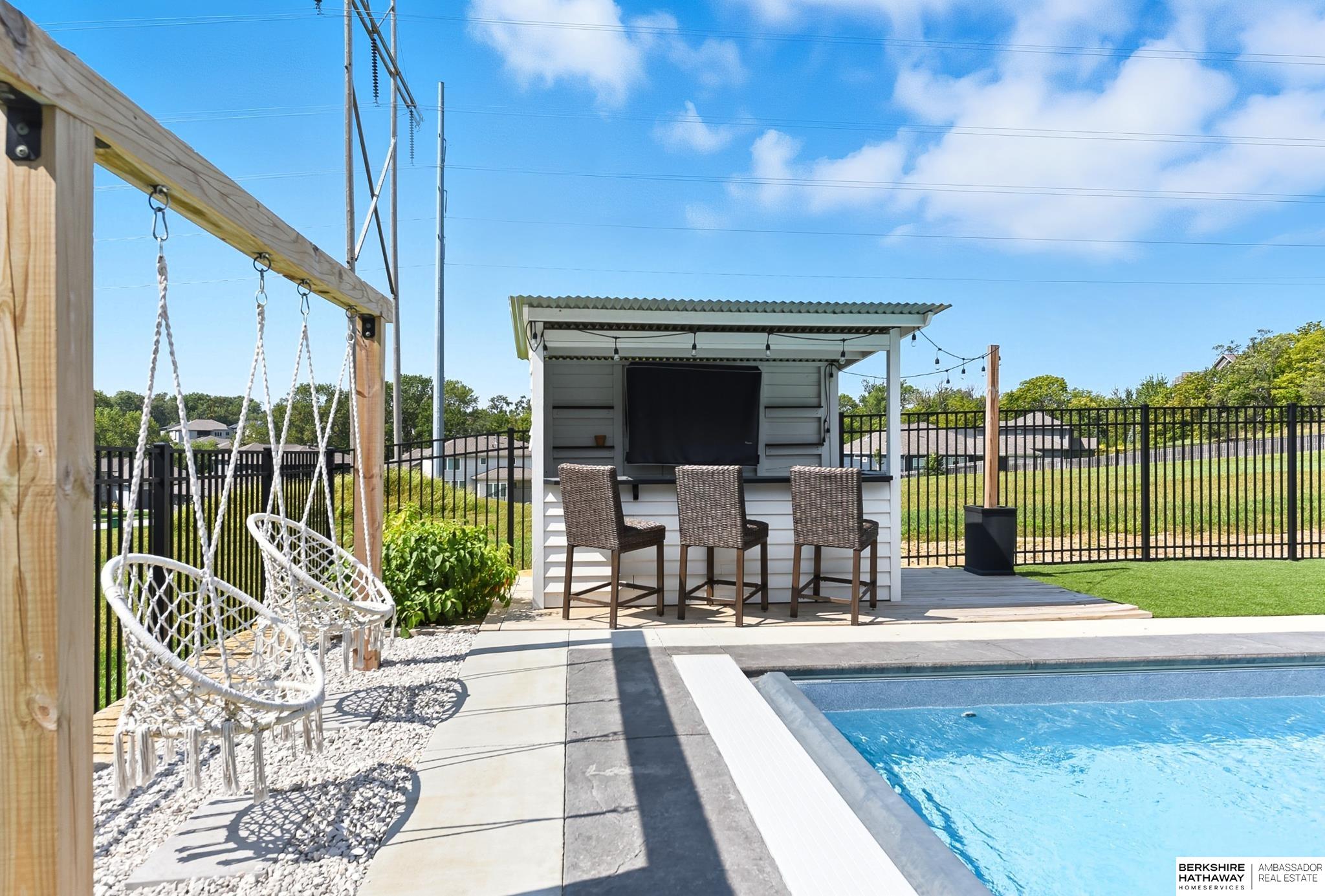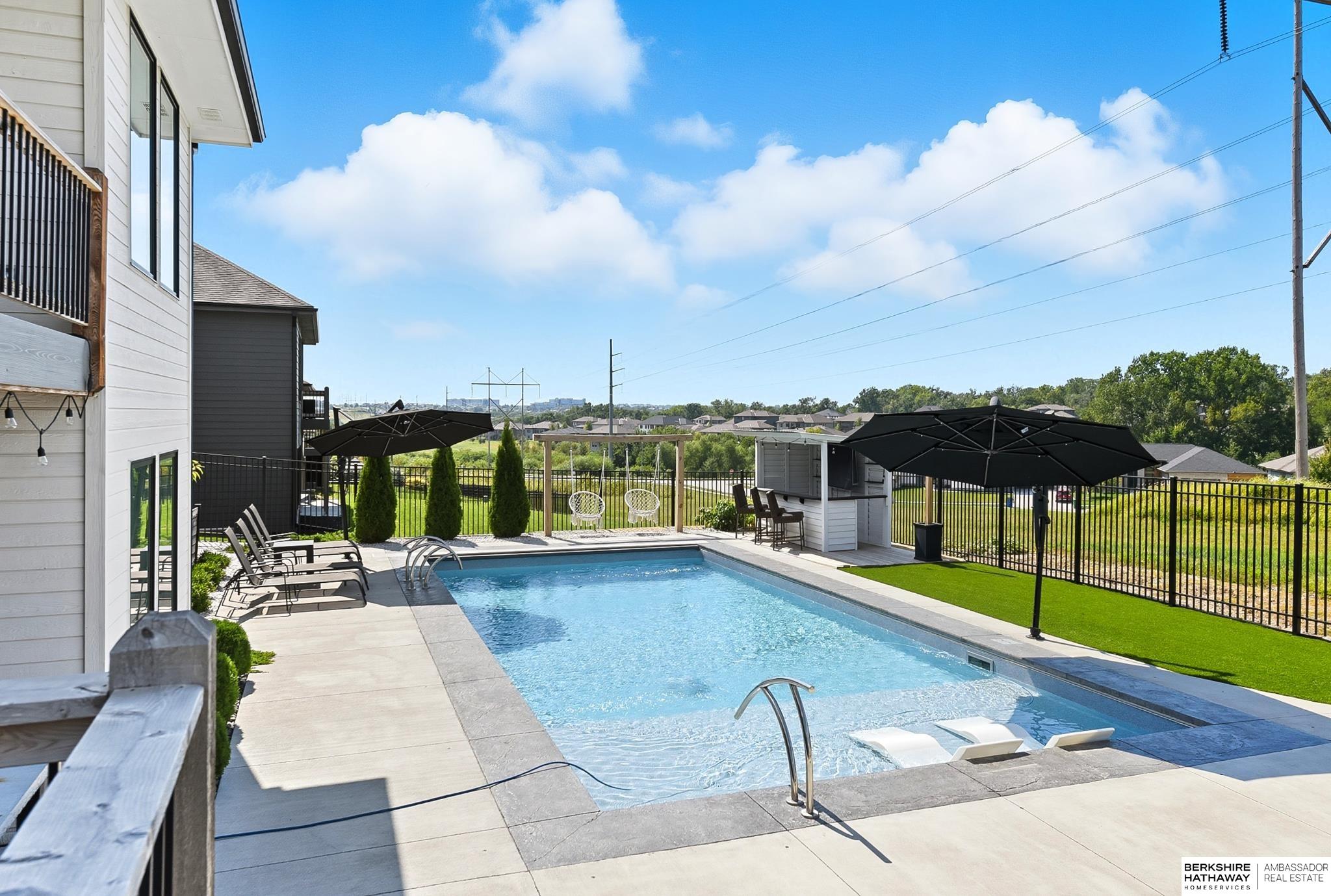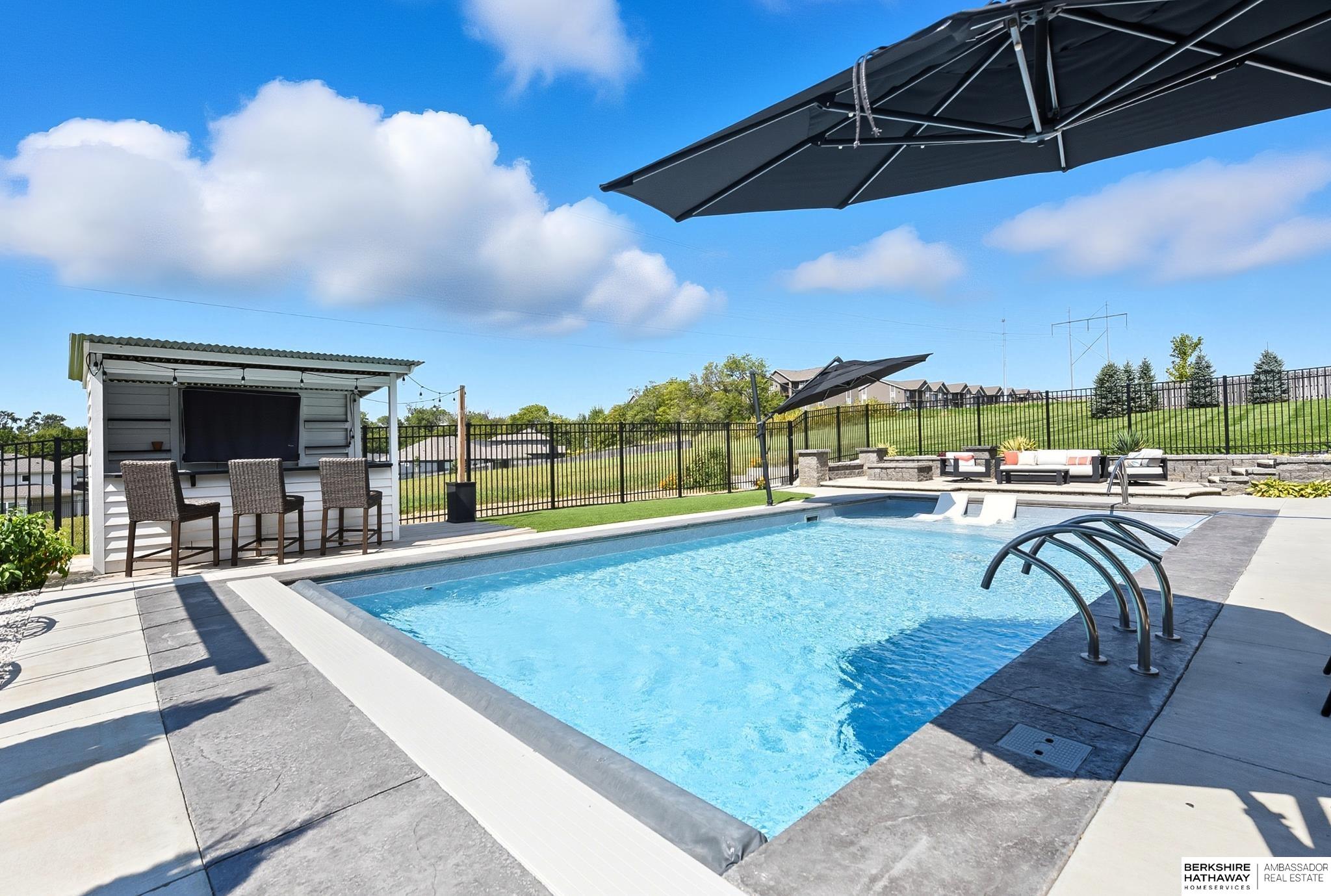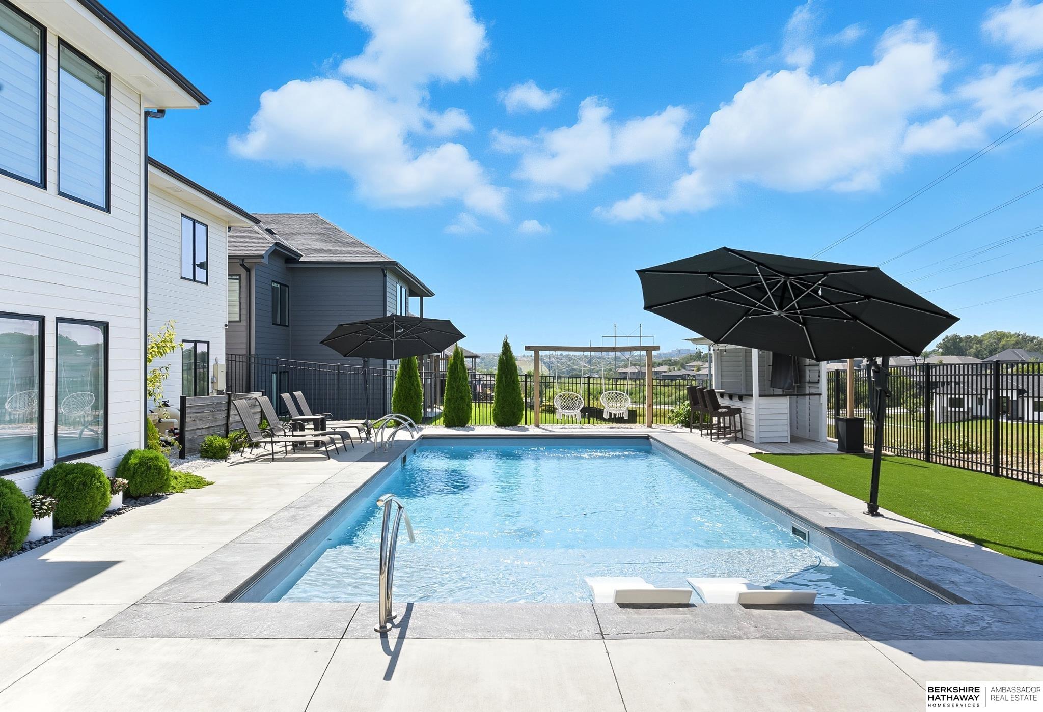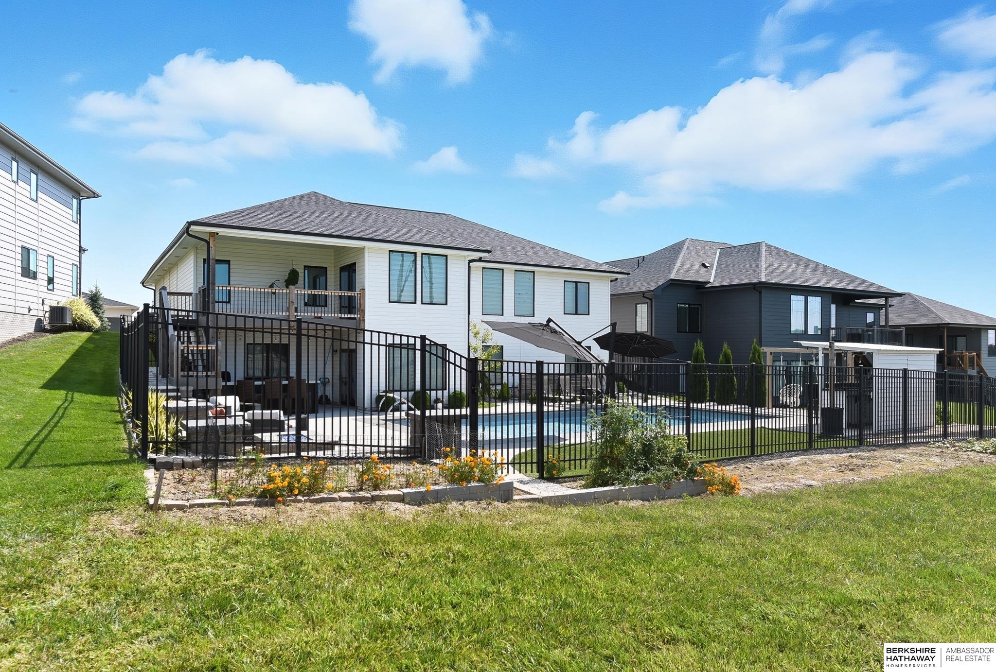 Located in the Elkhorn North School District this professionally designed walkout home has an inviting open-concept, blending modern elegance comfort & entertainment-ready amenities. Main level creates a warm & welcoming atmosphere w/ spacious great room & floor-to-ceiling stone fireplace. The kitchen boasts custom maple cabinetry, quartz, ceramic tile & walk-in pantry + 3 beds & 2 beautifully designed baths. Primary suite has spa-like bath w/ walk-in tile shower & dual vanity. The LL is purposefully designed for stylish hosting & everyday enjoyment with 2 beds + 3/4 bath, rec room w/ modern fireplace, stylish bar + a dedicated theater room. Walkout design provides effortless access to the beautiful outdoor retreat featuring a pool, built-in bar, & an expansive paver patio with fire pit, an ideal setting for gatherings that flow effortlessly from day to night. A spacious 3-car garage, including a polyaspartic coded floor, adds convenience & functionality. Truly an exceptional property.