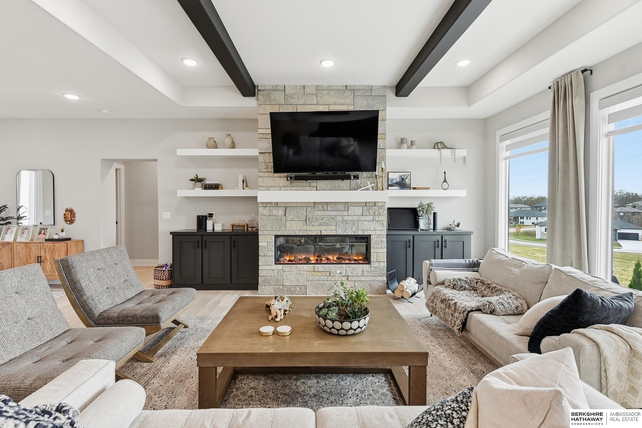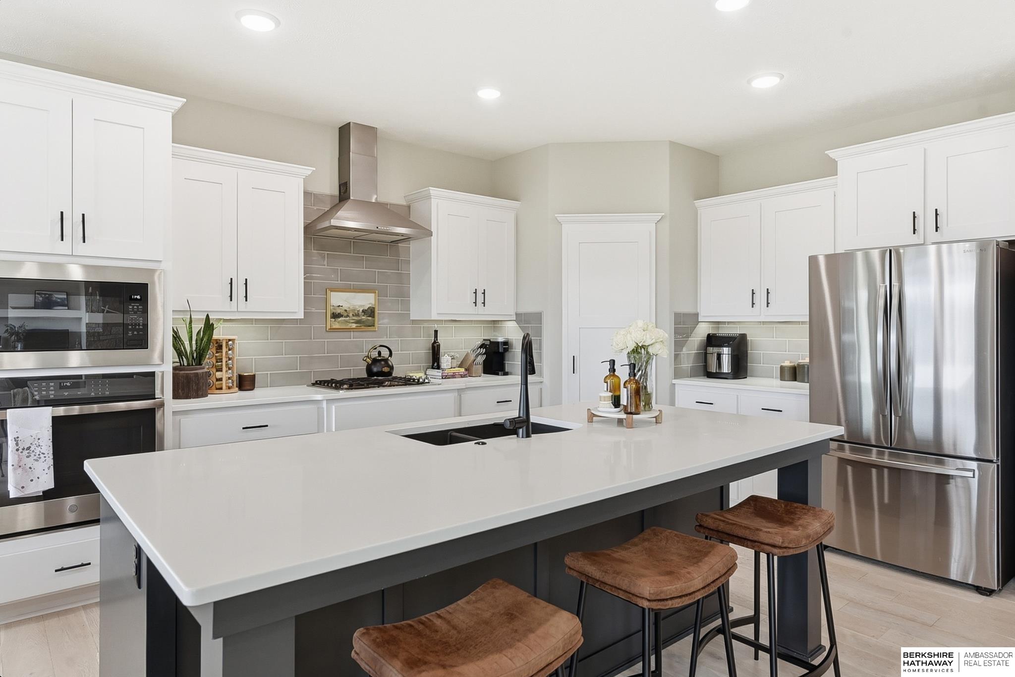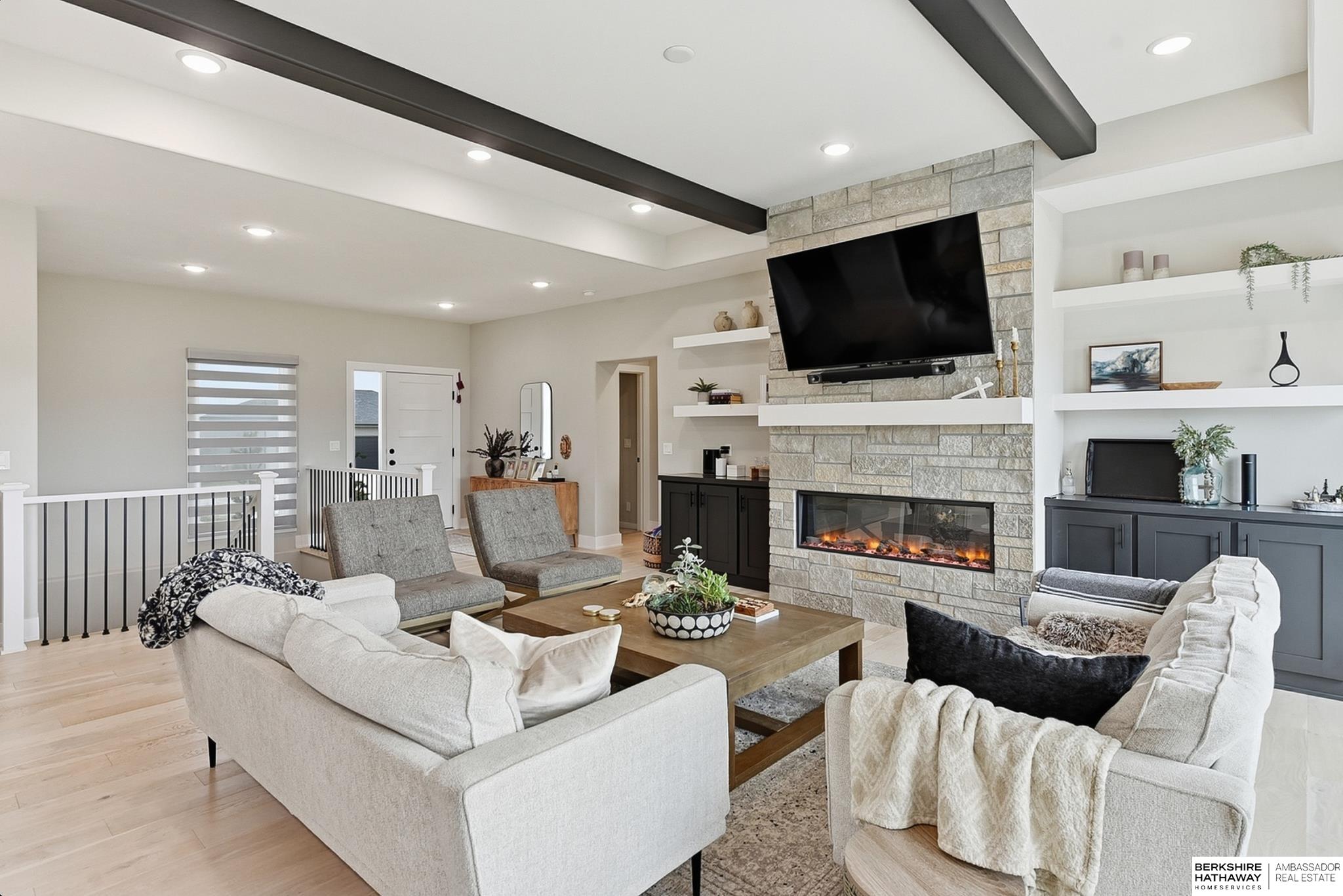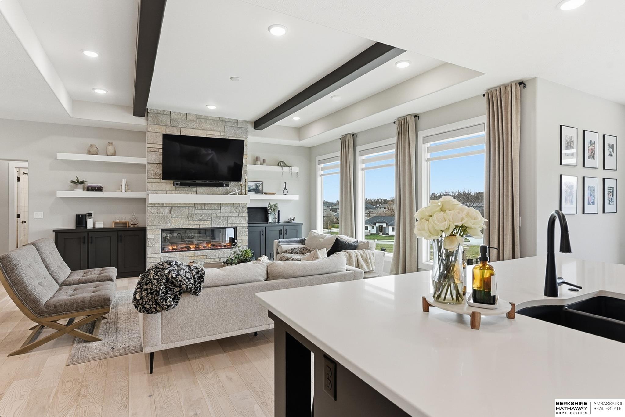 Located in the Elkhorn North School District this professionally designed walkout home has an inviting open-concept, blending modern elegance comfort & entertainment-ready amenities. Main level creates a warm & welcoming atmosphere w/ spacious great room & floor-to-ceiling stone fireplace. The kitchen boasts custom maple cabinetry, quartz, ceramic tile & walk-in pantry + 3 beds & 2 beautifully designed baths. Primary suite has spa-like bath w/ walk-in tile shower & dual vanity. The LL is purposefully designed for stylish hosting & everyday enjoyment with 2 beds + 3/4 bath, rec room w/ modern fireplace, stylish bar + a dedicated theater room. Walkout design provides effortless access to the beautiful outdoor retreat featuring a pool, built-in bar, & an expansive paver patio with fire pit, an ideal setting for gatherings that flow effortlessly from day to night. A spacious 3-car garage, including a polyaspartic coded floor, adds convenience & functionality. Truly an exceptional property.