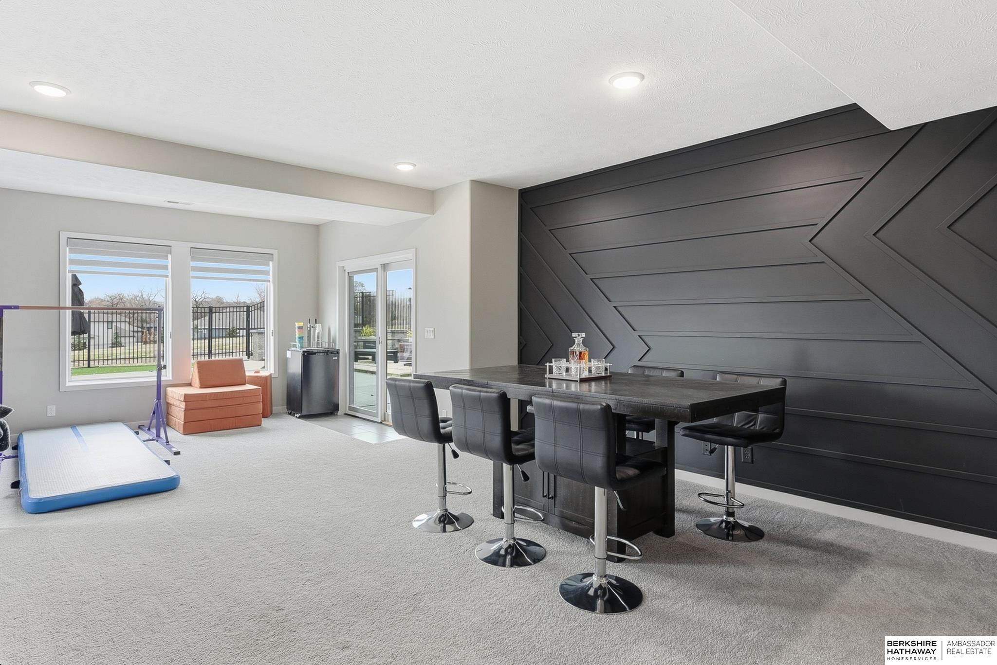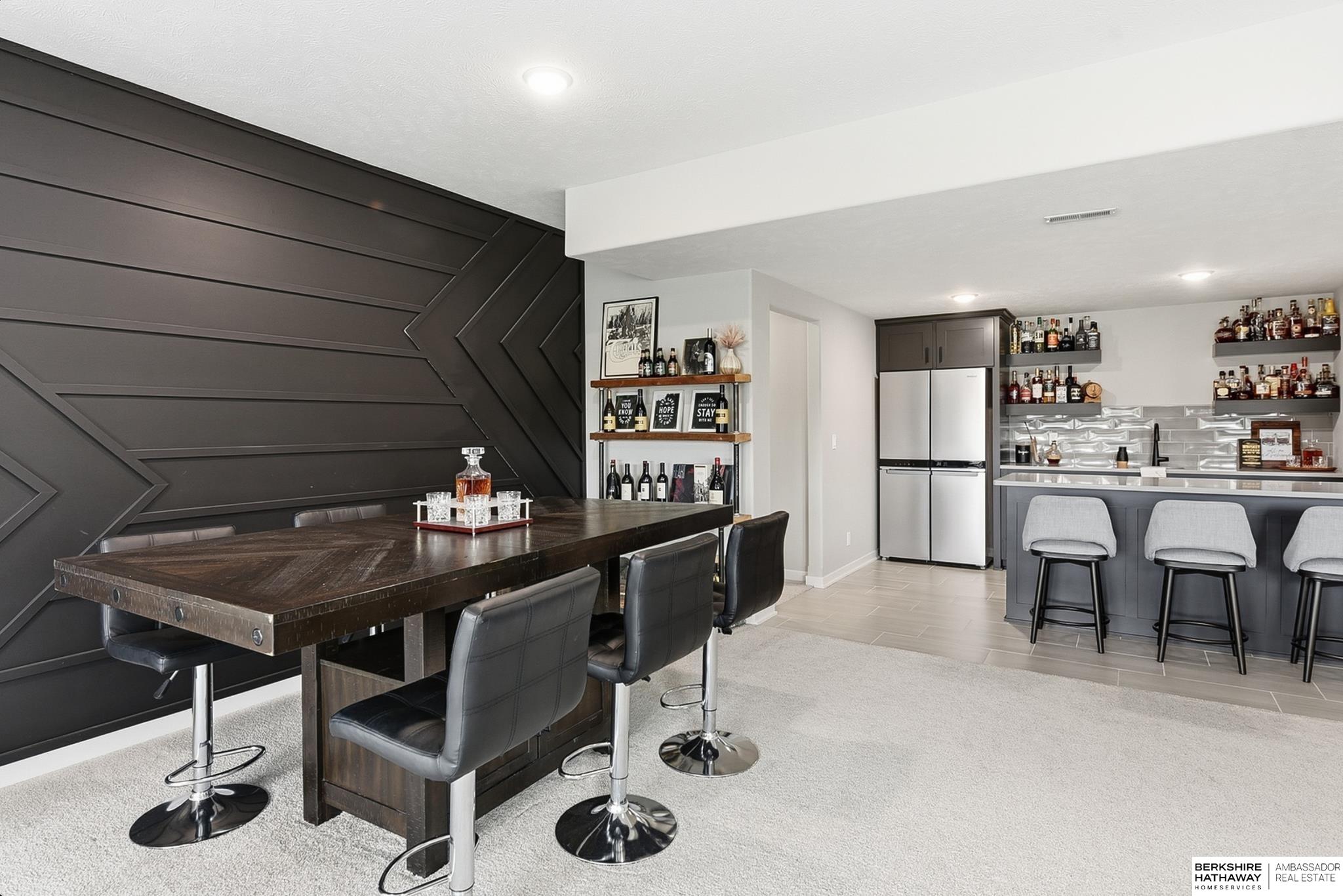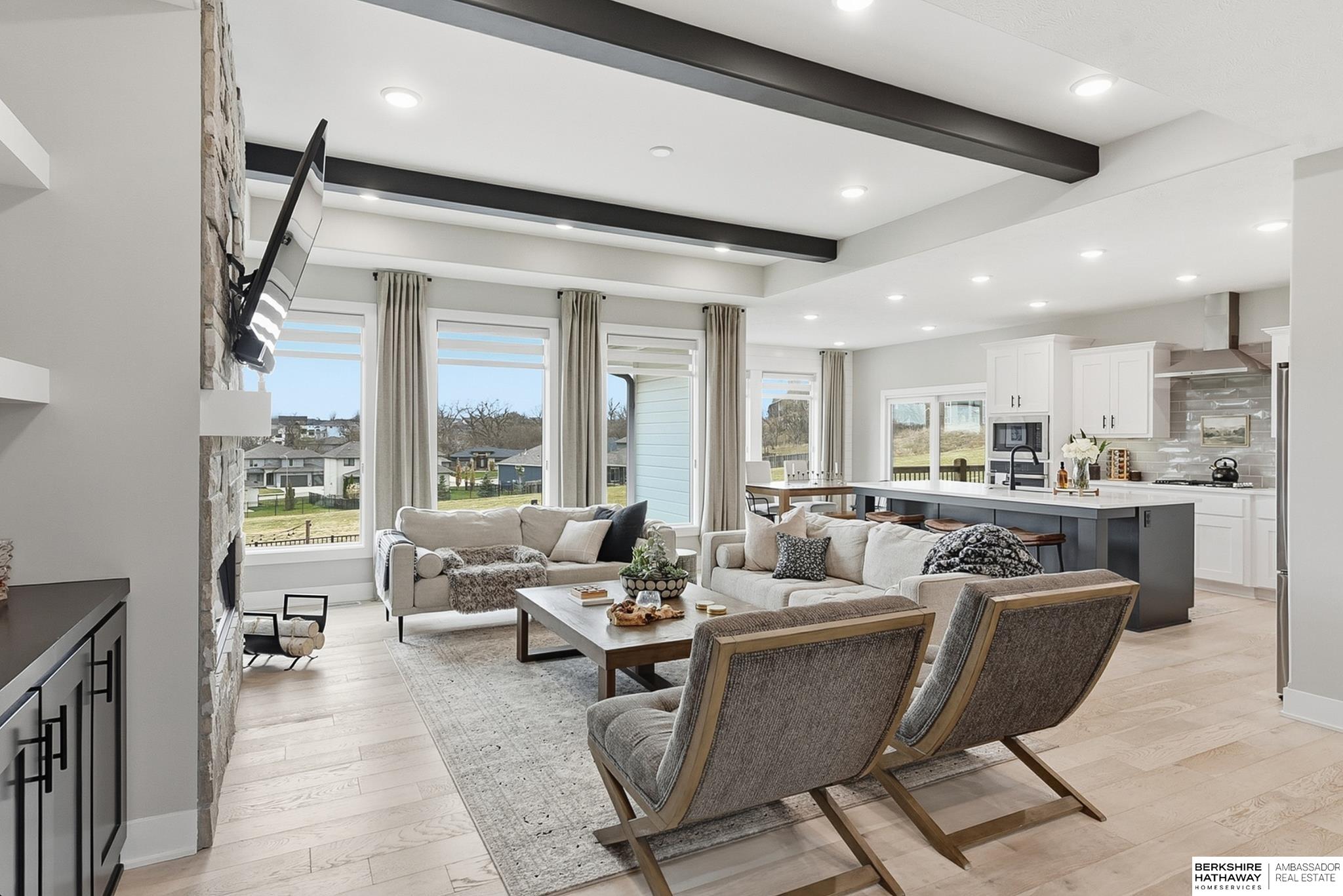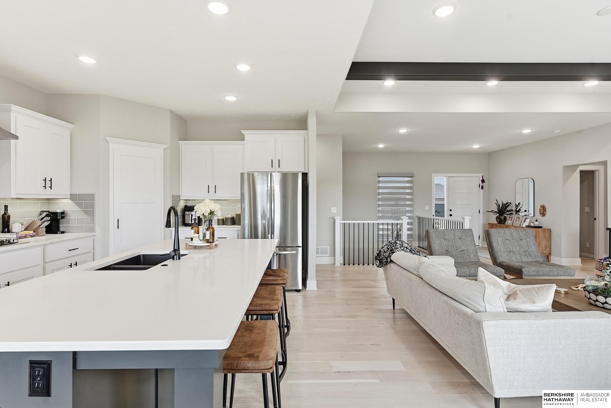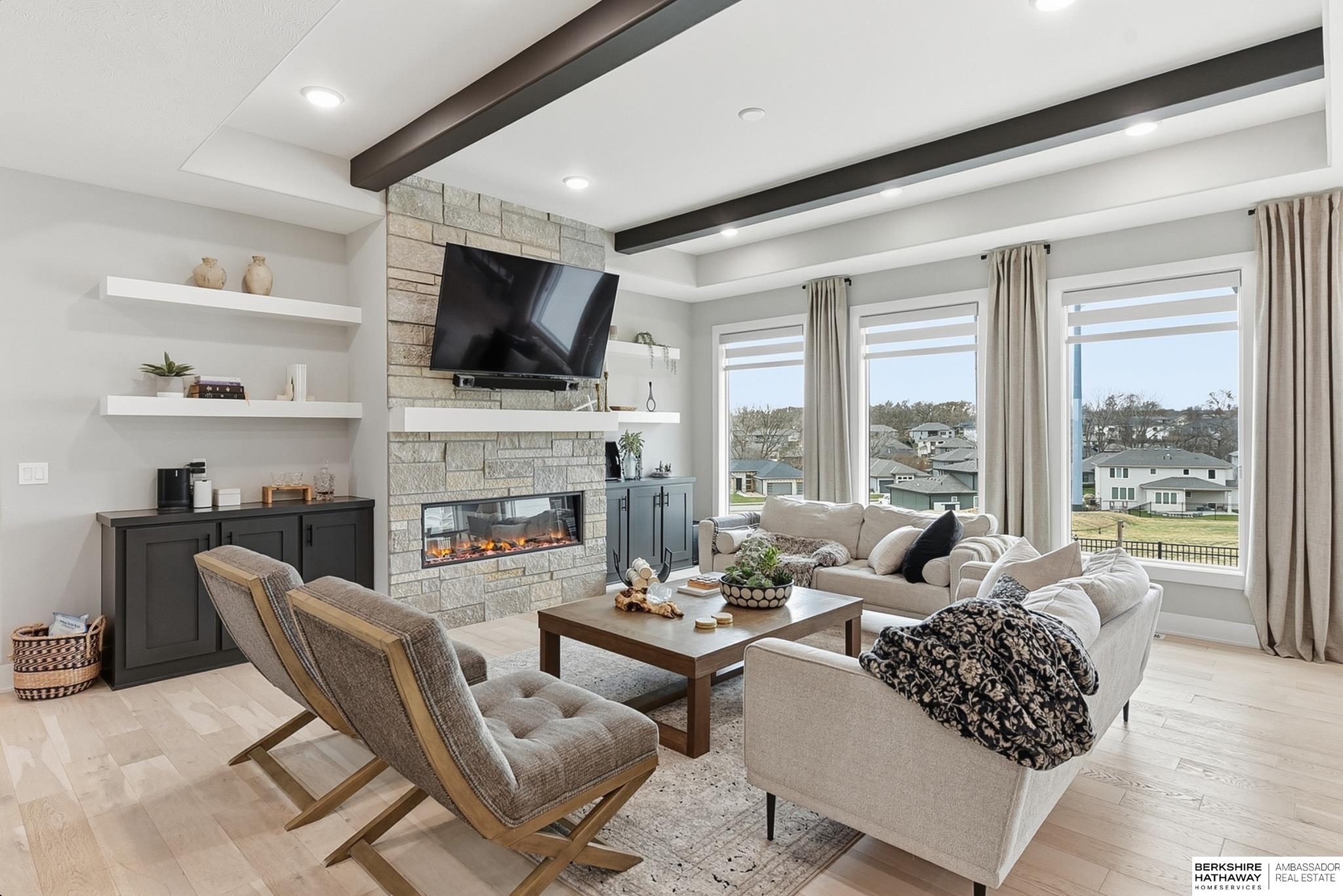 Located in the Elkhorn North School District this professionally designed walkout home has an inviting open-concept, blending modern elegance comfort & entertainment-ready amenities. Main level creates a warm & welcoming atmosphere w/ spacious great room & floor-to-ceiling stone fireplace. The kitchen boasts custom maple cabinetry, quartz, ceramic tile & walk-in pantry + 3 beds & 2 beautifully designed baths. Primary suite has spa-like bath w/ walk-in tile shower & dual vanity. The LL is purposefully designed for stylish hosting & everyday enjoyment with 2 beds + 3/4 bath, rec room w/ modern fireplace, stylish bar + a dedicated theater room. Walkout design provides effortless access to the beautiful outdoor retreat featuring a pool, built-in bar, & an expansive paver patio with fire pit, an ideal setting for gatherings that flow effortlessly from day to night. A spacious 3-car garage, including a polyaspartic coded floor, adds convenience & functionality. Truly an exceptional property.