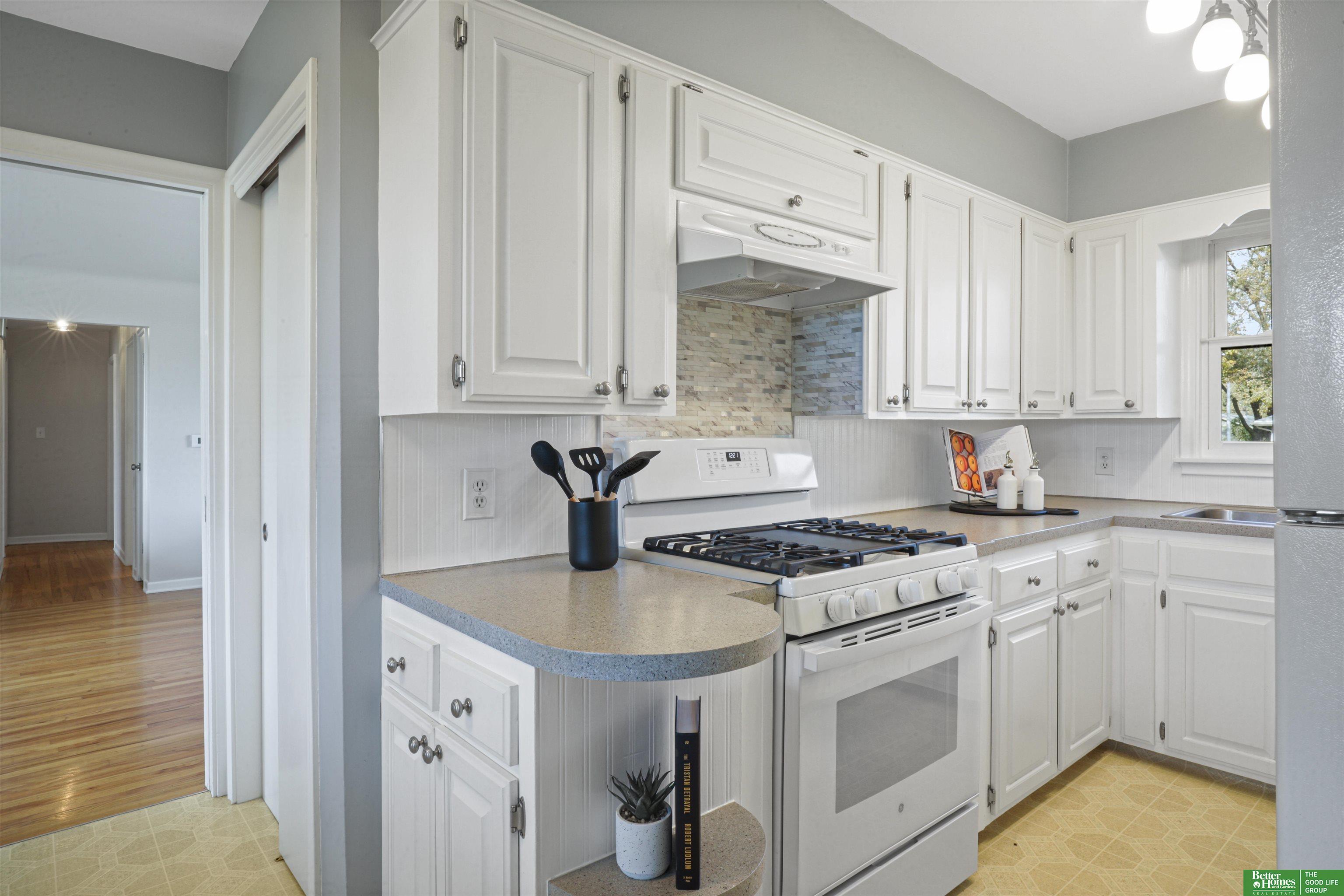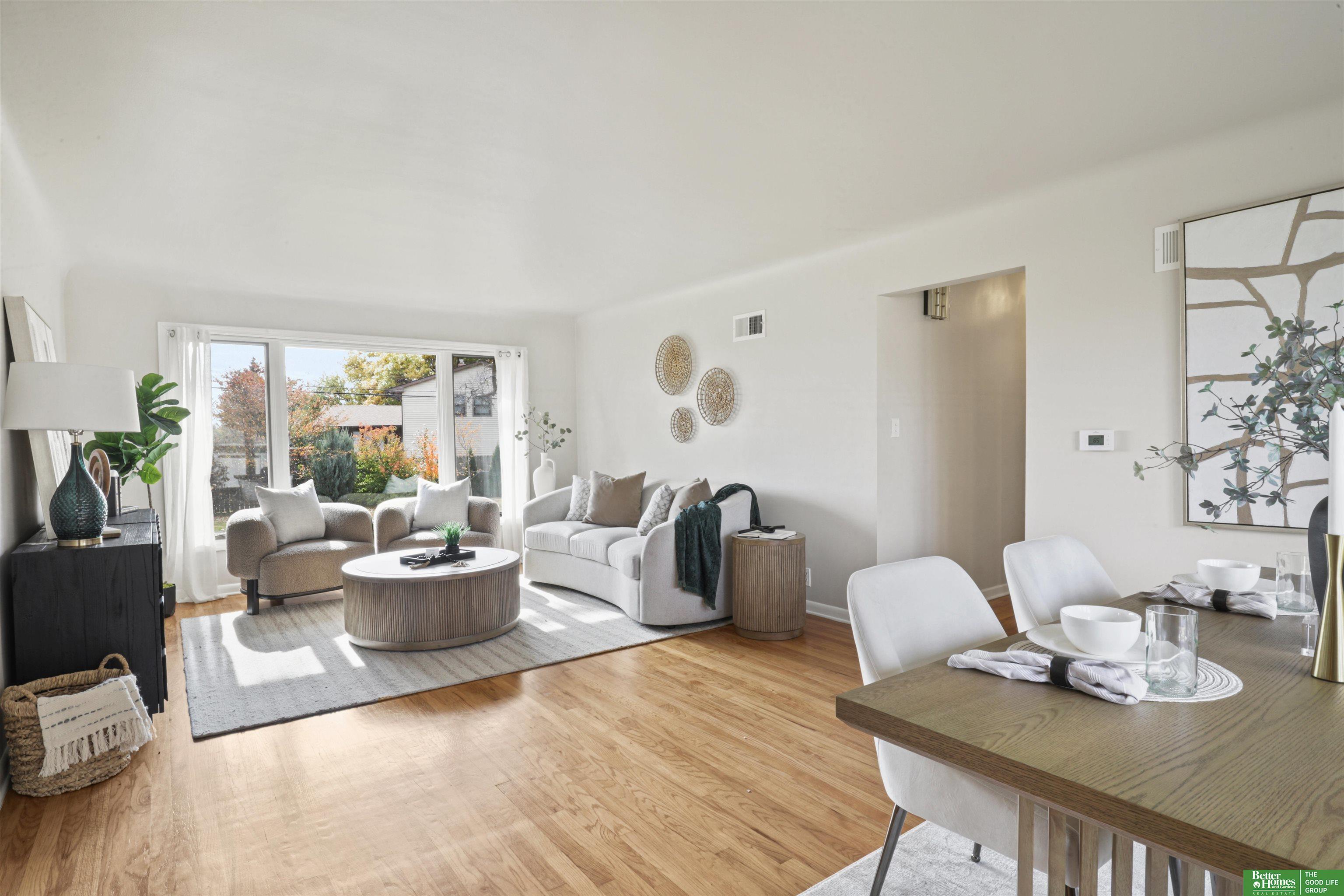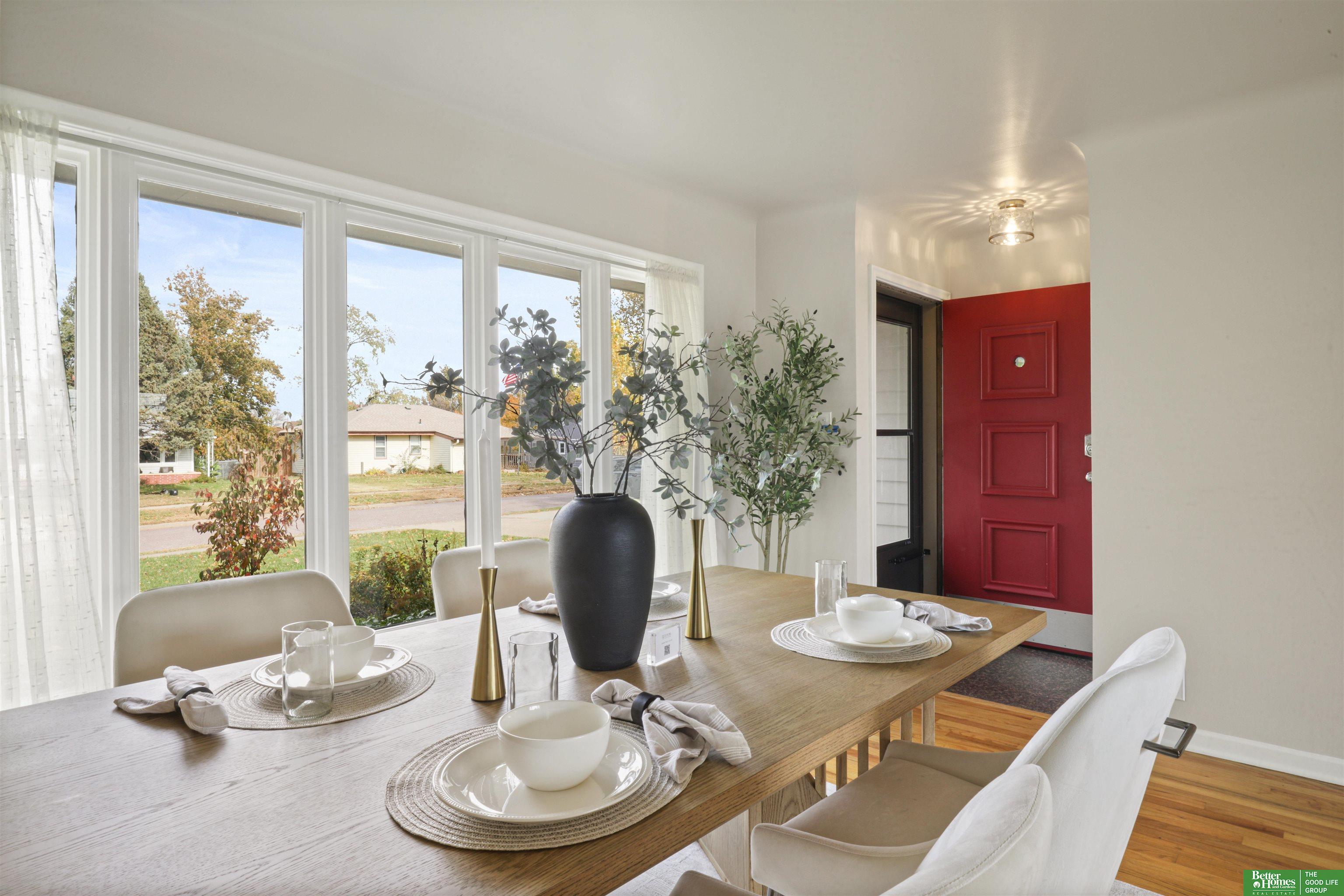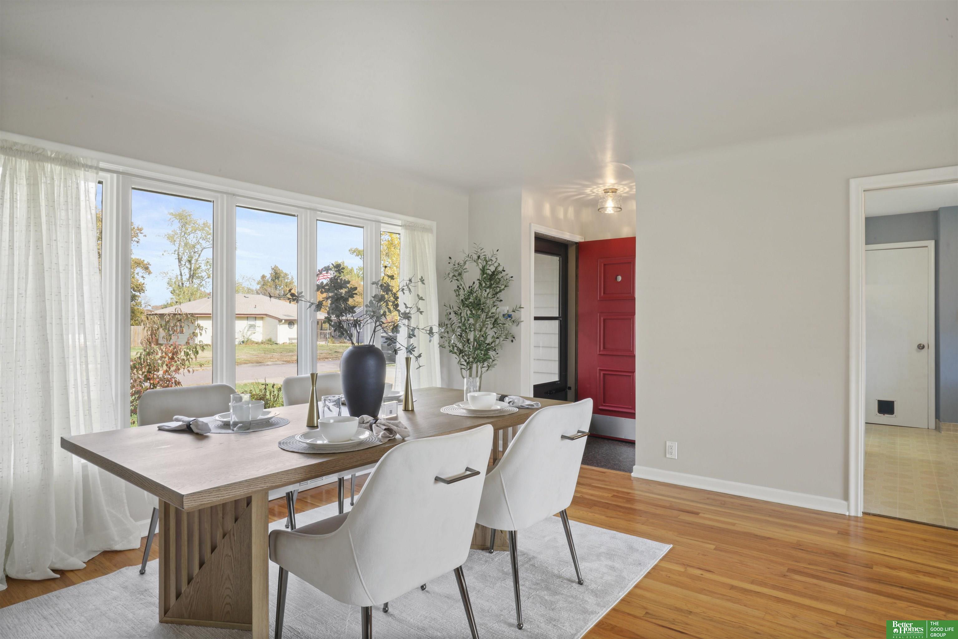 PRE-INSPECTED! Ranch home in Papillion at a hard-to-find price! This home features 1950s charm as you enter, greeted by beautiful hardwood flooring and tons of natural light. Main level offers two dining spaces, perfect for entertaining, or use the 2nd dining space as an extra sitting area instead! Home features 3 spacious bedrooms, all with ceiling fans. In the kitchen, you'll find a pantry closet and newer 5-burner gas range. Rest-easy with important upgrades done for you, including newer vinyl windows, newer Class 3 Impact-Resistant roof (transferable warranty), newer water heater, BRAND NEW furnace and AC with UV light filtration and humidifier, and upgraded attic insulation for lower utility bills. This home has been truly maintained and updated in all the right ways. Don't miss the extra concrete parking pad! Backyard is a fully-fenced oversized, flat yard. Beautiful landscaping surrounds home with oversized covered back patio. Washer/dryer stay.
