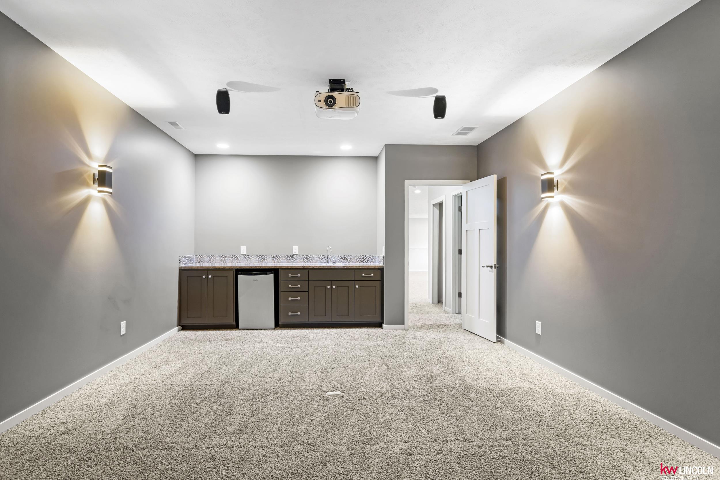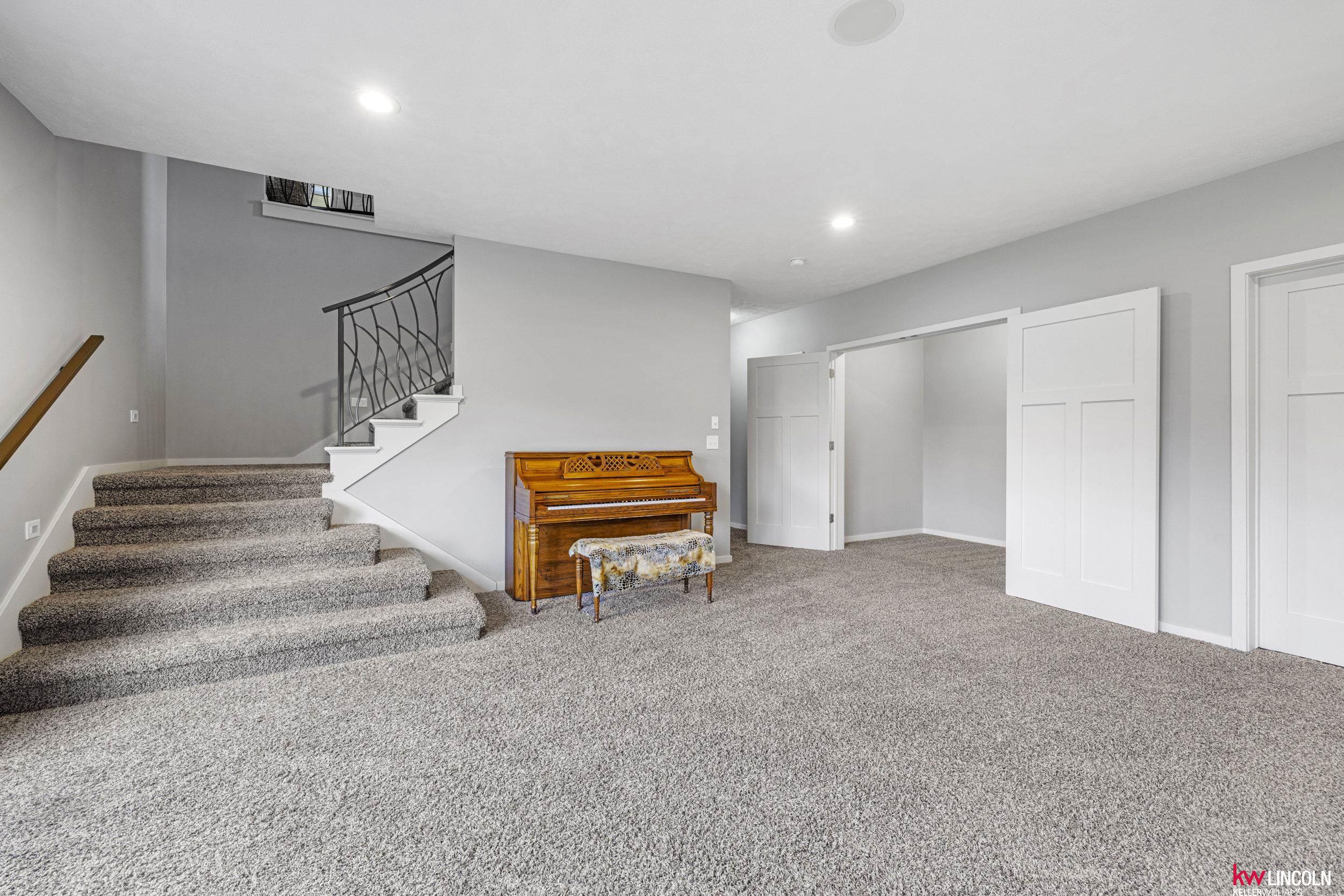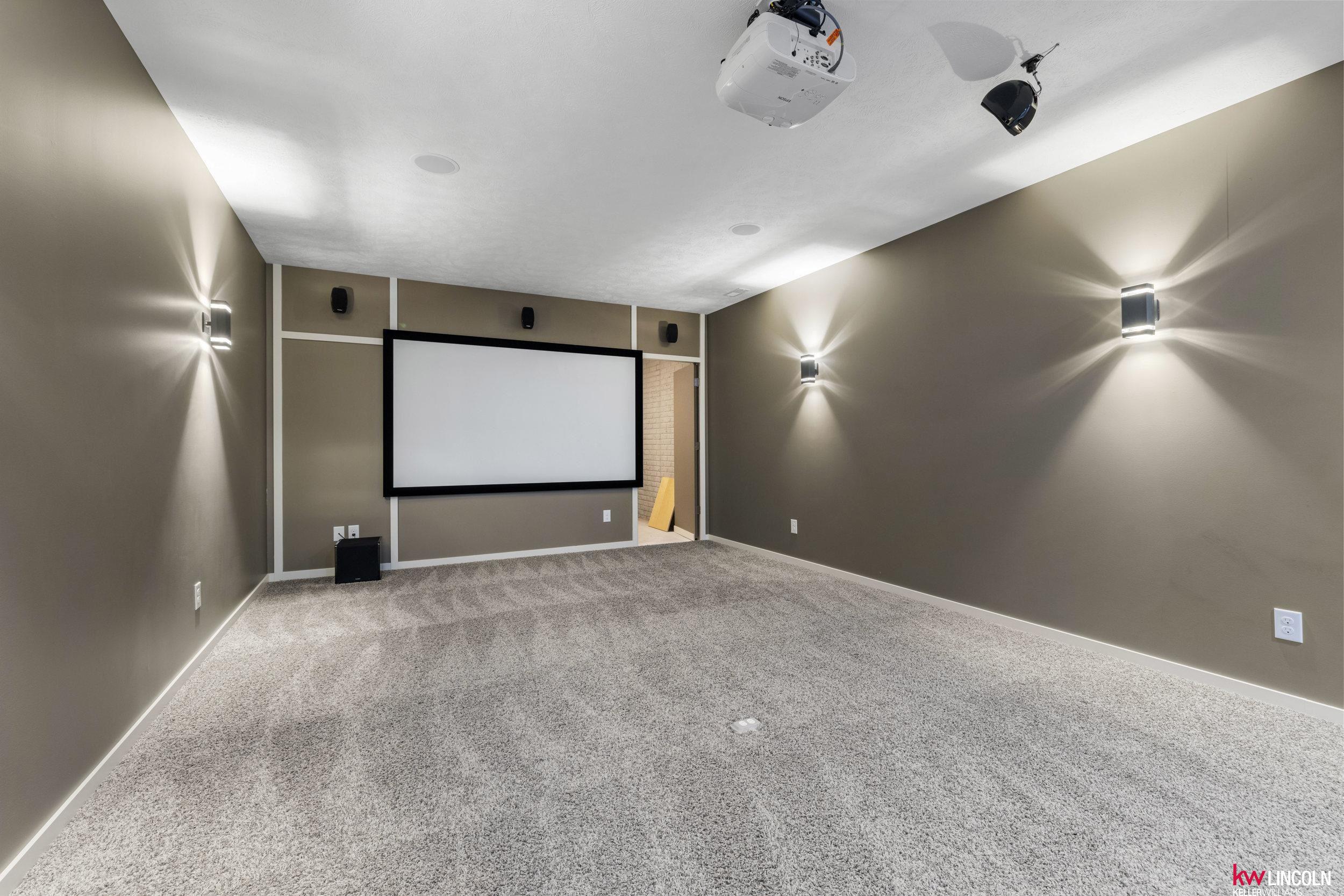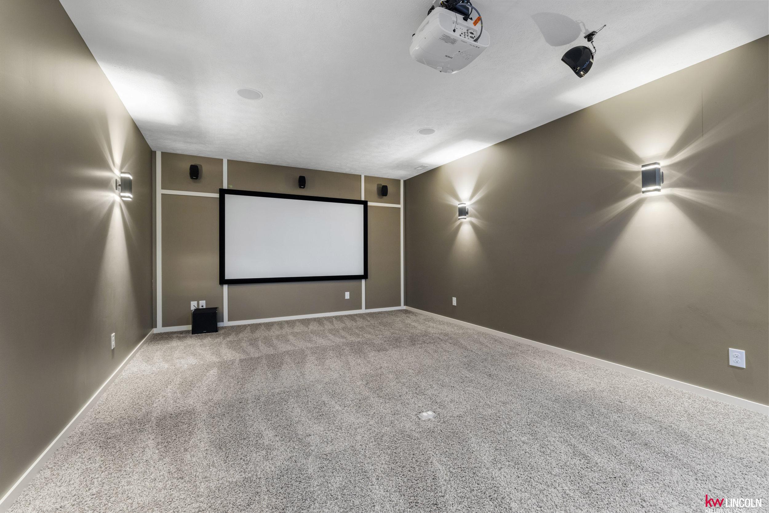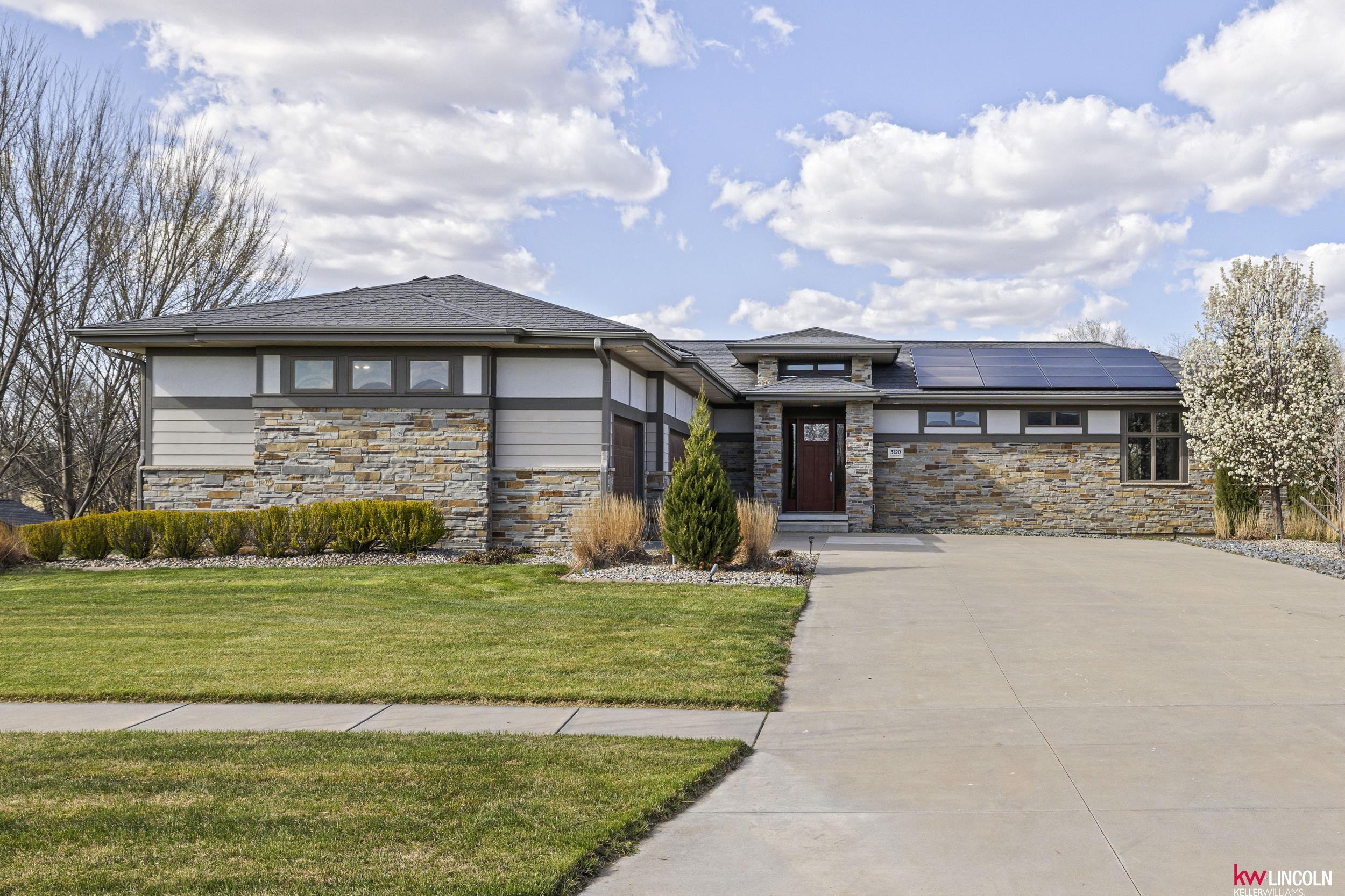 Luxury meets innovation in this energy-efficient ranch in The Bridges, featuring solar panels, a covered deck, wet bar, state-of-the-art theater, secret room, outbuilding, and invisible fence on a .48-acre lot. A grand entry opens to a vaulted living space with fireplace and a designer kitchen with induction cooktop, double ovens, and walk-in pantry. The dining room features a lit coffered ceiling, award-winning accent wall, and hidden office. The main level offers a primary suite with soaker tub, granite double vanities, and walk-in closet, plus a second bedroom, full bath, and laundry. The walkout lower level includes a family room, additional bedrooms, full bath, a state-of-the-art theater with wet bar, hidden storm room, and a secret room under the stairs. Outdoor highlights include tiered landscaping, covered deck and patio, outbuilding/shed, a 3-stall extra-deep garage, and energy-efficient upgrades including solar panels, geothermal heating and cooling, and an EV charger.