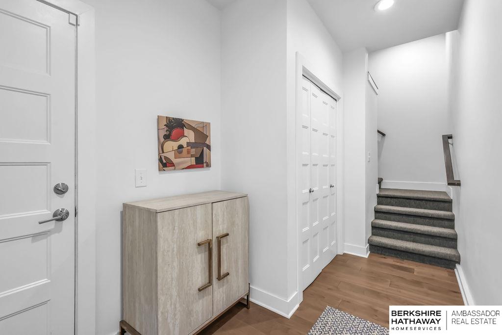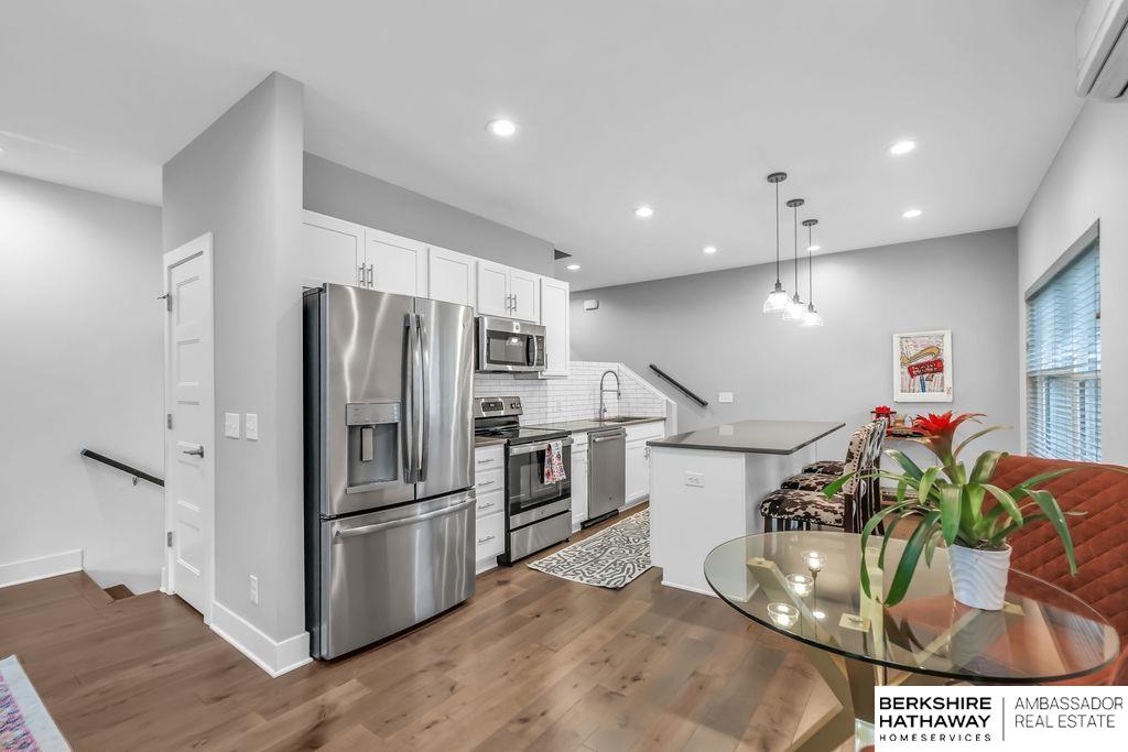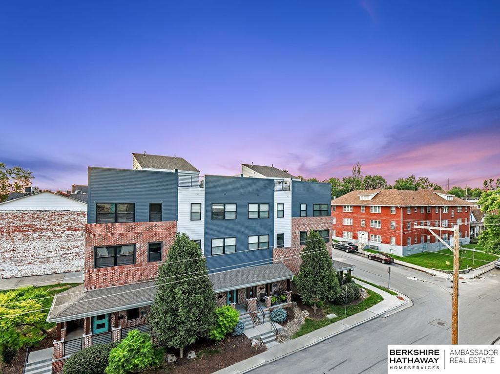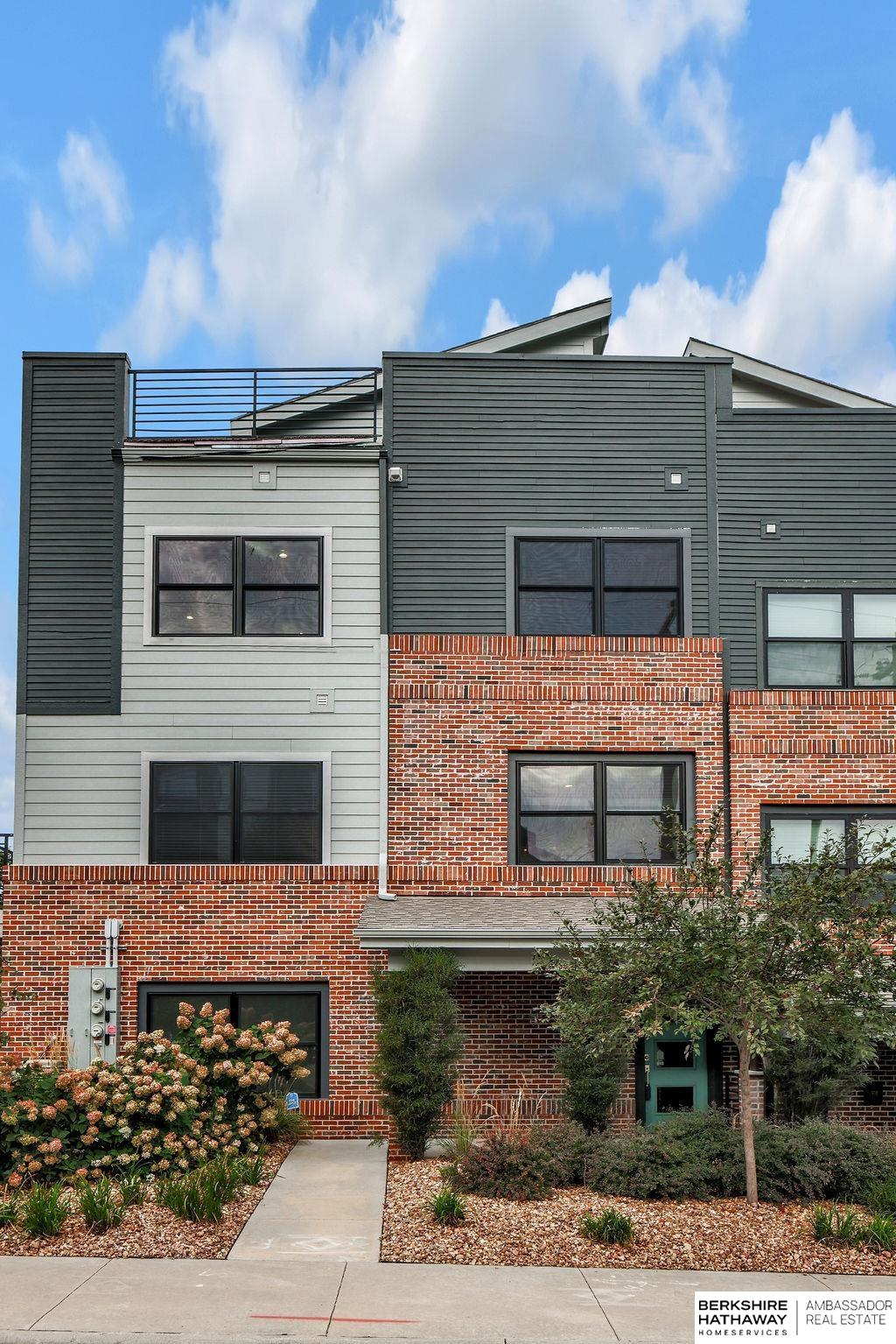 Modern Townhouse, desirable corner unit filled with natural light. Views of the Omaha skyline from roof top deck. Main level features living dining area that flows into the kitchen with a spacious island, quartz countertops and stainless steel appliances. Upstairs the oversized primary suite includes two walk in closets and a spa inspired bathroom with dual sinks, quartz countertops and beautiful tiled shower. Another bedroom with large walk in closet, perfect for a home office or guest room. Additional highlights include a 2-car garage, rooftop solar panels, new Roof 2025, new energy efficient windows 2024 & new paint throughout 2025. Low maintenance living with HOA-covered lawn care, landscaping, and snow removal. With panoramic skyline views and a rooftop setting rarely found, this property stands out as a unique offering. Just moments from Blackstone, UNMC, Creighton and the Old Market, this townhome offers convenience, style & investment versatility for Airbnb/short term rental.