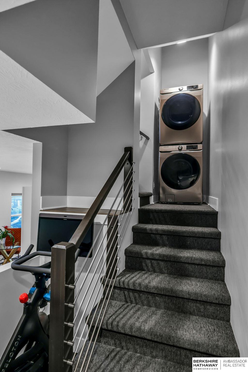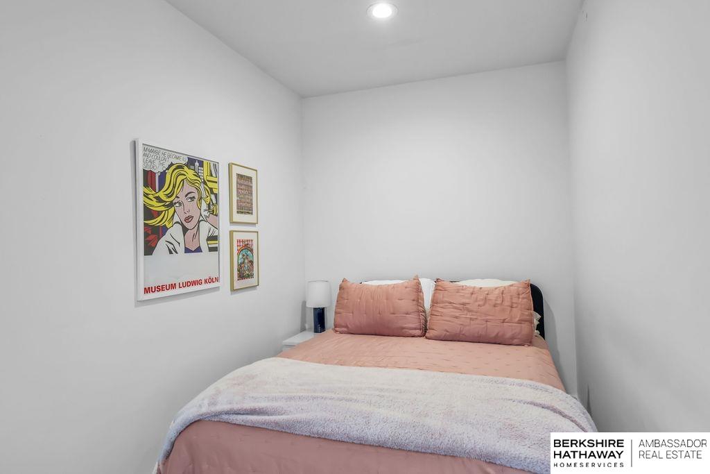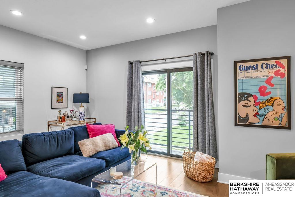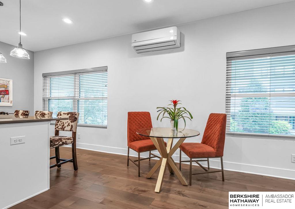 Modern Townhouse, desirable corner unit filled with natural light. Views of the Omaha skyline from roof top deck. Main level features living dining area that flows into the kitchen with a spacious island, quartz countertops and stainless steel appliances. Upstairs the oversized primary suite includes two walk in closets and a spa inspired bathroom with dual sinks, quartz countertops and beautiful tiled shower. Another bedroom with large walk in closet, perfect for a home office or guest room. Additional highlights include a 2-car garage, rooftop solar panels, new Roof 2025, new energy efficient windows 2024 & new paint throughout 2025. Low maintenance living with HOA-covered lawn care, landscaping, and snow removal. With panoramic skyline views and a rooftop setting rarely found, this property stands out as a unique offering. Just moments from Blackstone, UNMC, Creighton and the Old Market, this townhome offers convenience, style & investment versatility for Airbnb/short term rental.