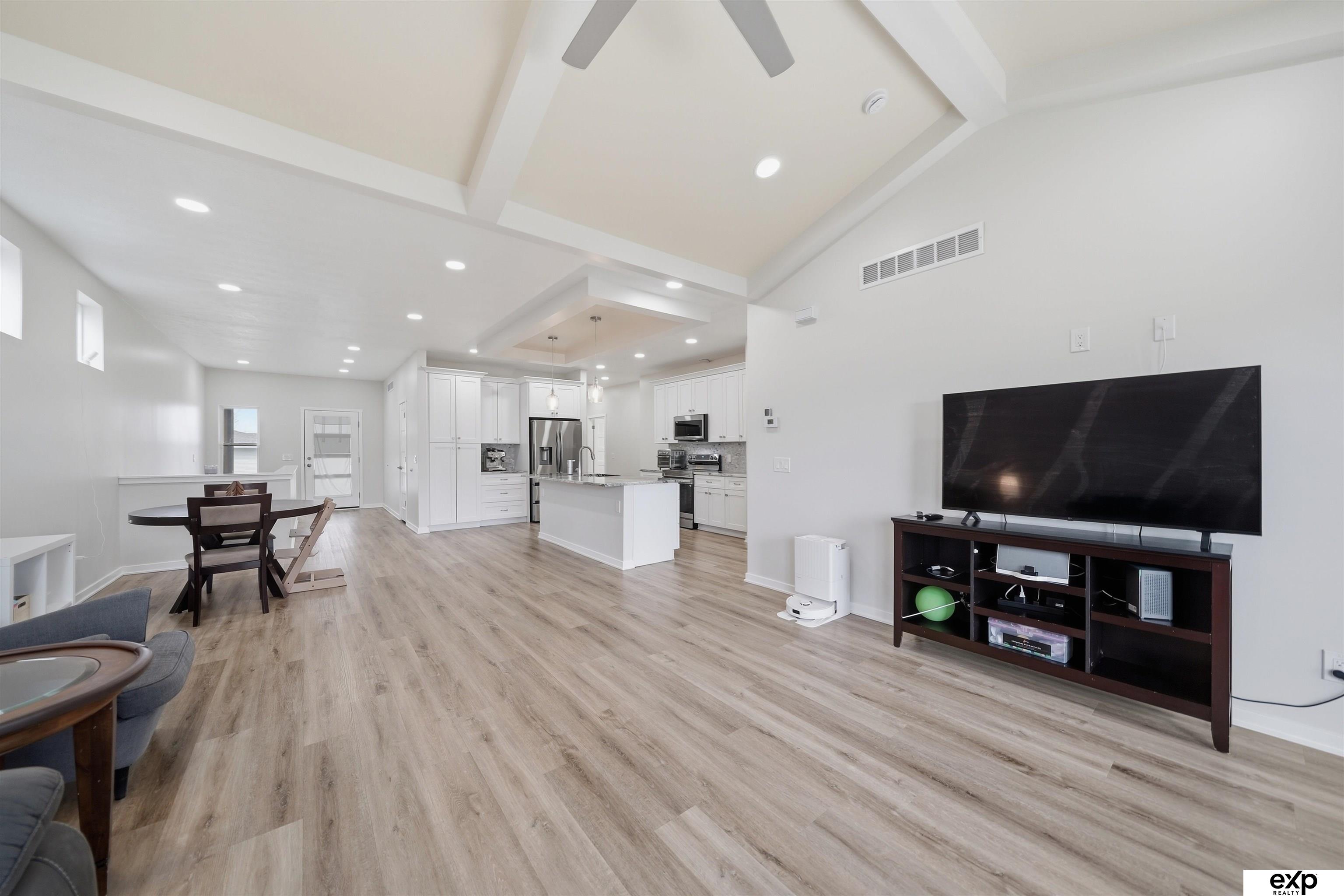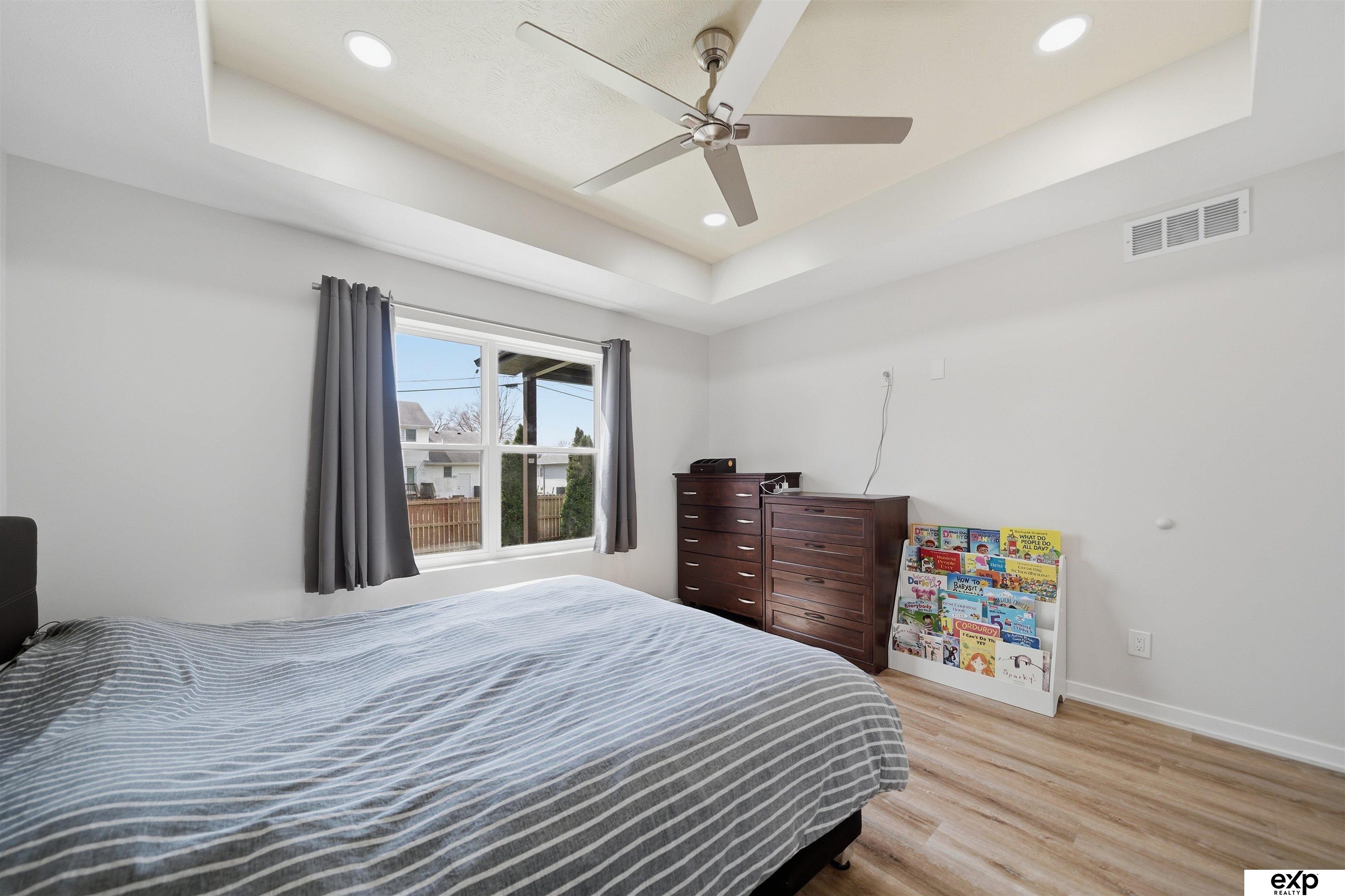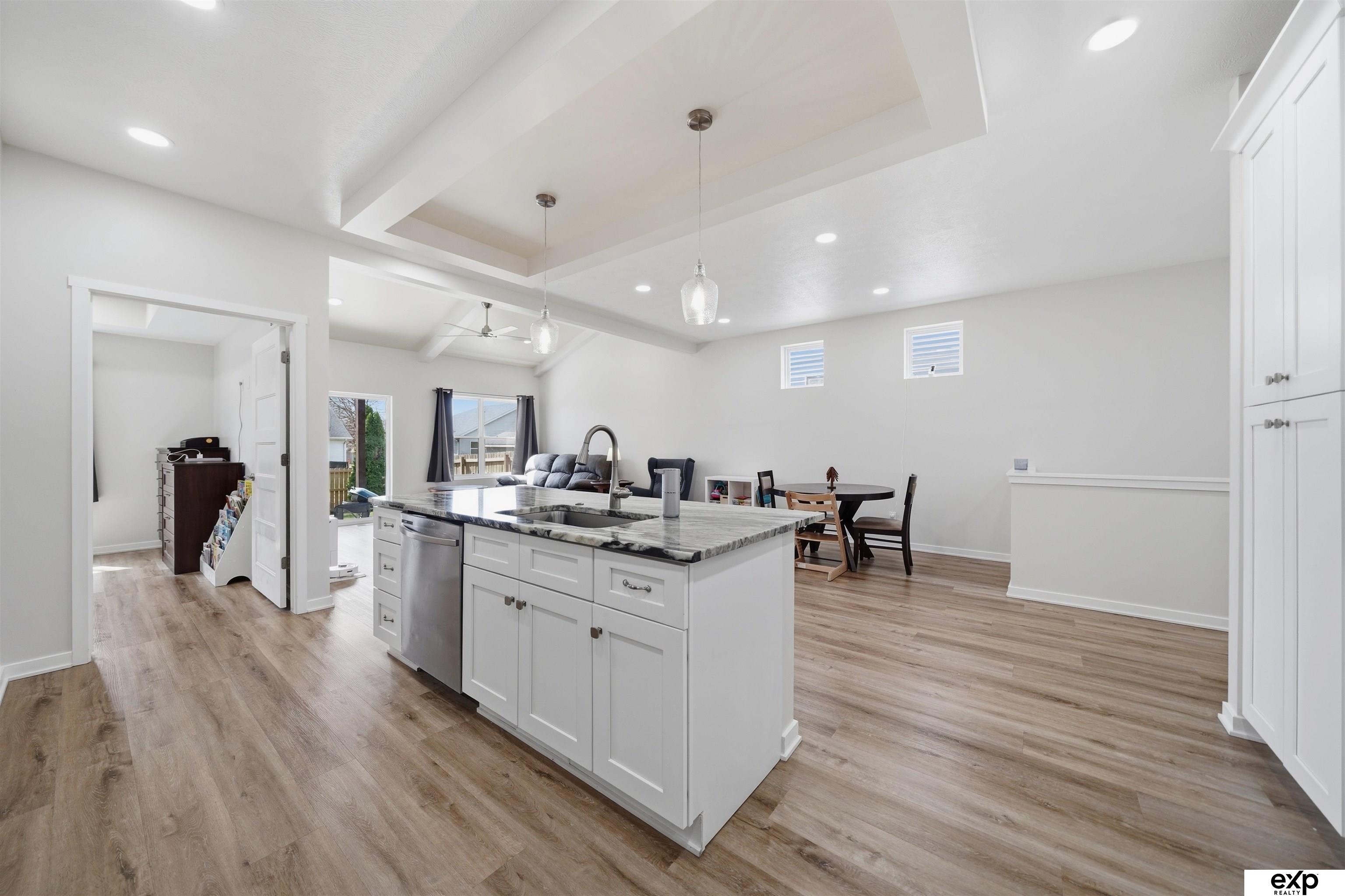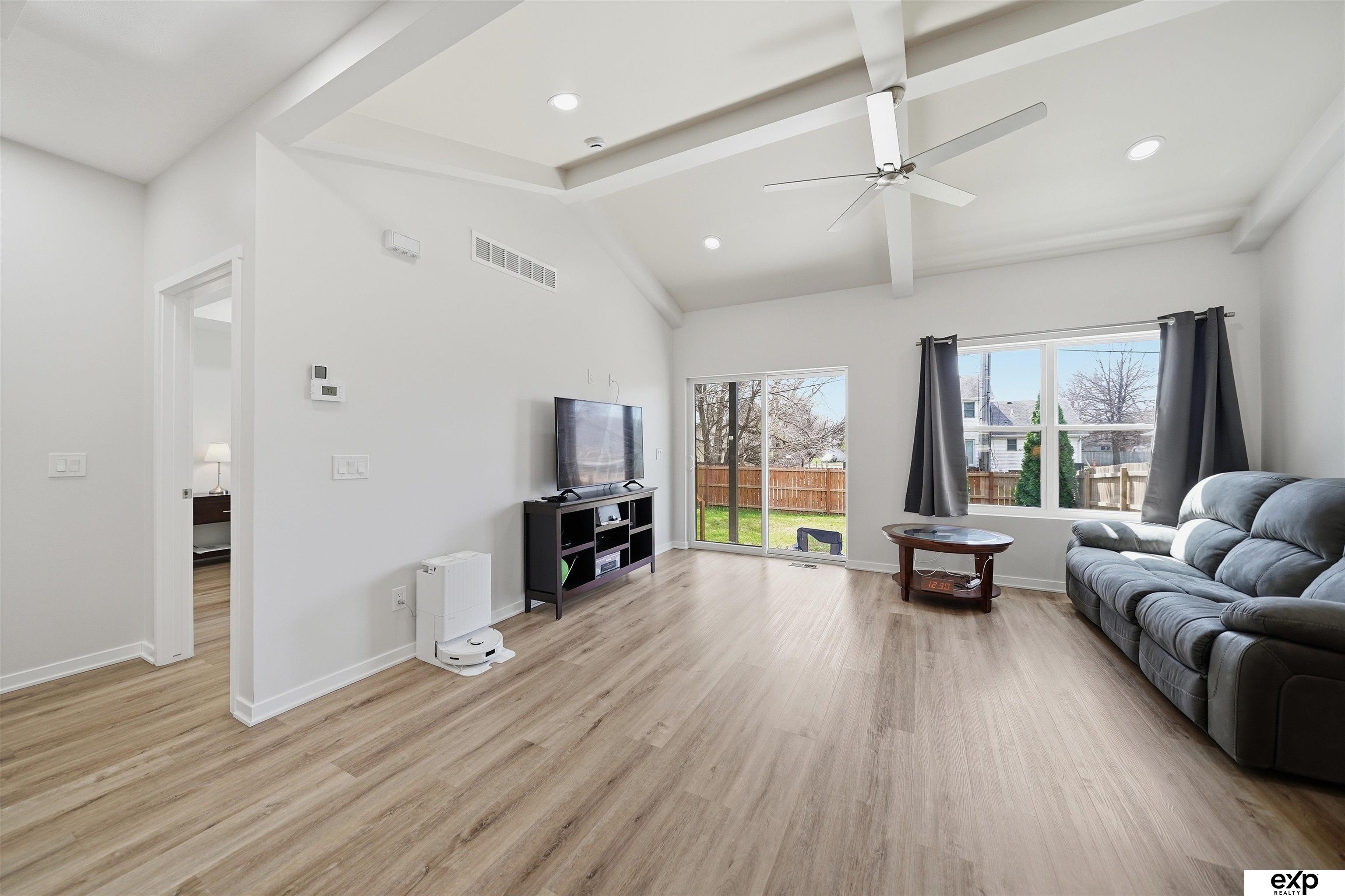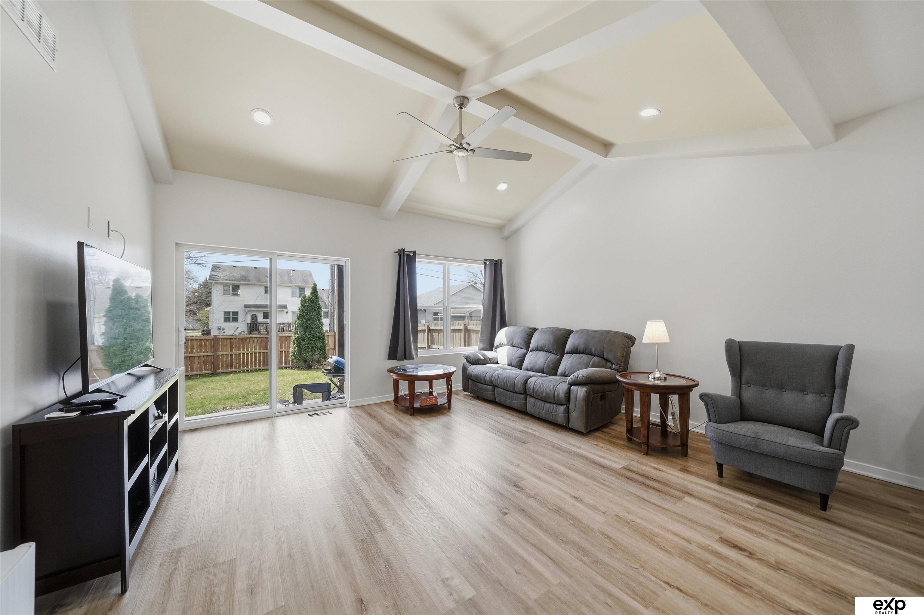 Spacious 4 bedroom, 3 bath, 2-stall, open concept newer home, beamed vaulted ceiling, quartz countertops, coffered ceiling, main floor laundry, primary suite and 2nd bedroom. Downstairs are 2 more large bedrooms with egress windows and a large family room, fireplace, and storage area. All the new systems in this 2023 built home, like passive radon, new HVAC, new appliances, new everything. Privacy fenced yard and mature trees in a developed area, which means no new construction noise, no going around truck traffic, and no dodging debris in the street. No HOA. Very accessible near I-80 and downtown, street scene is a quiet location with no through traffic, home is by a cul-de-sac & dead-end which overlooks greenspace and park area (homeowners love this hill for sledding as well as the friendly community surrounding their home). Large windows, lightly colored interior, covered entrance and covered patio. Appt required to show.