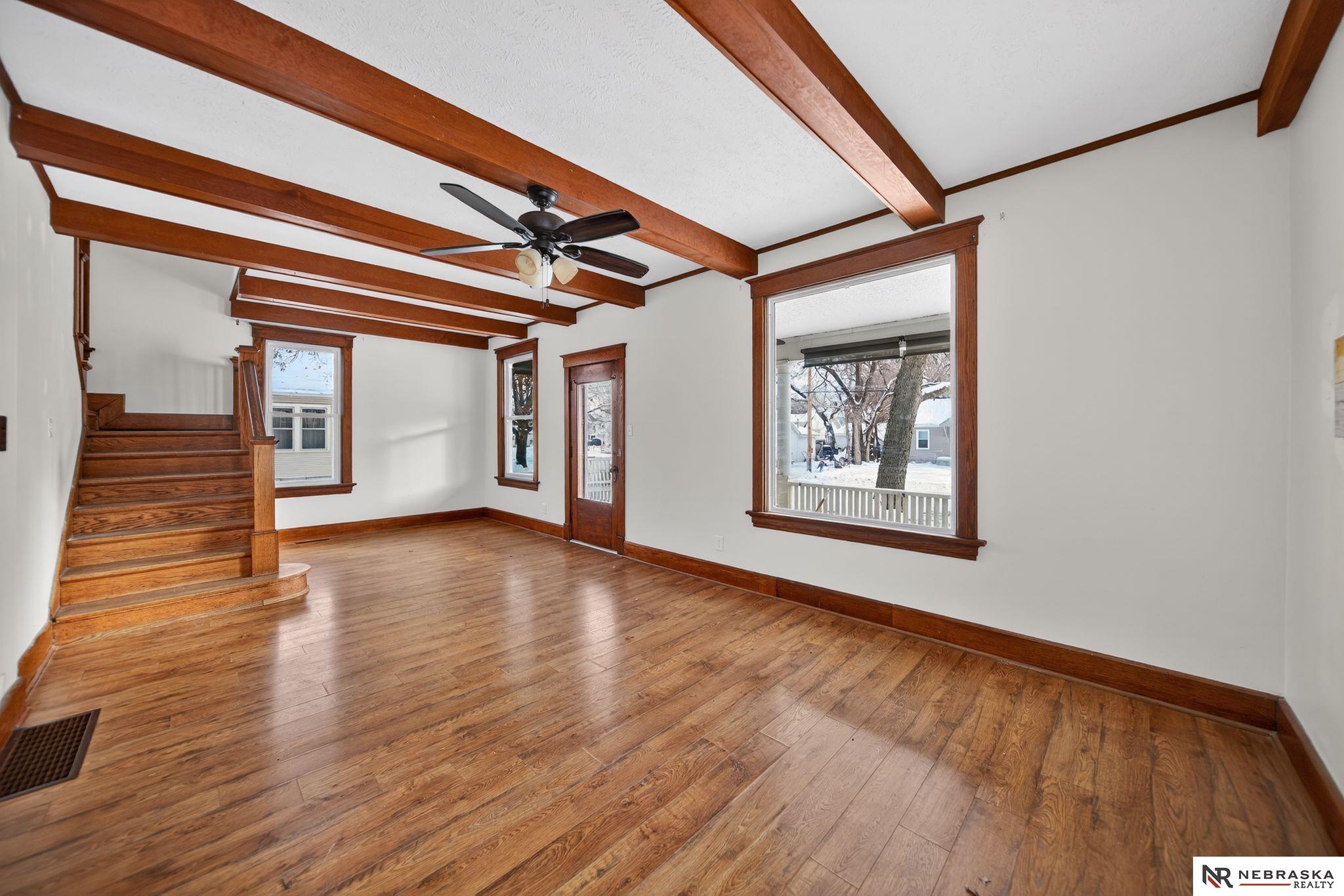 This charming two-story home, updated a few years back, now offers 3 beds, 2 baths, & an oversized 3-car garage w/built-in storage & a workbench. The living rm still boasts its exposed beams & open staircase, showing some lived-in character over time. The dining rm features a gas fireplace, a lrg built-in hutch, & original parquet flooring that has seen some use but remains full of charm. The kitchen includes a generous pantry, SS appliances, & a Culligan reverse osmosis system added in 2020. Just off the kitchen is a mudrm that could still be converted into a main-flr laundry space if desired. The bsmt provides a sizable living area along w/the laundry & addt'l storage. Upstairs, you'll find 3 beds, full bath, & a convenient storage closet. Improvements made over the years include a water softener & whole-house humidifier installed in 2020, fresh interior paint in 2020, & a new heat pump added in 2019. The roof & windows, originally replaced in 2015, are holding up well w/normal wear.