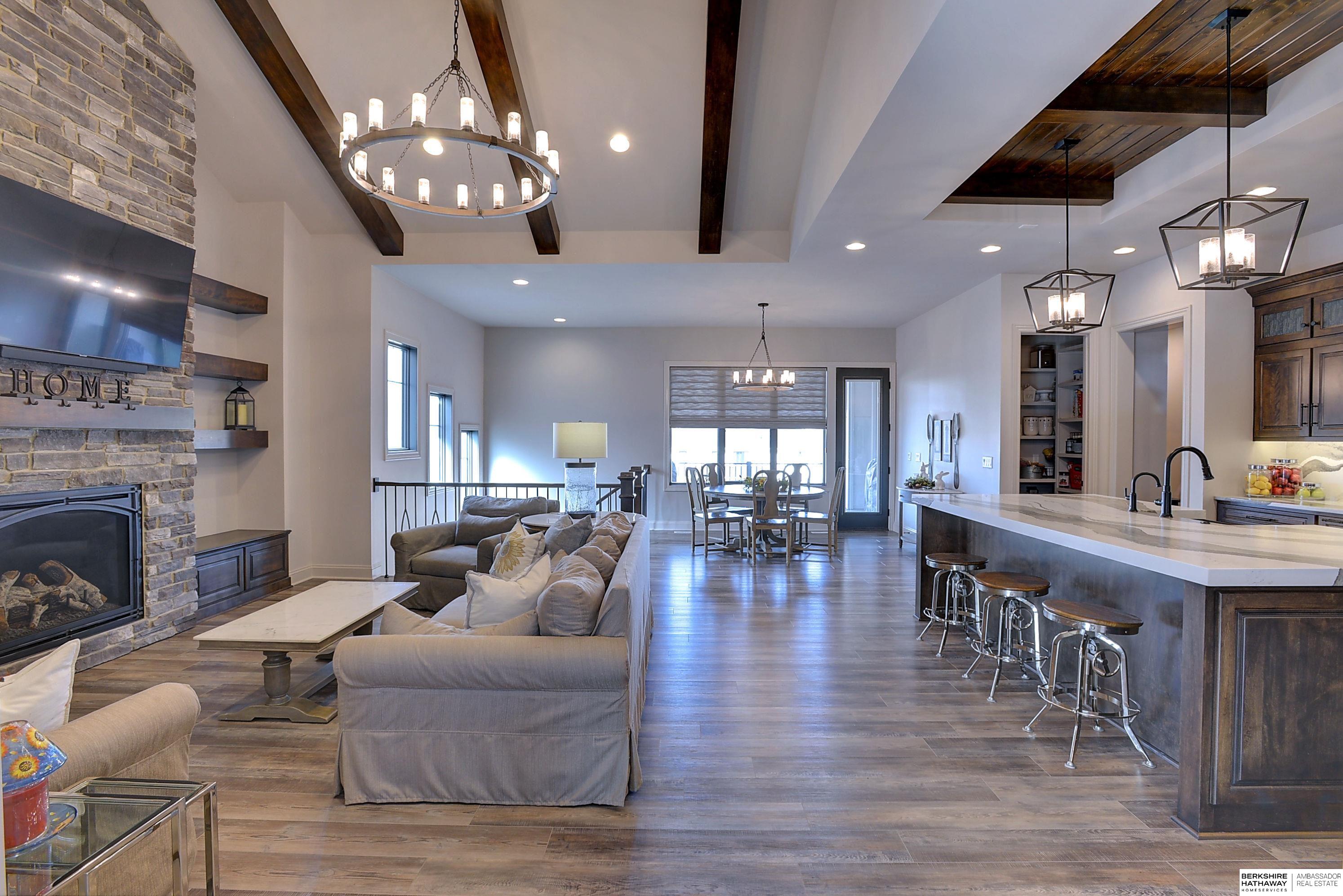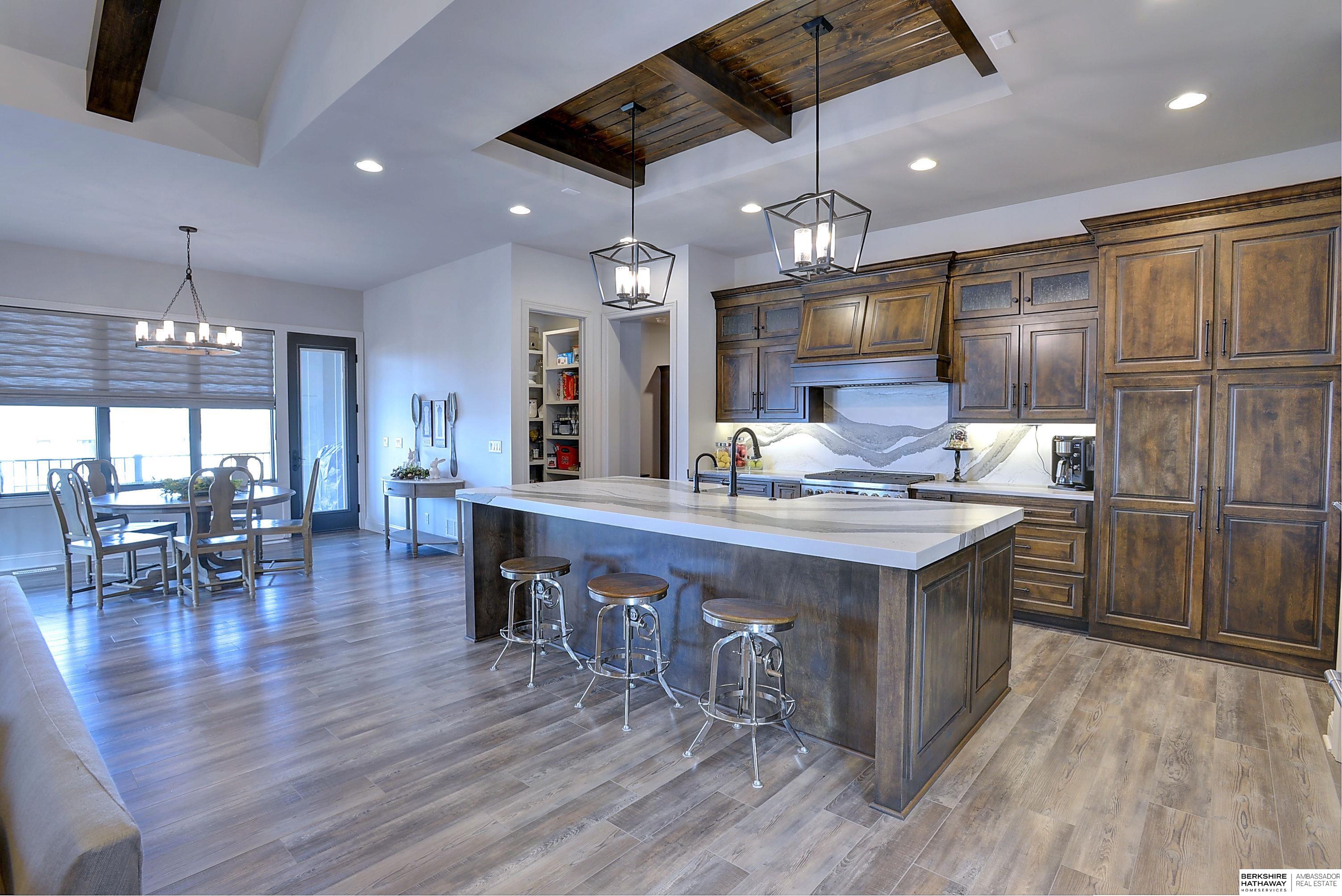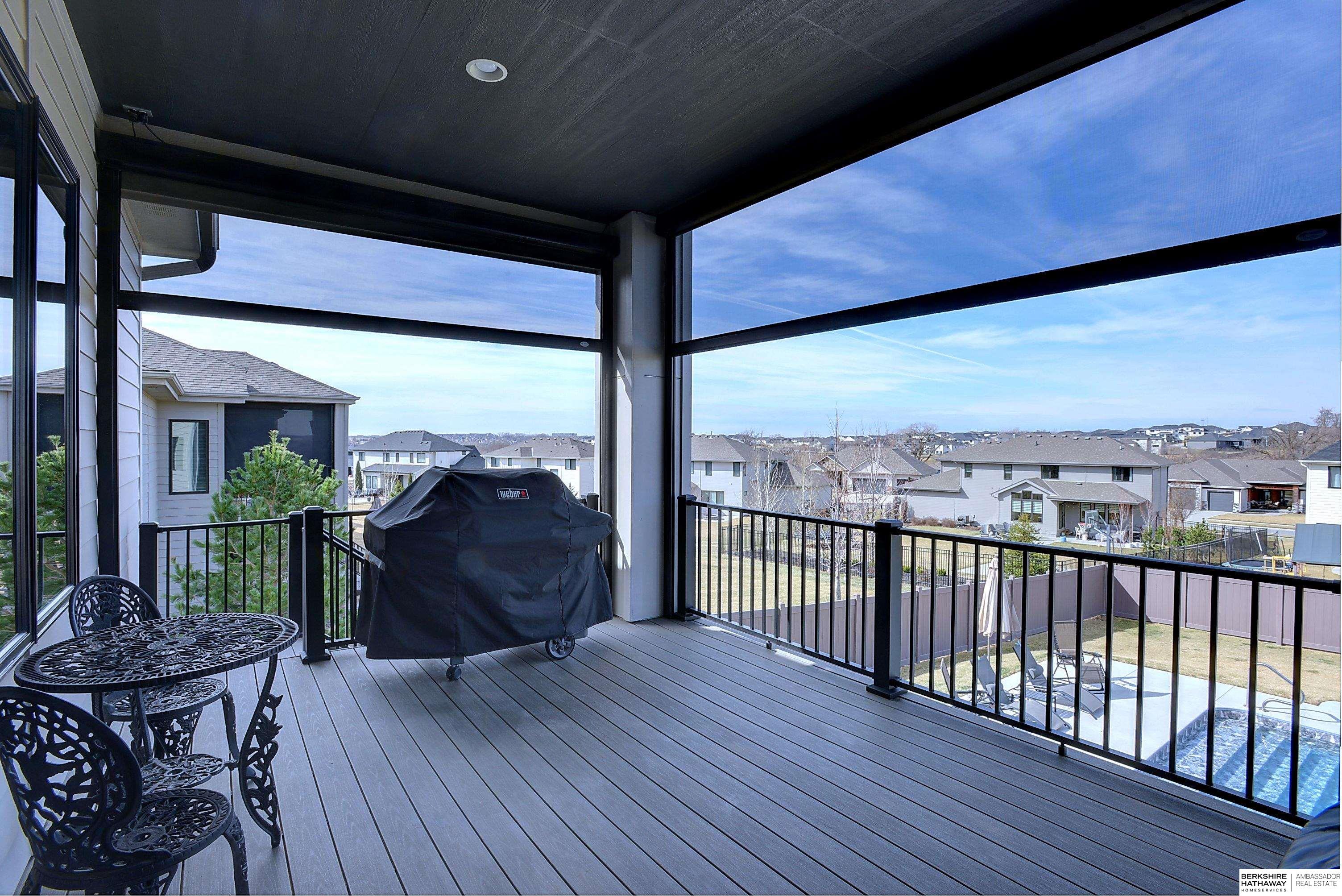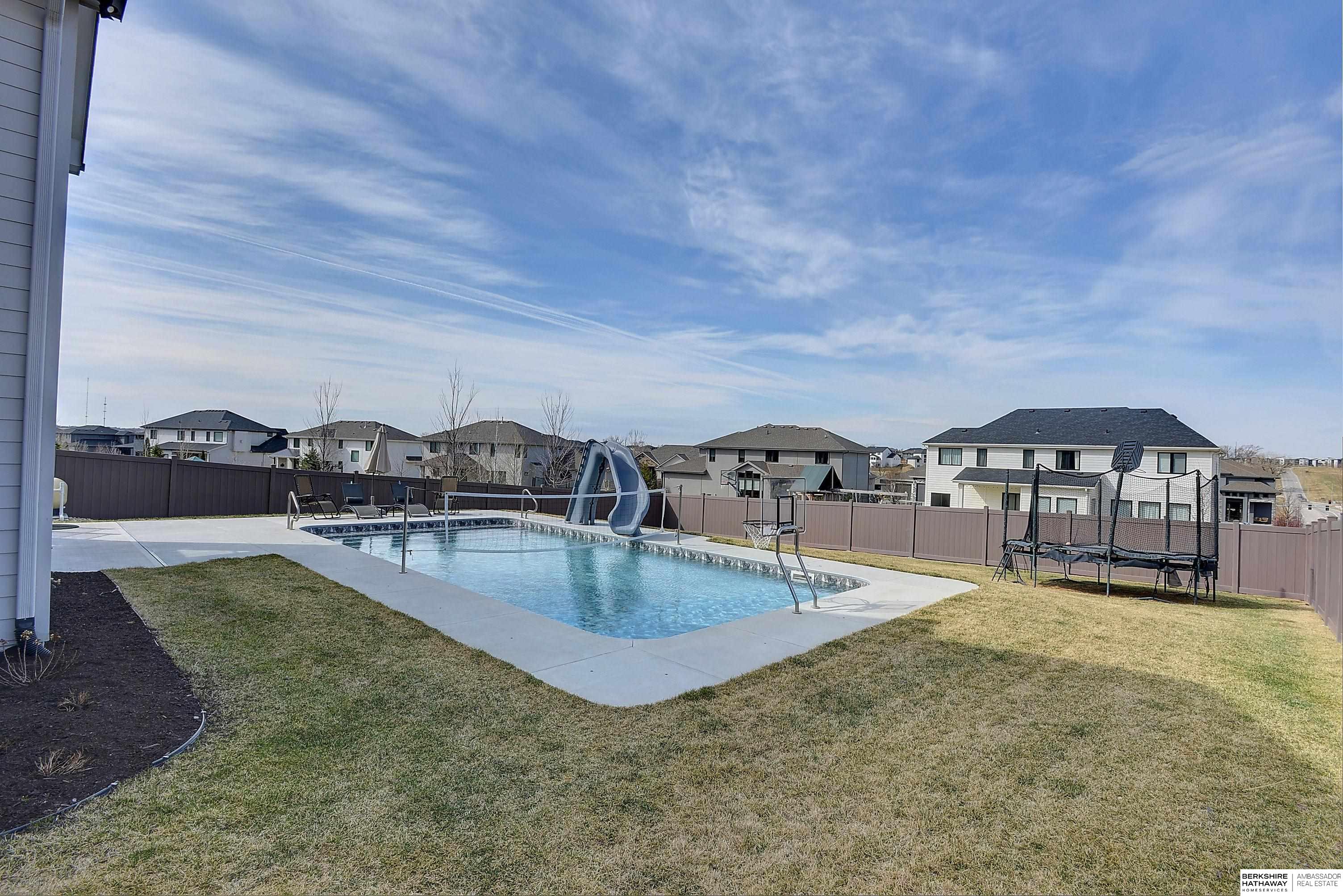 Exceptional Ranch home on corner lot! 4 Bed/3 Bath/3 Car. Upgrades throughout! Heated pool w/slide, lighting, bball+vball hoops, automated salt h2o & chlorine systems + upgraded liner + pre-wired for outdoor sound. Enjoy spectacular sunsets on your covered deck w/ automated screens + remotes. Privacy fence + oversized patio for grilling and pool storage. Open great rm vaulted ceiling, beams + stone fireplace. Incredible kitchen w/warm stained cabinetry, large island, walk-in pantry, upgraded appliances, so much storage! Primary suite w/heated floor in bathroom! WKO LL features stone FP, custom bar, built in appliances, brick wall detail, gym (or 4th bedrm) + LVP flooring. Reverse Osmosis, sprinkler, hi-eff hvac, all toilets have heated bidet seats, Brizo plumbing fixtures, tankless H2O heater. Easy access to Dodge, Blondo + Maple. Walking distance to elementary school and middle/high schools are less than a mile away. Well-kept, spotless home! AMA