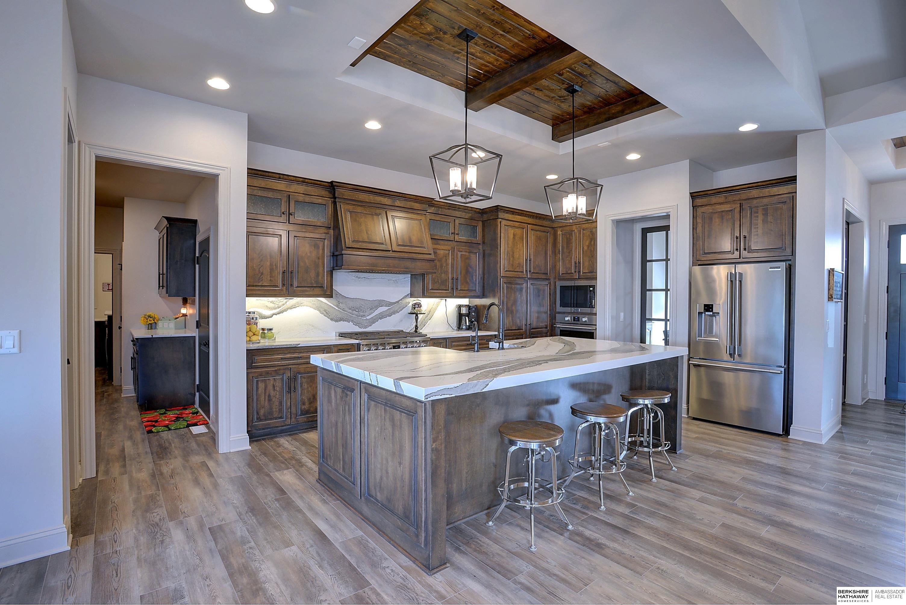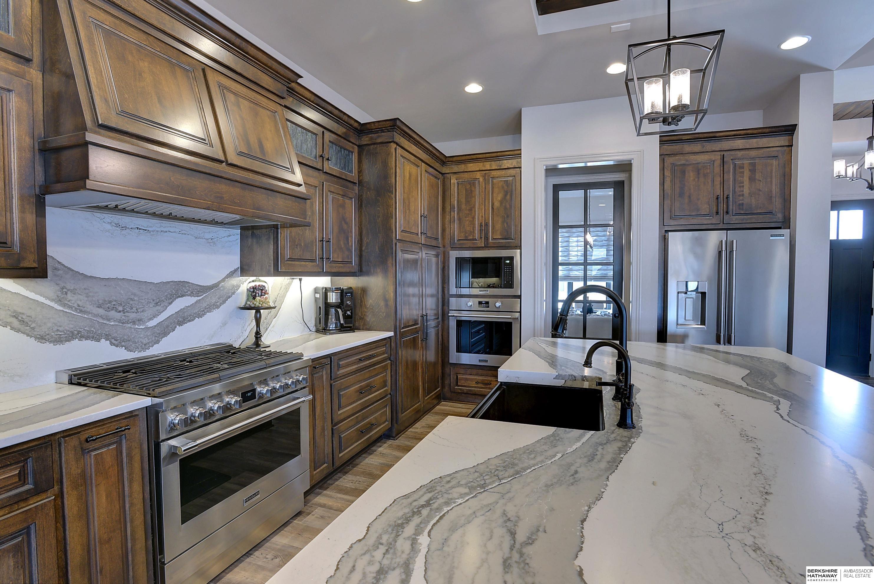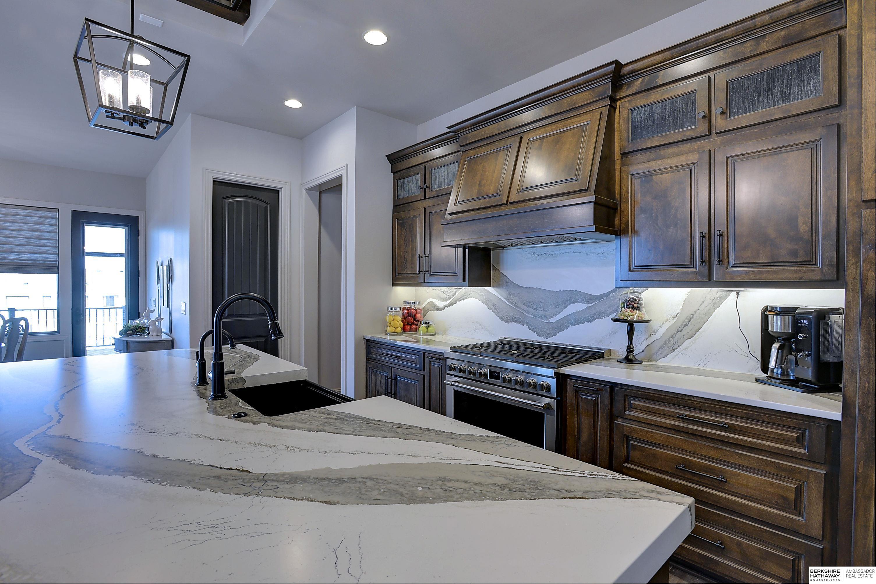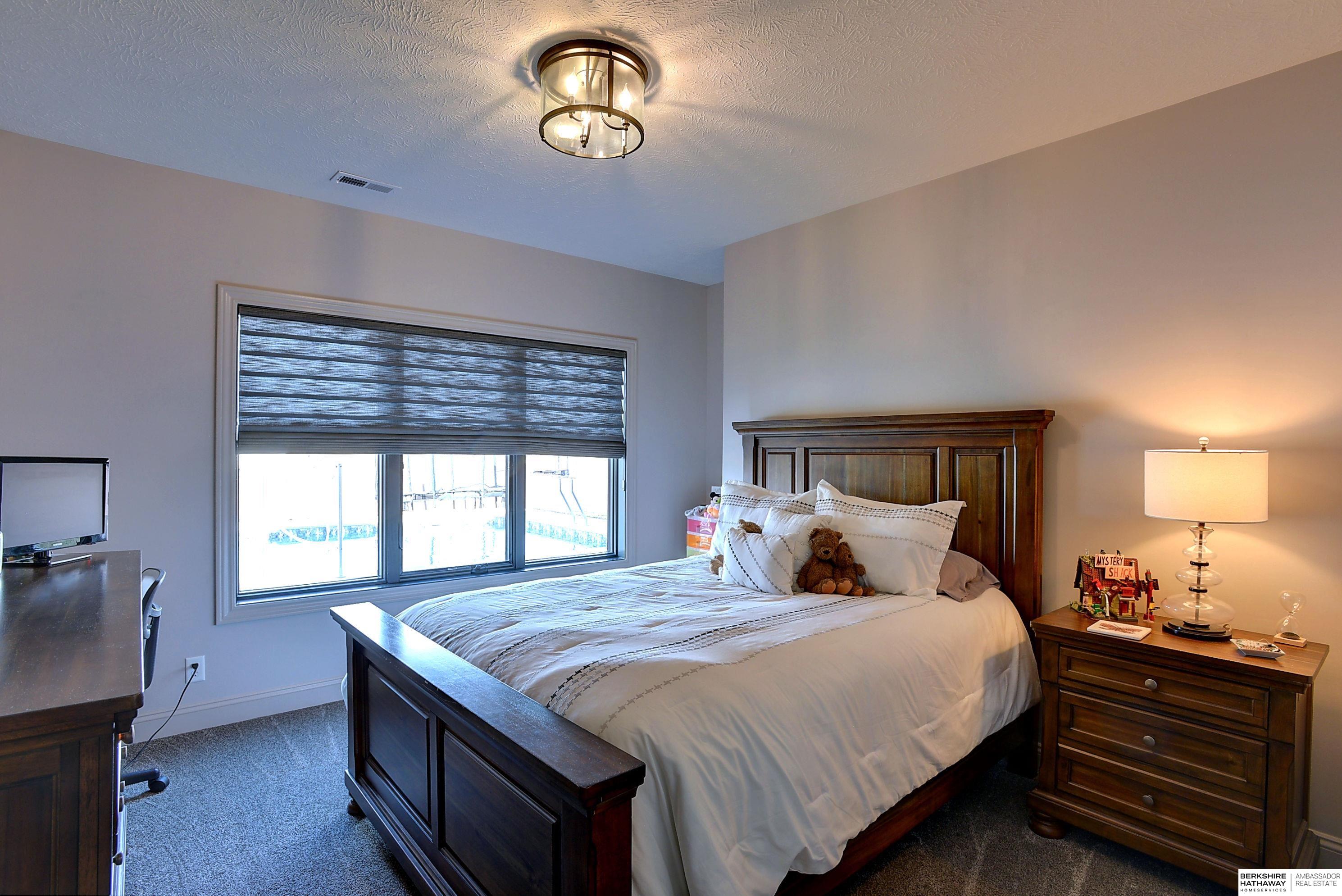 Exceptional Ranch home on corner lot! 4 Bed/3 Bath/3 Car. Upgrades throughout! Heated pool w/slide, lighting, bball+vball hoops, automated salt h2o & chlorine systems + upgraded liner + pre-wired for outdoor sound. Enjoy spectacular sunsets on your covered deck w/ automated screens + remotes. Privacy fence + oversized patio for grilling and pool storage. Open great rm vaulted ceiling, beams + stone fireplace. Incredible kitchen w/warm stained cabinetry, large island, walk-in pantry, upgraded appliances, so much storage! Primary suite w/heated floor in bathroom! WKO LL features stone FP, custom bar, built in appliances, brick wall detail, gym (or 4th bedrm) + LVP flooring. Reverse Osmosis, sprinkler, hi-eff hvac, all toilets have heated bidet seats, Brizo plumbing fixtures, tankless H2O heater. Easy access to Dodge, Blondo + Maple. Walking distance to elementary school and middle/high schools are less than a mile away. Well-kept, spotless home! AMA
