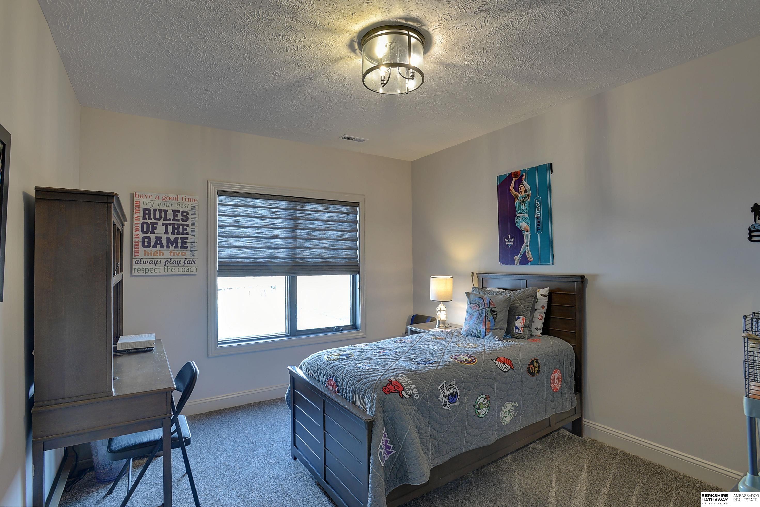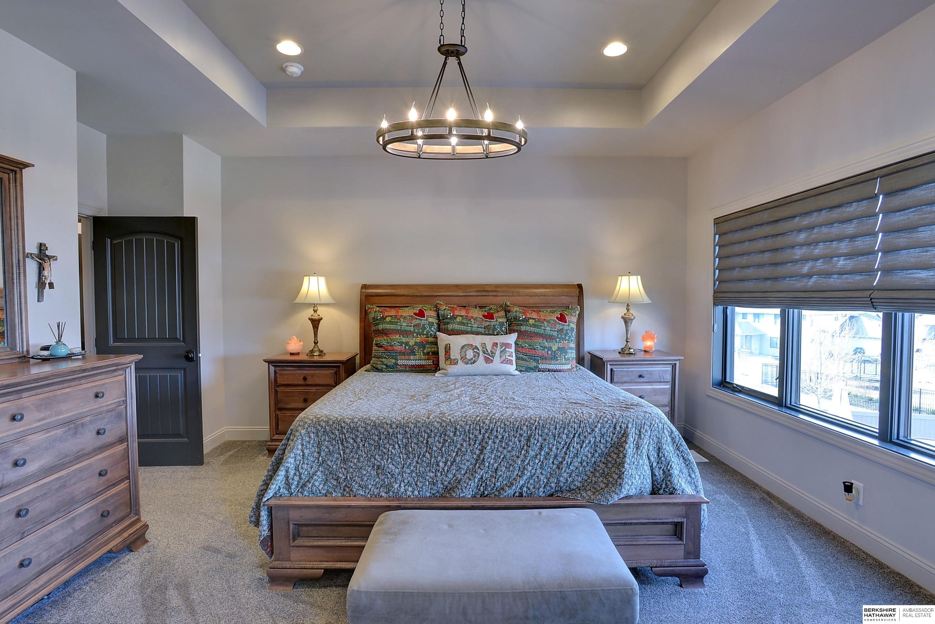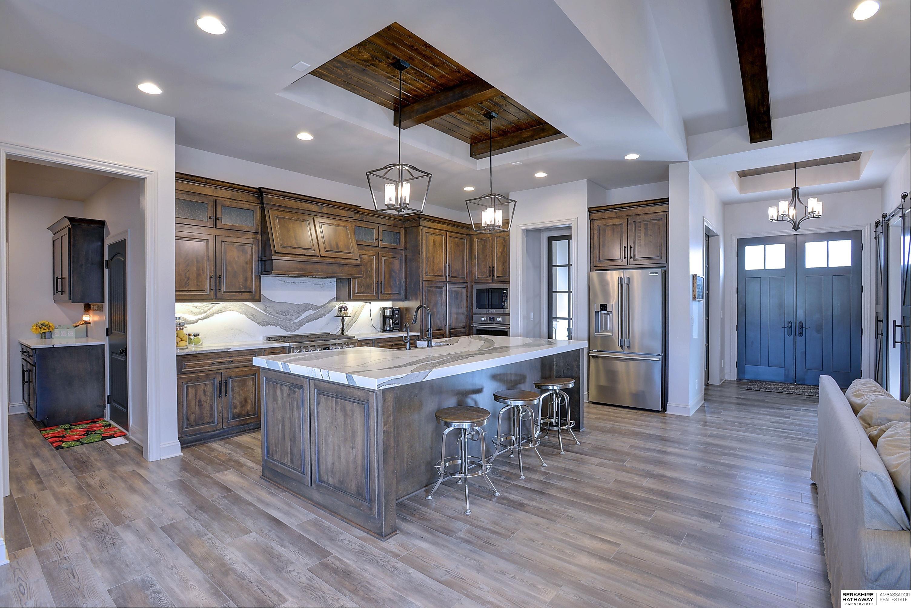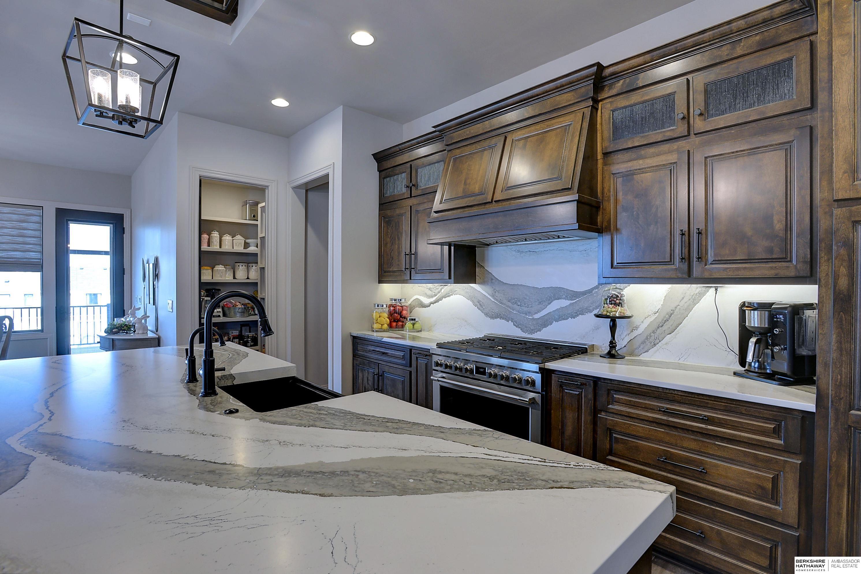 Exceptional Ranch home on corner lot! 4 Bed/3 Bath/3 Car. Upgrades throughout! Heated pool w/slide, lighting, bball+vball hoops, automated salt h2o & chlorine systems + upgraded liner + pre-wired for outdoor sound. Enjoy spectacular sunsets on your covered deck w/ automated screens + remotes. Privacy fence + oversized patio for grilling and pool storage. Open great rm vaulted ceiling, beams + stone fireplace. Incredible kitchen w/warm stained cabinetry, large island, walk-in pantry, upgraded appliances, so much storage! Primary suite w/heated floor in bathroom! WKO LL features stone FP, custom bar, built in appliances, brick wall detail, gym (or 4th bedrm) + LVP flooring. Reverse Osmosis, sprinkler, hi-eff hvac, all toilets have heated bidet seats, Brizo plumbing fixtures, tankless H2O heater. Easy access to Dodge, Blondo + Maple. Walking distance to elementary school and middle/high schools are less than a mile away. Well-kept, spotless home! AMA