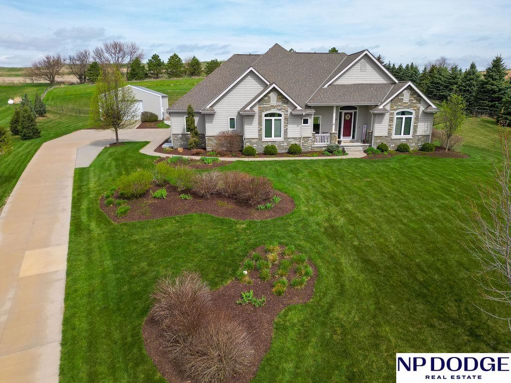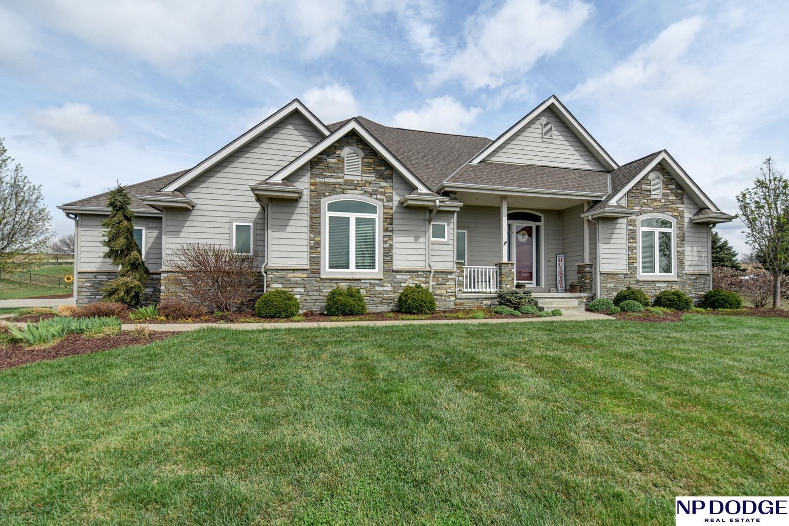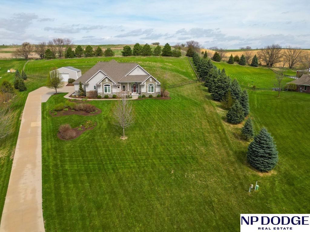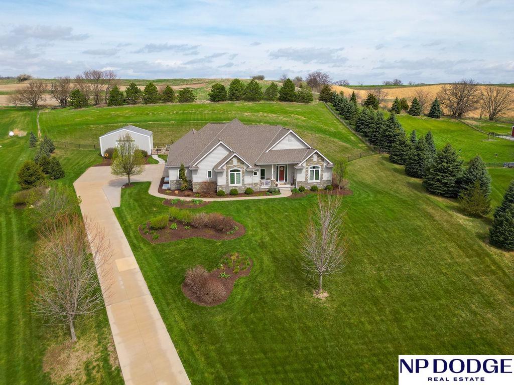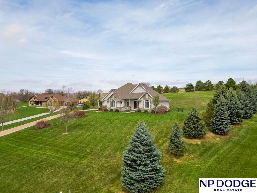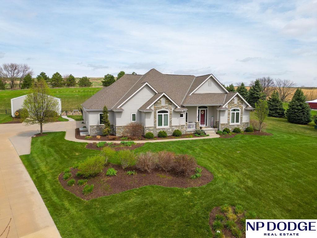 Tucked into a picturesque setting just 10 minutes from Omaha, this beautiful acreage property offers the perfect balance of space, and convenience. Situated on just over 2 acres, the 4500 sq ft home features 6 bedrooms and 5 bathrooms with an open-concept main level designed for both everyday living and entertaining. Beautiful kitchen with hidden walk-in pantry. Large Primary with his and hers closet, huge tiled shower. The finished basement is the perfect gathering space with a wet bar and plenty of room to spread out. Step outside to enjoy the covered patio, huge fenced yard, and peaceful surroundings. A 30x30 outbuilding provides endless possibilities for storage, hobbies, or a workshop. Need more convivence? Don’t miss the half bath in the heated attached garage. Residents also enjoy access to a private neighborhood pond adding more to this one-of-a-kind property. Efficient geothermal heating and cooling keeps the home comfortable year-round.