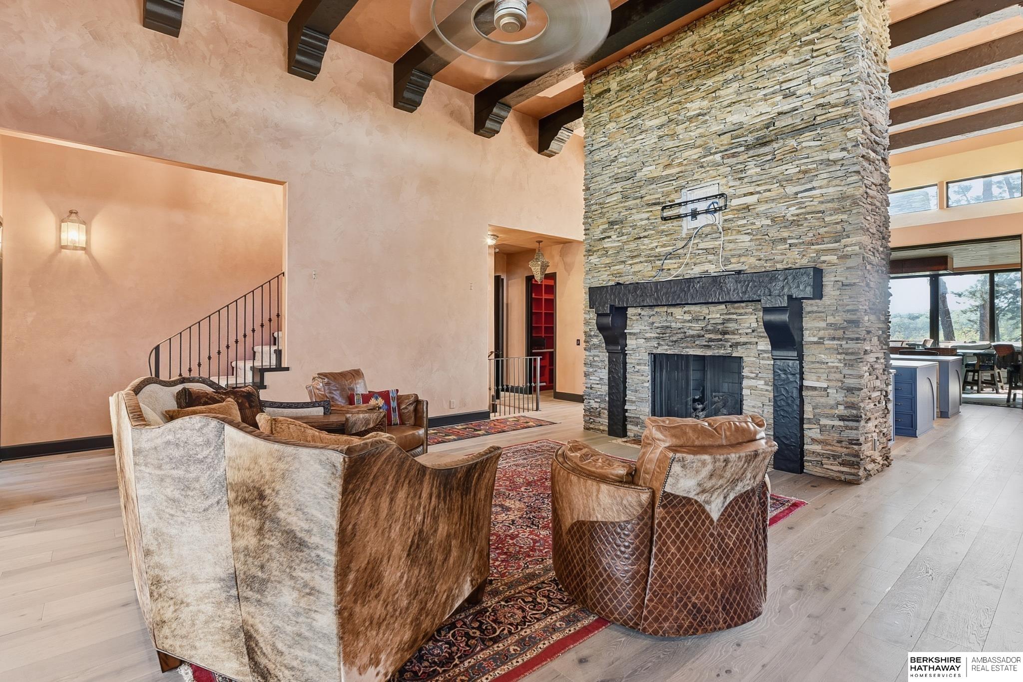 WOW! 5.35 acres, gated entrance with spectacular views, secluded, and private. Heated driveway with 3 electric charging stations for cars. In-ground pool. 10' to 16' ceilings, wood floors on main, step down to Den/Library with parquet floors and built-ins. Living room has beamed ceiling, full wall stone fireplace. Kitchen has beamed ceiling, Wolf appliances, custom vent hood and cabinetry, two islands, two sinks, beautiful large windows, dinette with built-in banquette, retractable glass wall to three-season room with built-in Hibachi grill, ice maker, beverage cooler, and sink. Two sets of sliding doors to beautiful backyard with beautiful pool and views in every direction. Primary suite has two baths - one has walk-in shower, quartz vanity, and closet, and second bath has a wet room with a free standing tub, quartz vanity, and walk-in closet with laundry room between the baths. Loft has built-in desk and half bath with custom sink. Two rooftop decks - one with hot tub.