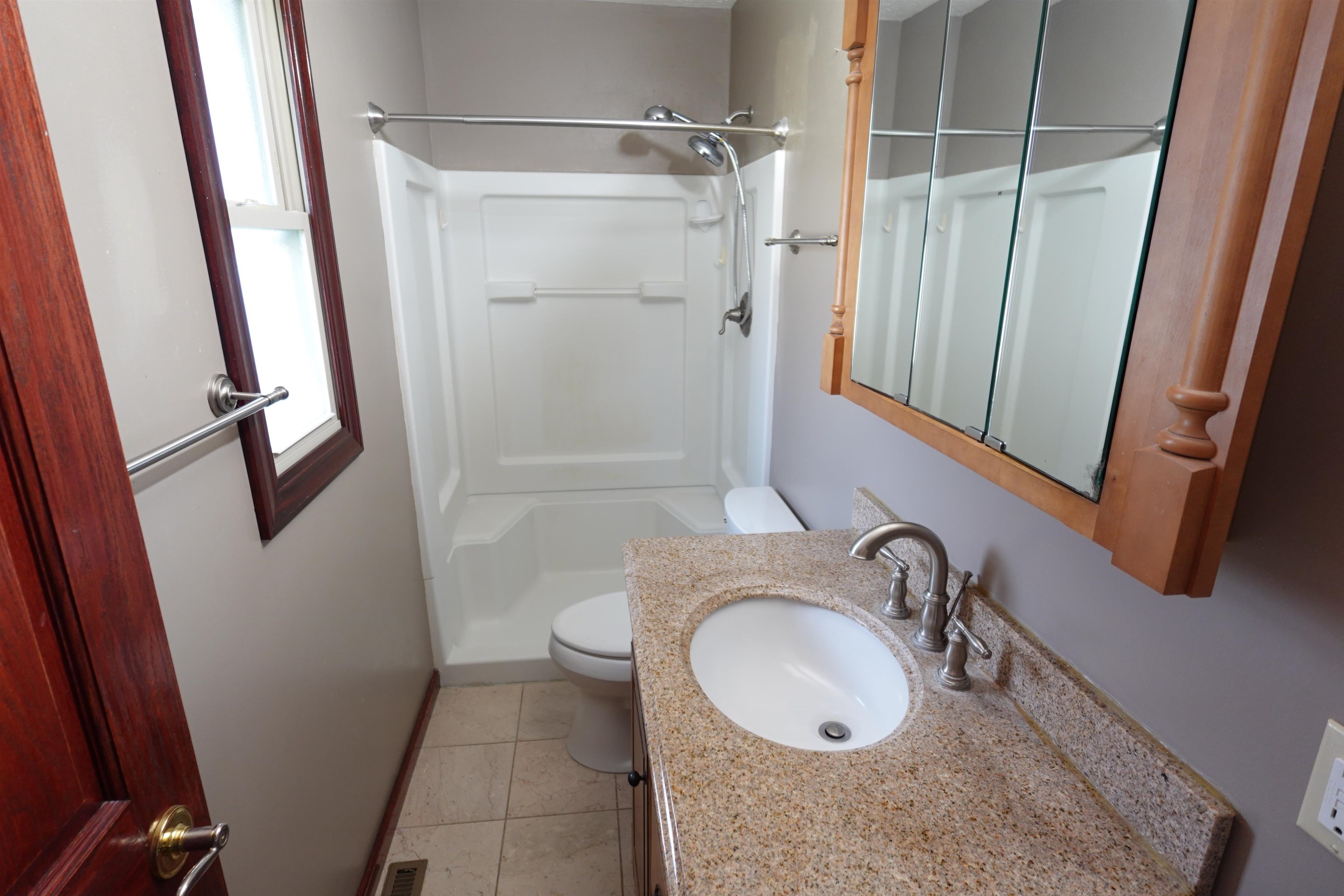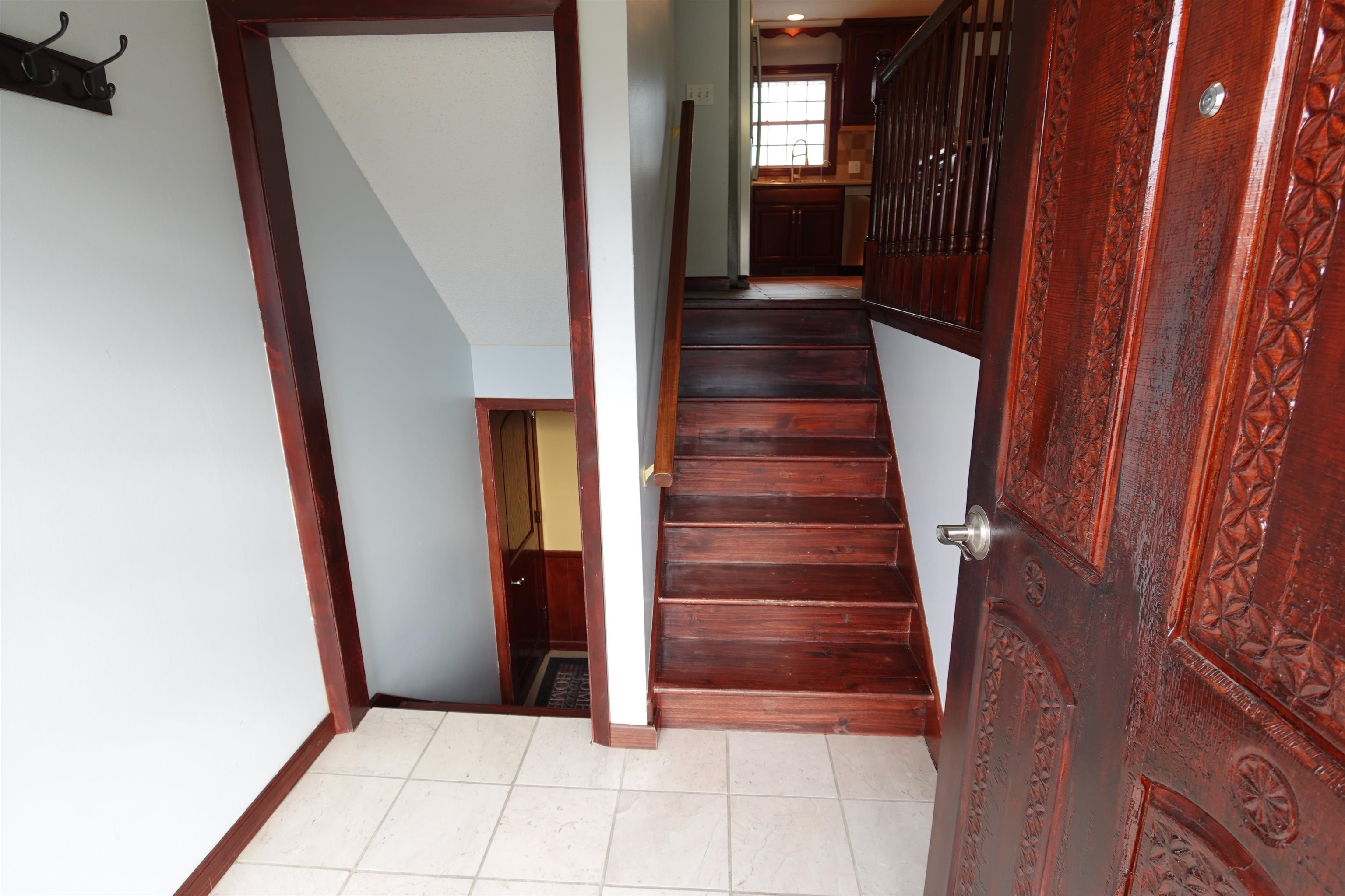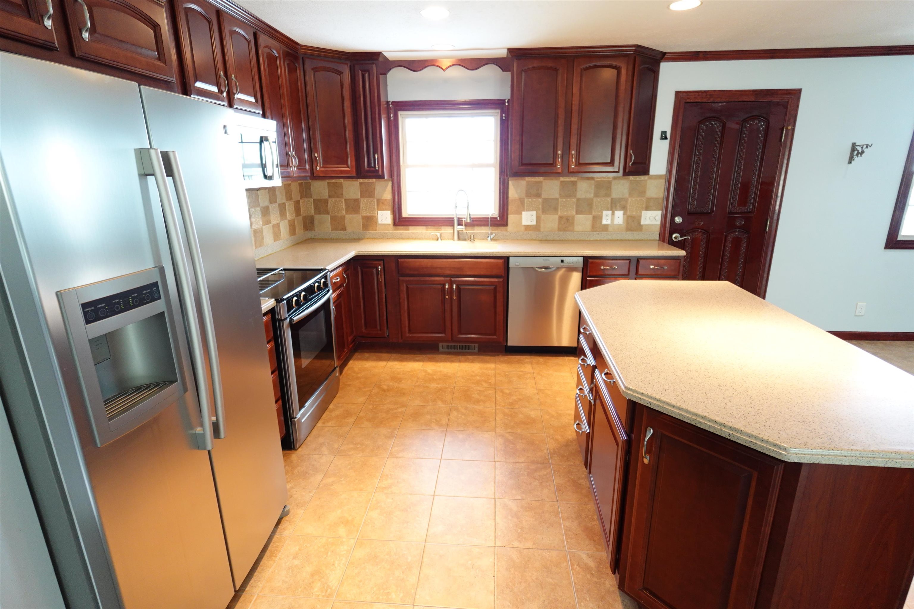 Level up to this 3 bedroom, 2 bath split foyer home featuring: newer cherry wood kitchen cabinets with solid surface countertops, stainless steel appliances & center island with bar top; impact resistance shingles installed in May 2025; brand new water softener; freshly painted deck; newer vinyl replacement windows; many solid wood doors throughout; granite vanity tops in main & primary baths; large L-shaped family room in the lower level with wood burning stove and access to the large stamped concrete patio and fully fenced backyard. China hutch in dining room and refrigerator in garage stay. Current taxes are based on a homestead exemption. **The Seller has not used the fireplace or woodstove and is unaware of their condition**