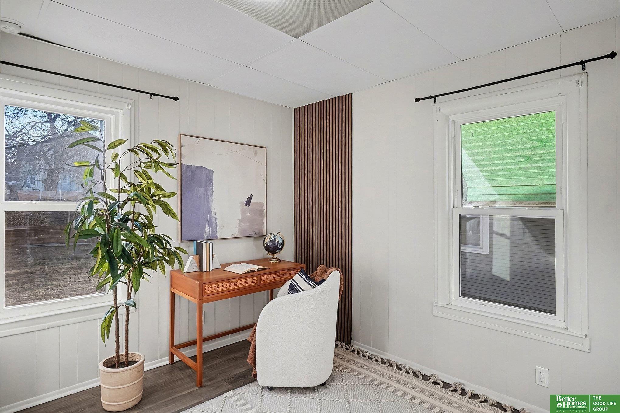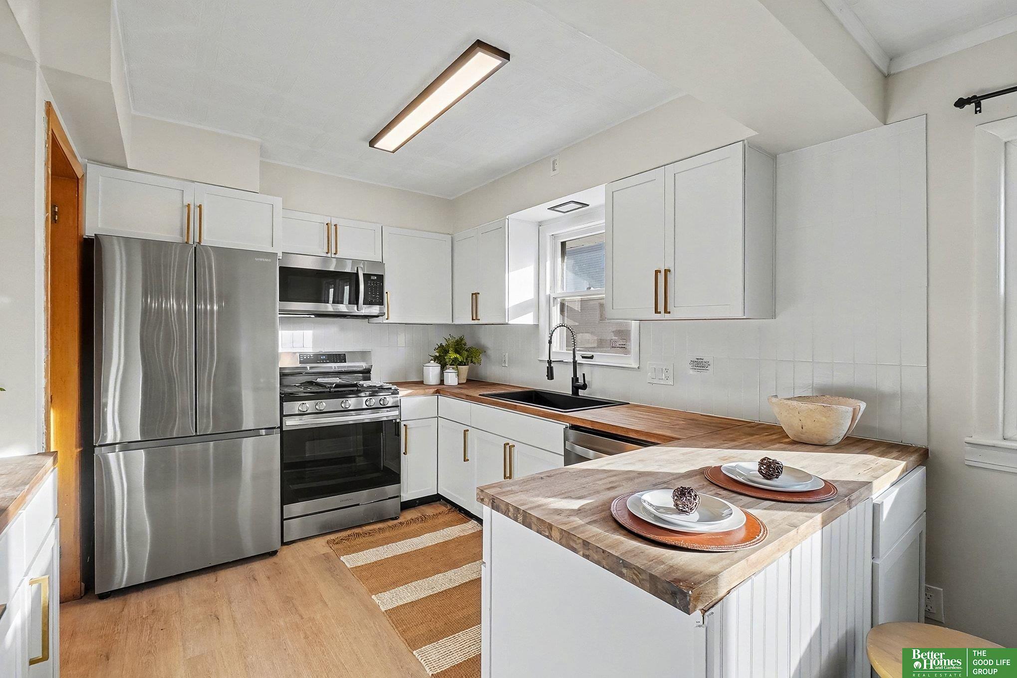 Welcome to this refreshed Midtown gem, just moments from local coffee shops and dining. This home blends character with modern living, greeting you with a charming covered front porch before revealing an interior with low-maintenance vinyl floors, decorative ceilings, and a sleek fireplace. The updated kitchen is a standout, featuring classic white cabinets, butcher-block countertops, stainless steel appliances, and a dedicated coffee bar. Downstairs, the finished lower level offers versatility, with a rec room, laundry area, 3/4 bath, and a 5th bedroom with brand-new carpet. Outside, the fenced yard and covered patio offer private relaxation, with a spacious garage and extra off-street parking. With new interior paint and low-maintenance vinyl windows throughout, this move-in-ready home delivers style and convenience right to your doorstep.