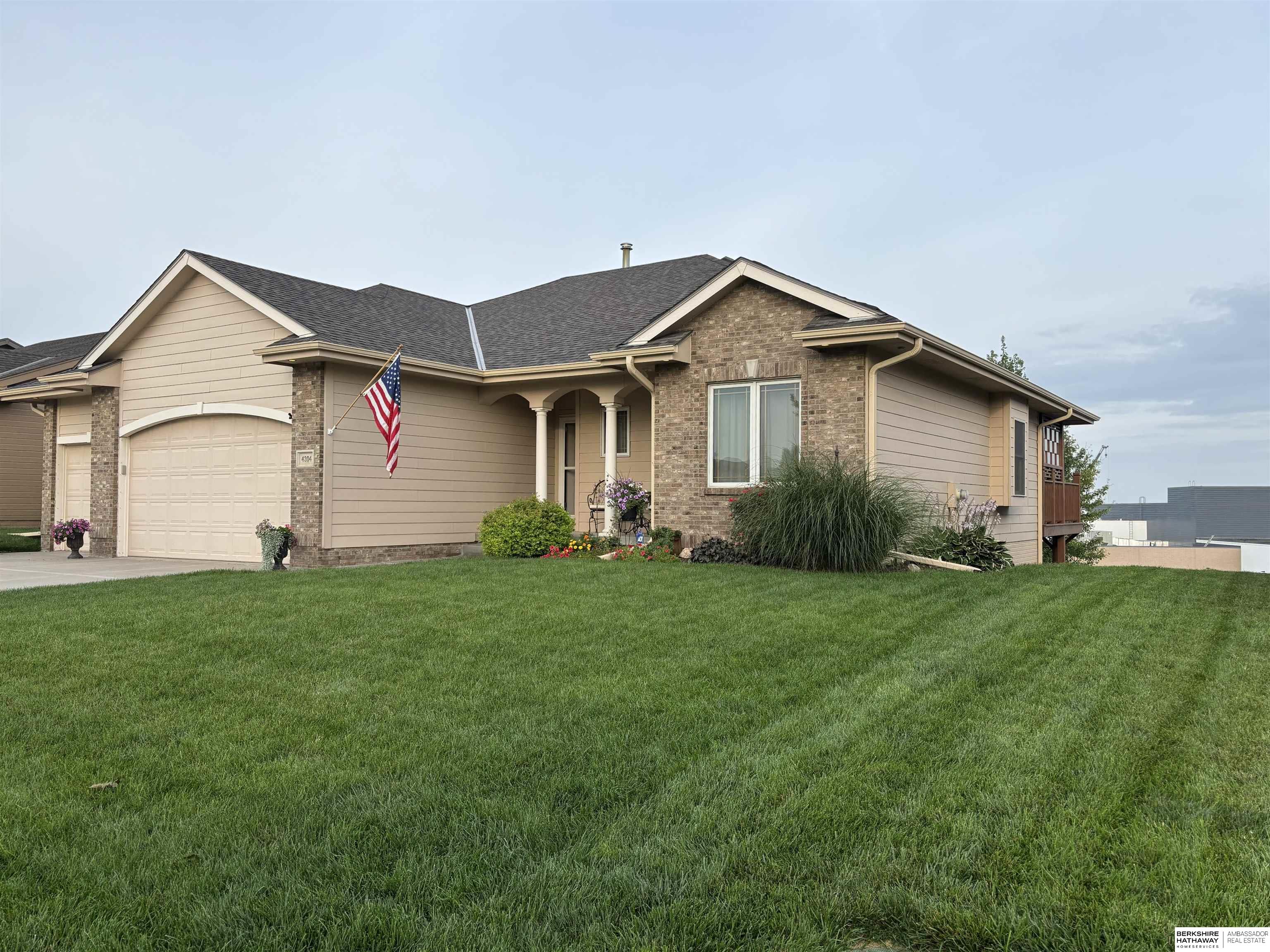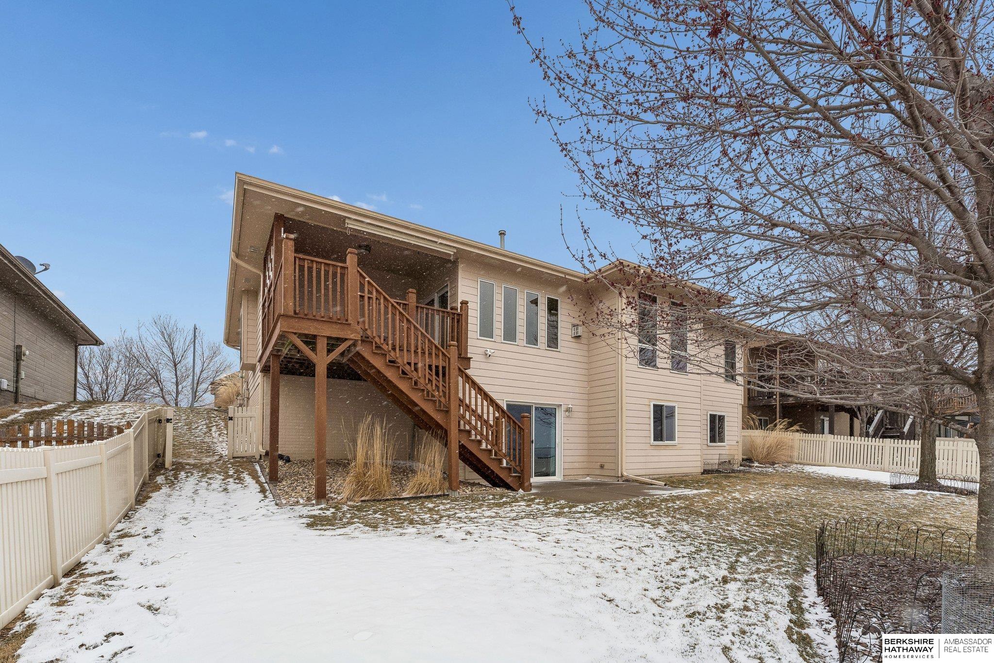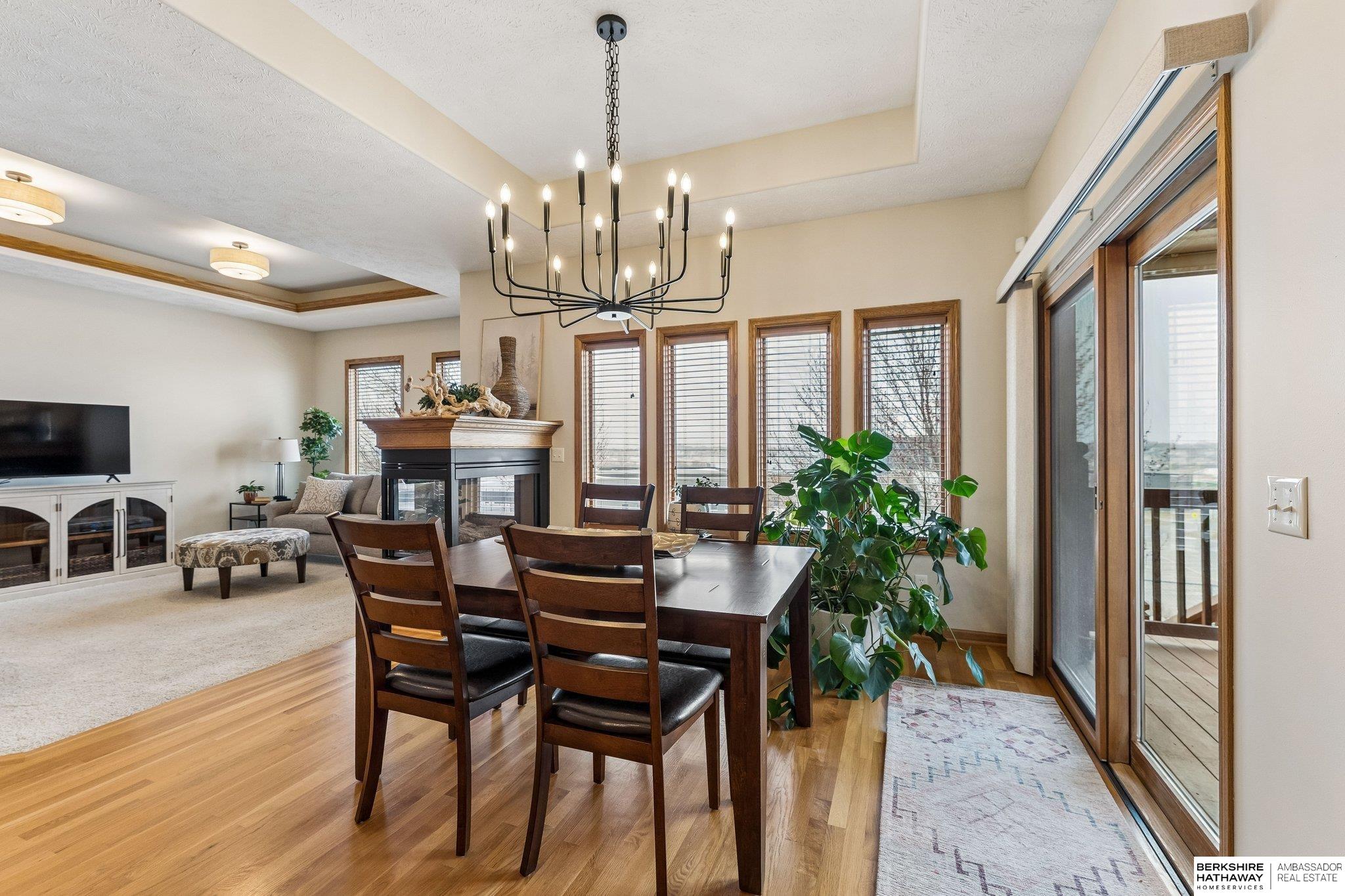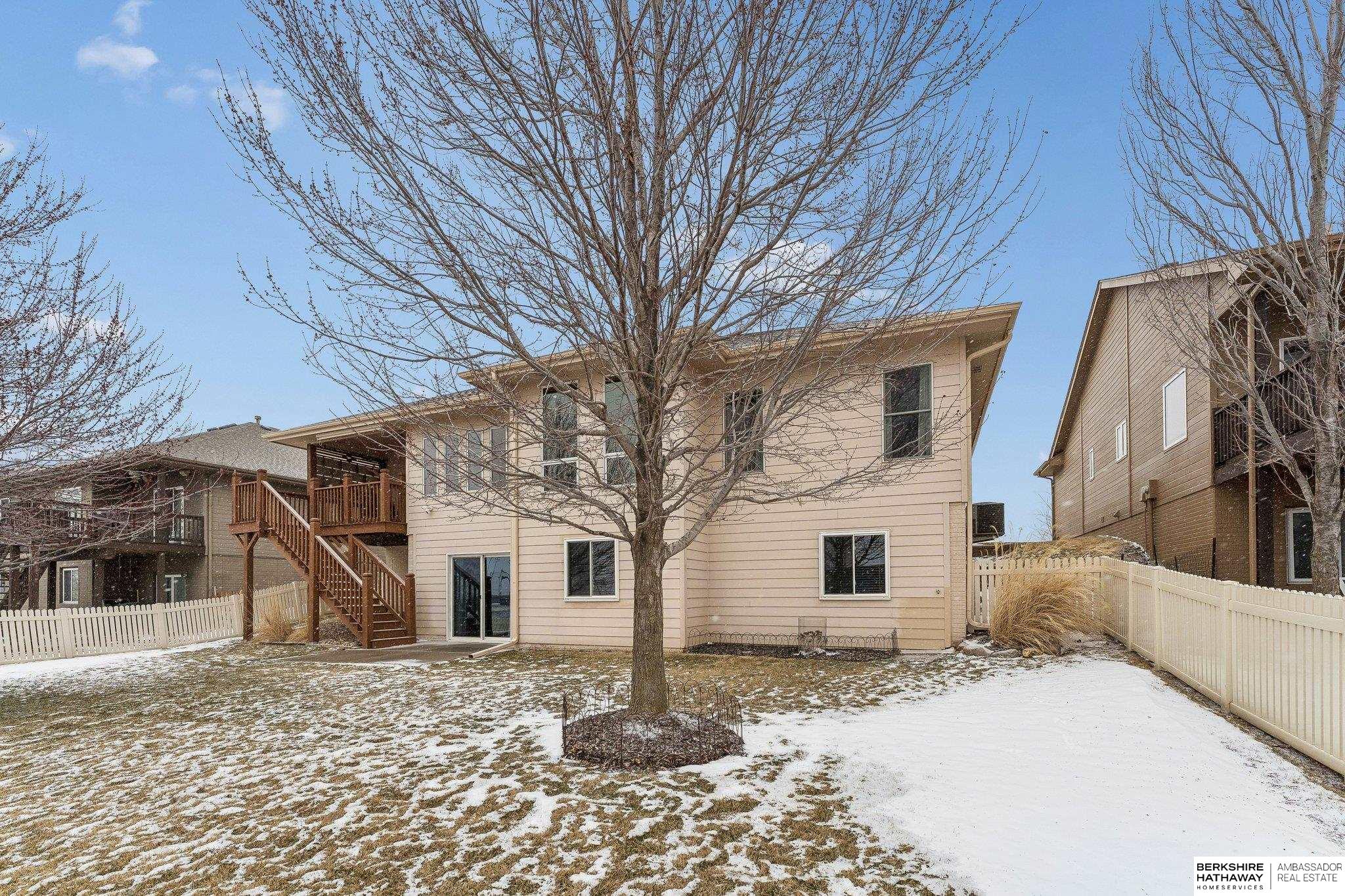 Beautiful walkout ranch with spectacular views!! In pristine condition, this home has an open floor plan with great natural light! Features include a 3-sided gas fireplace, tray ceilings, and a spacious kitchen with stainless steel appliances, abundant cabinetry, and a large walk-in pantry. Main-floor laundry with built-ins, sink, and pass-through to the primary bath. The primary suite offers two walk-in closets, double sinks, walk-in shower, and Jacuzzi tub. Two additional main-floor bedrooms each include walk-in closets. The walkout lower level includes a bedroom, ¾ bath, versatile flex room with closet, & a large storage room, plus a reinforced storm shelter. Enjoy a fenced yard with mature trees, a covered deck with a privacy panel, decorative lights, patio, & beautiful sunset views. New Class 4 roof (2024), water heater (2024), water softener (2025), and furnace updates (2025). Located across from neighborhood park & within walking distance to Elkhorn schools.
