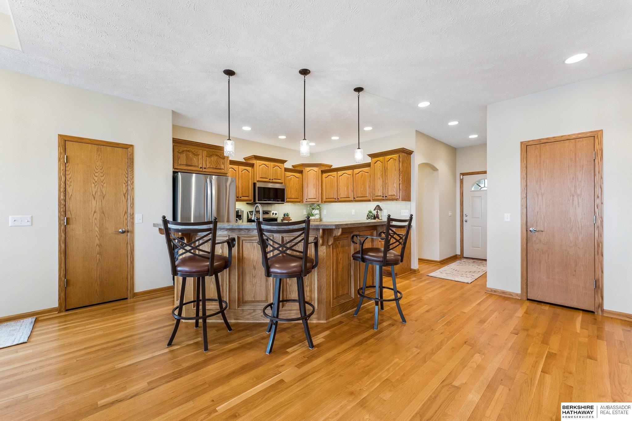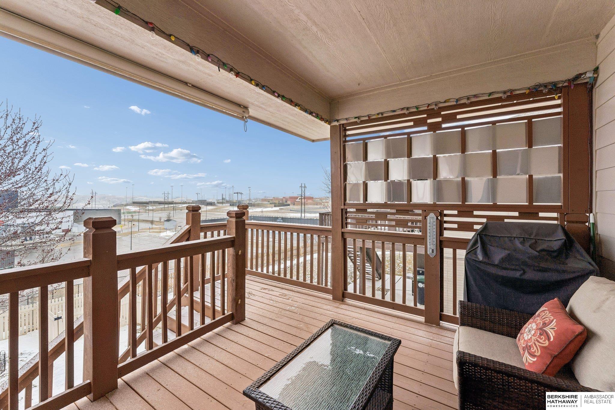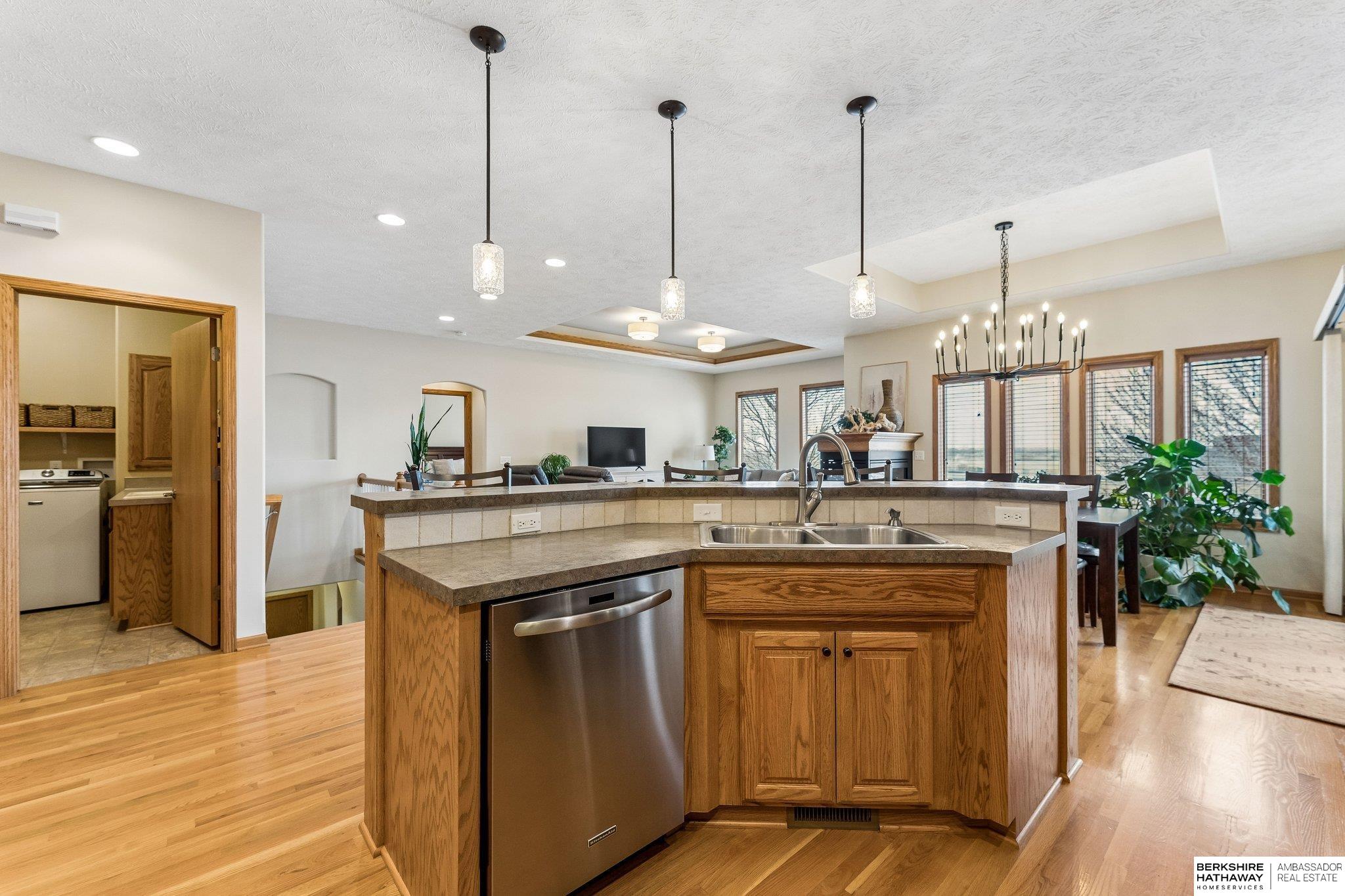 Beautiful walkout ranch with spectacular views!! In pristine condition, this home has an open floor plan with great natural light! Features include a 3-sided gas fireplace, tray ceilings, and a spacious kitchen with stainless steel appliances, abundant cabinetry, and a large walk-in pantry. Main-floor laundry with built-ins, sink, and pass-through to the primary bath. The primary suite offers two walk-in closets, double sinks, walk-in shower, and Jacuzzi tub. Two additional main-floor bedrooms each include walk-in closets. The walkout lower level includes a bedroom, ¾ bath, versatile flex room with closet, & a large storage room, plus a reinforced storm shelter. Enjoy a fenced yard with mature trees, a covered deck with a privacy panel, decorative lights, patio, & beautiful sunset views. New Class 4 roof (2024), water heater (2024), water softener (2025), and furnace updates (2025). Located across from neighborhood park & within walking distance to Elkhorn schools.