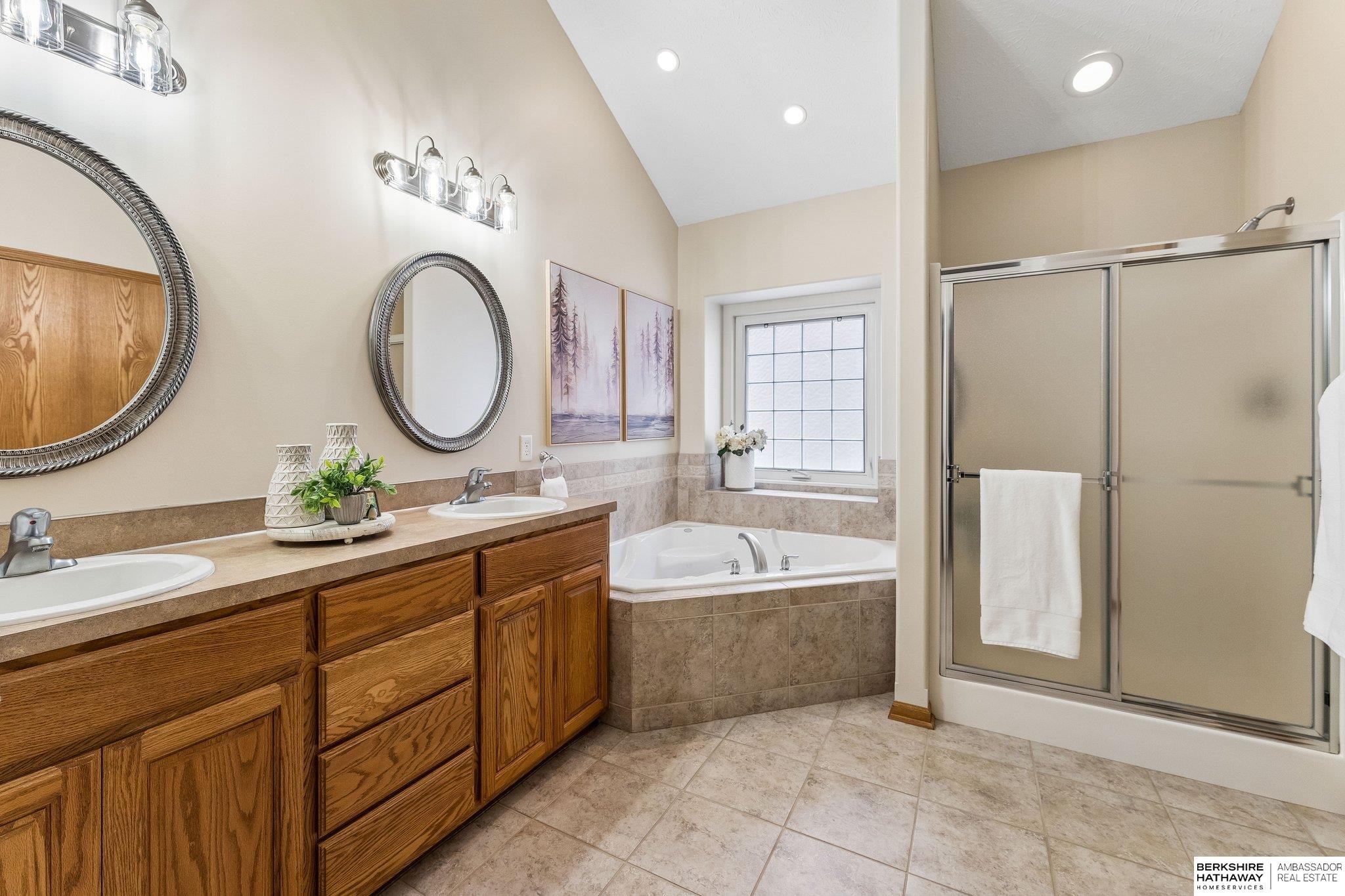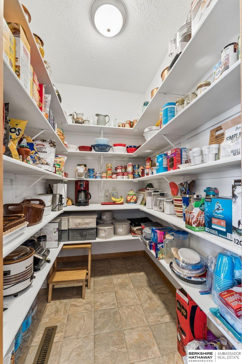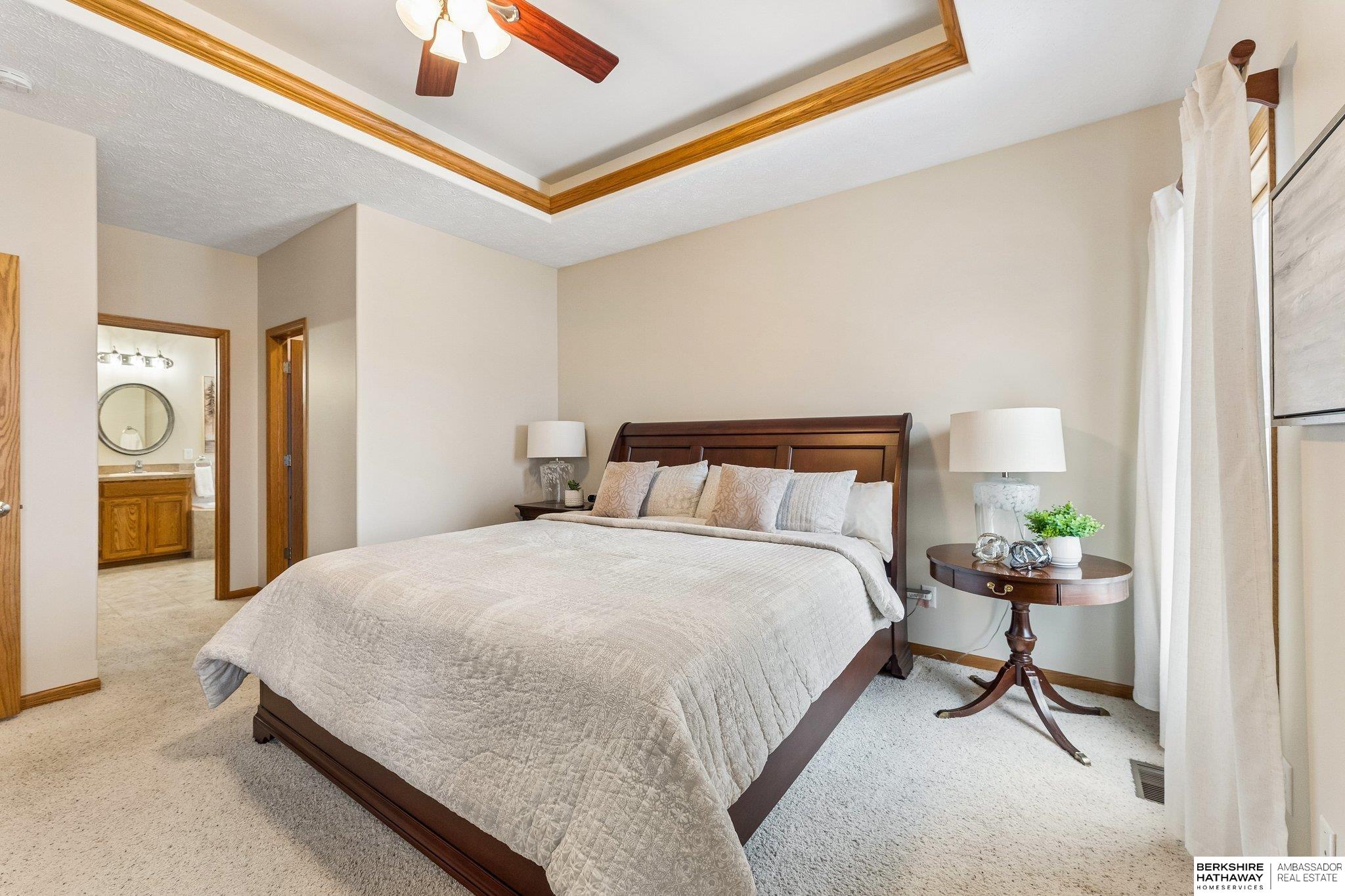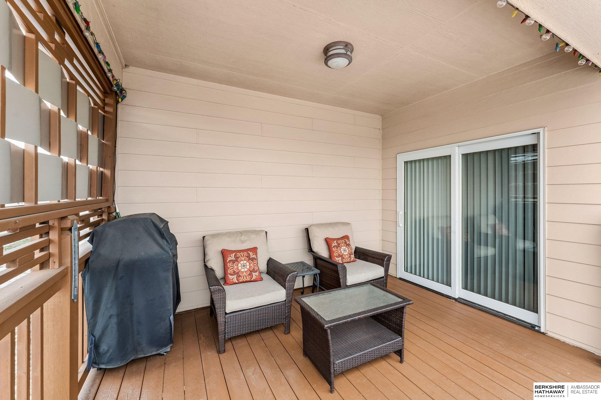 Beautiful walkout ranch with spectacular views!! In pristine condition, this home has an open floor plan with great natural light! Features include a 3-sided gas fireplace, tray ceilings, and a spacious kitchen with stainless steel appliances, abundant cabinetry, and a large walk-in pantry. Main-floor laundry with built-ins, sink, and pass-through to the primary bath. The primary suite offers two walk-in closets, double sinks, walk-in shower, and Jacuzzi tub. Two additional main-floor bedrooms each include walk-in closets. The walkout lower level includes a bedroom, ¾ bath, versatile flex room with closet, & a large storage room, plus a reinforced storm shelter. Enjoy a fenced yard with mature trees, a covered deck with a privacy panel, decorative lights, patio, & beautiful sunset views. New Class 4 roof (2024), water heater (2024), water softener (2025), and furnace updates (2025). Located across from neighborhood park & within walking distance to Elkhorn schools.