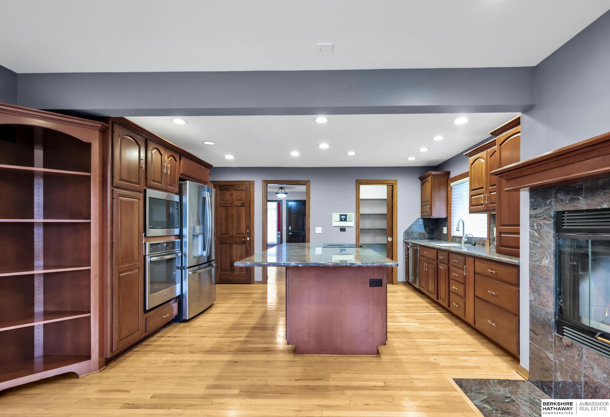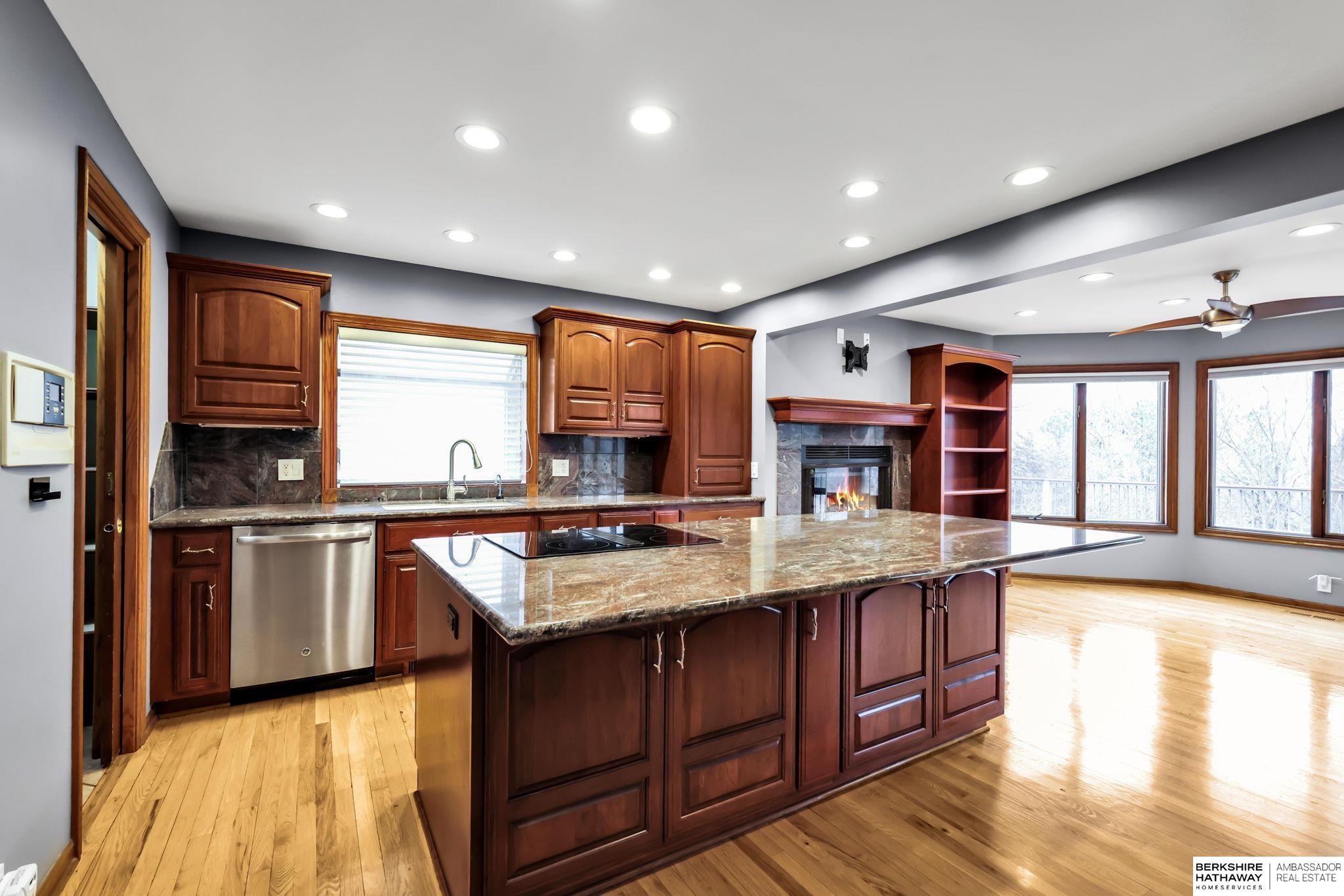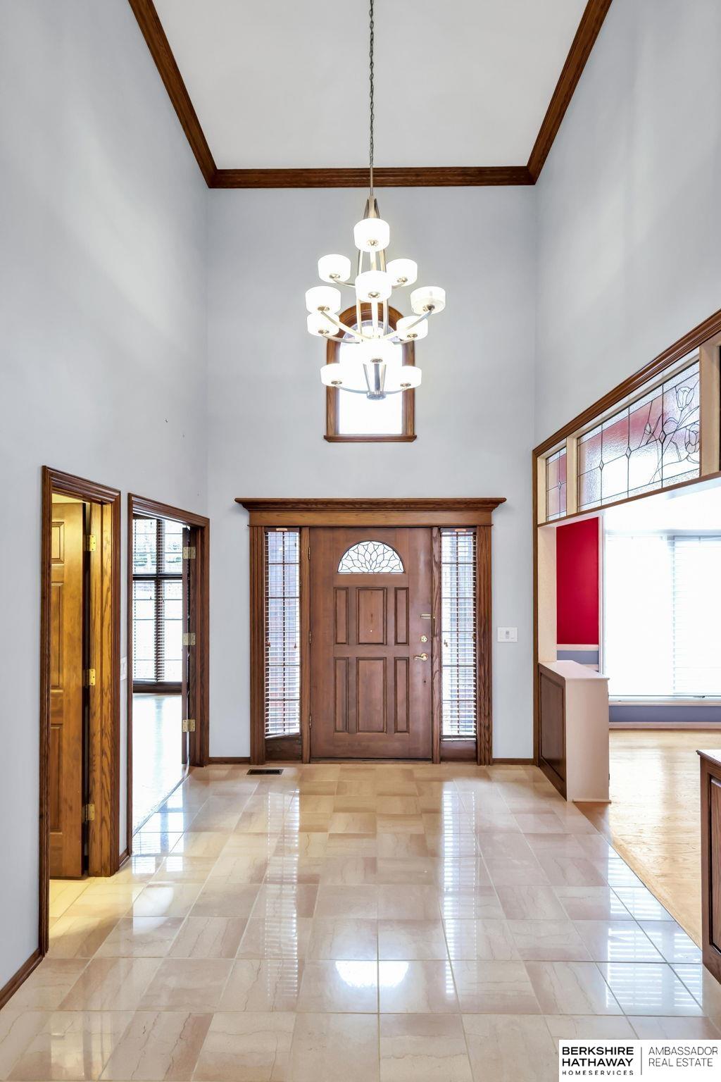 Million-dollar views of Zorinsky set the stage for this exceptional, quality-built home that backs directly to Zorinsky Lake and the park. An all-brick front enhances the exterior, offering timeless character and outstanding curb appeal, complemented by a circular drive for added convenience and a grand first impression. This spacious one-and-a-half-story design features a dramatic two-story family room filled with natural light, creating an open and inviting atmosphere. With three fireplaces throughout, the home offers warmth, character, and multiple cozy gathering spaces. The walkout lower level provides additional living and entertaining space, seamlessly connecting to the outdoors - perfect for enjoying the peaceful setting.
