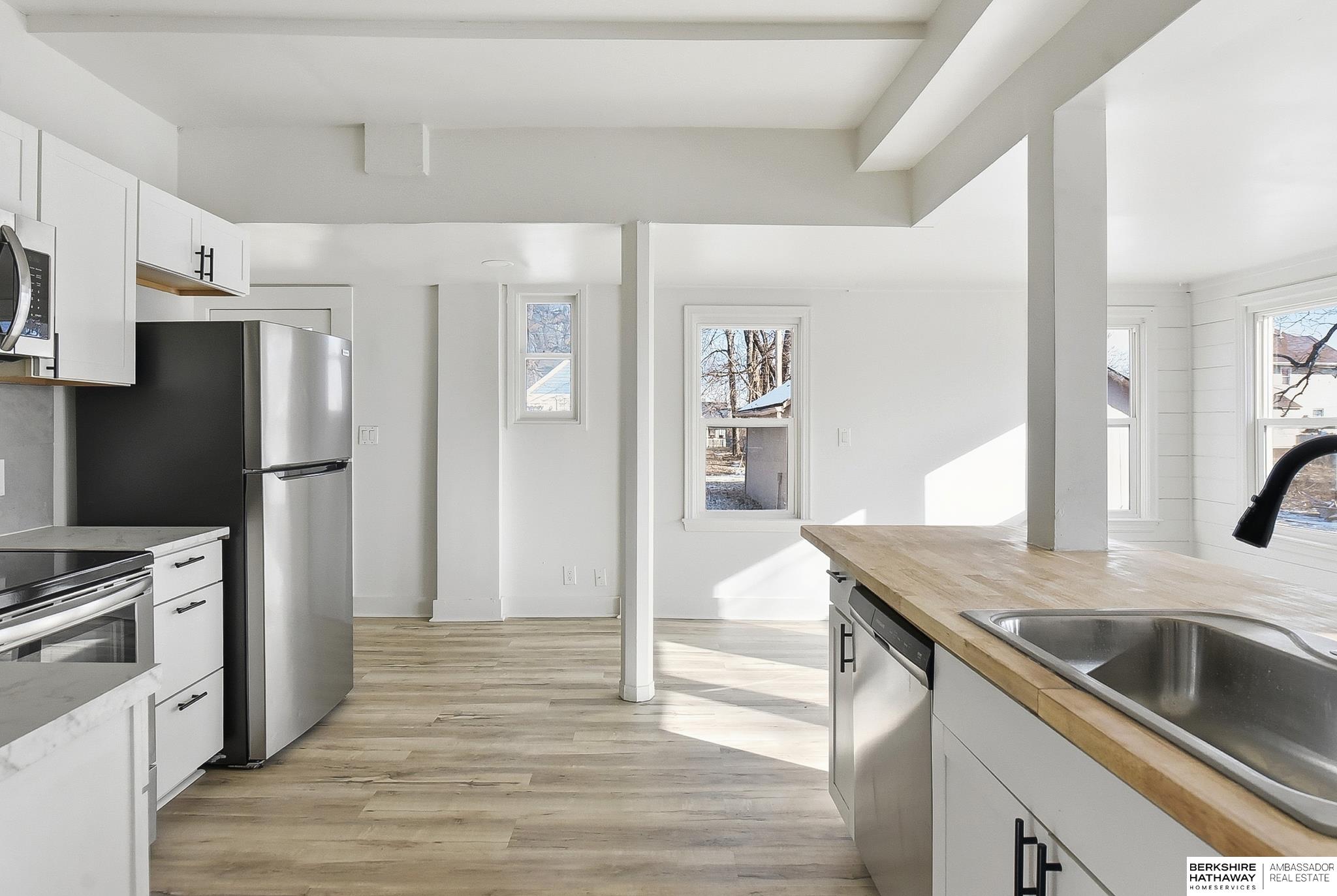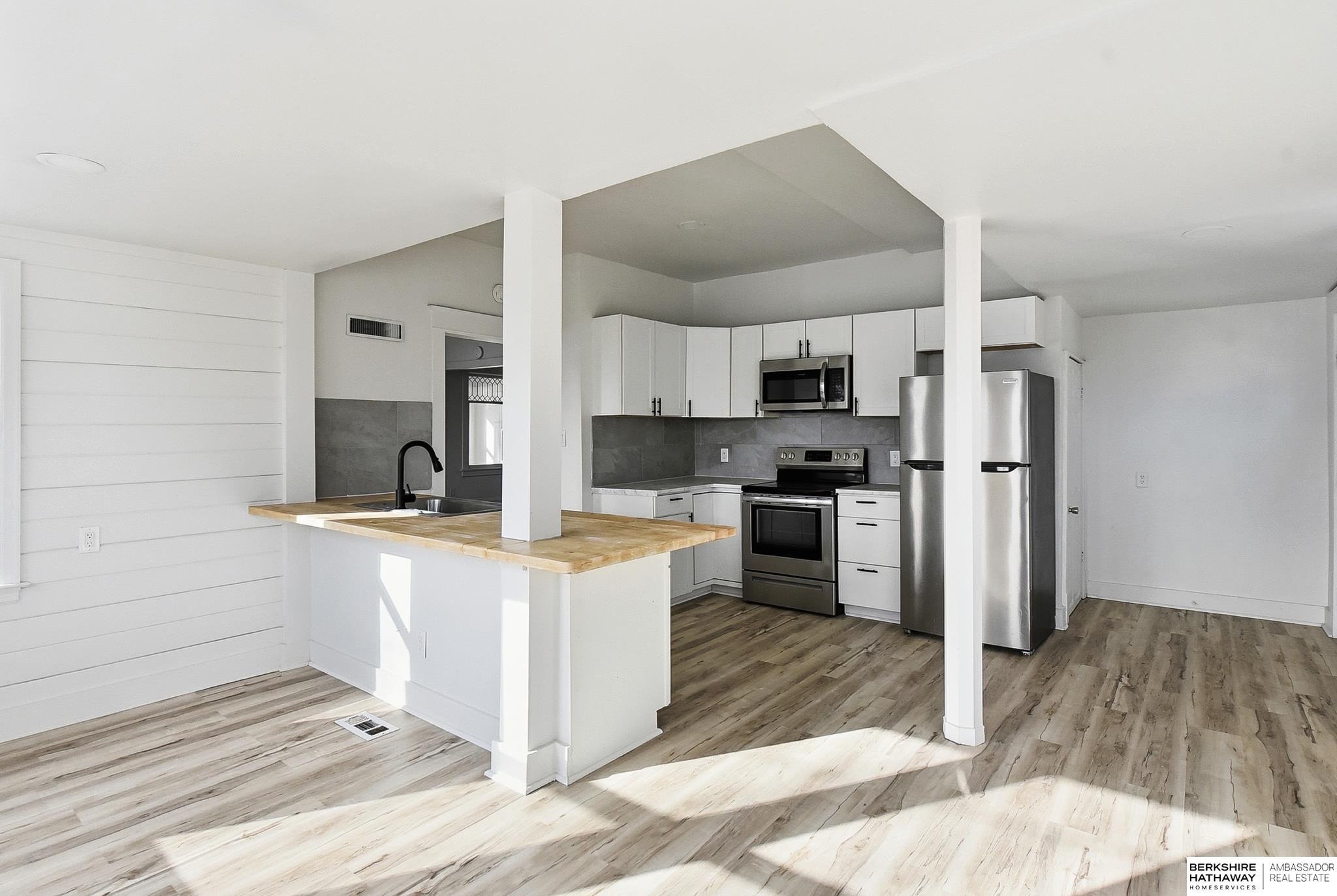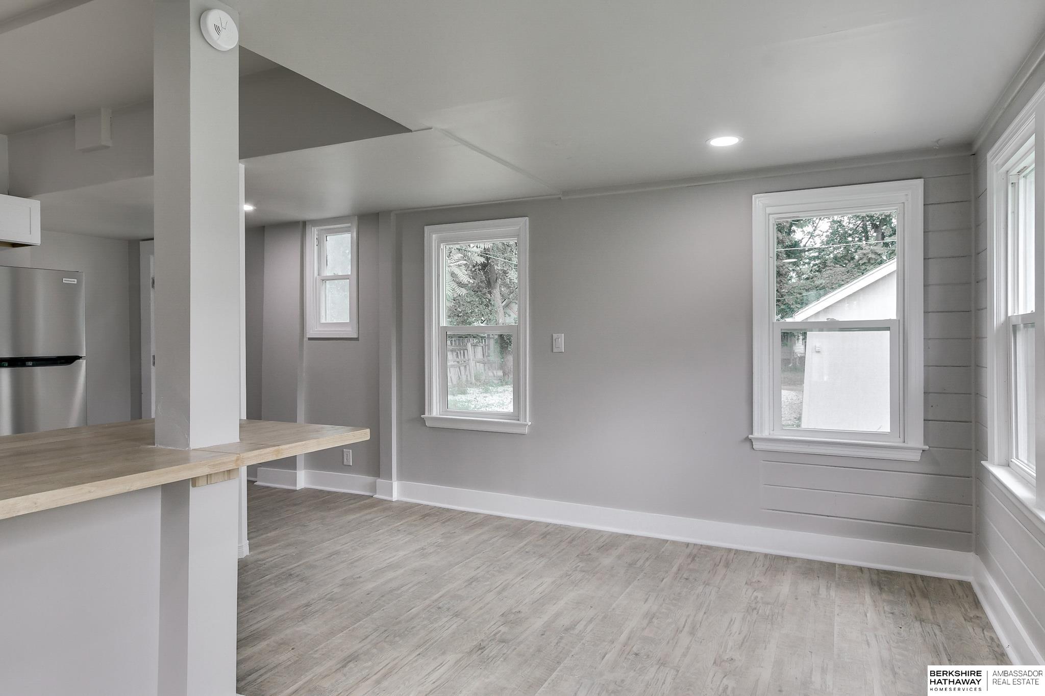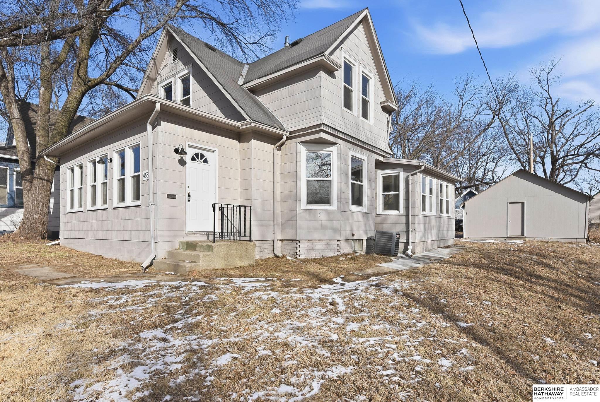Welcome to this beautifully updated 3-bed, 1-bath home in North Omaha! Step inside to find fresh paint, refinished hardwood floors, and a bright, open floor plan. The living room flows seamlessly into a fully remodeled kitchen featuring new cabinetry, butcher block countertops, stainless steel appliances, and a breakfast bar perfect for entertaining. The spacious bathroom has been completely modernized with tiled shower walls, new vanity, and stylish fixtures. Large windows fill the home with natural light, creating a warm and inviting atmosphere. Outside, enjoy a private backyard with a rare oversized 2-car detached garage, offering plenty of storage or workspace. Conveniently located near parks, schools, shopping, and just minutes to downtown. This move-in ready home combines charm with modern upgrades. Perfect for homeowners or investors alike!