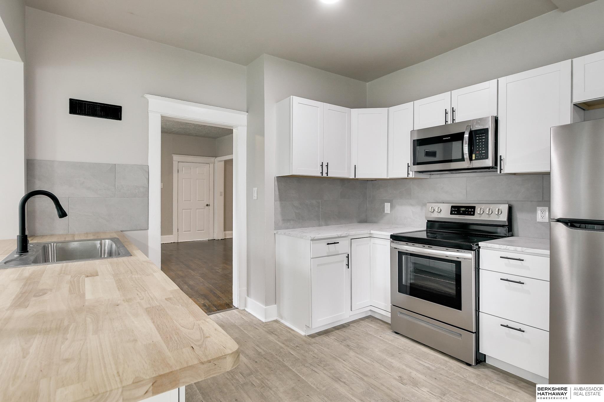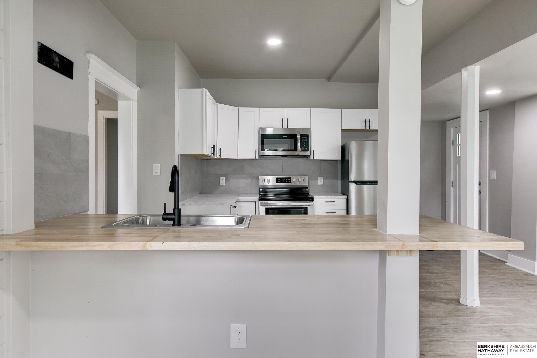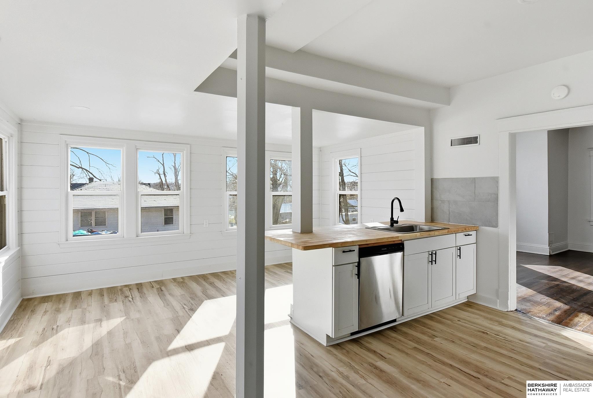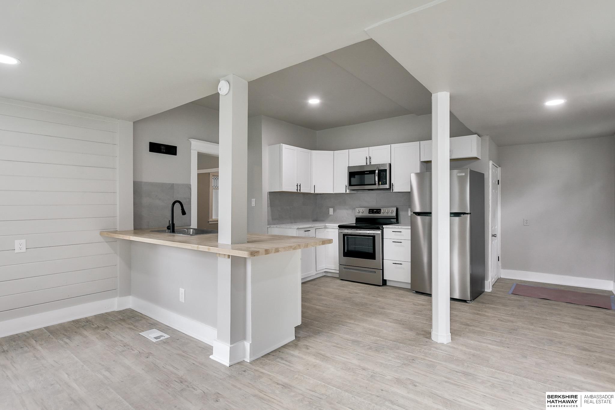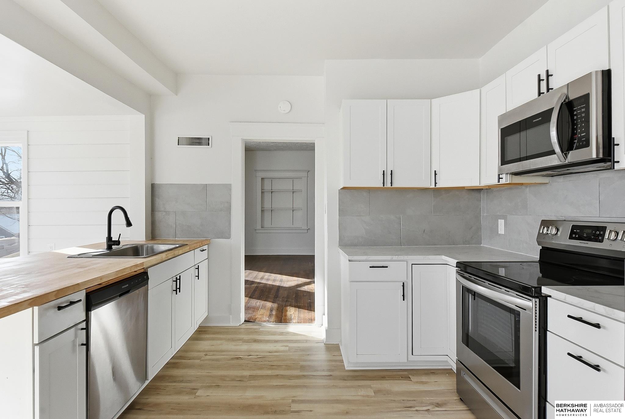 Welcome to this beautifully updated 3-bed, 1-bath home in North Omaha! Step inside to find fresh paint, refinished hardwood floors, and a bright, open floor plan. The living room flows seamlessly into a fully remodeled kitchen featuring new cabinetry, butcher block countertops, stainless steel appliances, and a breakfast bar perfect for entertaining. The spacious bathroom has been completely modernized with tiled shower walls, new vanity, and stylish fixtures. Large windows fill the home with natural light, creating a warm and inviting atmosphere. Outside, enjoy a private backyard with a rare oversized 2-car detached garage, offering plenty of storage or workspace. Conveniently located near parks, schools, shopping, and just minutes to downtown. This move-in ready home combines charm with modern upgrades. Perfect for homeowners or investors alike!