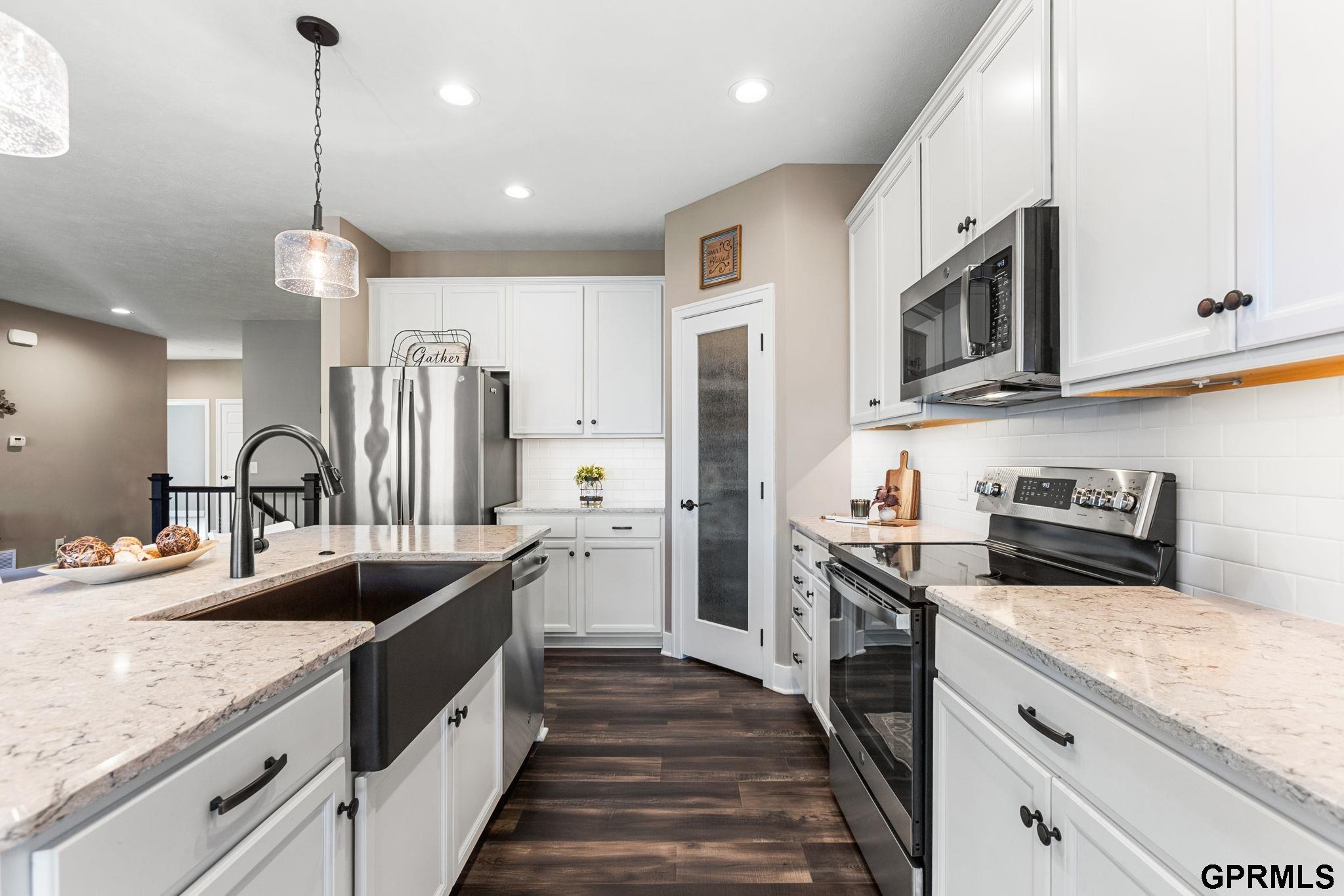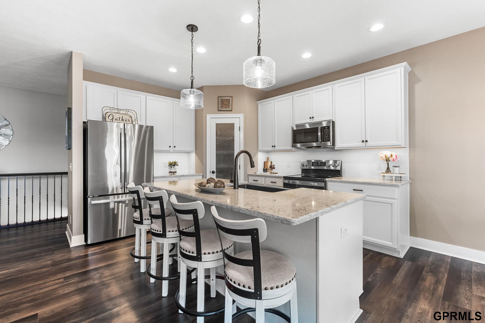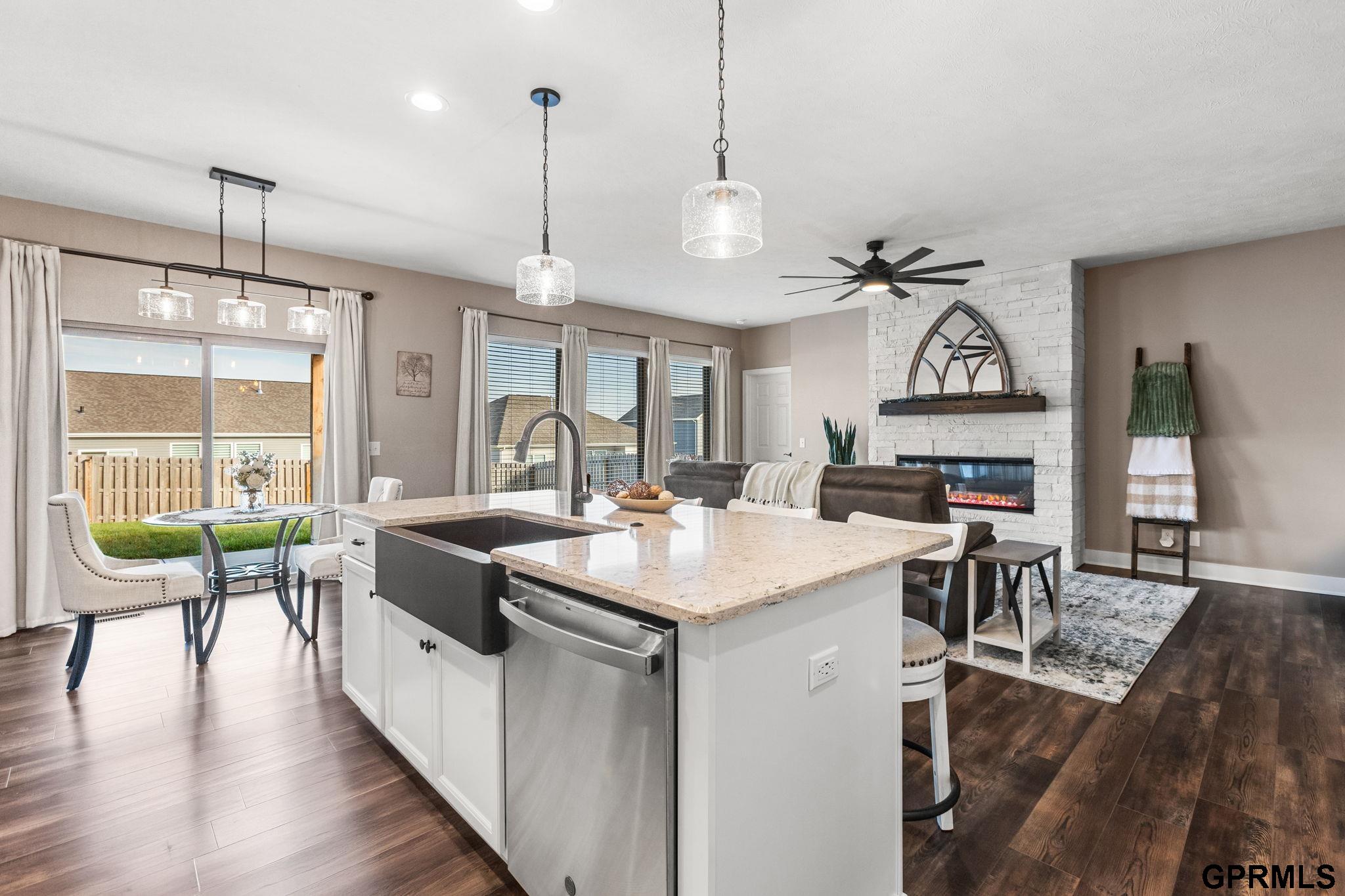 OPEN HOUSE SUN 11/2 2-4pm! Step inside this stunning open-concept ranch that perfectly blends modern style, thoughtful design & luxury finishes throughout! With over 2,500 sq. ft. of beautifully finished living space, this 4-bedroom, 3-bath home offers both comfort and sophistication—built in 2023 and move-in ready! Enjoy 9-ft ceilings, abundant natural light, and a striking stone fireplace in the open living area. Entertain and create culinary masterpieces in the open air kitchen featuring quartz countertops, stainless steel appliances, and a pantry. Washer and dryer are included in the main floor laundry! The spacious primary suite includes a spa-like bath, while the finished lower level adds a 4th bedroom, bath, and large rec room—perfect for movie nights or the big game. Outside, the fully fenced yard and covered patio make entertaining a dream located in Elkhorn with easy access to schools, shopping, and highway this is one you don't want to miss! Schedule your showing today! AMA