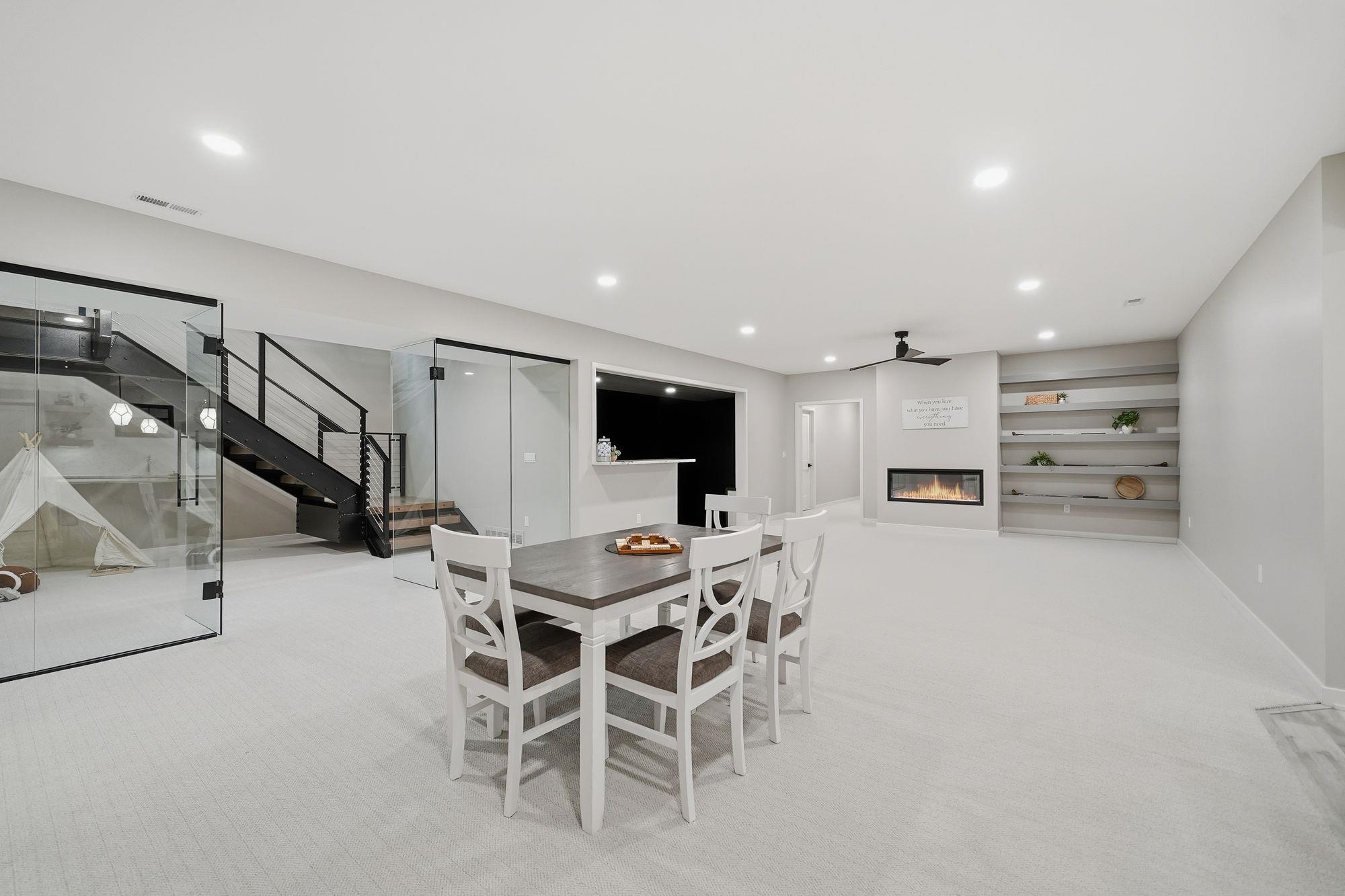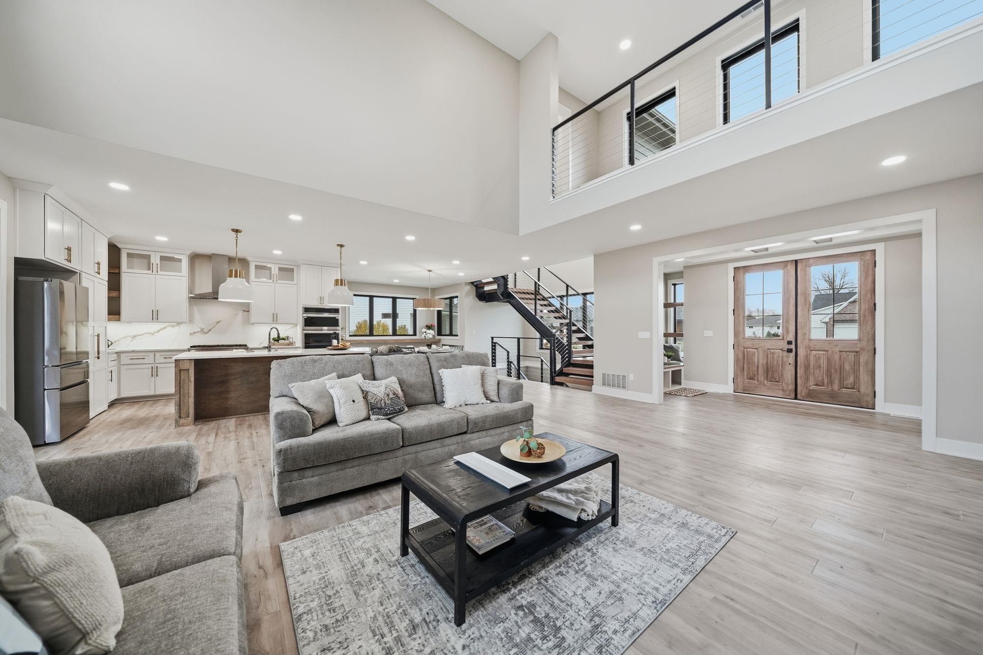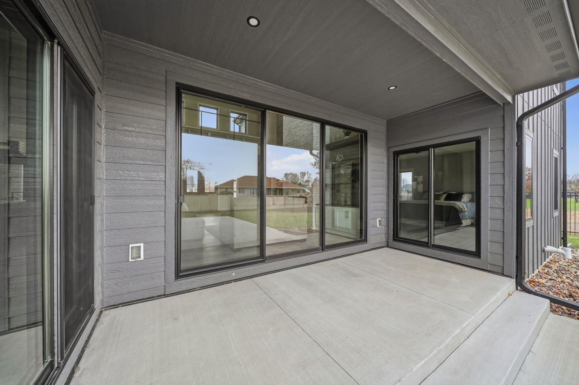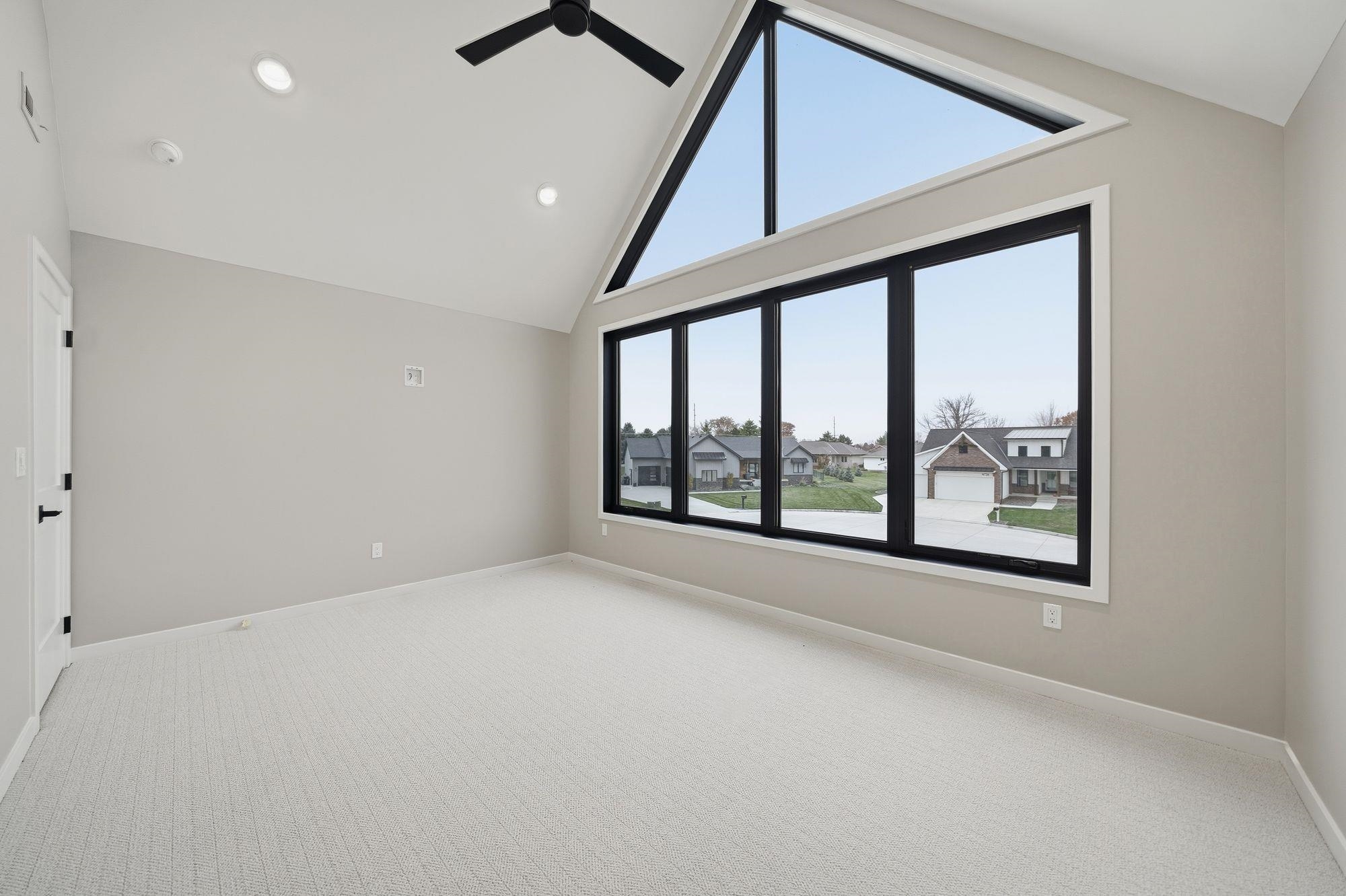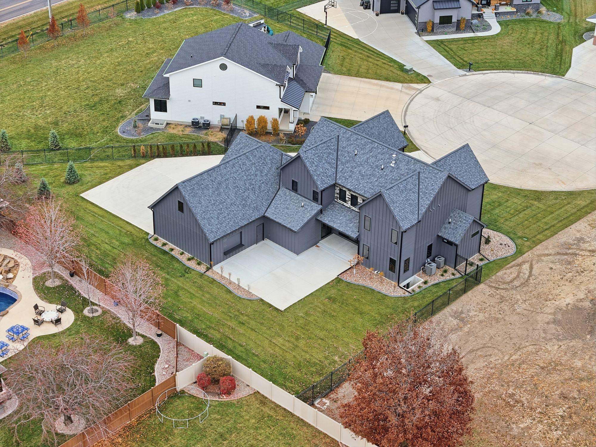 Stunning custom S&S Homes Inc. build on one of the last lots in Country Shadows - outside city limits to save on taxes yet connected to city sewer with a private well. This modern 2-story features a main floor primary suite, 4 additional bedrooms, 6 baths, hidden pantry, vaulted ceilings, beams, and a custom open-tread metal staircase. The great room offers soaring windows and a floor-to-ceiling stone fireplace, leading to a designer kitchen with quartz counters, large island, double ovens, and walk-in pantry. Finished basement includes wet bar, fireplace, rec room, and a sunken 11" golf simulator/movie room. Oversized 4-car garage with four individual doors, bar area, utility sink, and attic storage. Fenced yard and large patio complete this exceptional home