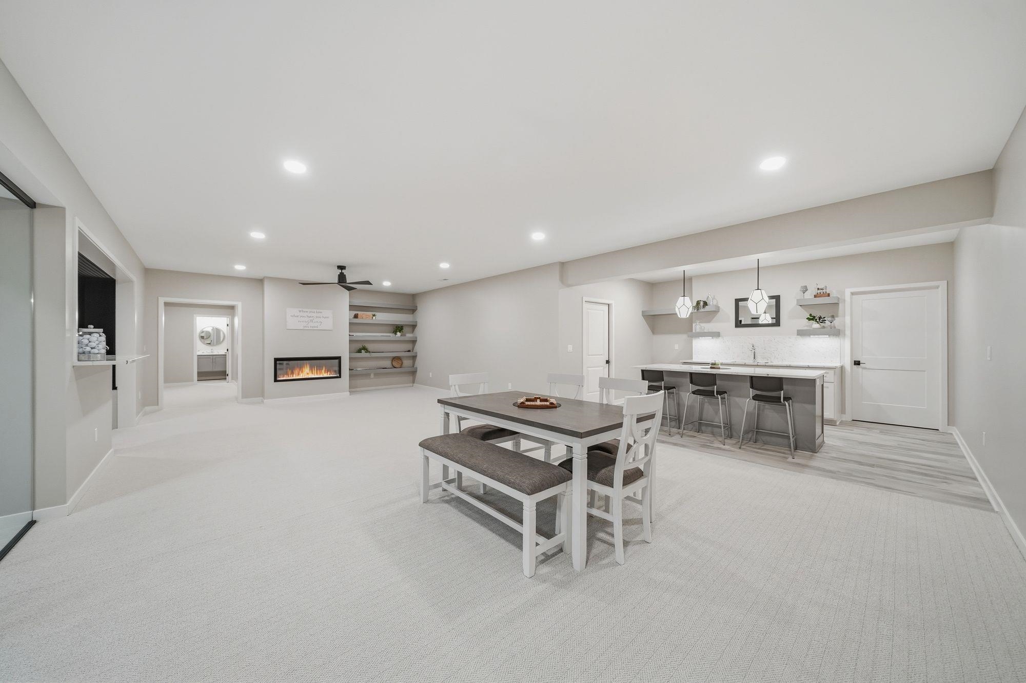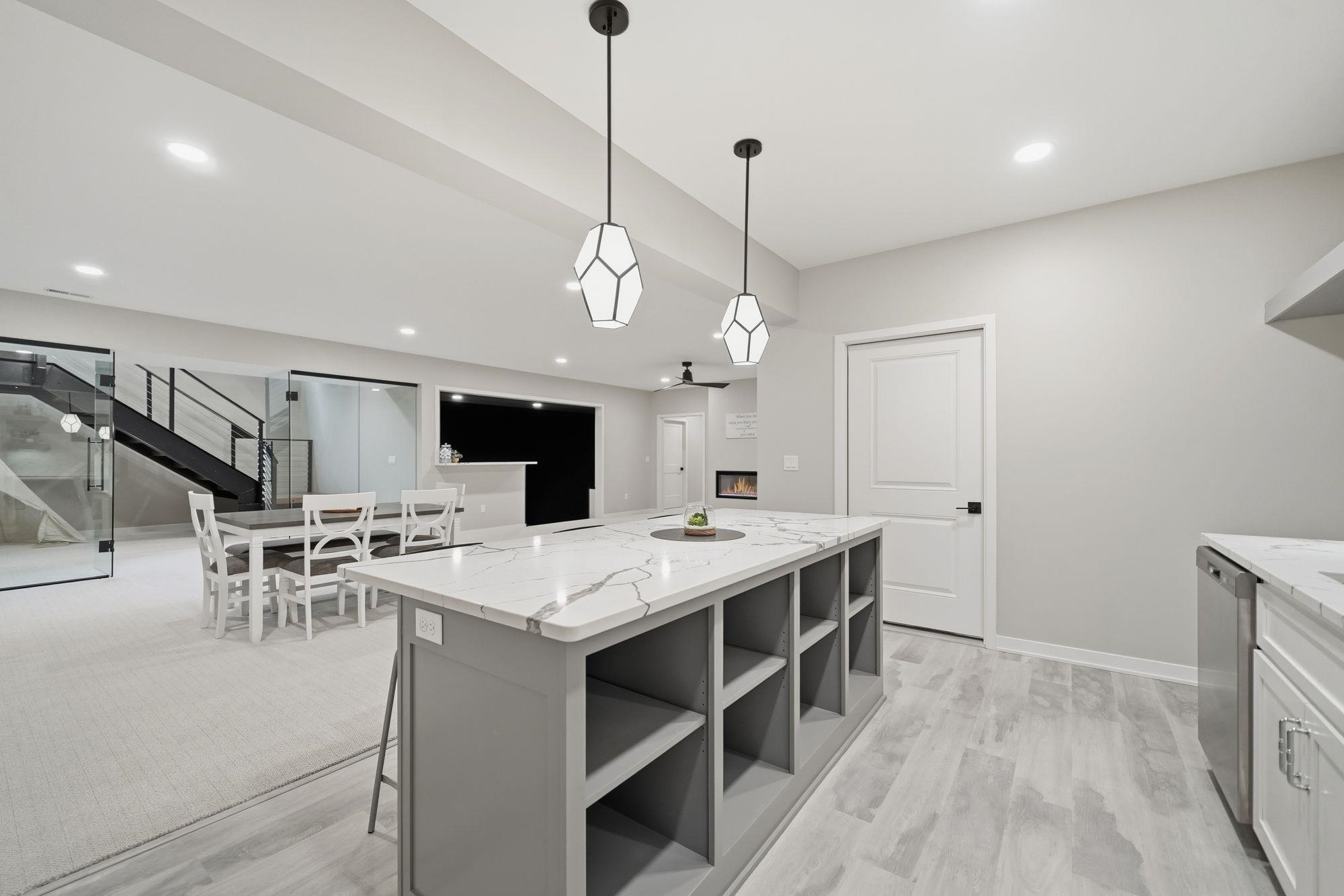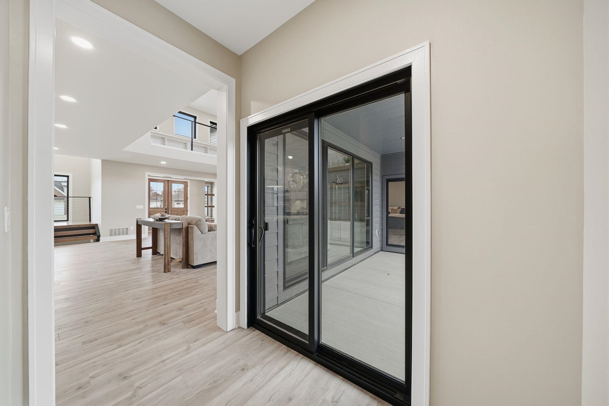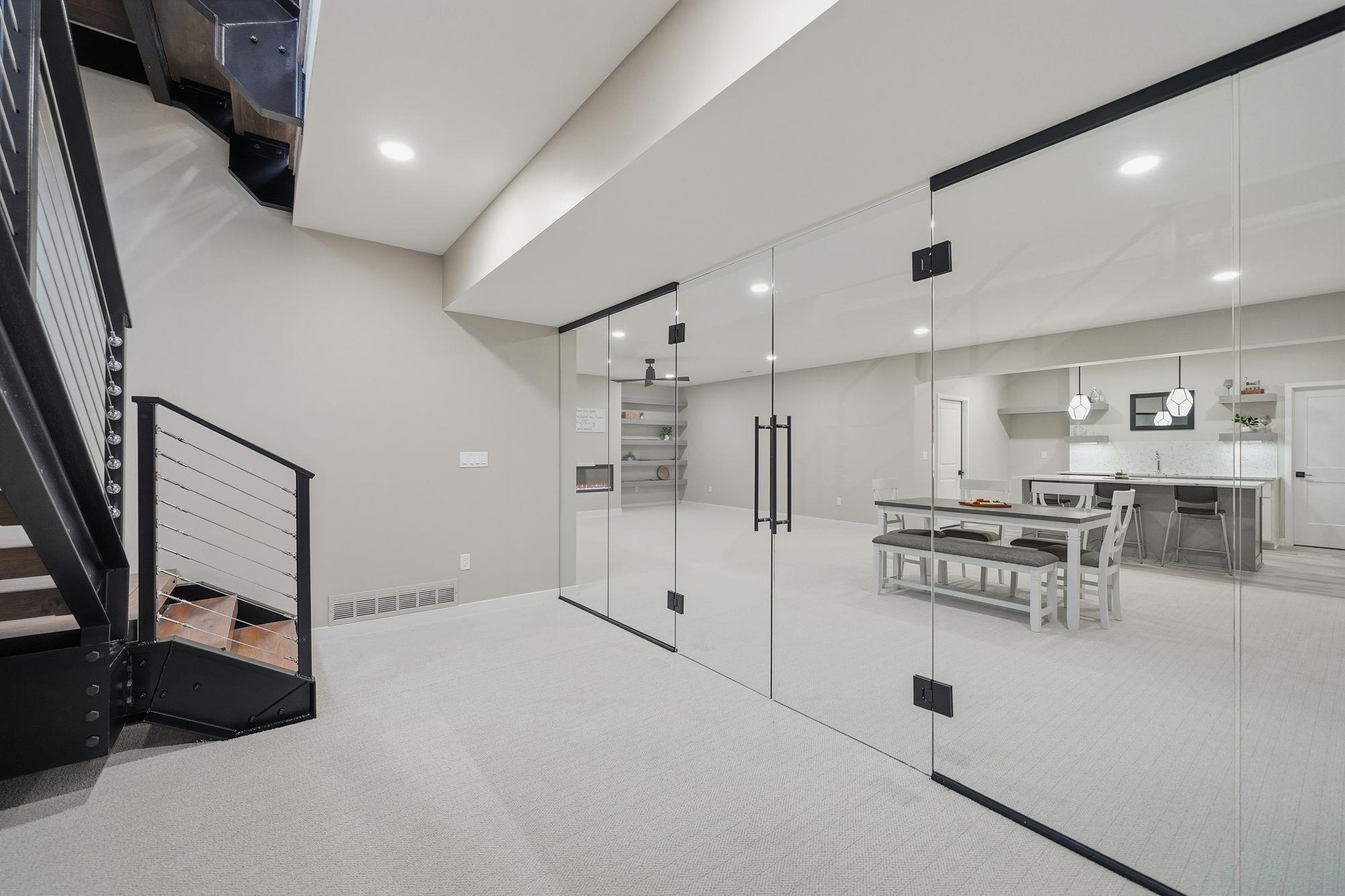 Stunning custom S&S Homes Inc. build on one of the last lots in Country Shadows - outside city limits to save on taxes yet connected to city sewer with a private well. This modern 2-story features a main floor primary suite, 4 additional bedrooms, 6 baths, hidden pantry, vaulted ceilings, beams, and a custom open-tread metal staircase. The great room offers soaring windows and a floor-to-ceiling stone fireplace, leading to a designer kitchen with quartz counters, large island, double ovens, and walk-in pantry. Finished basement includes wet bar, fireplace, rec room, and a sunken 11" golf simulator/movie room. Oversized 4-car garage with four individual doors, bar area, utility sink, and attic storage. Fenced yard and large patio complete this exceptional home