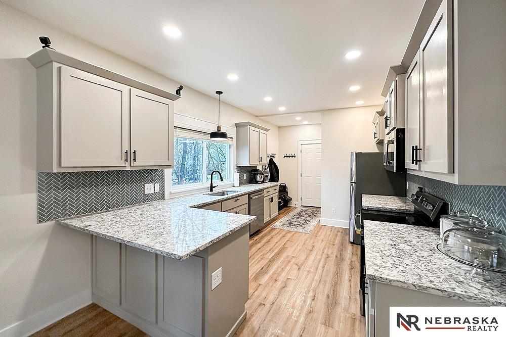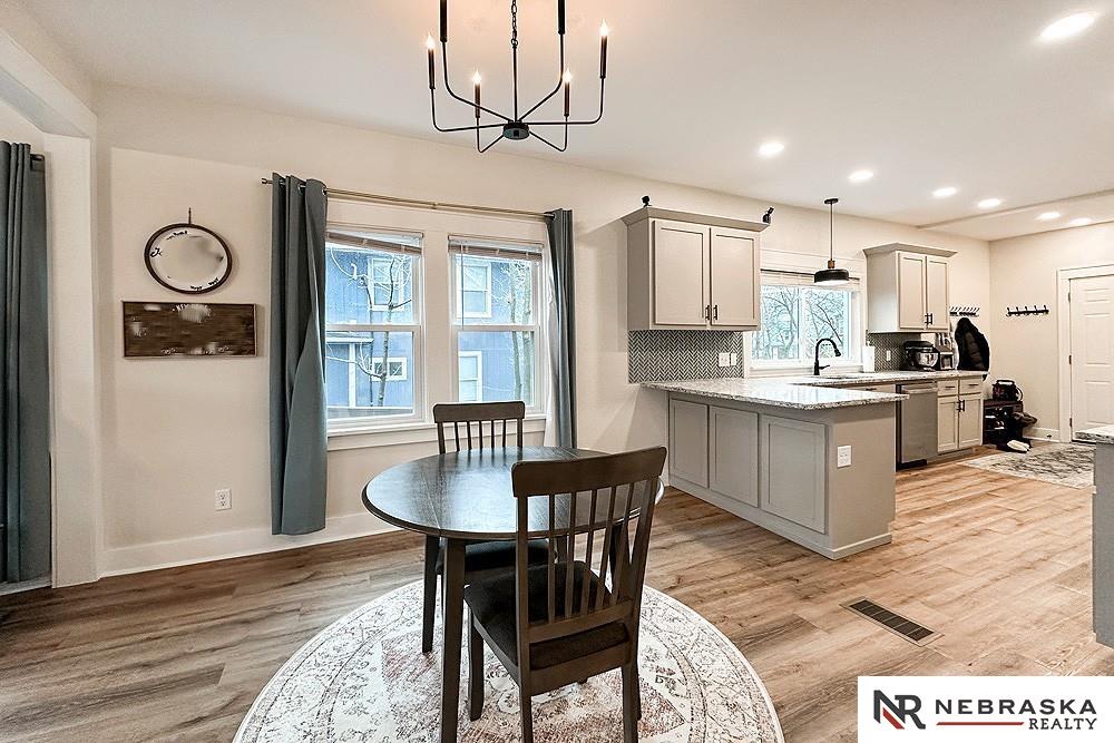 This fully updated 1.5 story home stands out from the moment you walk in. The main floor offers an open and functional layout connecting the living, dining, and kitchen areas, finished with durable luxury vinyl flooring. The kitchen has been nicely updated with new cabinets, granite countertops, and stainless steel appliances. You will also find a main floor bedroom with a walk-in closet and a 3/4 bath. Upstairs features three additional bedrooms and a full bath, both updated with new tile, vanities, and fixtures. Fresh paint and new carpet give the home a clean, move-in ready feel. Big-ticket updates in 2024 include windows, roof, blinds, and exterior paint. Alley access provides convenient rear parking.