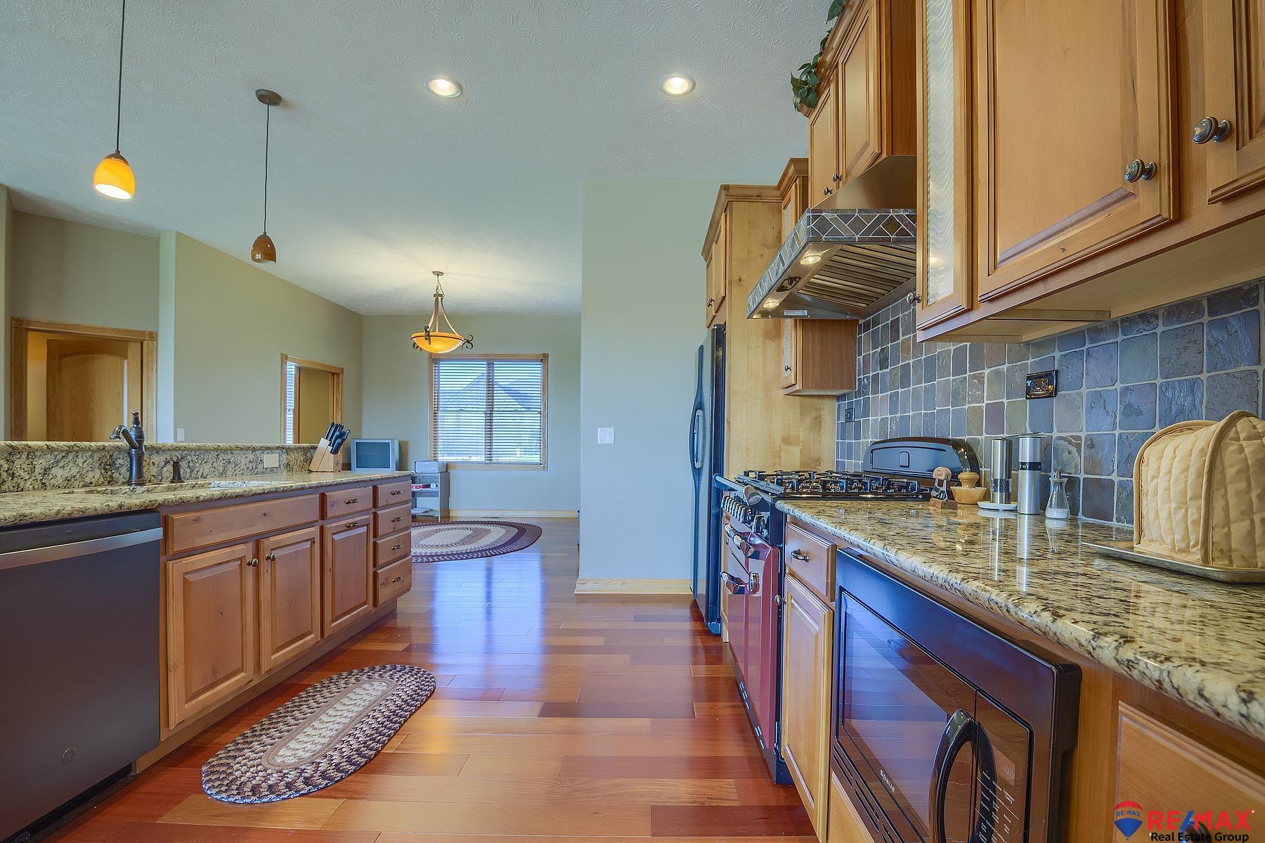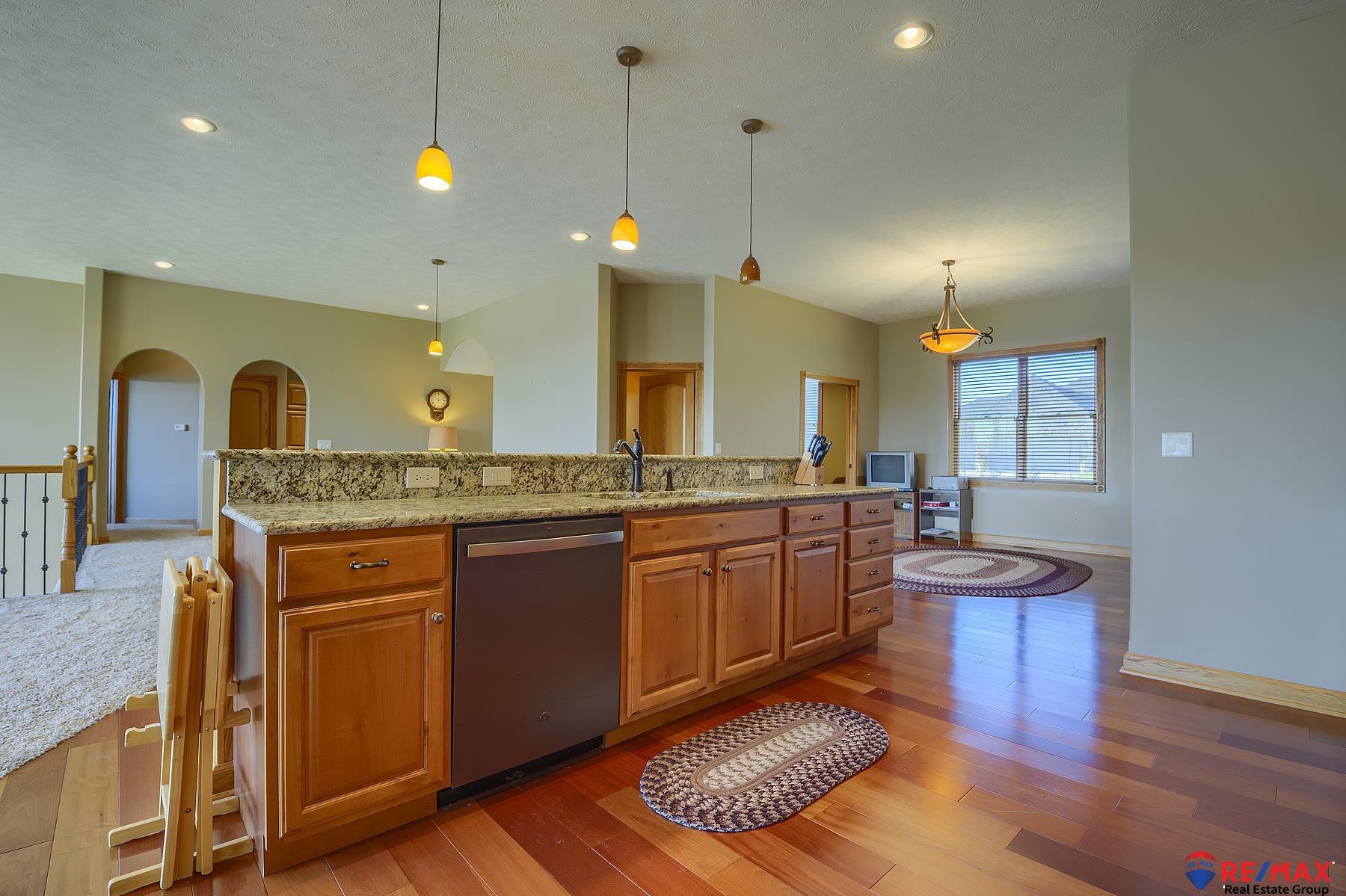 Open Sunday,Nov.2 from 1-3.Exceptional walkout custom-built ranch on the lake was designed for entertaining on both levels.It boasts over 3,469 sq.ft. with massive windows providing breathtaking lake views,volume ceilings and a stunning two-story stone fireplace accent wall.Chef’s kitchen features granite counters, upgraded Legacy stove/oven, walk-in pantry,and high-end finishes.Numerous upgrades include stair lights,Pella windows,solid core doors,boxed ceiling in primary suite, spacious walk-in closet,whirlpool tub,walk-in shower, dual vanities,and I-joist framing.Lower level offers a walkout to the lake and an in-law/guest suite with 2BRs,large family room, full kitchen, playroom, and an additional full bath — perfect for guests or multigenerational living. Laundry rooms on both levels, office is on the main floor, and there’s an oversized three-car garage. Even drive has a drain. Covered deck overlooks the lake. Vinyl siding for low maintenance. All appliances stay.