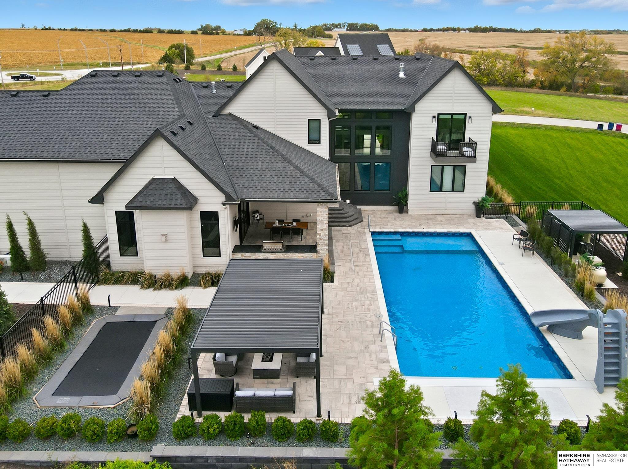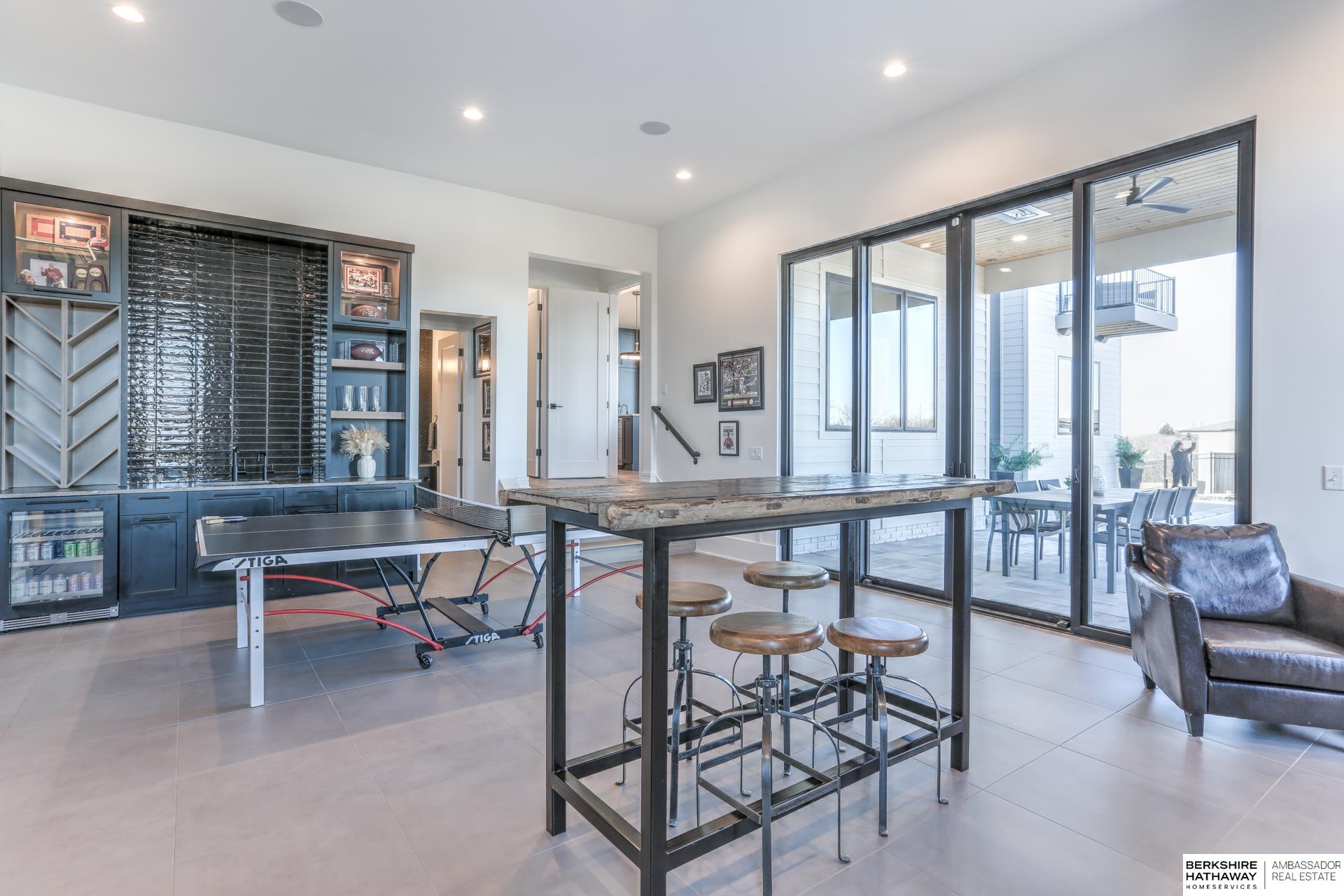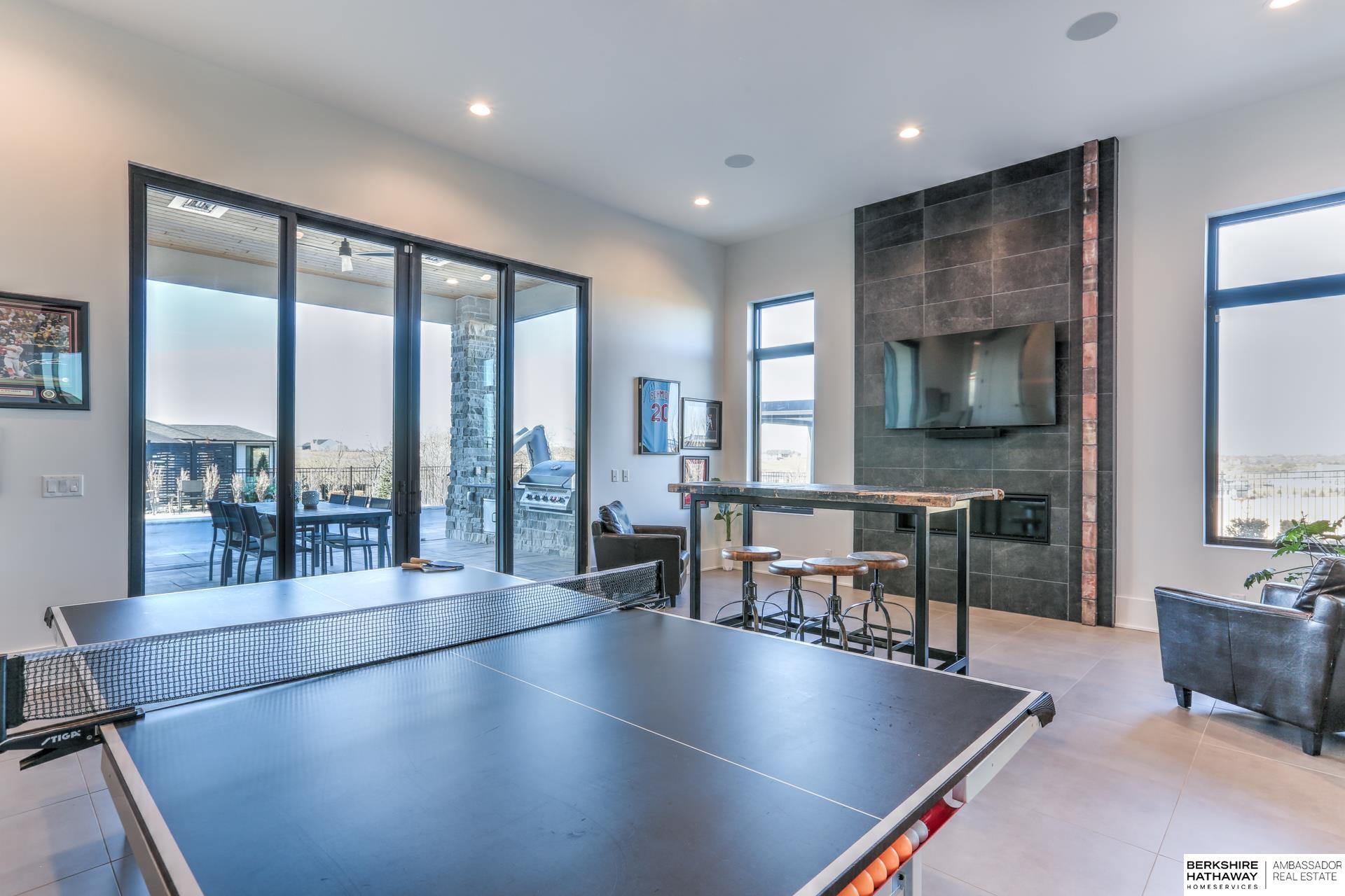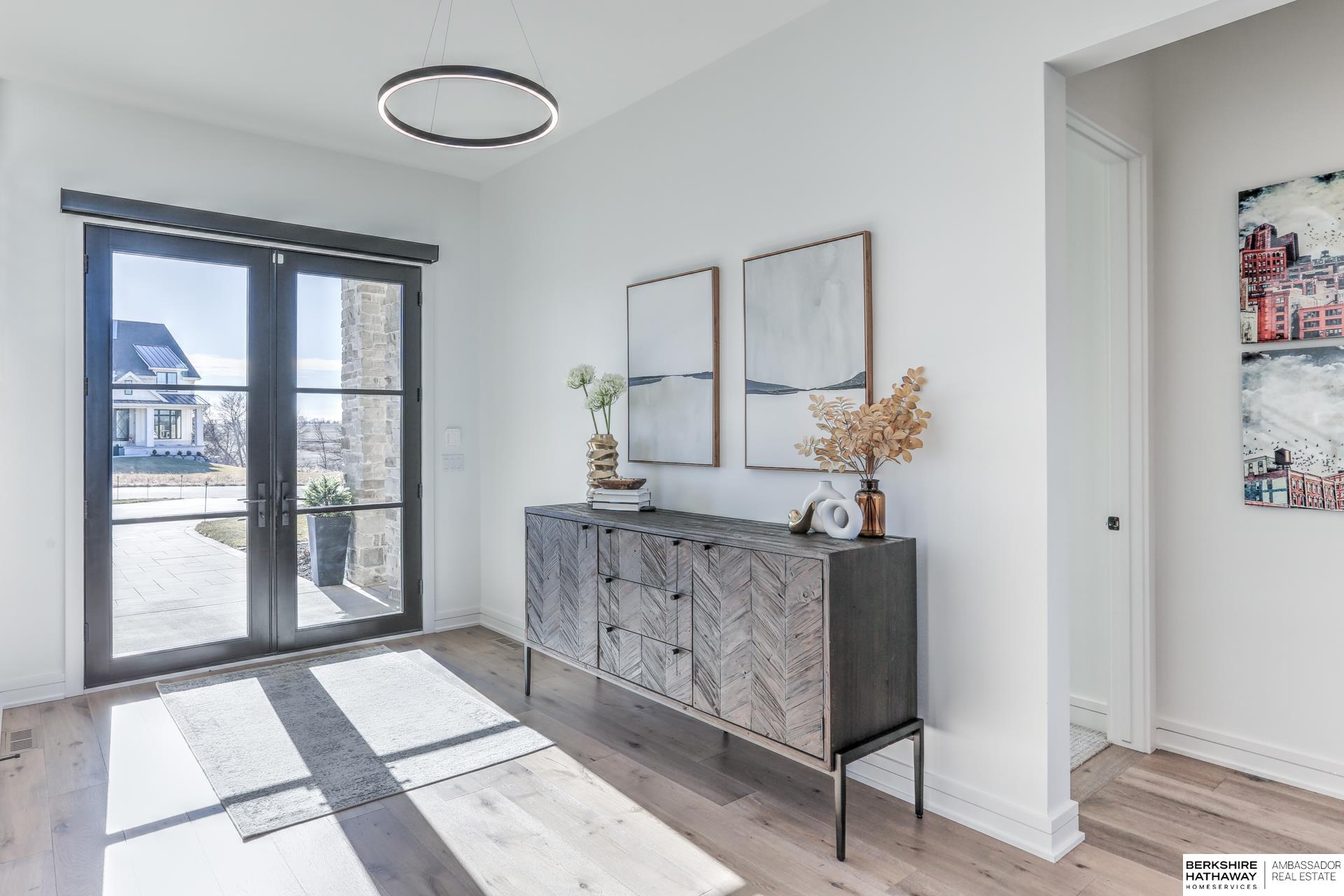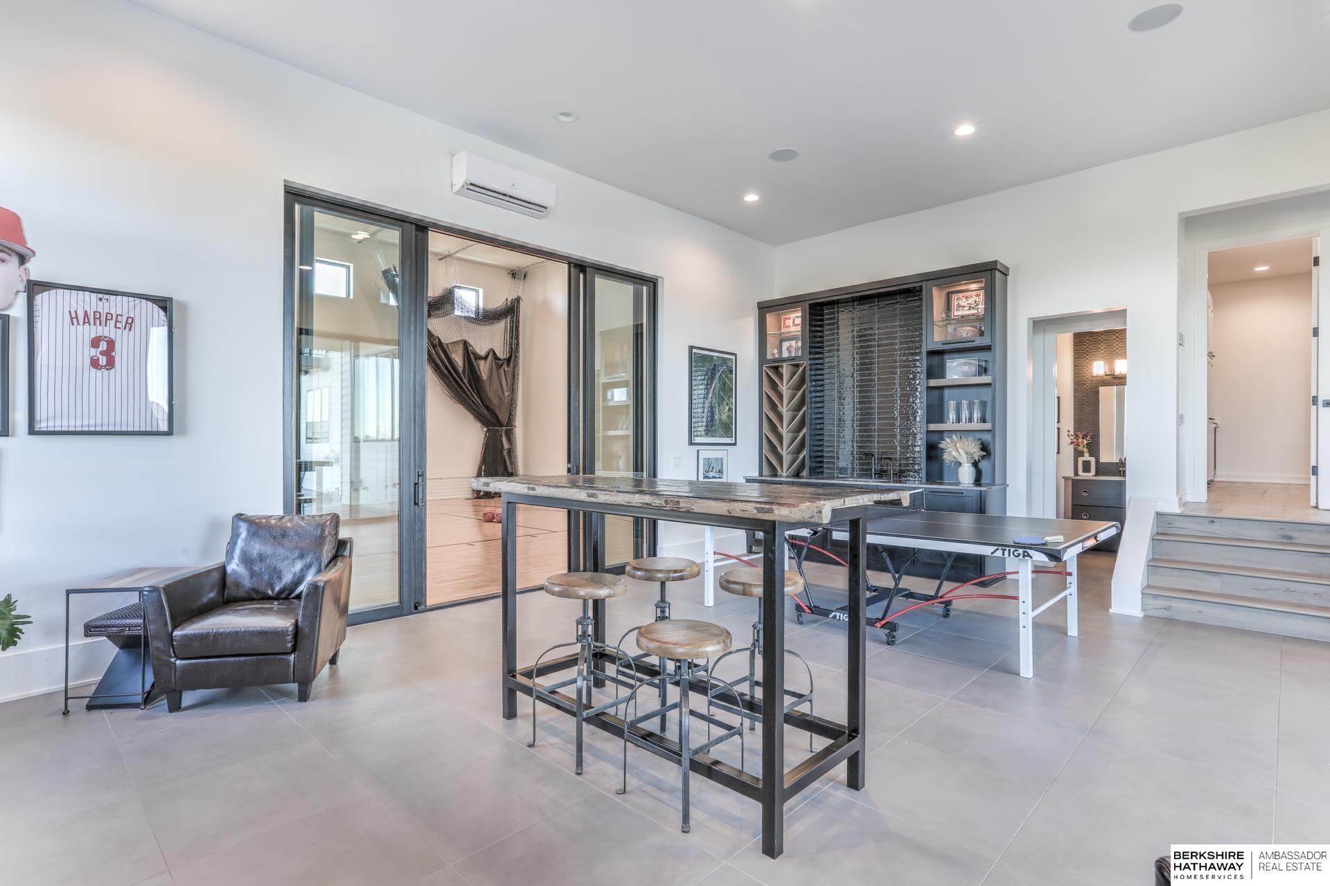 This private estate offers intentional design and luxury living across 1.27 pristine acres in the Elkhorn School District. Panoramic views and walls of windows fill the home w/ natural light, seamlessly connecting refined interiors to the tranquil outdoor setting. Rich wood floors and high-end finishes create an atmosphere of understated luxury throughout the main living spaces. Designed for elevated entertaining, the gourmet kitchen features custom cabinets, professional-grade Wolf & Sub-Zero appliances and thoughtfully designed walk-through pantry. An entertaining lounge w/ wet bar flows into the impressive 30 x 30 indoor sports court for effortless recreation. The primary suite serves as a serene escape w/ balcony, spa-inspired bath and walk-in closet, while secondary beds offer generous space. A true oasis awaits outdoors w/ covered patio, built-in grill and fire pit overlooking the saltwater pool and expansive flat yard. Crafted w/ intention and designed for resort-style living.