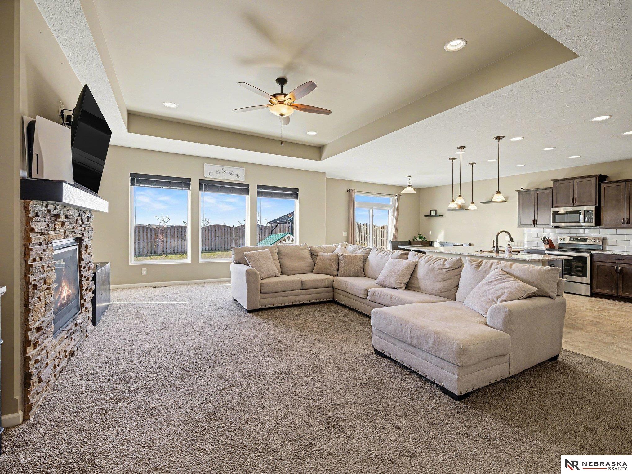 Built in 2020, this polished 4-bedroom ranch in Falcon Pointe delivers modern living with a smart, functional layout. The open main floor centers around a kitchen with stainless appliances, walk-in pantry, and a large L-shaped breakfast island flowing into a dining area with slider to the rear patio. The living room impresses with a stacked-stone fireplace and large windows that flood the space with natural light. The owner's suite features a walk-in closet and private full bath with double sinks and separate tub and shower. 2 additional bedrooms, a second full bath and main floor laundry round out the main level. Downstairs, a spacious rec room, bedroom 4, a ¾ bath, and generous storage area offer room to grow. Step outside to a fully privacy-fenced backyard — ideal for pets, play, or quiet evenings. The attached 3-car garage completes the package. Better than new construction with the space and features today's buyers are looking for.