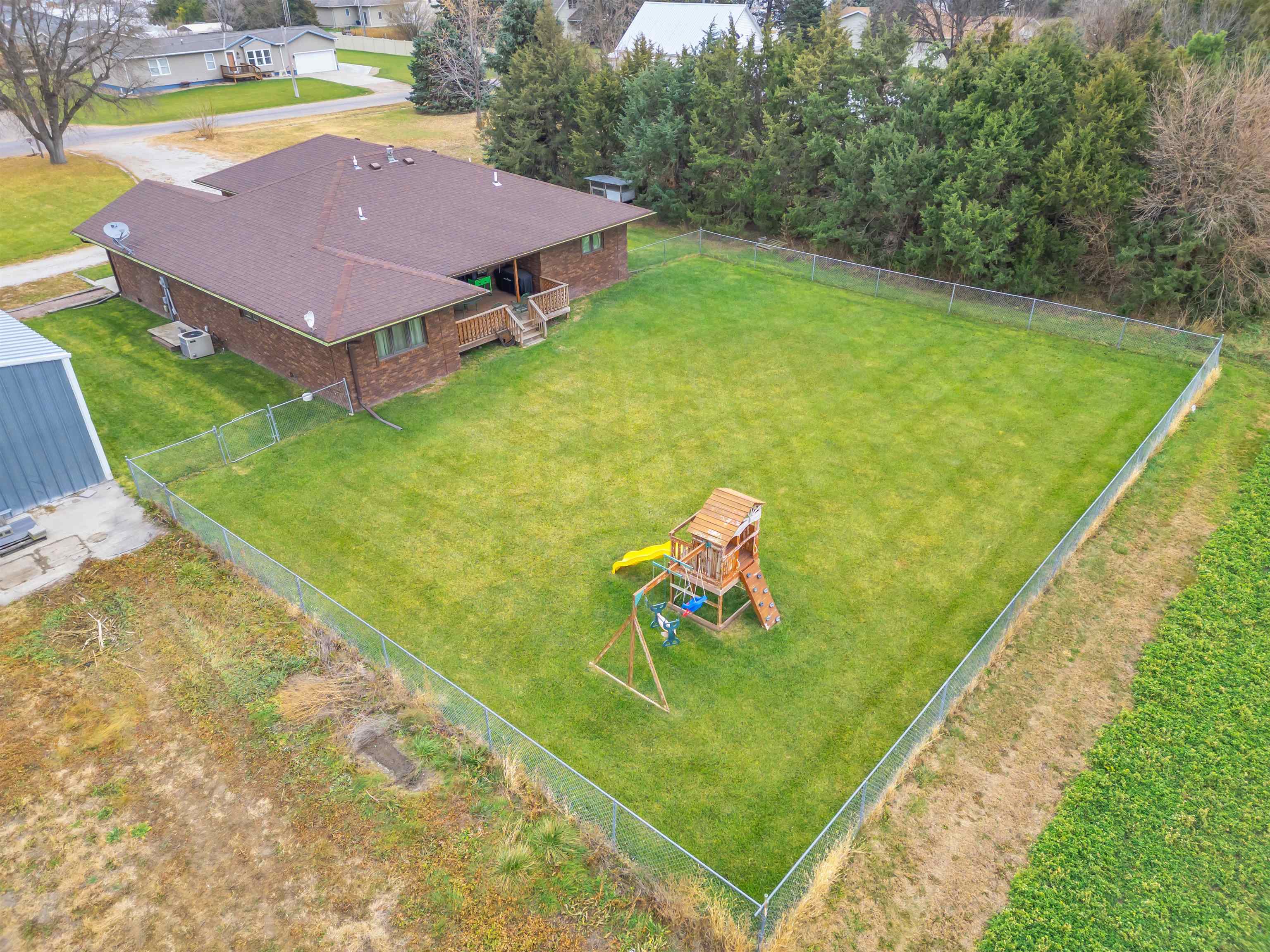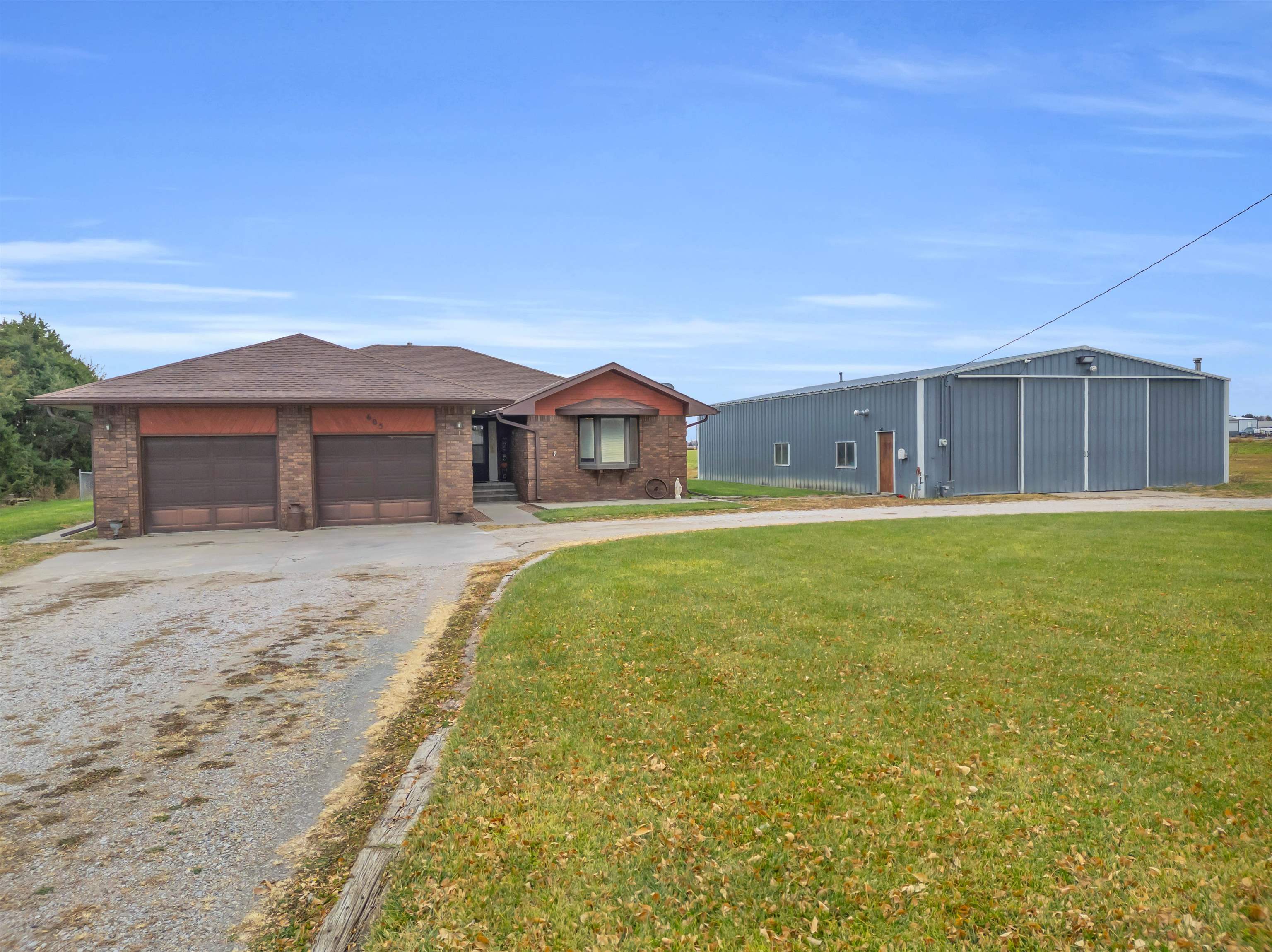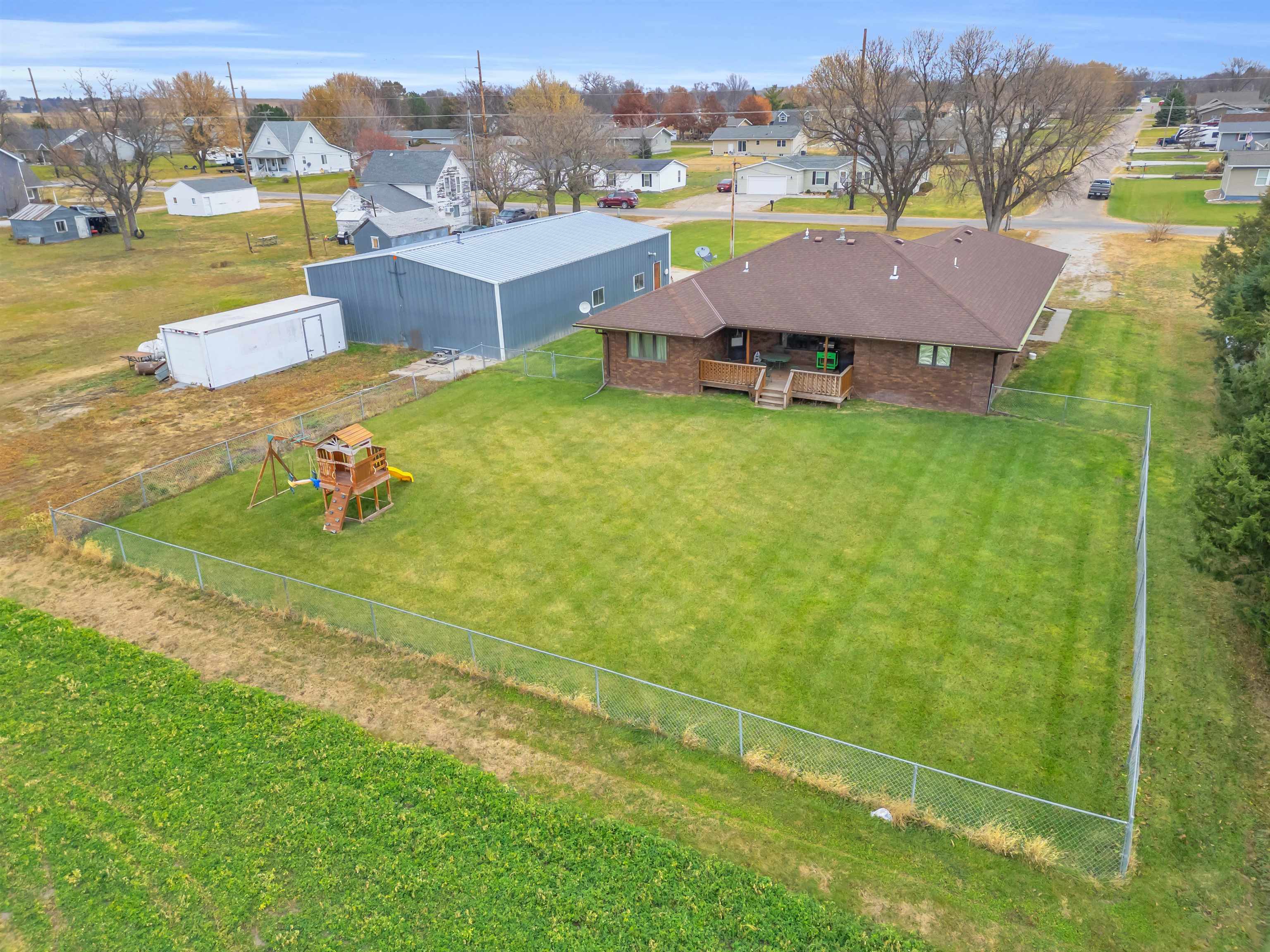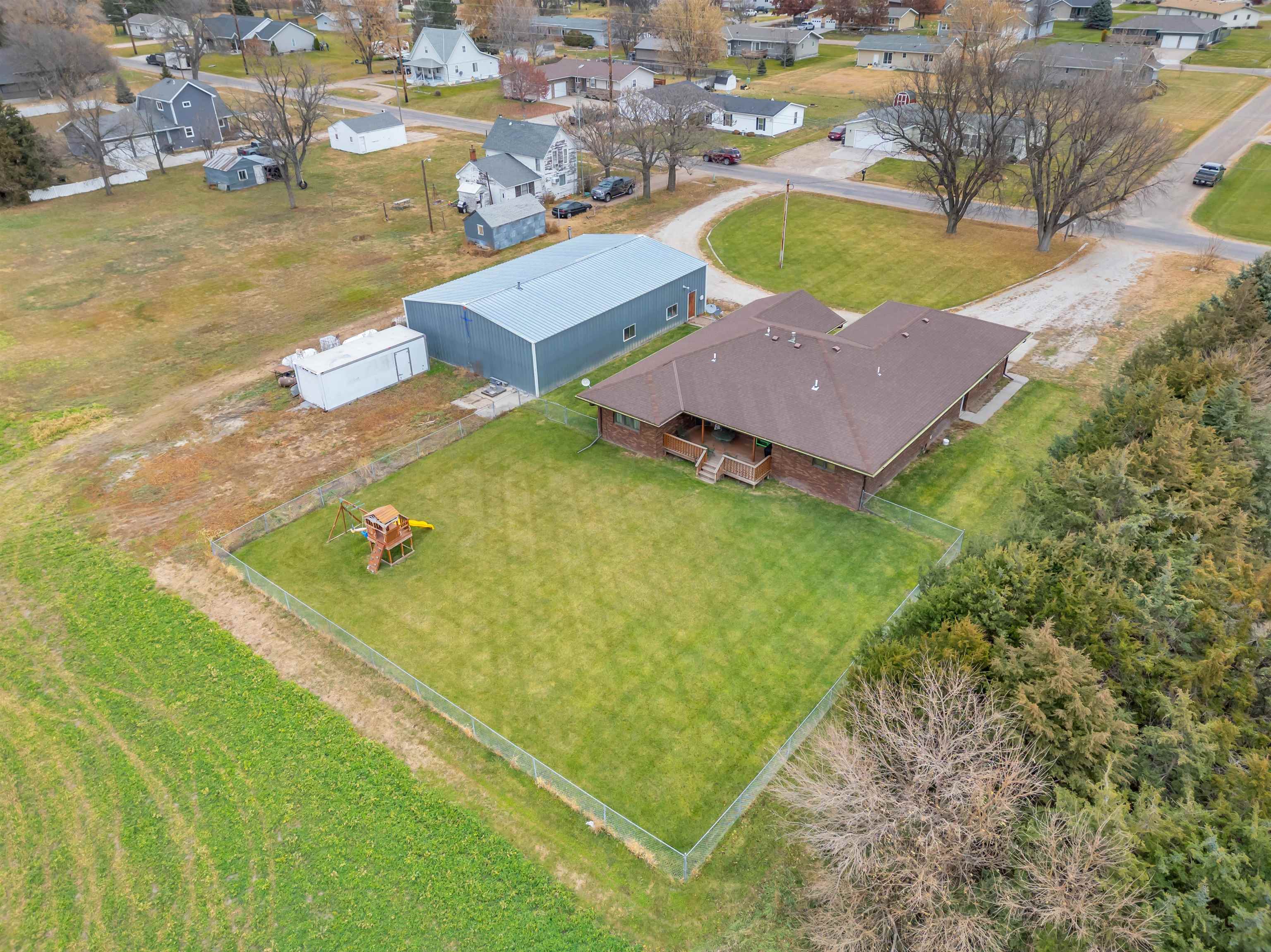 Welcome to this move-in-ready, 4-bedroom, 3-bath home offering space, privacy, and functional amenities on the edge of Elm Creek. With an additional 3 acres of land directly behind the home, this property provides rare seclusion while still being close to town. The all-brick exterior adds timeless appeal and low-maintenance durability. Inside, a warm and inviting layout awaits, featuring a dedicated dining room perfect for gatherings and a convenient mudroom off the garage. The primary suite offers a relaxing retreat with a large soaking tub and a separate shower. A spacious 2-car garage provides everyday convenience, while a large Quonset building on the property provides excellent storage or workshop options—ideal for hobbies, equipment, or additional vehicles. The shop includes a new natural gas heater, updated electrical, and lighting. The property also has security cameras installed. The expansive U-shaped driveway allows for easy access and plenty of parking for guests. Step outside to enjoy a chain-fenced backyard, a deck overlooking the peaceful acreage, and plenty of open space to garden, play, entertain, or simply unwind surrounded by nature. This Elm Creek property blends comfort, privacy, and practicality—an ideal home for those seeking room to spread out with the bonus of exceptional country amenities while being close to town.