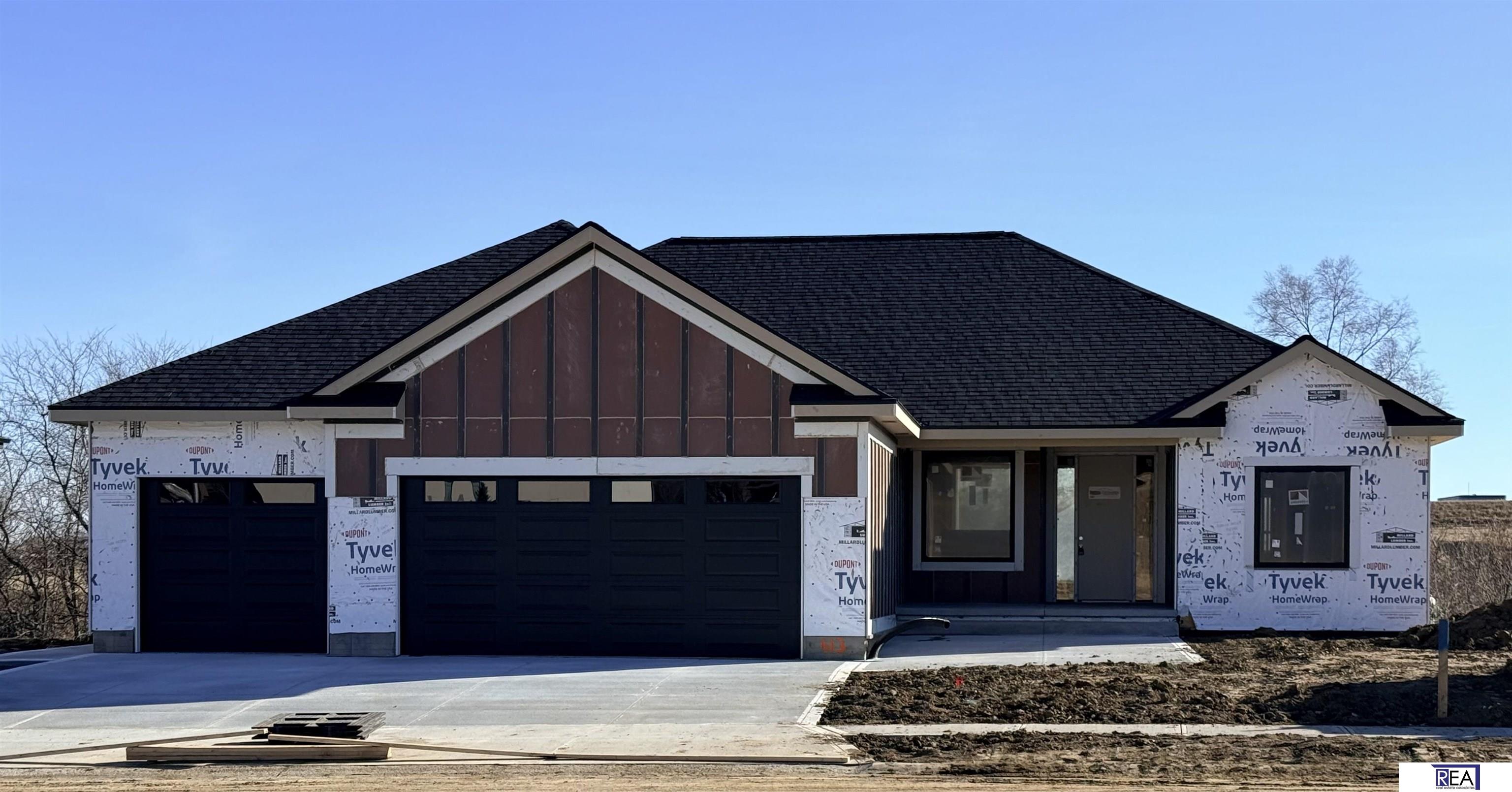 New construction! Stunning new home in Monrovia Estates, set on an amazing large estate lot with huge windows and premium finished and backs to a secluded lush tree line. This 3-bed 2-bath, walk-out ranch offers under 1,900 finished square feet of elegant and open-concept living. The home feature 10-foot ceilings and an expansive floor plan with a waterfalled quartz center island and spacious walk-in pantry. The 3+ car garage is finished - fully insulated, painted and trimmed. Home includes an excavated stoop in basement, which provides endless customization opportunities. The primary suite boats an overside closet, soaking tub, dual sinks and a beautifully tiled walk-in shower. Monrovia Estates is ideally located near the upcoming Tower District, a 120-acre mixed-use development in Papillion, NE. Estimated completion early 2026.