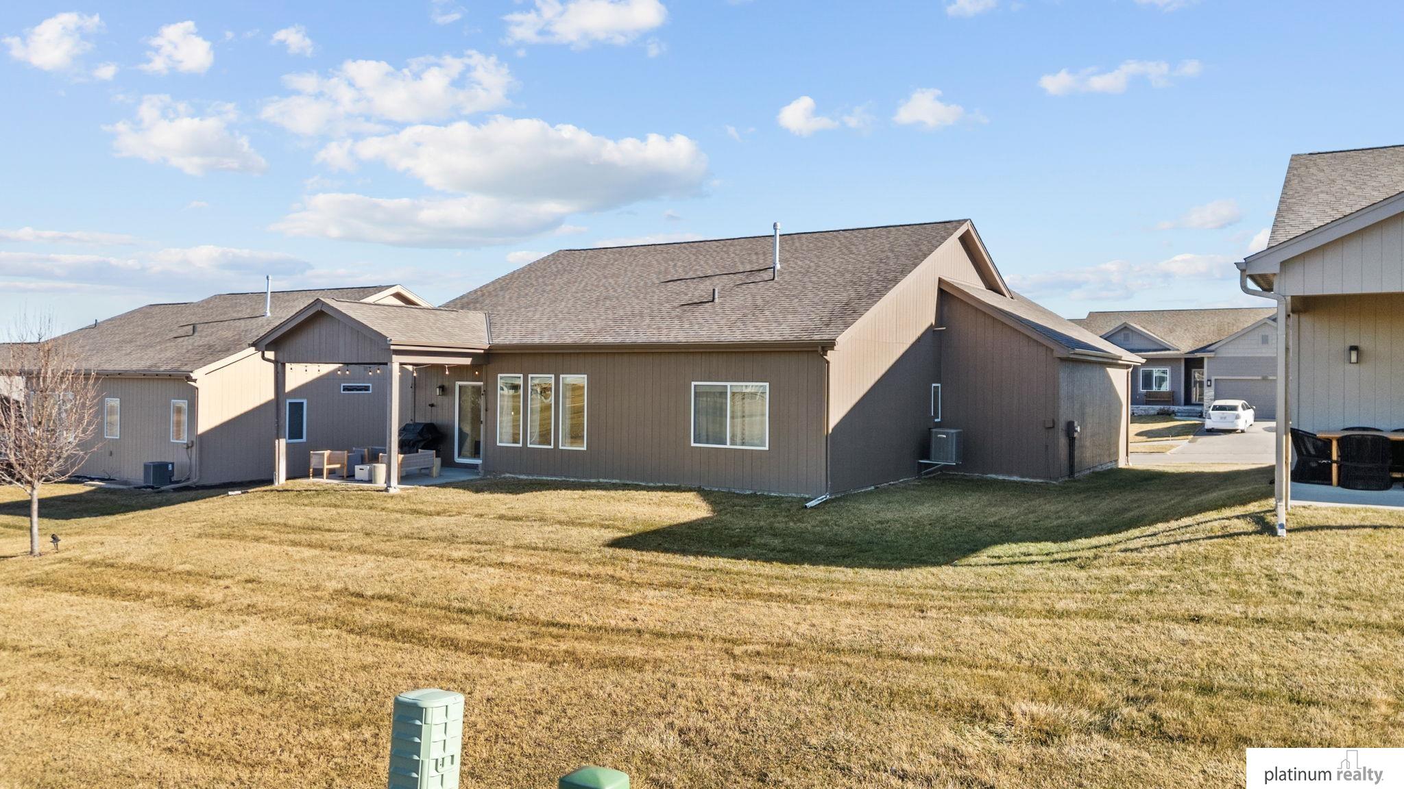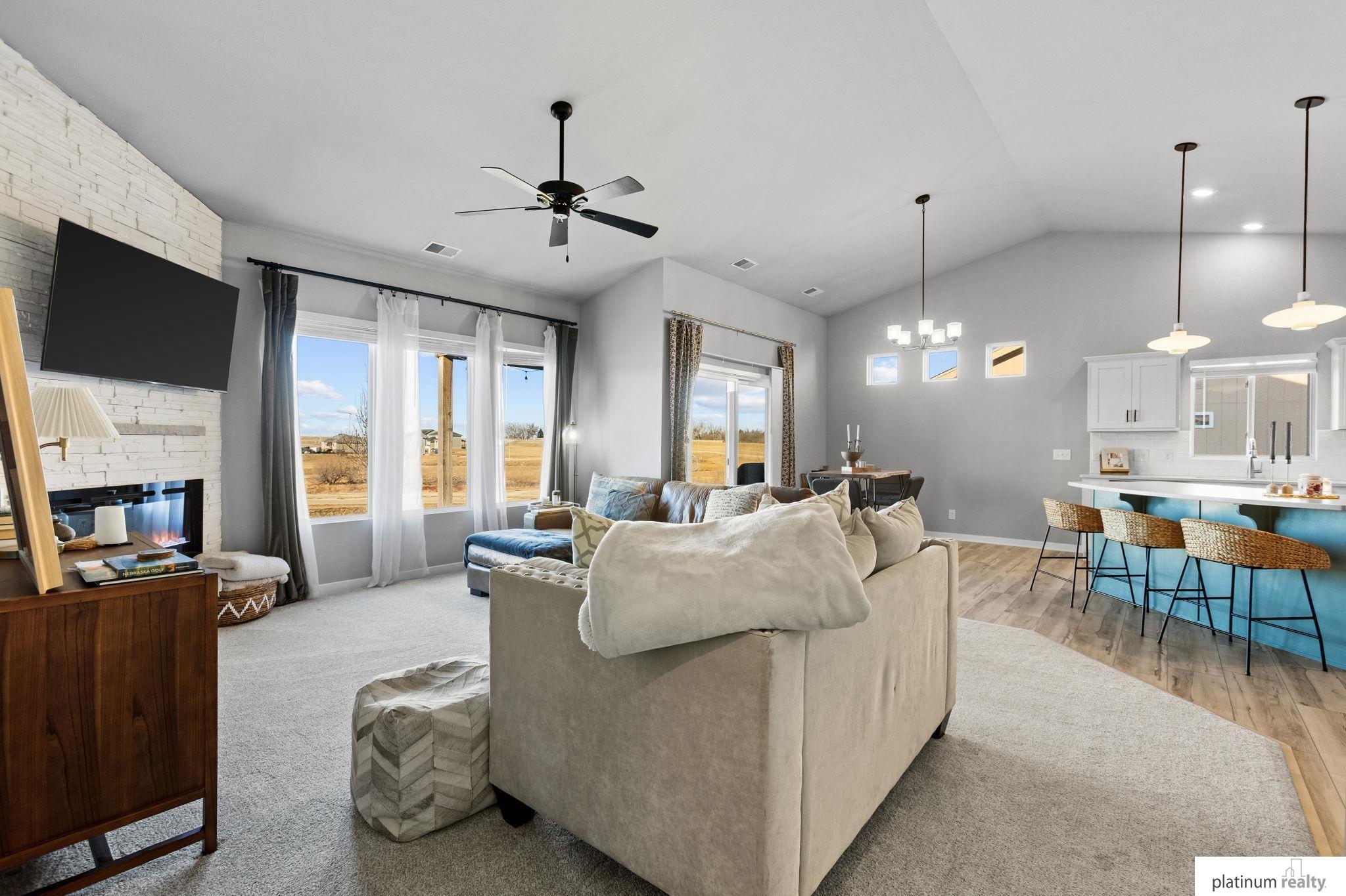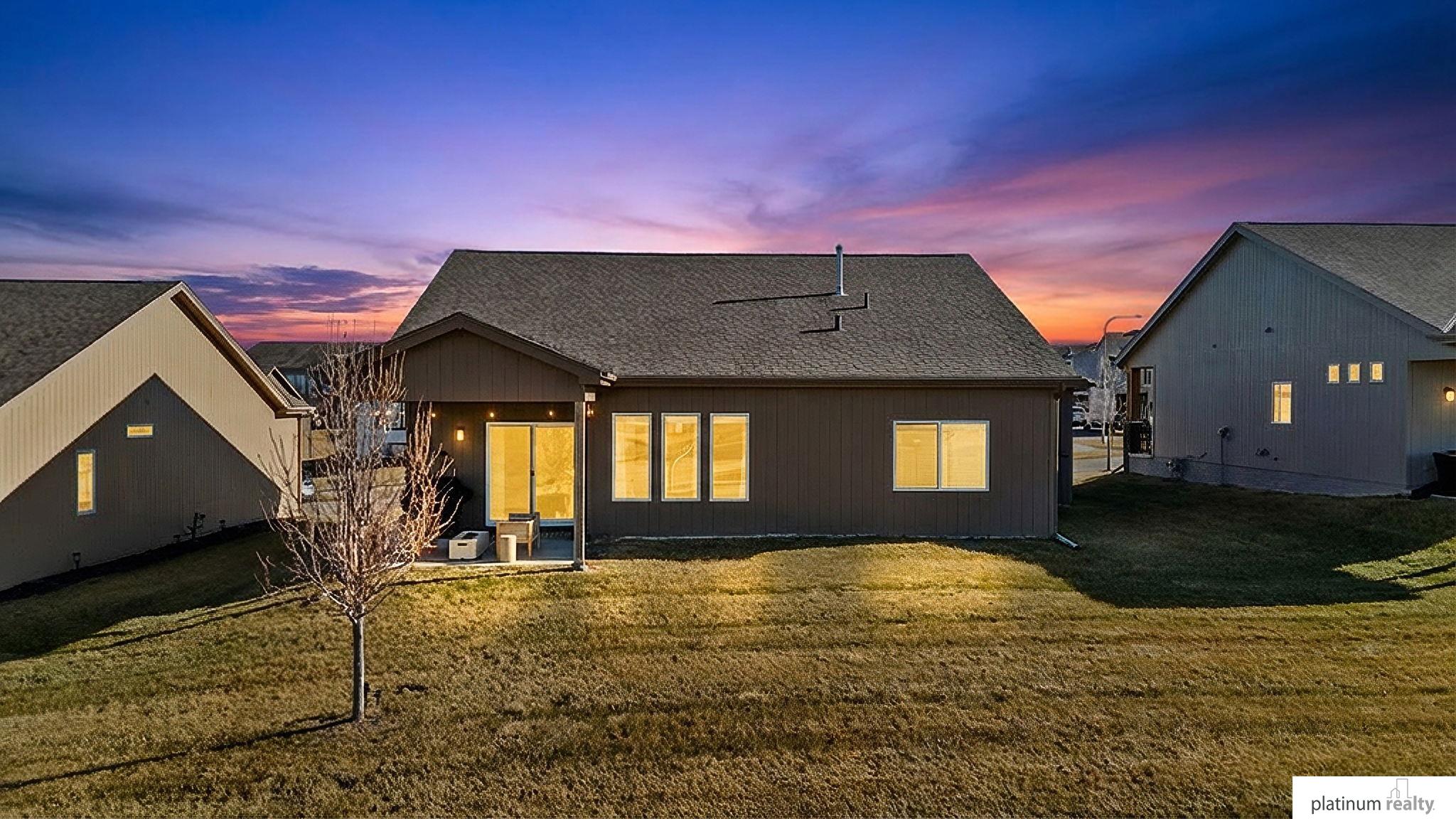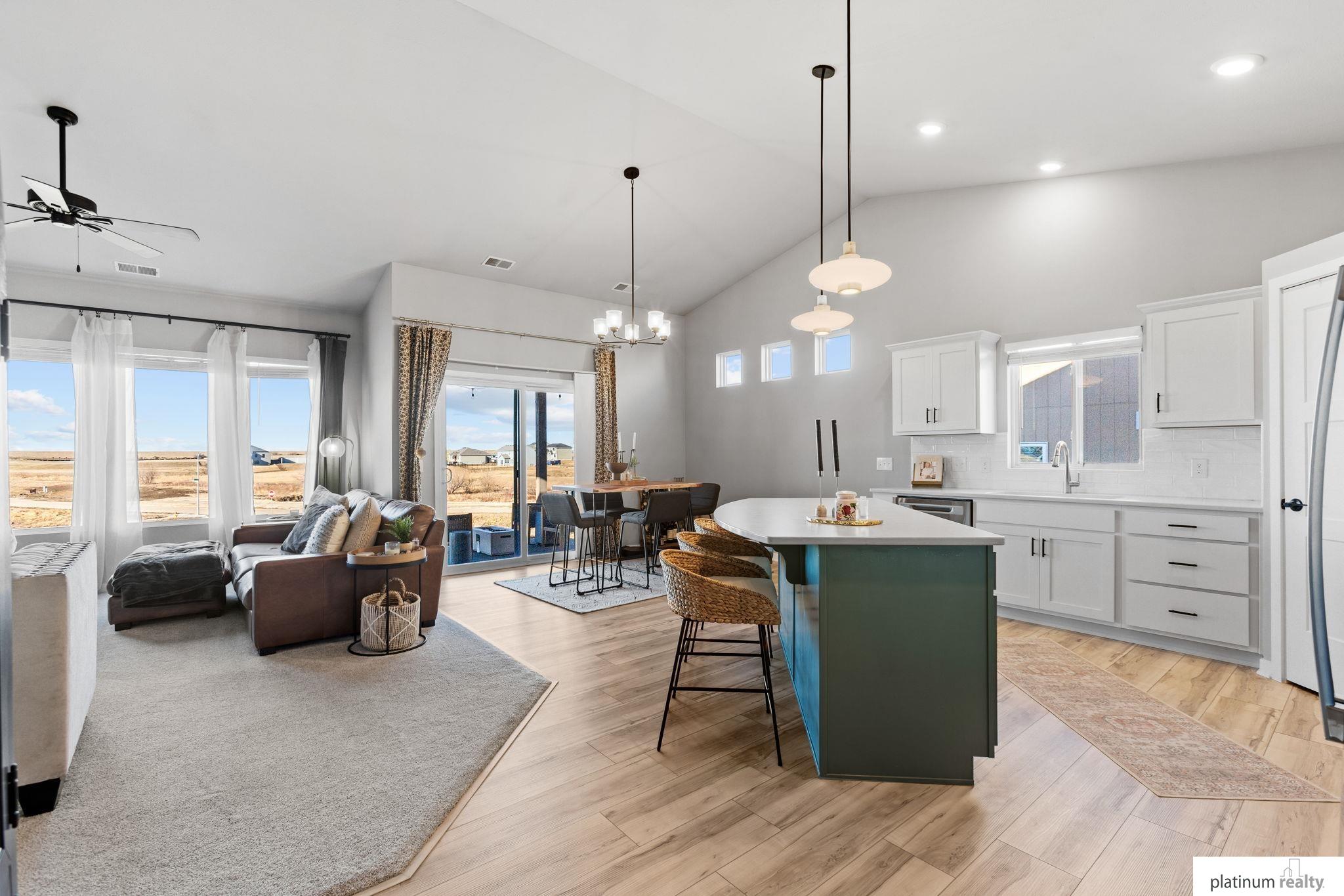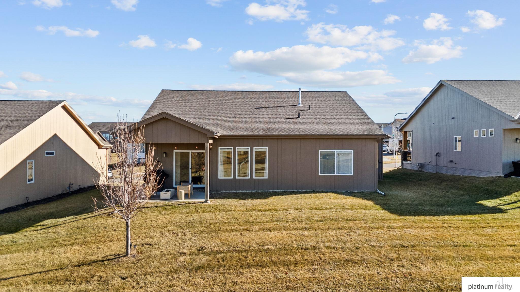 Discover the perfect blend of comfort, style, and low-maintenance living in this nearly new “Brantley” floorplan patio home built by Celebrity Homes. Only three years old, this thoughtfully designed residence offers an inviting open layout with vaulted ceilings and abundant natural light. The bright kitchen features white cabinetry, a tile backsplash, quartz countertops, pantry, island with pendant lighting, and LVP flooring that flows into the dining area. The living room includes plush carpet, an upgraded stone fireplace, and backyard views. The spacious primary suite offers a private ¾ bath and walk-in closet, with a large laundry room conveniently nearby. Two additional bedrooms, a full bathroom, and a functional drop zone complete the interior. Step outside to a covered patio, spacious yard, and beautiful sunset views. Townhome Association dues cover snow removal, lawn care, and sprinkler system maintenance for truly effortless living.