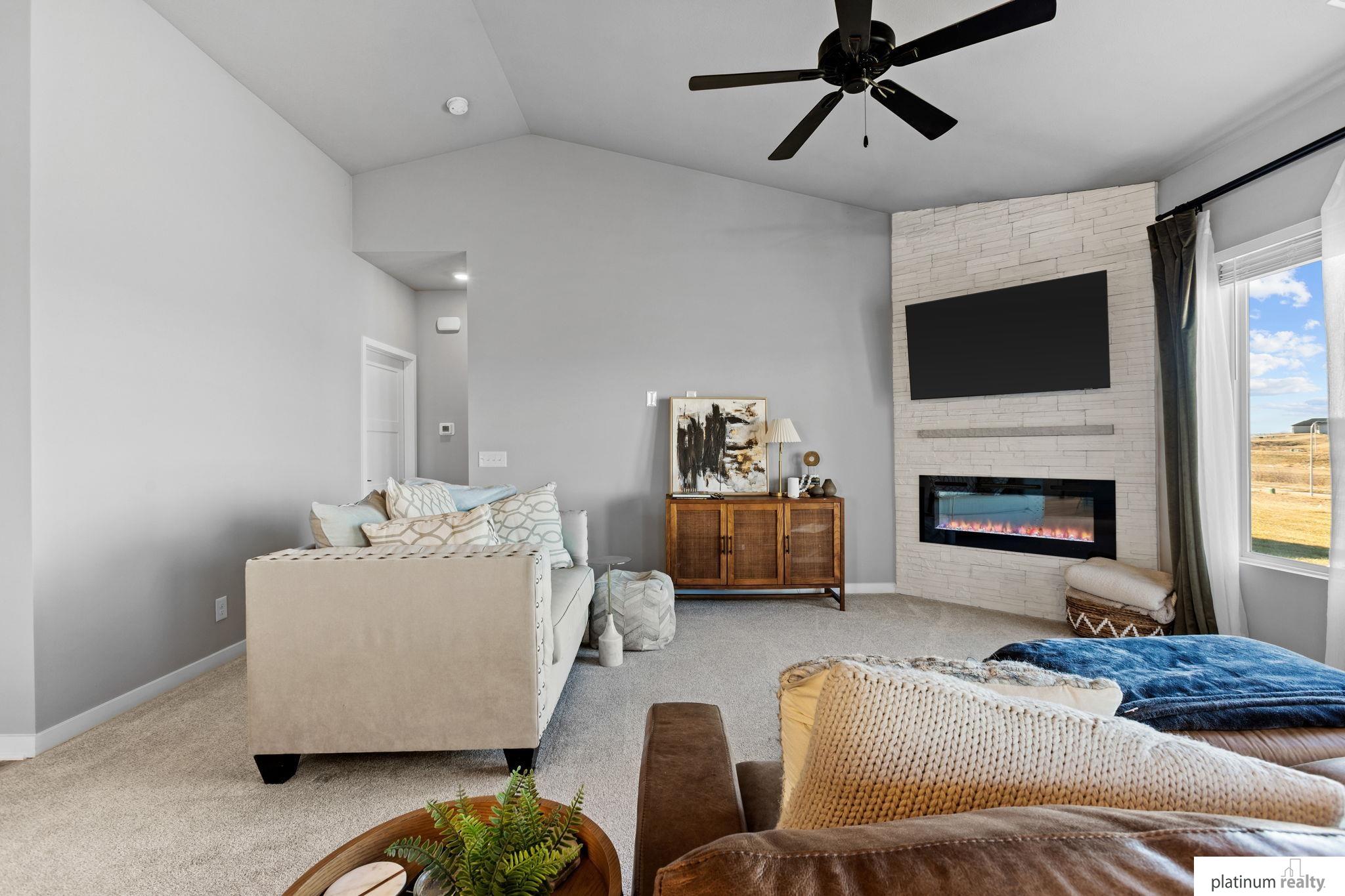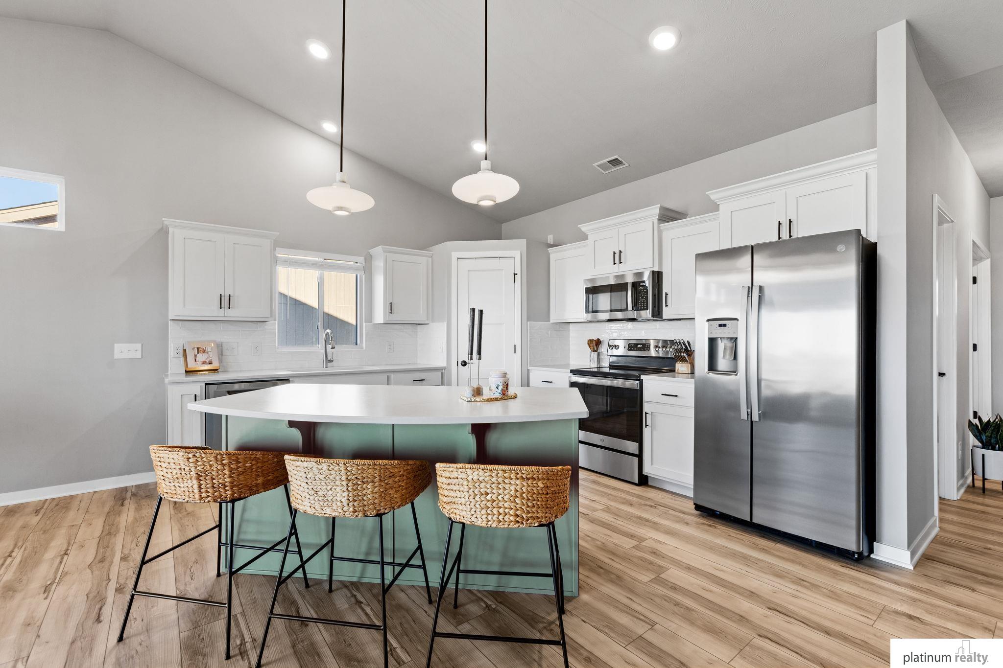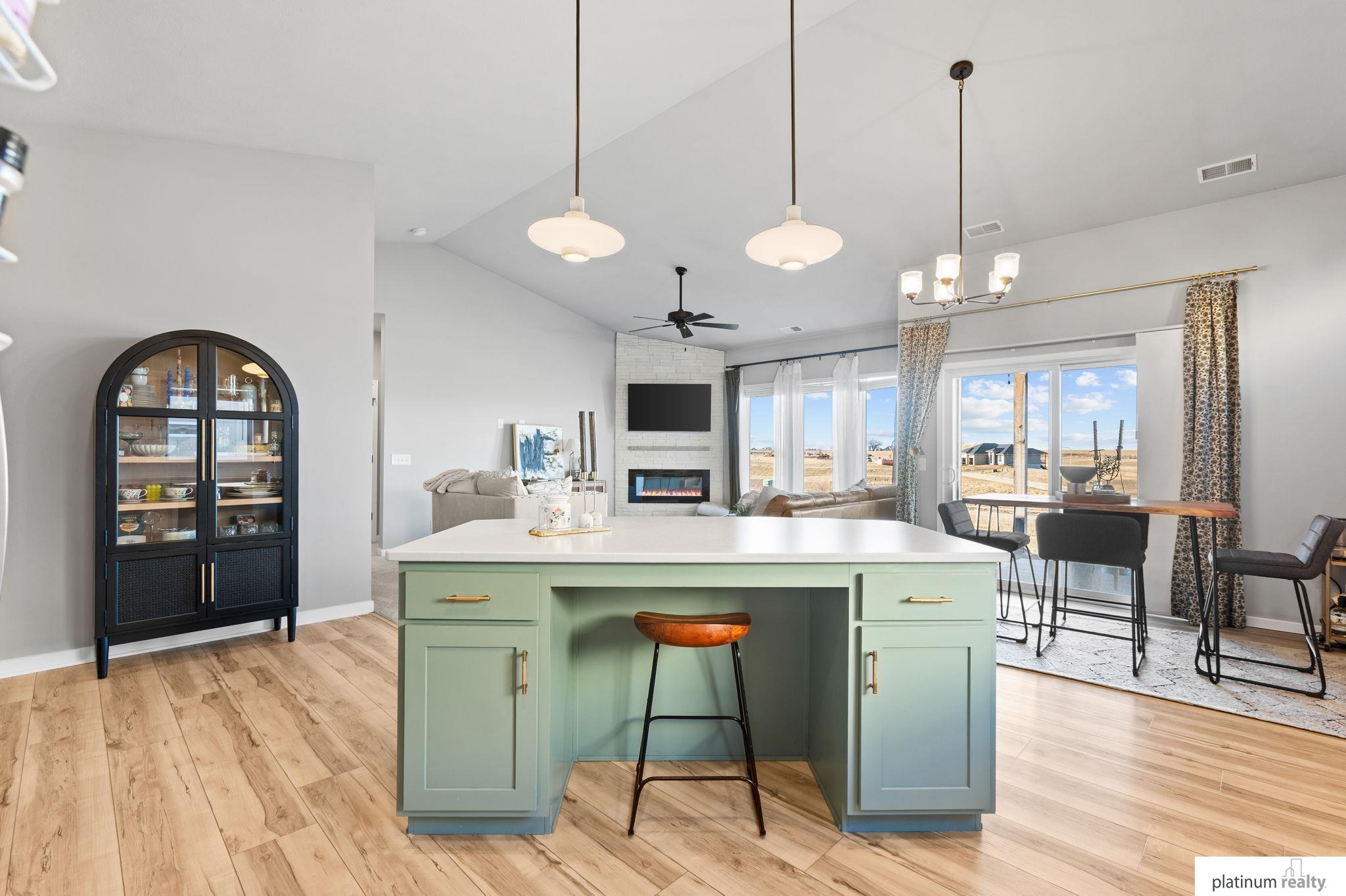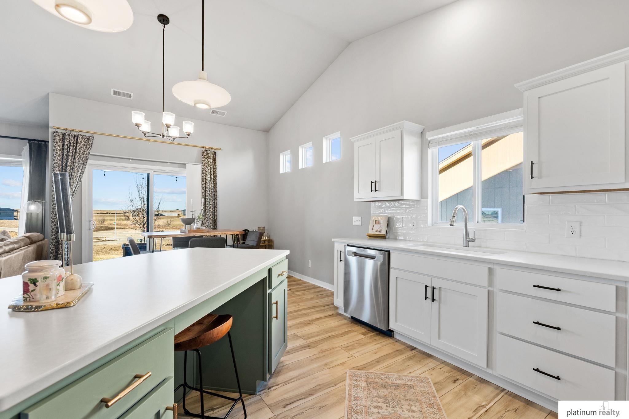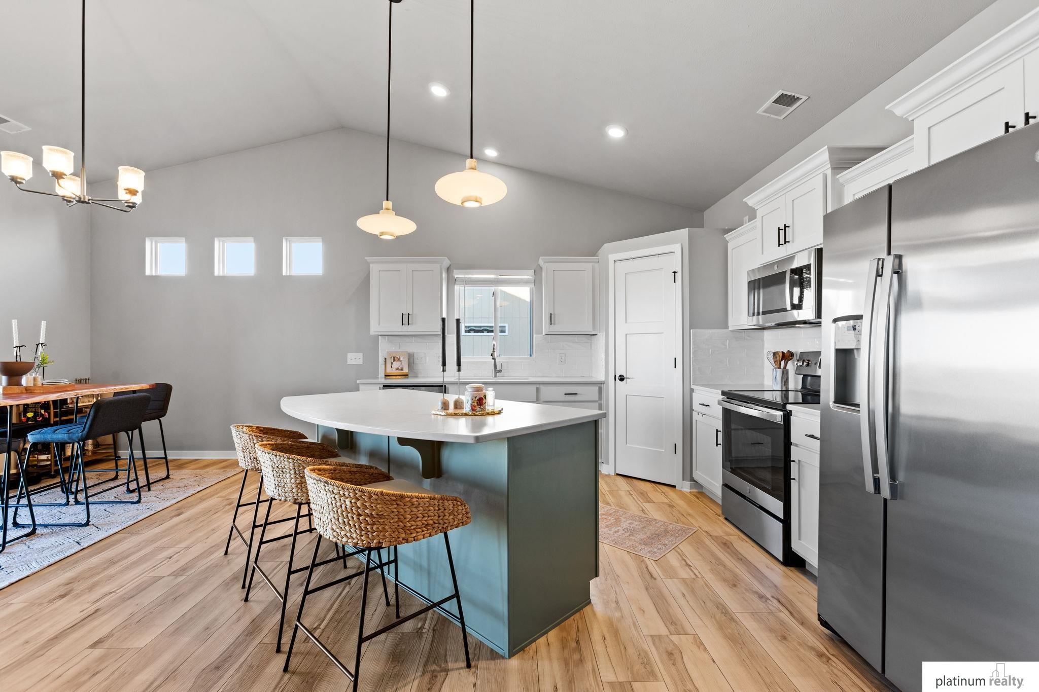 Discover the perfect blend of comfort, style, and low-maintenance living in this nearly new “Brantley” floorplan patio home built by Celebrity Homes. Only three years old, this thoughtfully designed residence offers an inviting open layout with vaulted ceilings and abundant natural light. The bright kitchen features white cabinetry, a tile backsplash, quartz countertops, pantry, island with pendant lighting, and LVP flooring that flows into the dining area. The living room includes plush carpet, an upgraded stone fireplace, and backyard views. The spacious primary suite offers a private ¾ bath and walk-in closet, with a large laundry room conveniently nearby. Two additional bedrooms, a full bathroom, and a functional drop zone complete the interior. Step outside to a covered patio, spacious yard, and beautiful sunset views. Townhome Association dues cover snow removal, lawn care, and sprinkler system maintenance for truly effortless living.