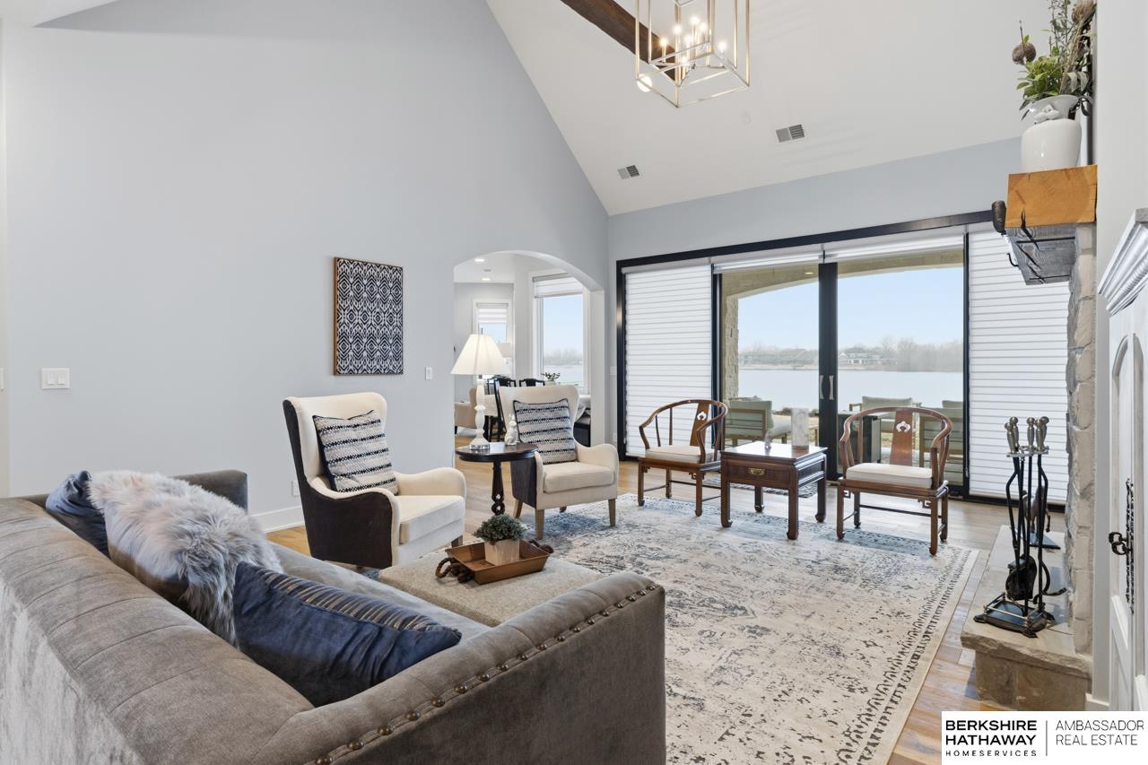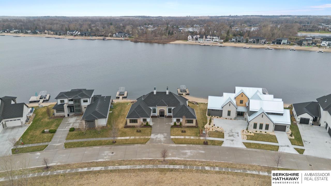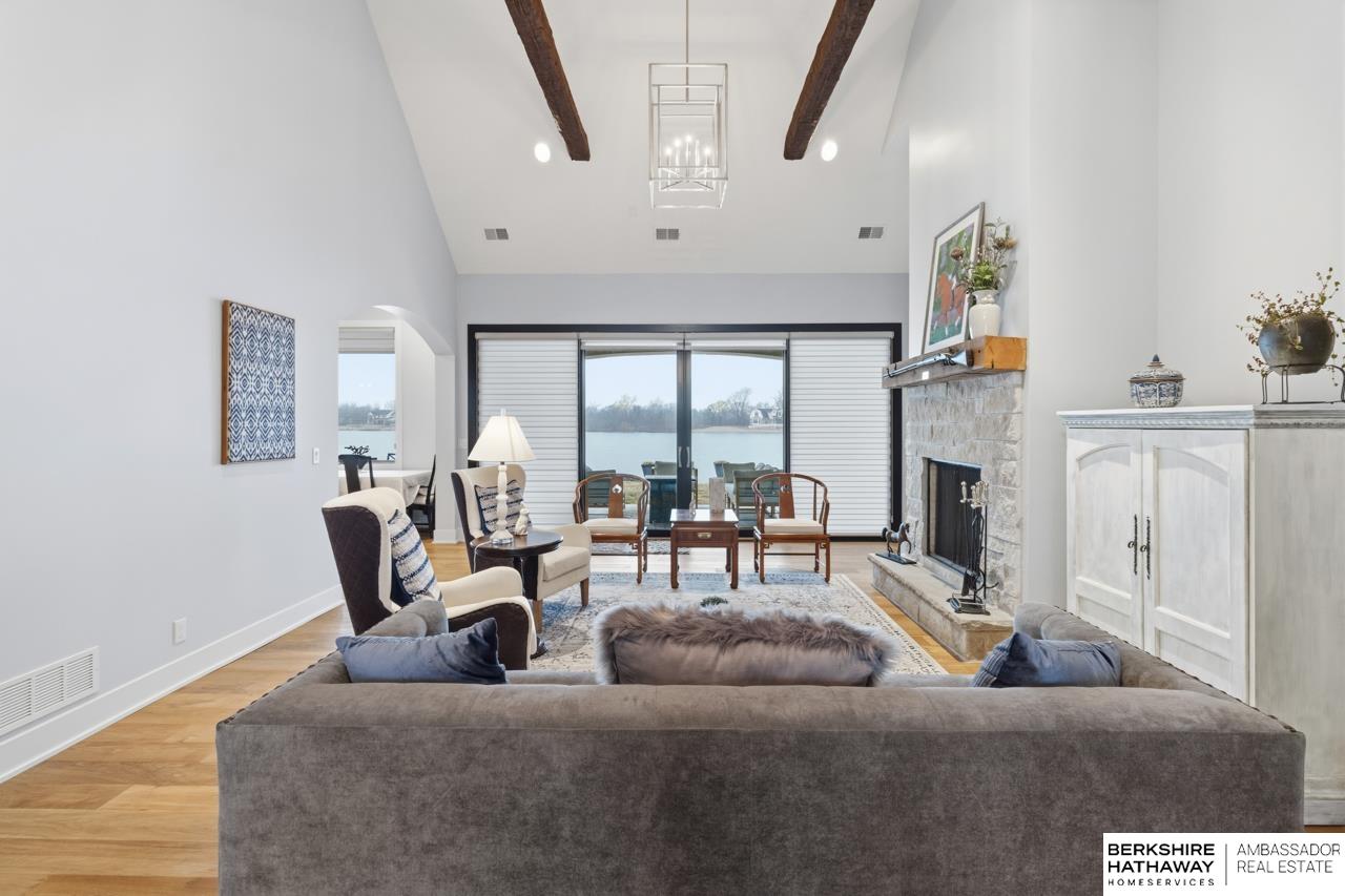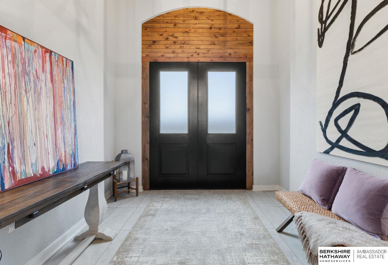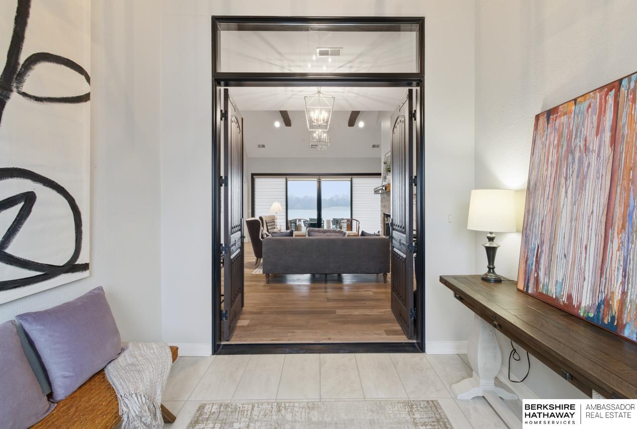 Enter into an elegant setting in this rare Bluewater Lake opportunity—one of Omaha’s premier residential lakes allowing all watercraft, including wave boats, & known for great fishing. The enclosed foyer welcomes you w/ soaring ceilings. The home offers 10 ft ceilings & 8 ft doors throughout. The living room features exposed beams, a wood-burning fireplace & a sliding door to the covered patio—perfect for enjoying peaceful lake views.The primary suite offers lake views, heated floor, a walk-in closet & a ¾ bath w/ double sinks & quartz countertops. The kitchen includes quartz counters, an induction cooktop, double ovens & an oversized walk-in pantry, opening to a cozy hearth room w/ an electric fireplace.An office w/ a soaring ceiling, two additional bedrooms (one w/ a private bath), an additional ¾ bath, spacious laundry w/ sink, mudroom & a rare split 4-car garage w/ exterior access, generator hookups & organized storage complete this exceptional lake home. Dock & electric lift stay!