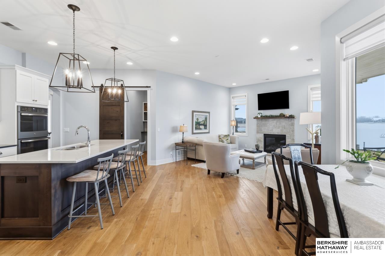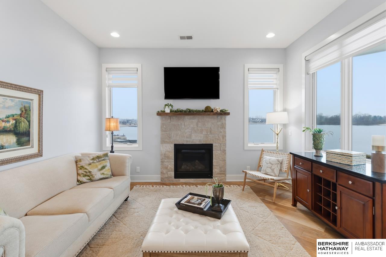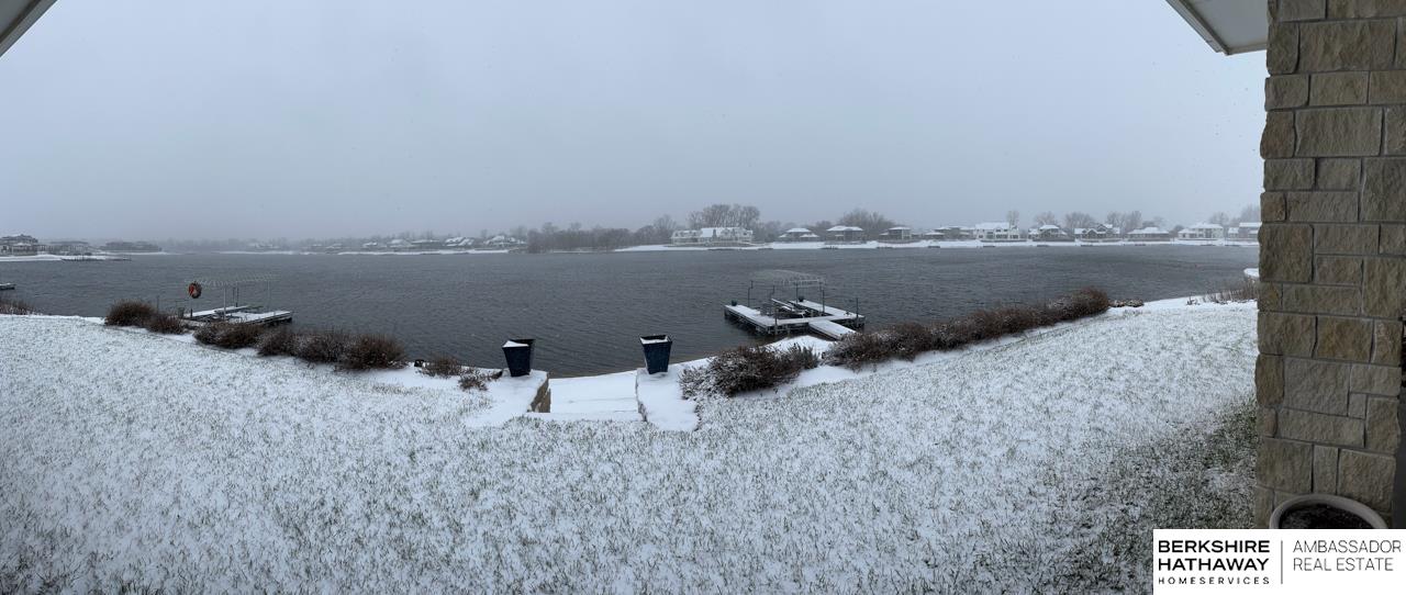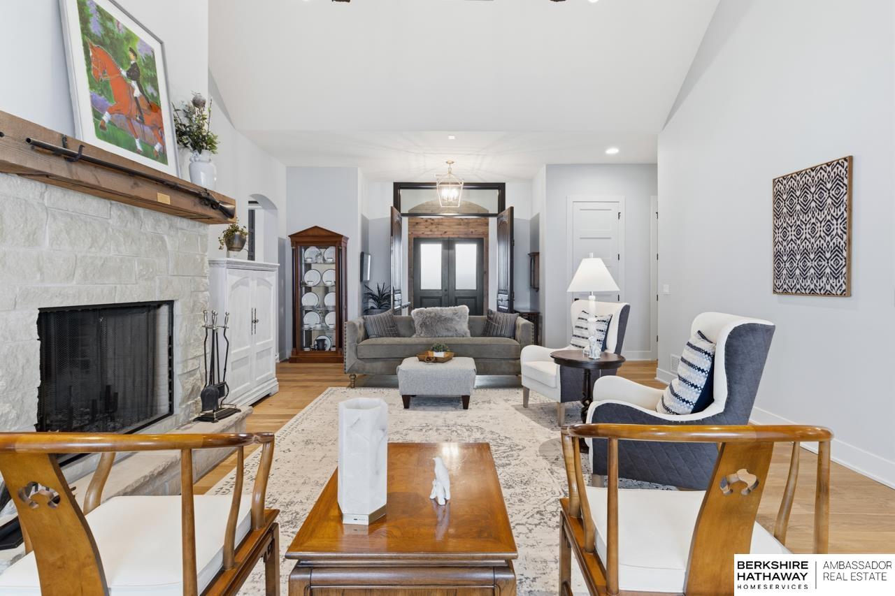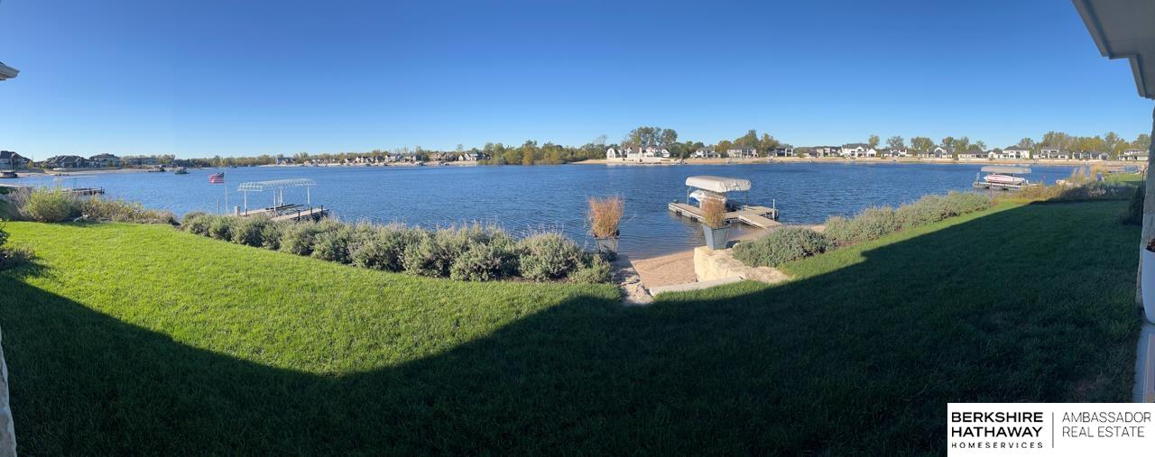 Enter into an elegant setting in this rare Bluewater Lake opportunity—one of Omaha’s premier residential lakes allowing all watercraft, including wave boats, & known for great fishing. The enclosed foyer welcomes you w/ soaring ceilings. The home offers 10 ft ceilings & 8 ft doors throughout. The living room features exposed beams, a wood-burning fireplace & a sliding door to the covered patio—perfect for enjoying peaceful lake views.The primary suite offers lake views, heated floor, a walk-in closet & a ¾ bath w/ double sinks & quartz countertops. The kitchen includes quartz counters, an induction cooktop, double ovens & an oversized walk-in pantry, opening to a cozy hearth room w/ an electric fireplace.An office w/ a soaring ceiling, two additional bedrooms (one w/ a private bath), an additional ¾ bath, spacious laundry w/ sink, mudroom & a rare split 4-car garage w/ exterior access, generator hookups & organized storage complete this exceptional lake home. Dock & electric lift stay!