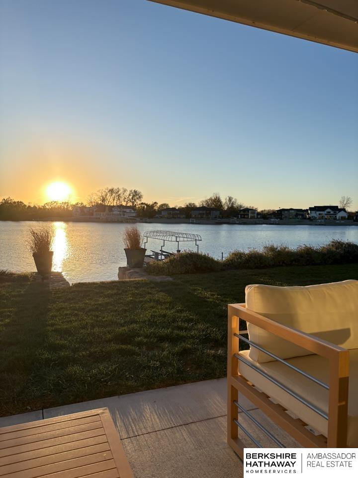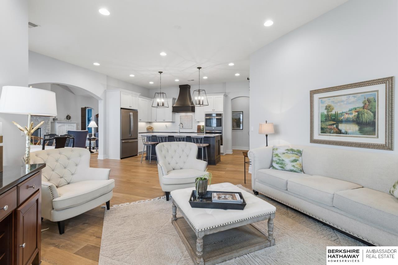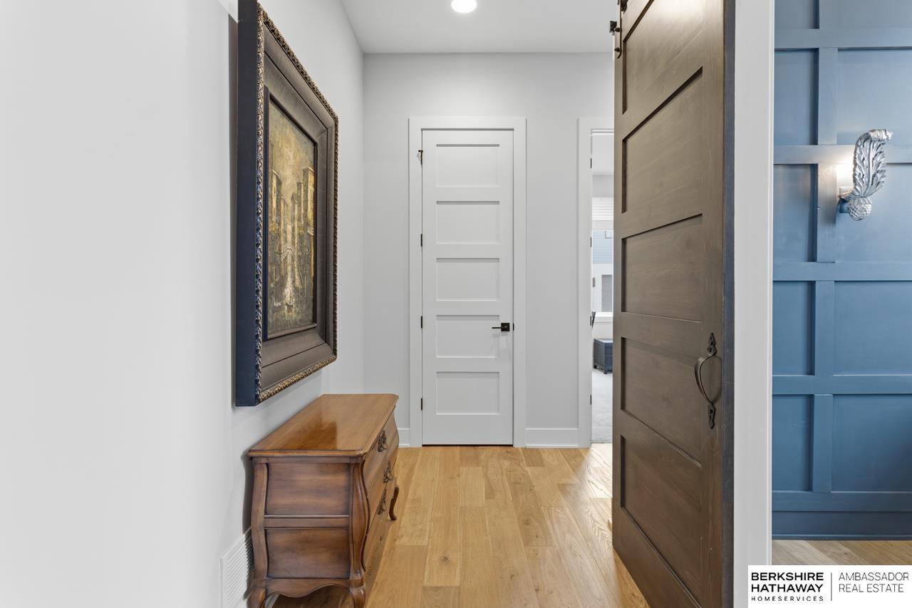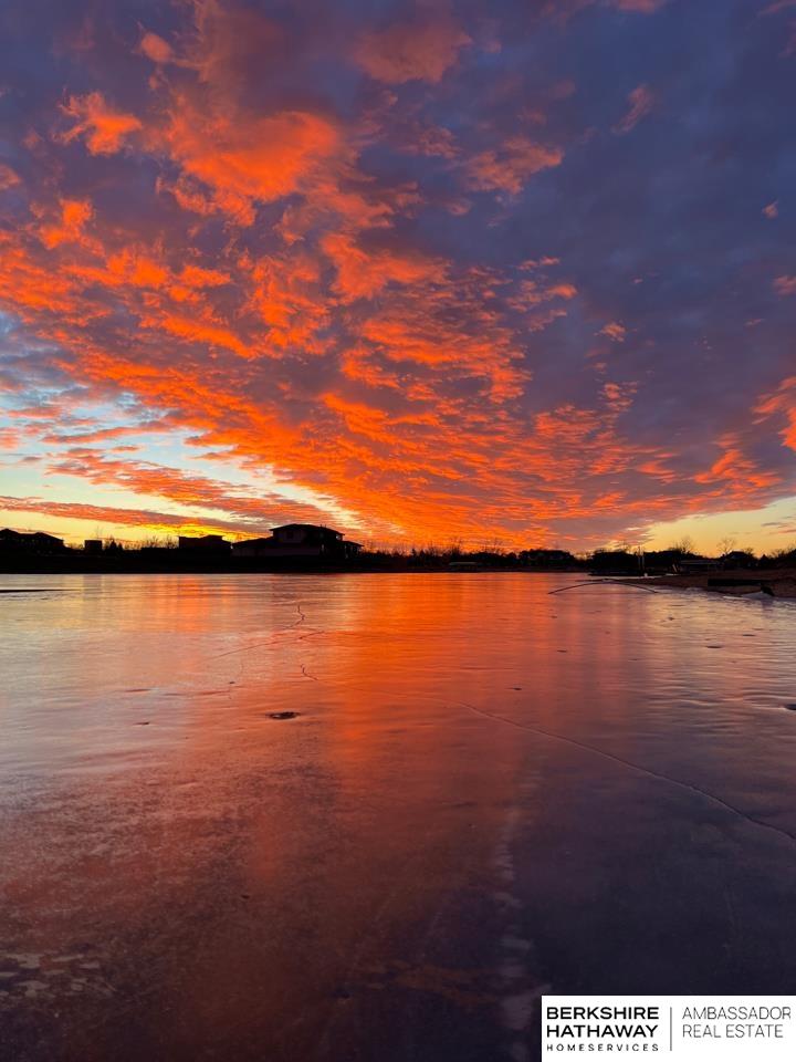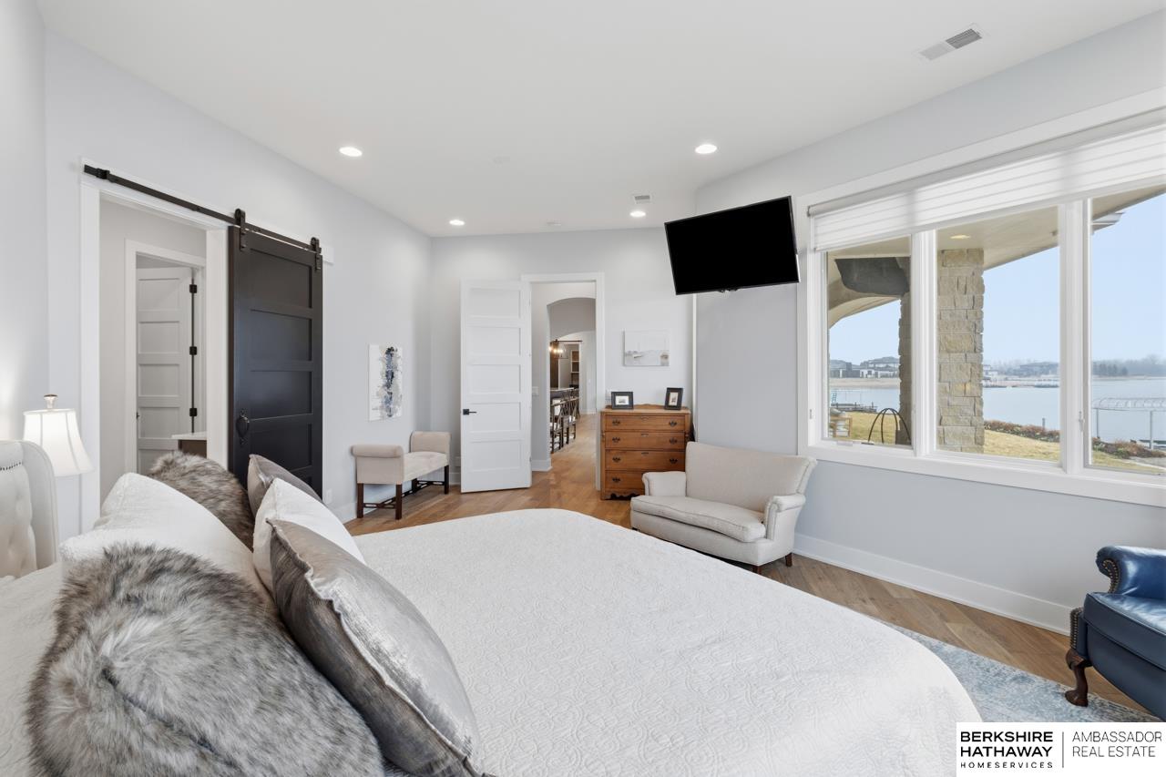 Enter into an elegant setting in this rare Bluewater Lake opportunity—one of Omaha’s premier residential lakes allowing all watercraft, including wave boats, & known for great fishing. The enclosed foyer welcomes you w/ soaring ceilings. The home offers 10 ft ceilings & 8 ft doors throughout. The living room features exposed beams, a wood-burning fireplace & a sliding door to the covered patio—perfect for enjoying peaceful lake views.The primary suite offers lake views, heated floor, a walk-in closet & a ¾ bath w/ double sinks & quartz countertops. The kitchen includes quartz counters, an induction cooktop, double ovens & an oversized walk-in pantry, opening to a cozy hearth room w/ an electric fireplace.An office w/ a soaring ceiling, two additional bedrooms (one w/ a private bath), an additional ¾ bath, spacious laundry w/ sink, mudroom & a rare split 4-car garage w/ exterior access, generator hookups & organized storage complete this exceptional lake home. Dock & electric lift stay!