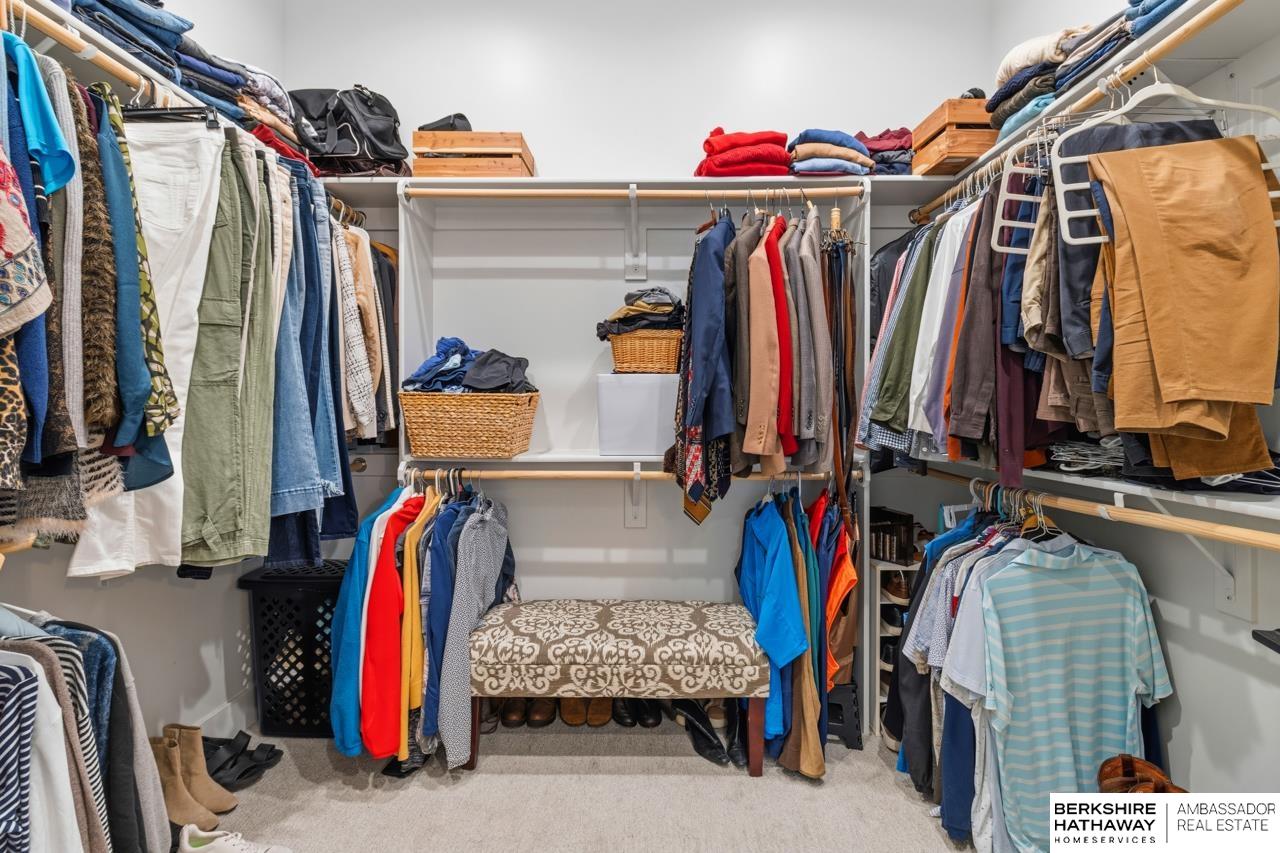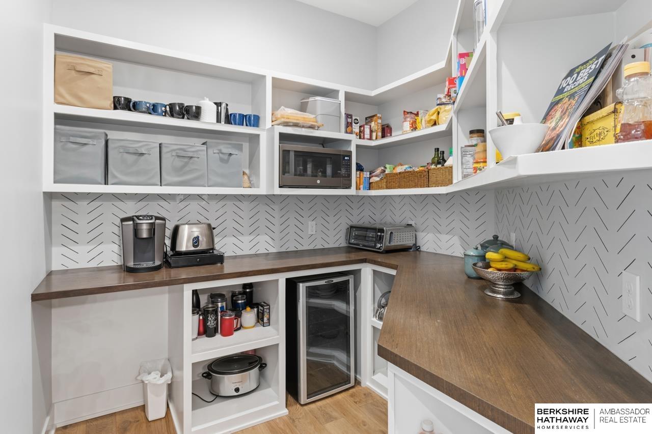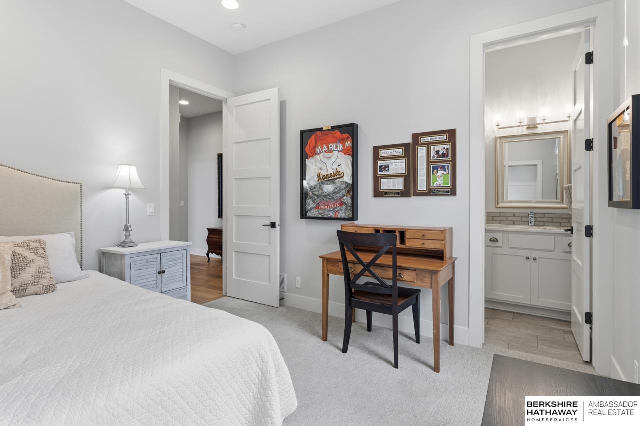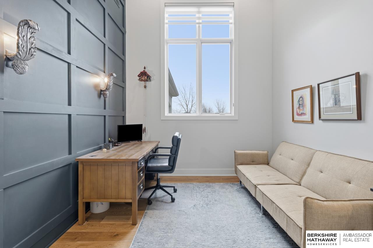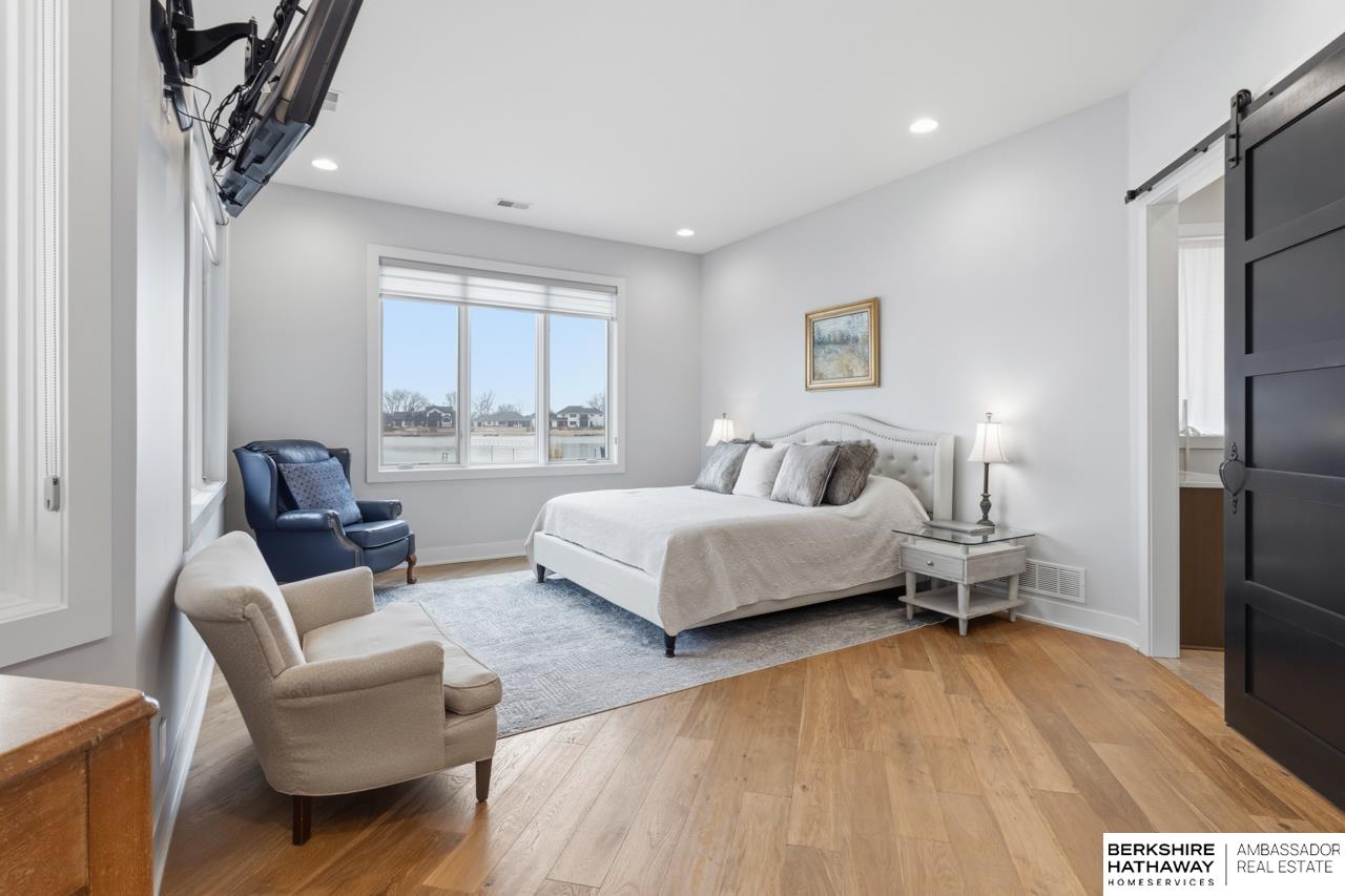 Enter into an elegant setting in this rare Bluewater Lake opportunity—one of Omaha’s premier residential lakes allowing all watercraft, including wave boats, & known for great fishing. The enclosed foyer welcomes you w/ soaring ceilings. The home offers 10 ft ceilings & 8 ft doors throughout. The living room features exposed beams, a wood-burning fireplace & a sliding door to the covered patio—perfect for enjoying peaceful lake views.The primary suite offers lake views, heated floor, a walk-in closet & a ¾ bath w/ double sinks & quartz countertops. The kitchen includes quartz counters, an induction cooktop, double ovens & an oversized walk-in pantry, opening to a cozy hearth room w/ an electric fireplace.An office w/ a soaring ceiling, two additional bedrooms (one w/ a private bath), an additional ¾ bath, spacious laundry w/ sink, mudroom & a rare split 4-car garage w/ exterior access, generator hookups & organized storage complete this exceptional lake home. Dock & electric lift stay!