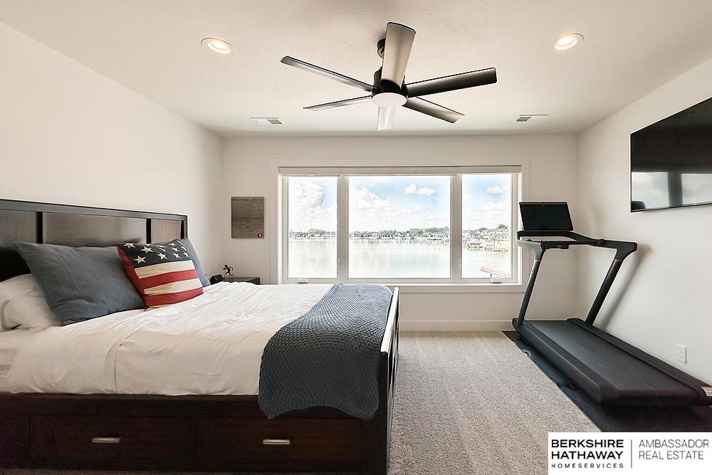 Your own private beach and magnificent sunsets await at coveted Bluewater! Make this your reality in this better than new 4-Bed+1 Office/4-Bath/3-Car custom 1.5 Story home. Adorned with detail and luxury design, this 3500+ sq ft home features luxurious main floor primary bedroom suite is a sanctuary of relaxation w/ water views to wake up to every morning & featuring an oversized walk-in shower with integrated standalone tub and walk-in closet. Large gourmet chef-inspired kitchen with dining area, oversized kitchen island, walk-in pantry, & high-end appliances. Upstairs you will find a loft/rec area along with 3 additional oversized bedrooms with walk-in closets and direct access baths. Relax and unwind while gazing at the lake from either of your covered outdoor living areas featuring a built-in outdoor kitchen, plenty of area to entertain, and your very own putting green! Full boating access, unbelievable fishing, walking trails, and so much more. It all can be yours!