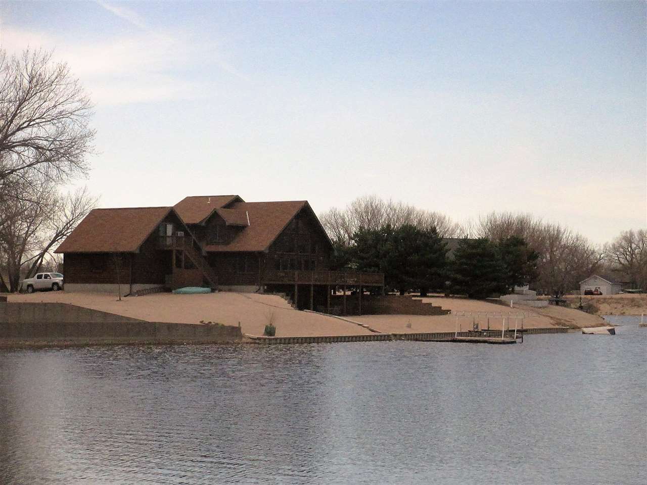 Fabulous lake home w/real log siding, 5 bed, 3 bath, lg bunk house above garage w/heat & air. Lg 2-car garage, huge wrap-around deck, newer heat pump, roof 2 yrs old, all electric home except propane fireplaces. Large sand beach w/boat dock. Great for summer getaway or home in gated community. Must see!-