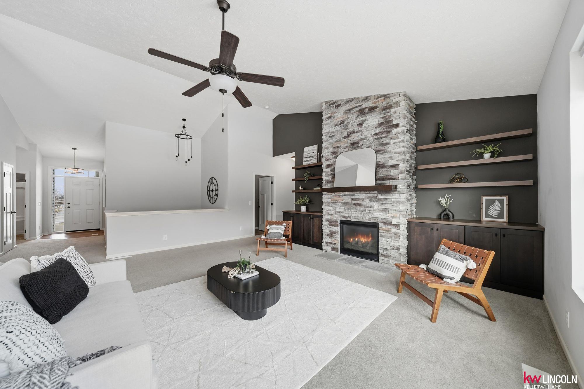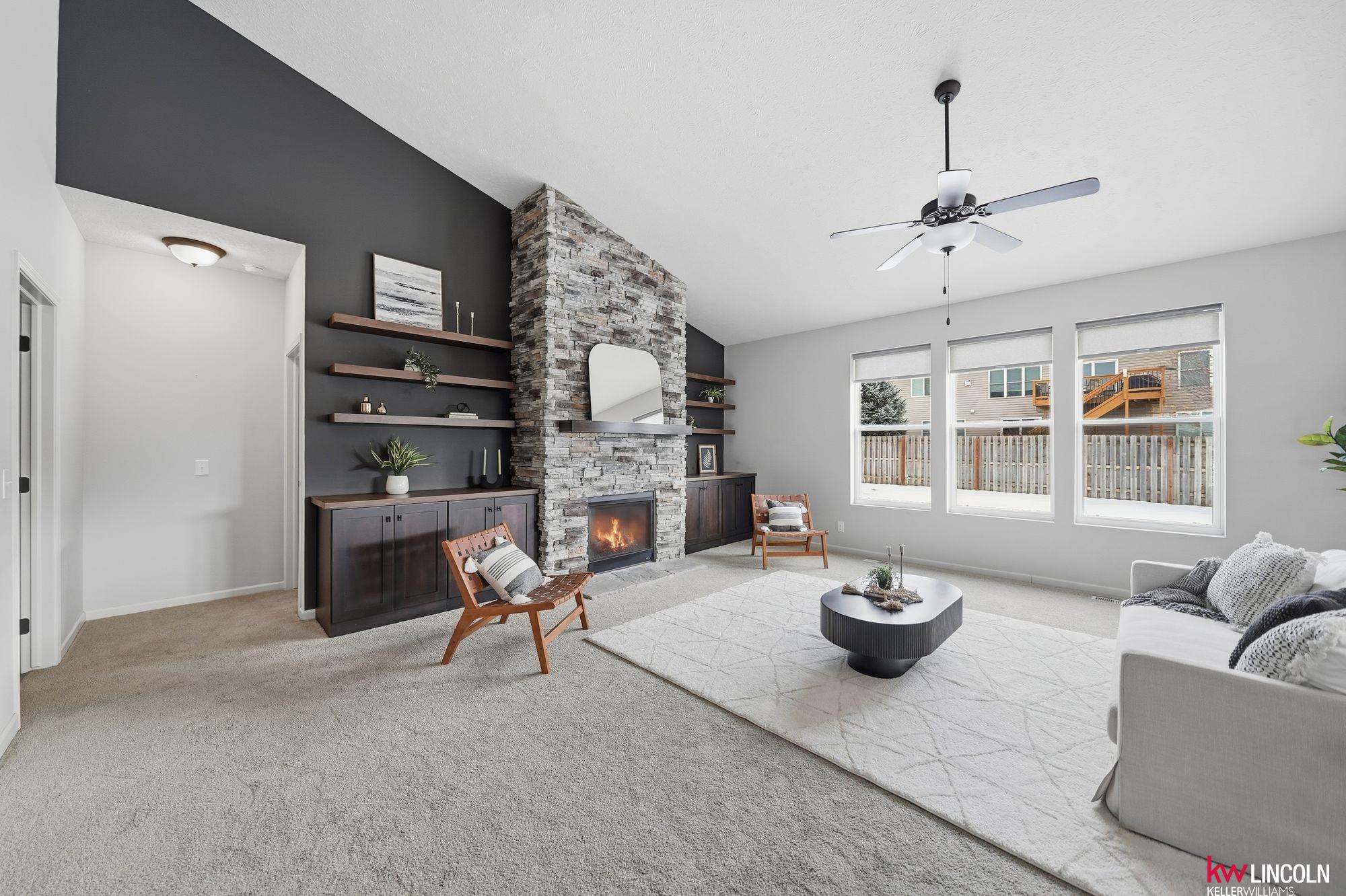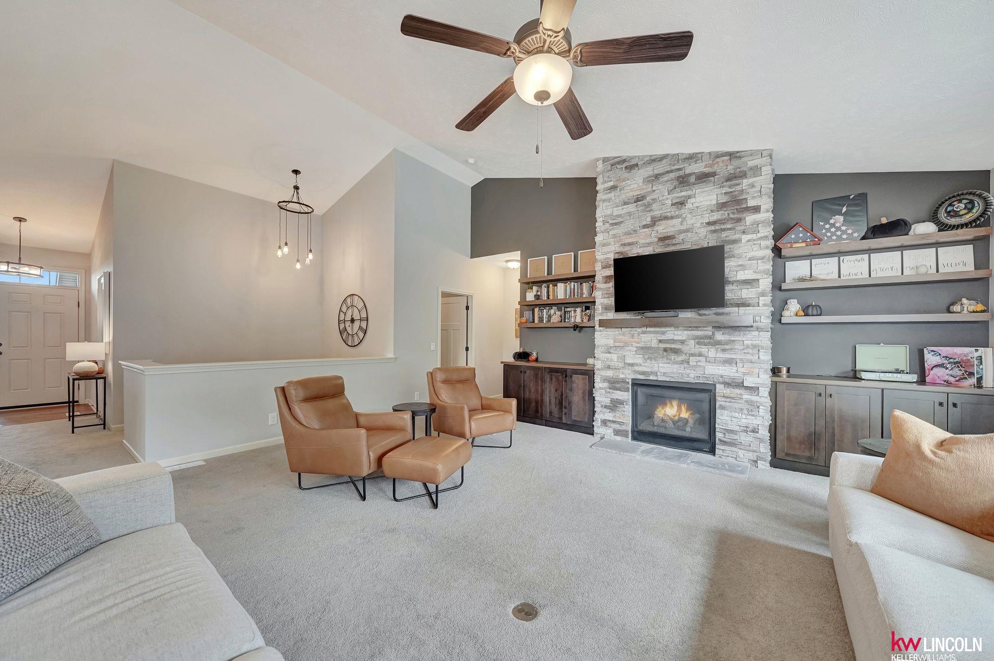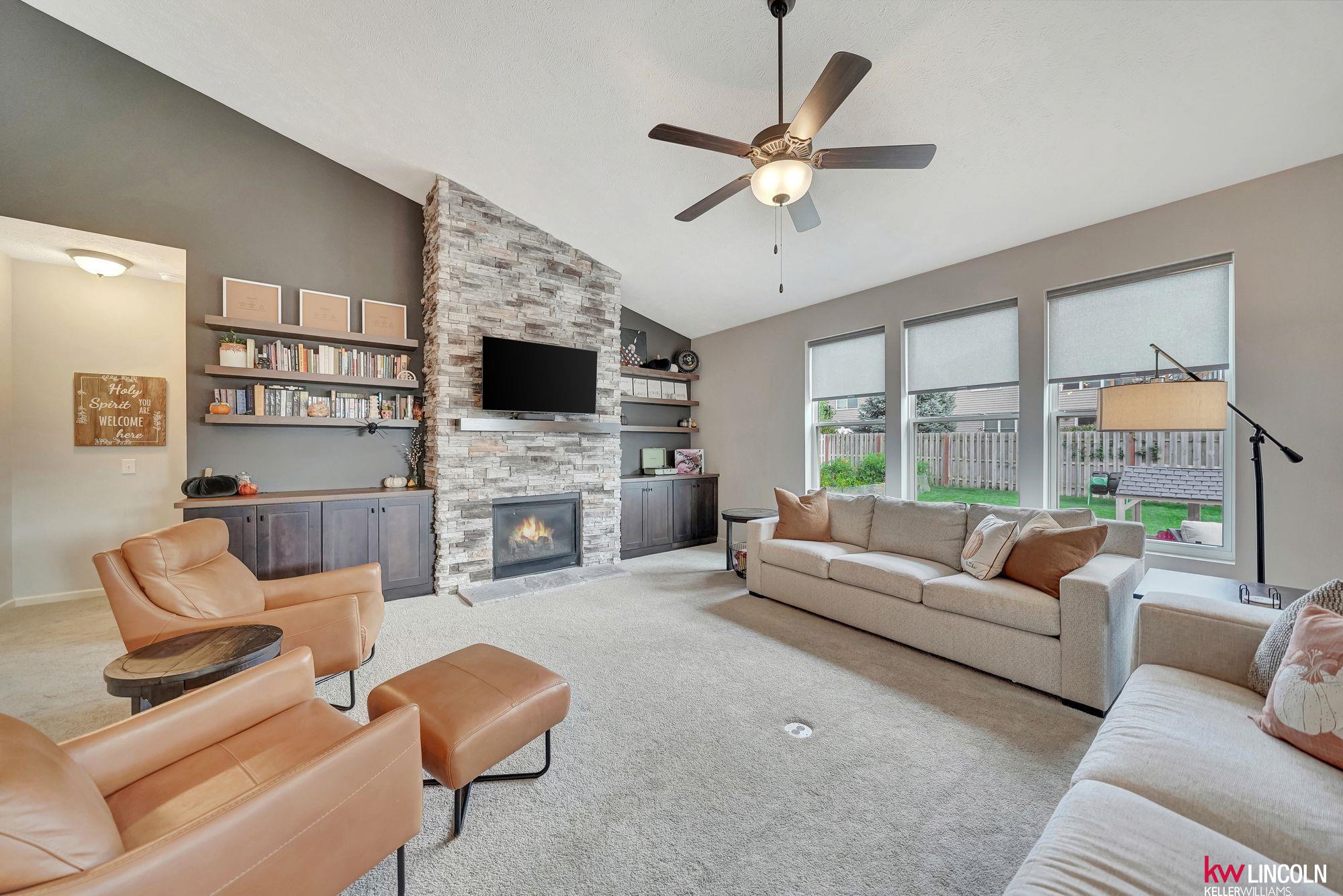 This beautiful ranch in southeast Lincoln is ready for you w/over 3,200 of finished square feet! Lots of updates & custom additions to the layout. This 4 bedroom, 3 bath home is open concept & inviting. The main floor features high vaulted ceilings, a stoned gas fireplace, custom built-ins, a large living room open to the beautiful kitchen & dining area. The kitchen features quartz counters, stainless steel appliances, & all soft-close cabinetry. The primary bedroom ensuite has double sink vanity & walk-in closet. Two more bedrooms & another full bath on this main floor. A great mud-zone drop area as well, leading into the 3-stall garage w/built-in shelving. The large basement has been remodeled to feature a legal bedroom w/walk-in closet, a non-conforming flex room/play space/office, 3/4 bathroom & a large family room. A large storage room & laundry space is a great bonus! The patio has been extended & back yard is fully fenced with underground sprinkler system. Come tour today!