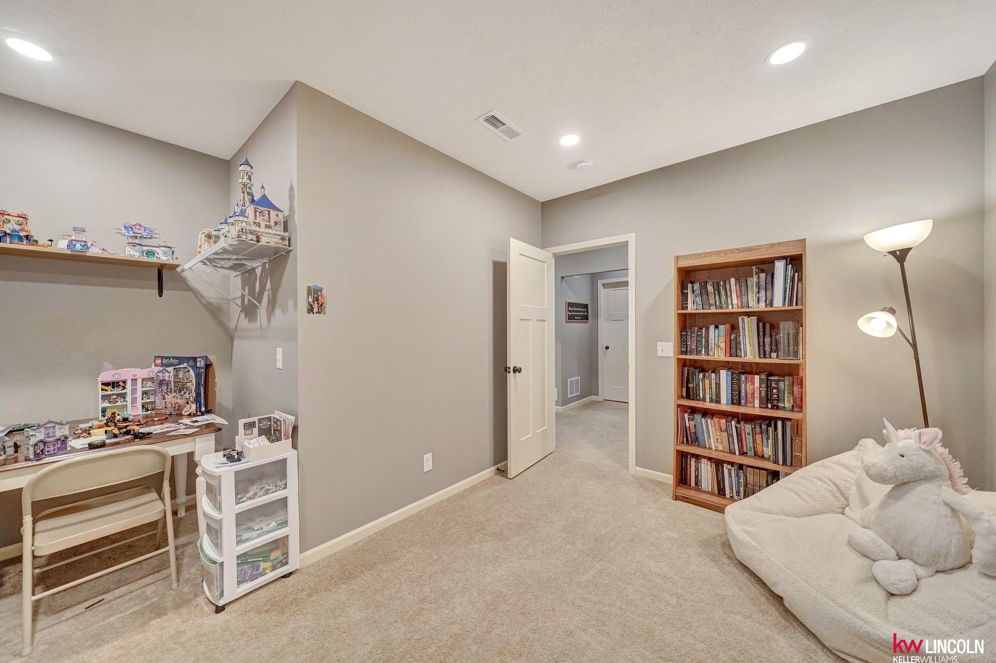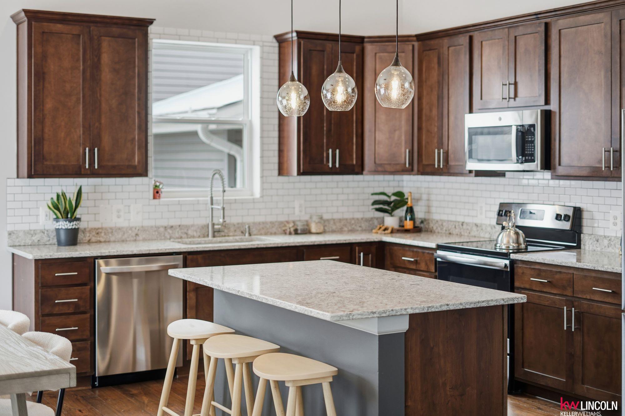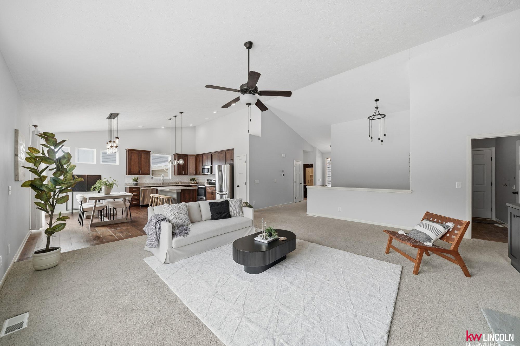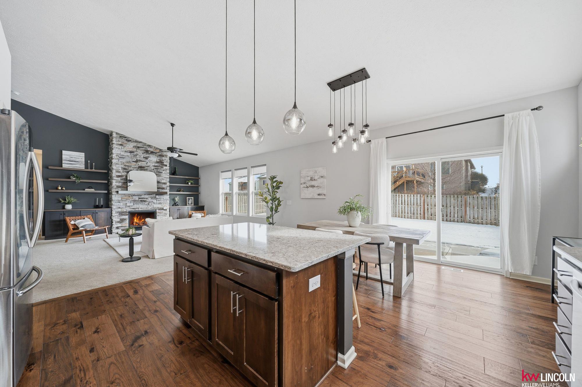 This beautiful ranch in southeast Lincoln is ready for you w/over 3,200 of finished square feet! Lots of updates & custom additions to the layout. This 4 bedroom, 3 bath home is open concept & inviting. The main floor features high vaulted ceilings, a stoned gas fireplace, custom built-ins, a large living room open to the beautiful kitchen & dining area. The kitchen features quartz counters, stainless steel appliances, & all soft-close cabinetry. The primary bedroom ensuite has double sink vanity & walk-in closet. Two more bedrooms & another full bath on this main floor. A great mud-zone drop area as well, leading into the 3-stall garage w/built-in shelving. The large basement has been remodeled to feature a legal bedroom w/walk-in closet, a non-conforming flex room/play space/office, 3/4 bathroom & a large family room. A large storage room & laundry space is a great bonus! The patio has been extended & back yard is fully fenced with underground sprinkler system. Come tour today!