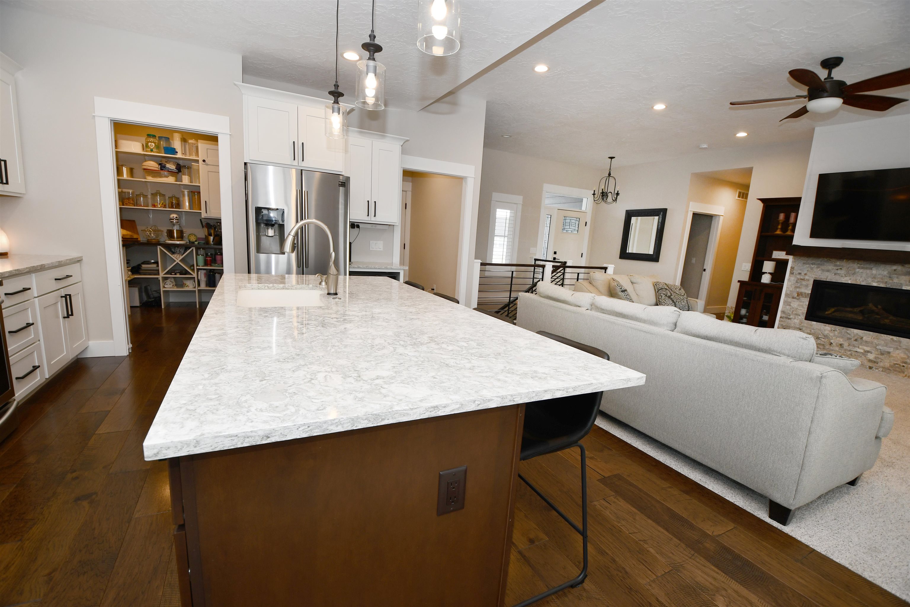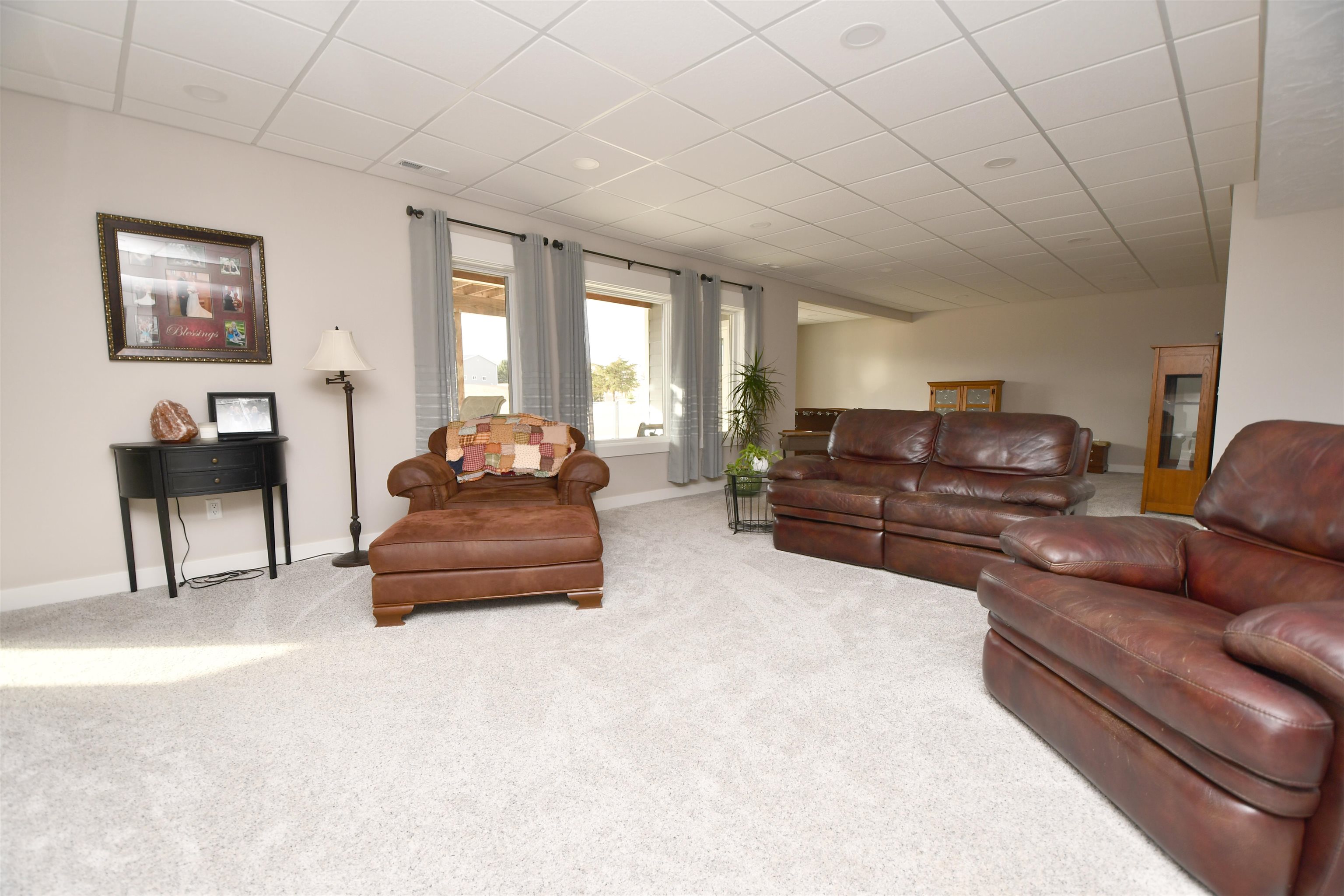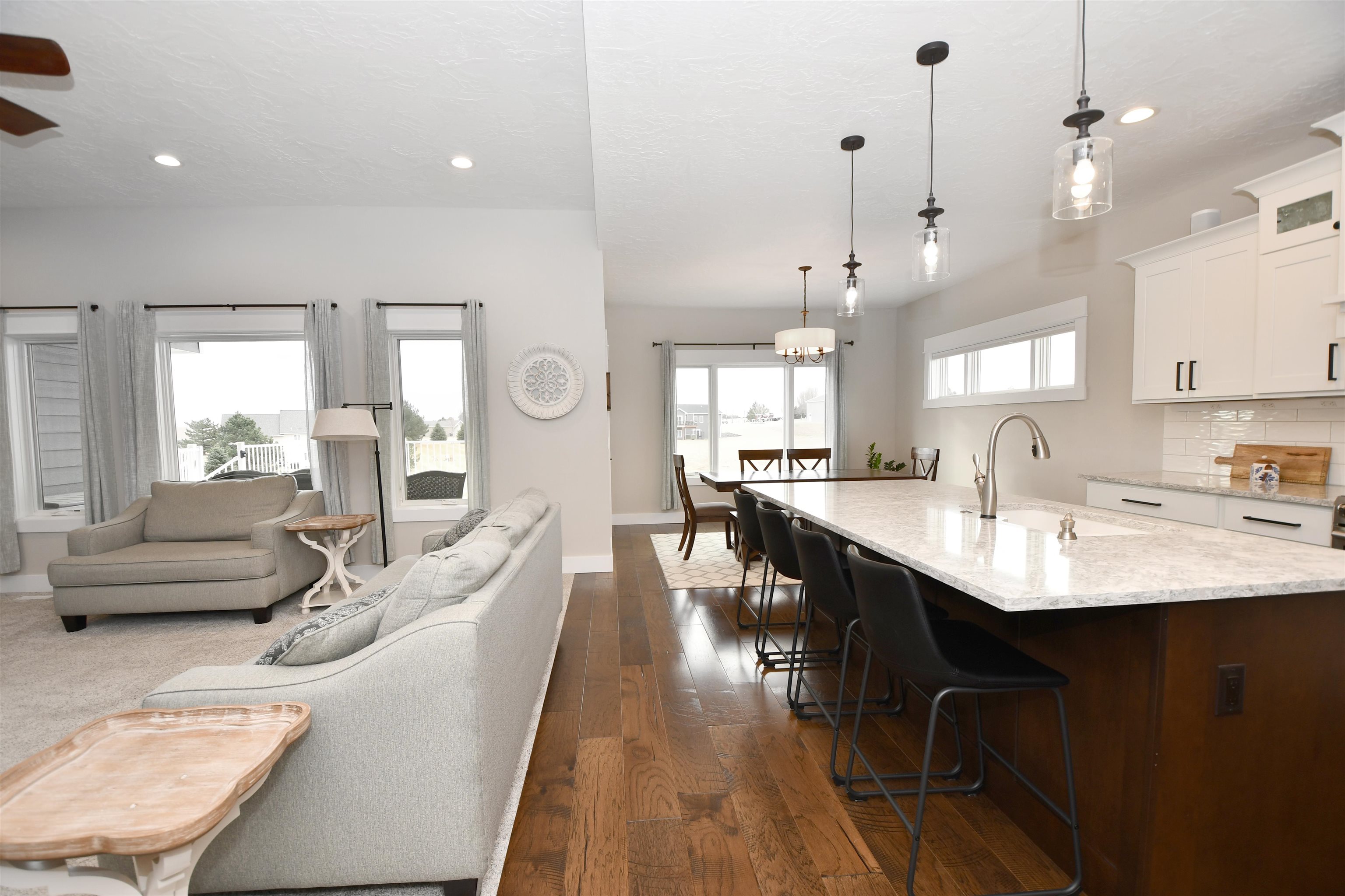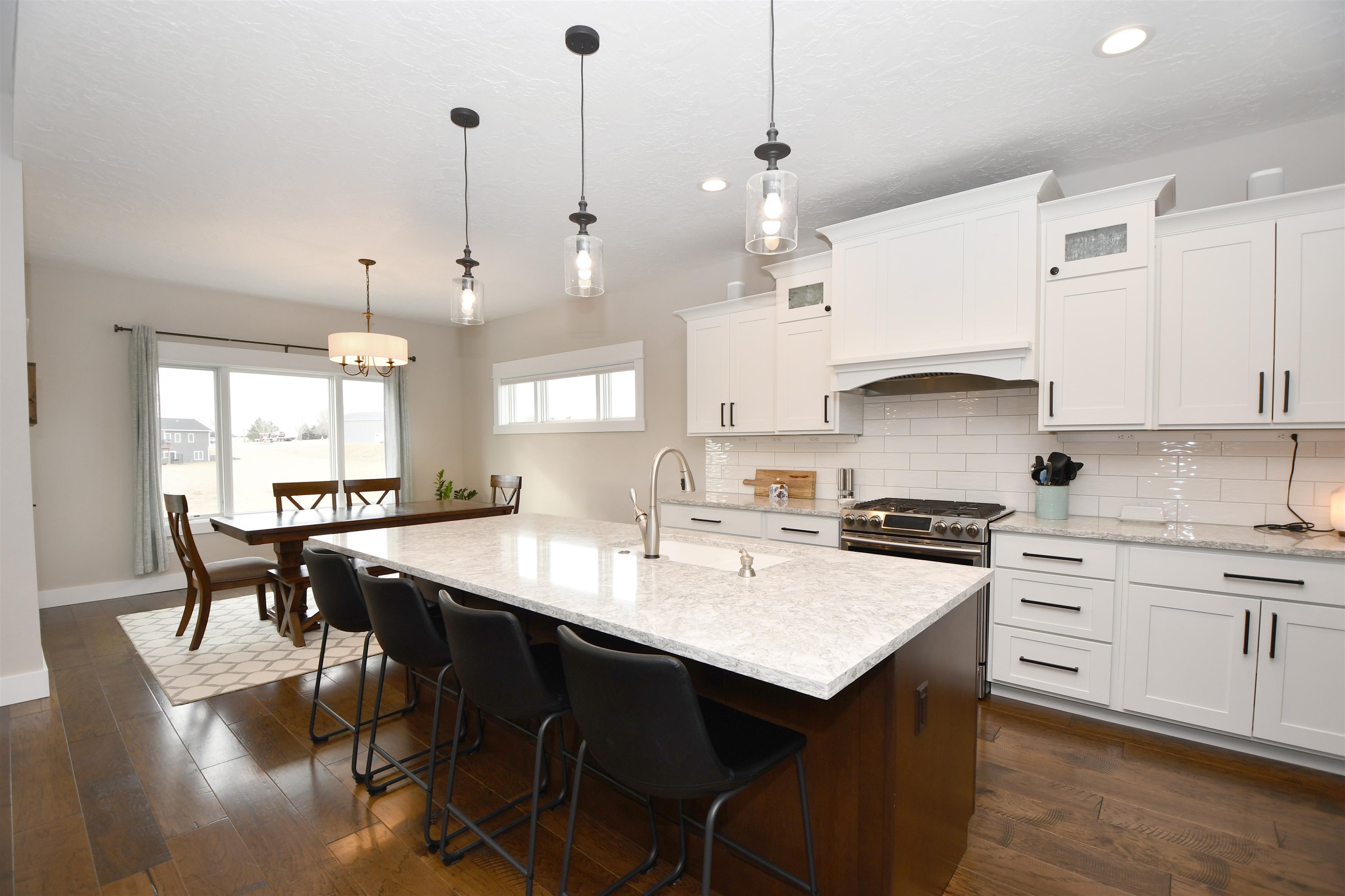 Welcome to this stunning custom-built home, thoughtfully designed in 2018 with quality craftsmanship and comfort in mind. Situated on a small acreage just northwest of Kearney in a quiet neighborhood. This spacious five-bedroom, three-bathroom residence features beautiful wood floors, a cozy fireplace, and a fully finished basement - perfect for both everyday living and entertaining. The convenience of main-floor laundry adds to the home's functional design. The kitchen is true standout, showcasing elegant quartz countertops and a large walk-in pantry for ample storage and convenience, while the bathrooms feature luxurious onyx finishes. High-end materials and finishes throughout, sourced from CMH Interiors, Century Lumber, and Builders Warehouse, add to the home's exceptional quality. Built with added insulation throughout for enhanced comfort and energy efficiency, this home also includes an amazing geothermal heating and cooling system - a huge money saver. Step outside to a beautiful deck with great views, ideal for relaxing or hosting guests, and enjoy the convenience of underground sprinklers. A custom-built shop and garden shed completes this exceptional property - offering the perfect blend of comfort, functionality and modern living.
